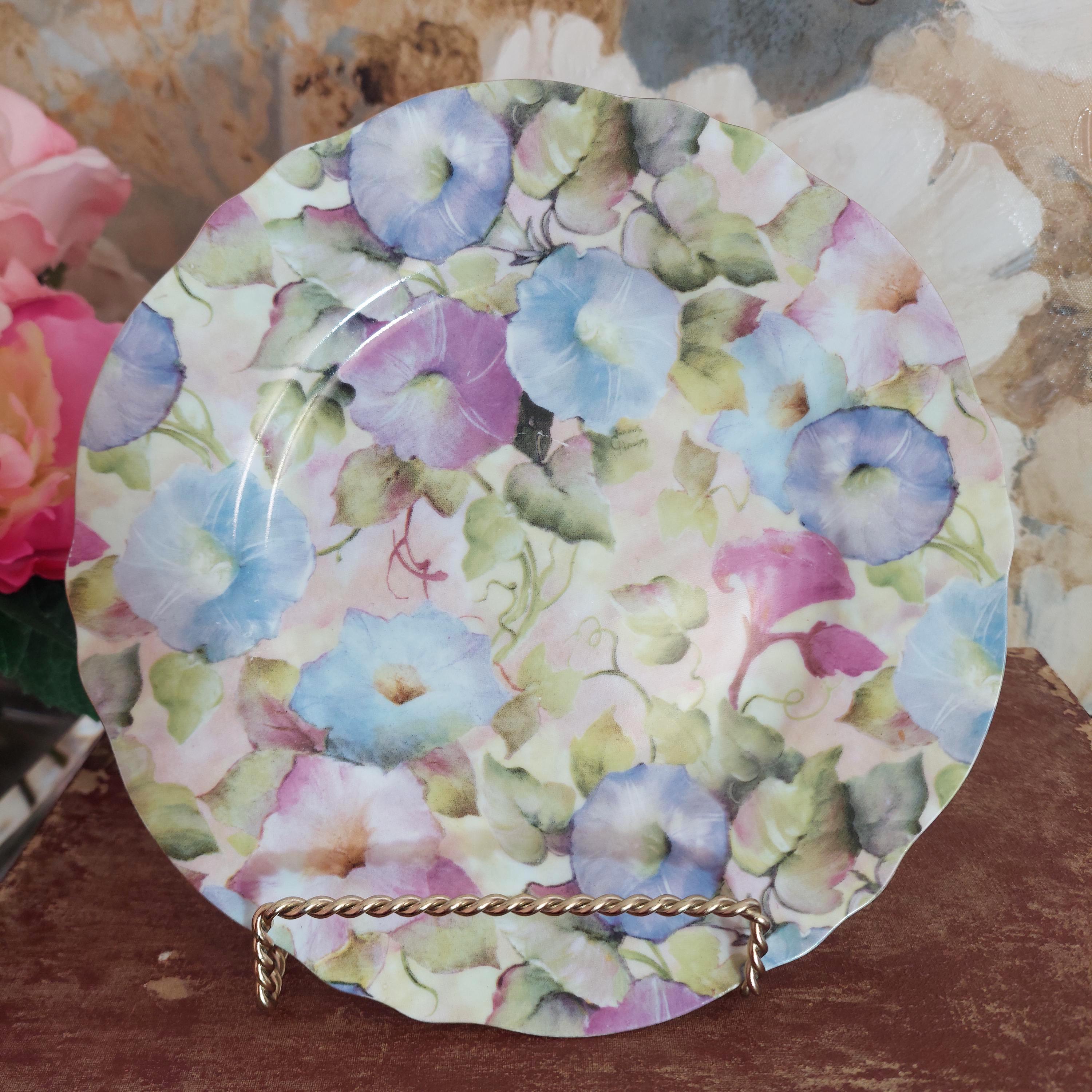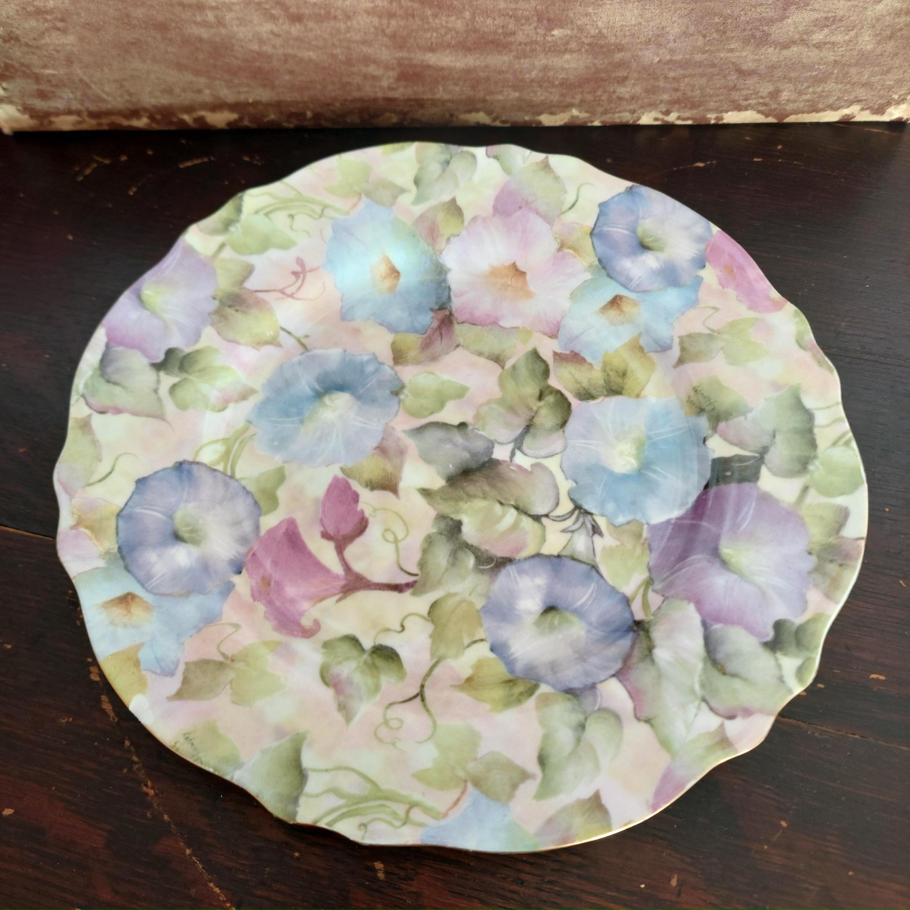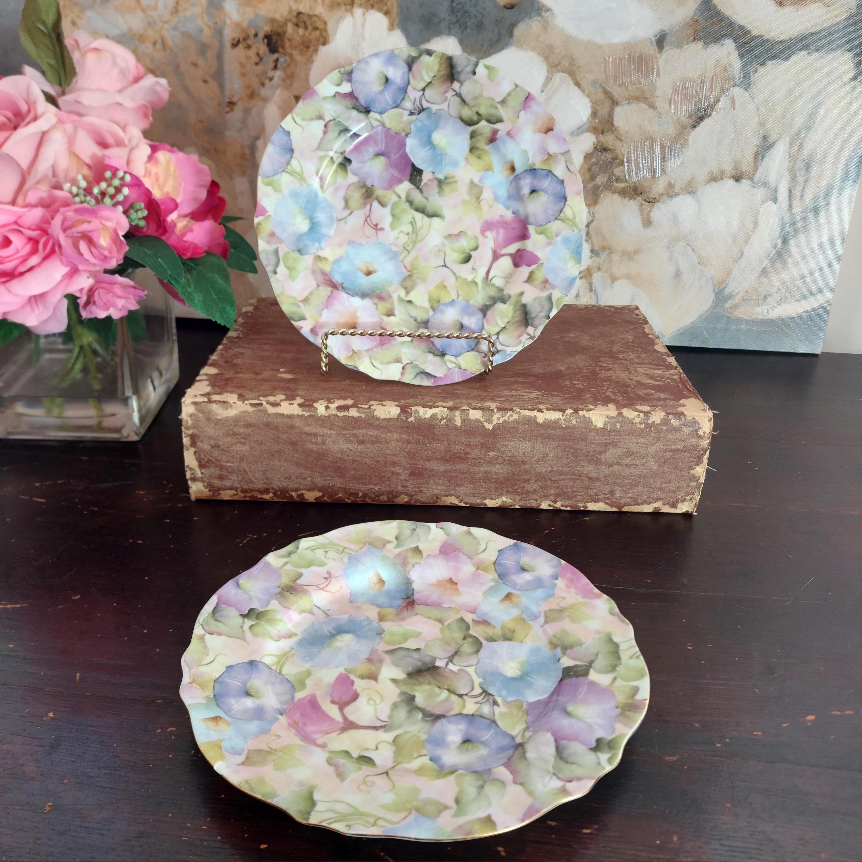 Set of 2 plates decorated with blue and purple morning glory flowers and leaves. Lovely gold trim.