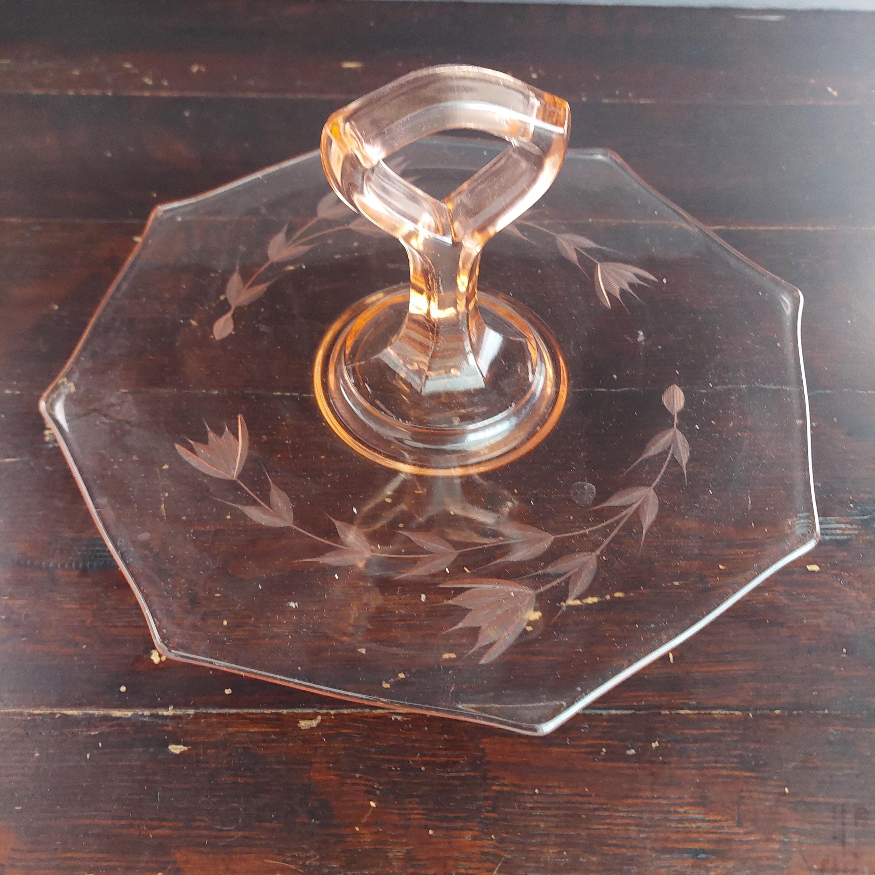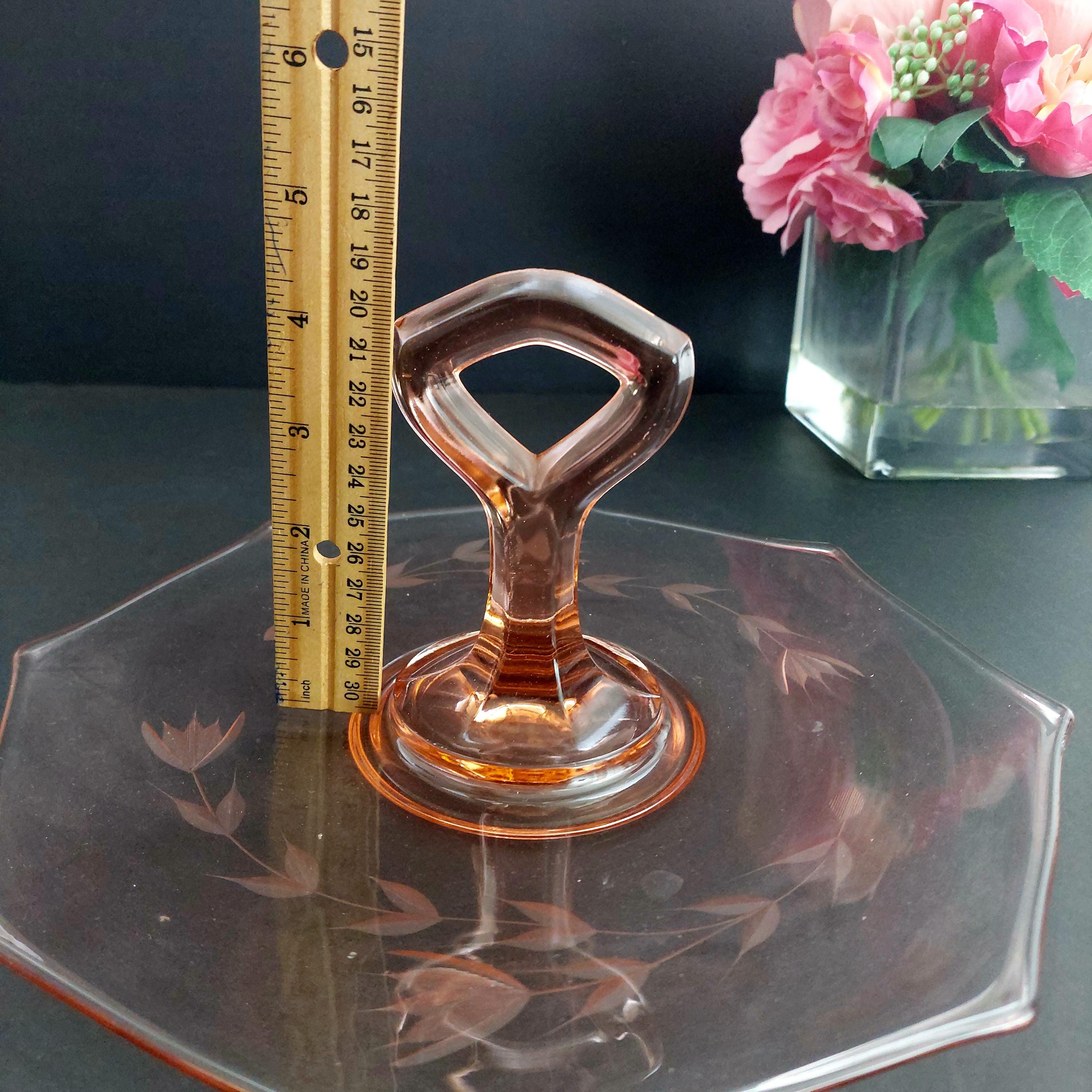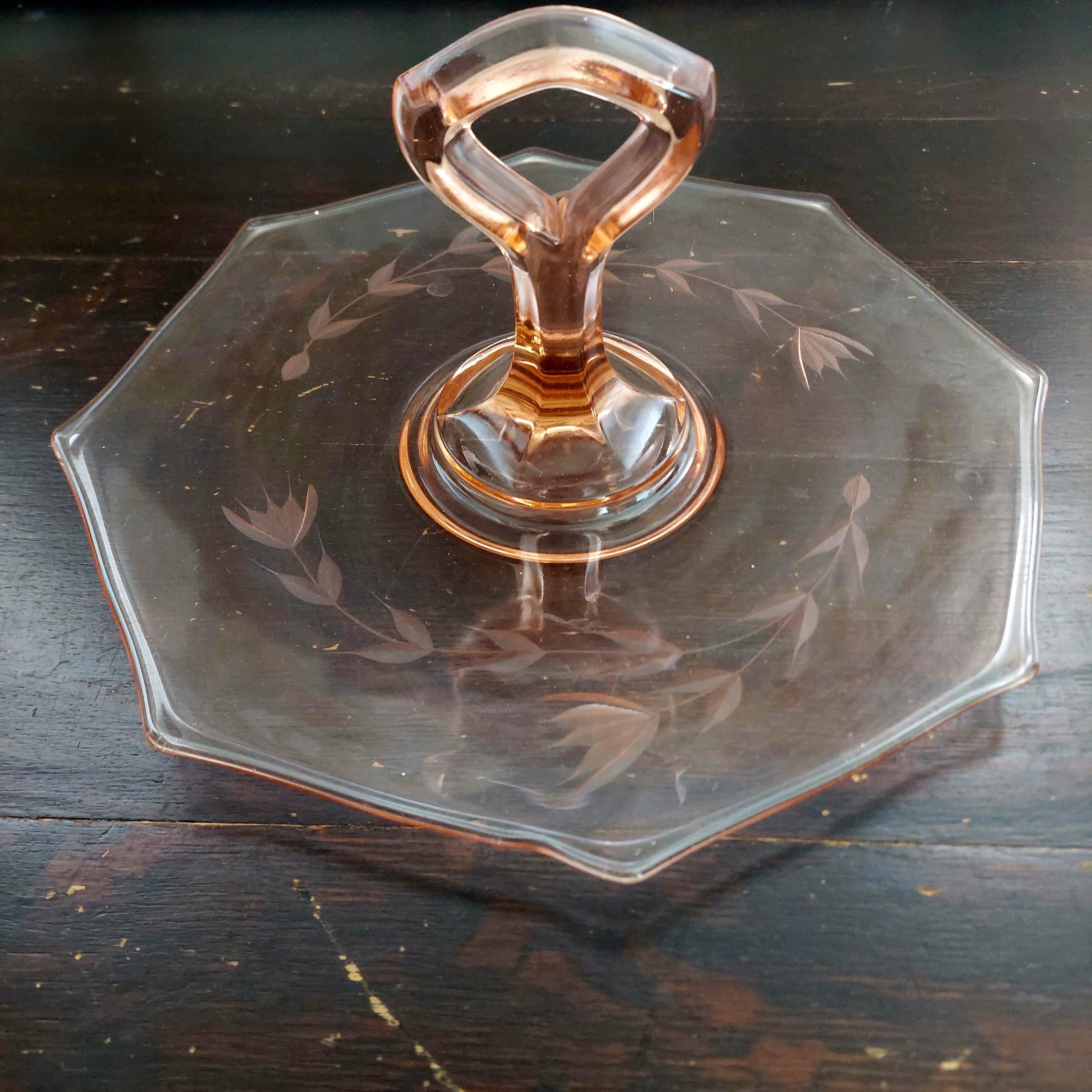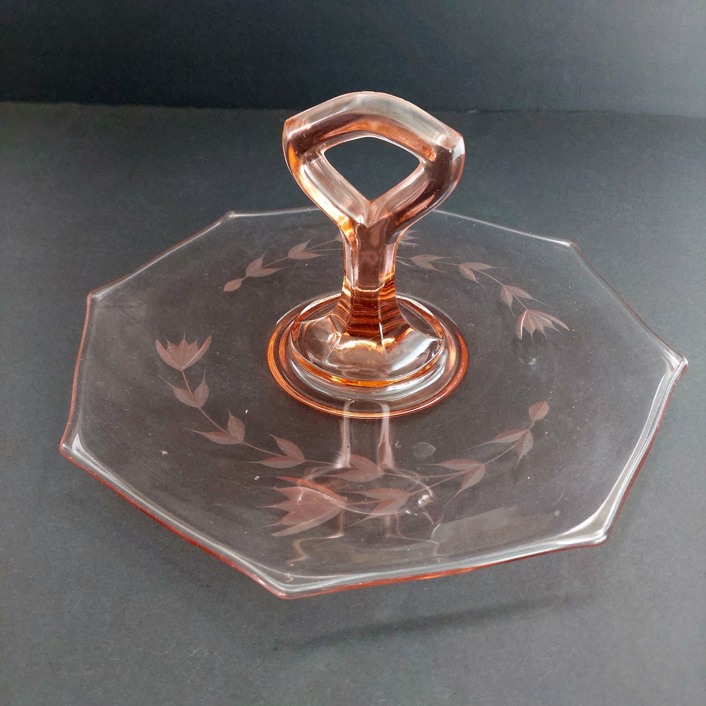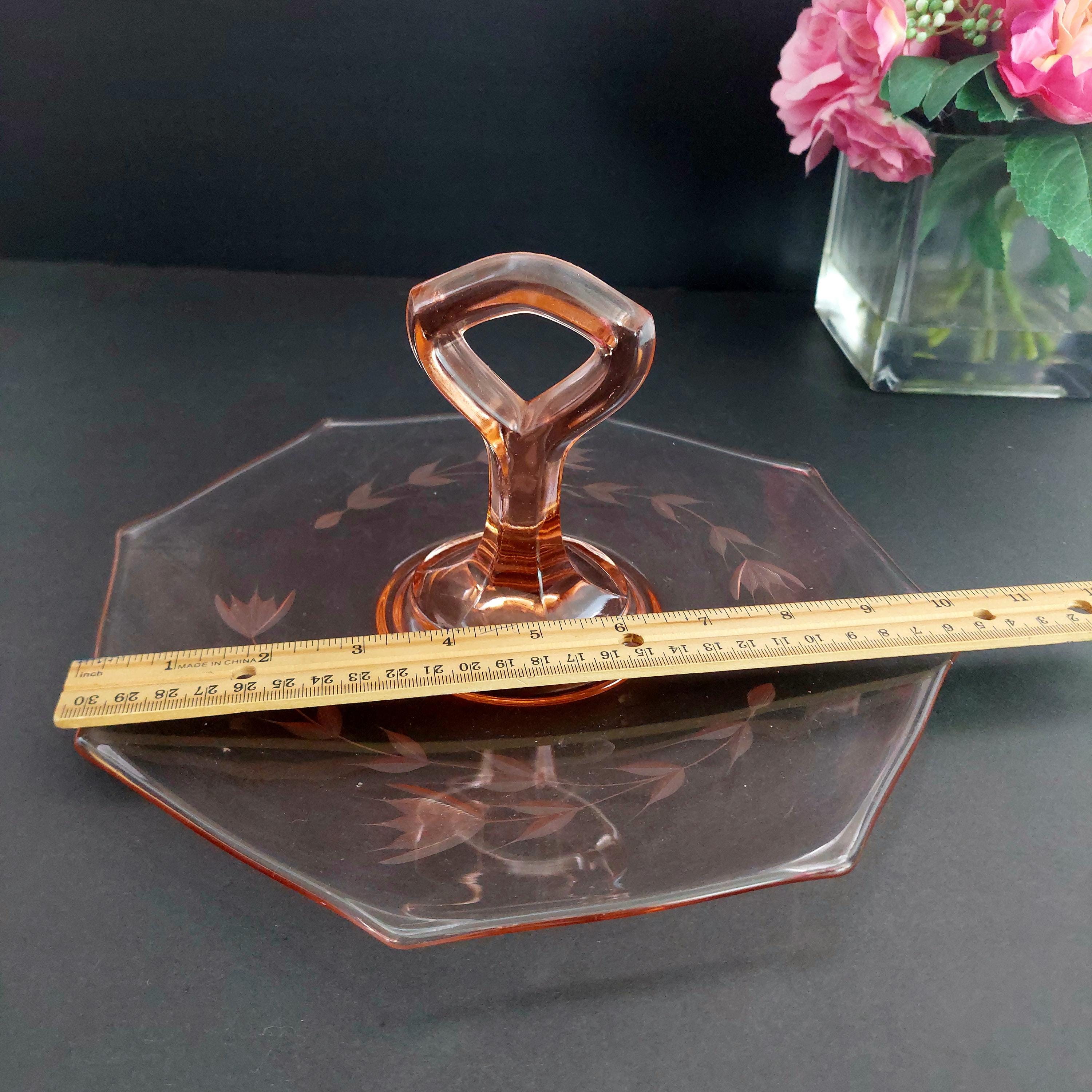 Pink Depression Glass Octagon Serving Plate Center Handle Etched Floral Design