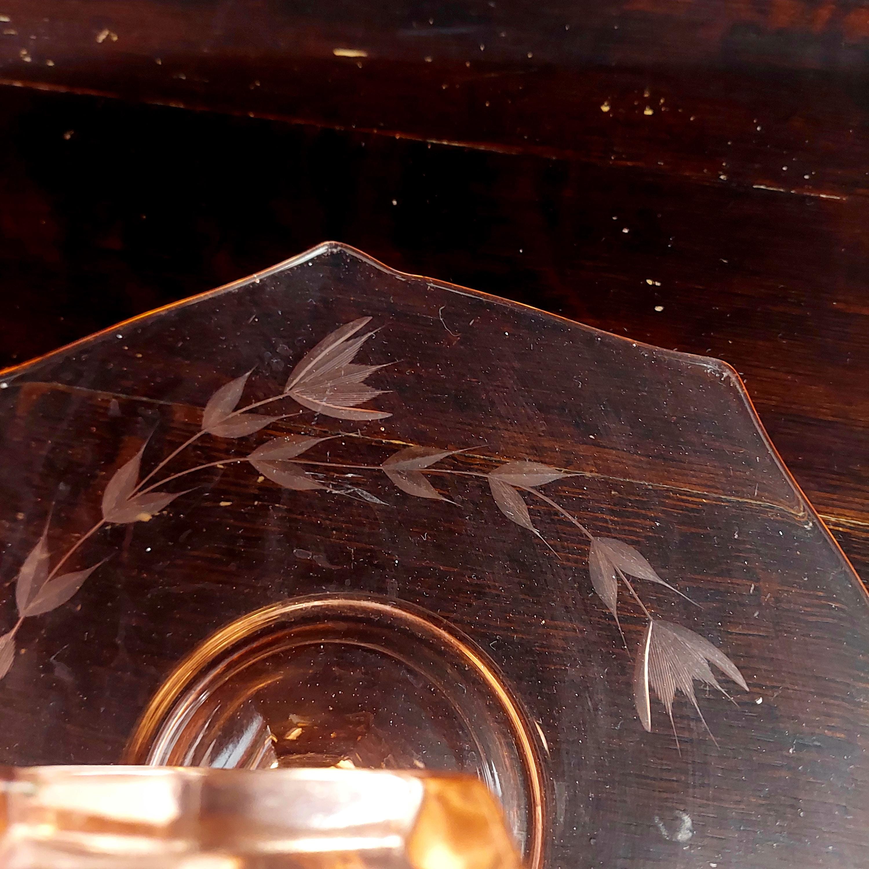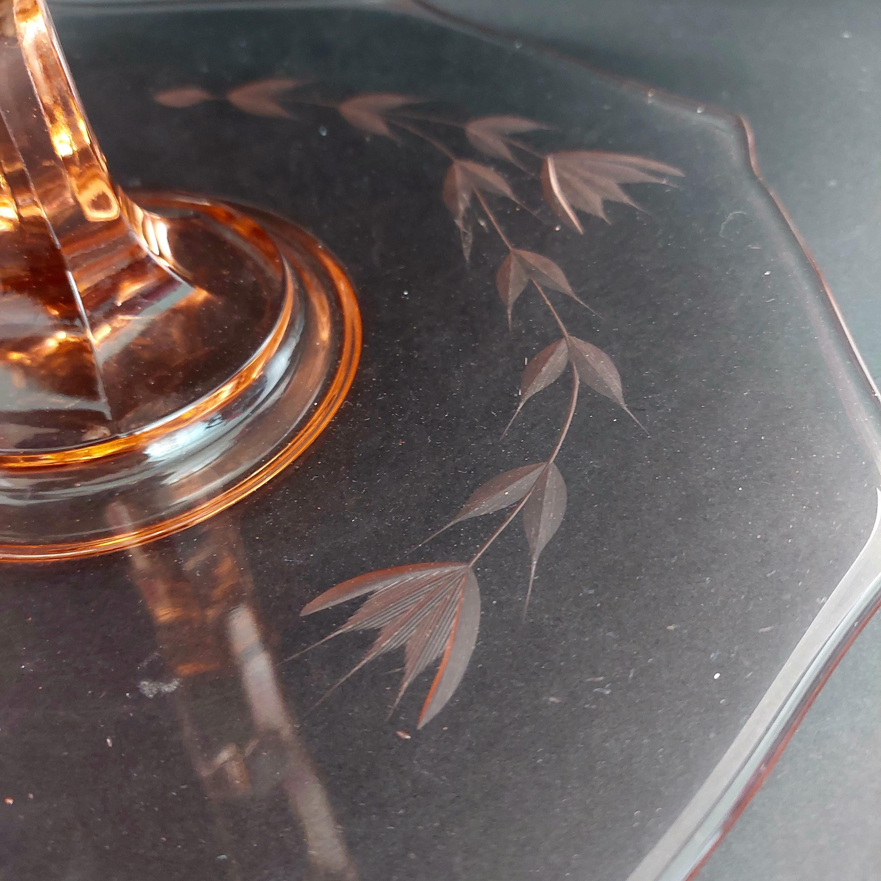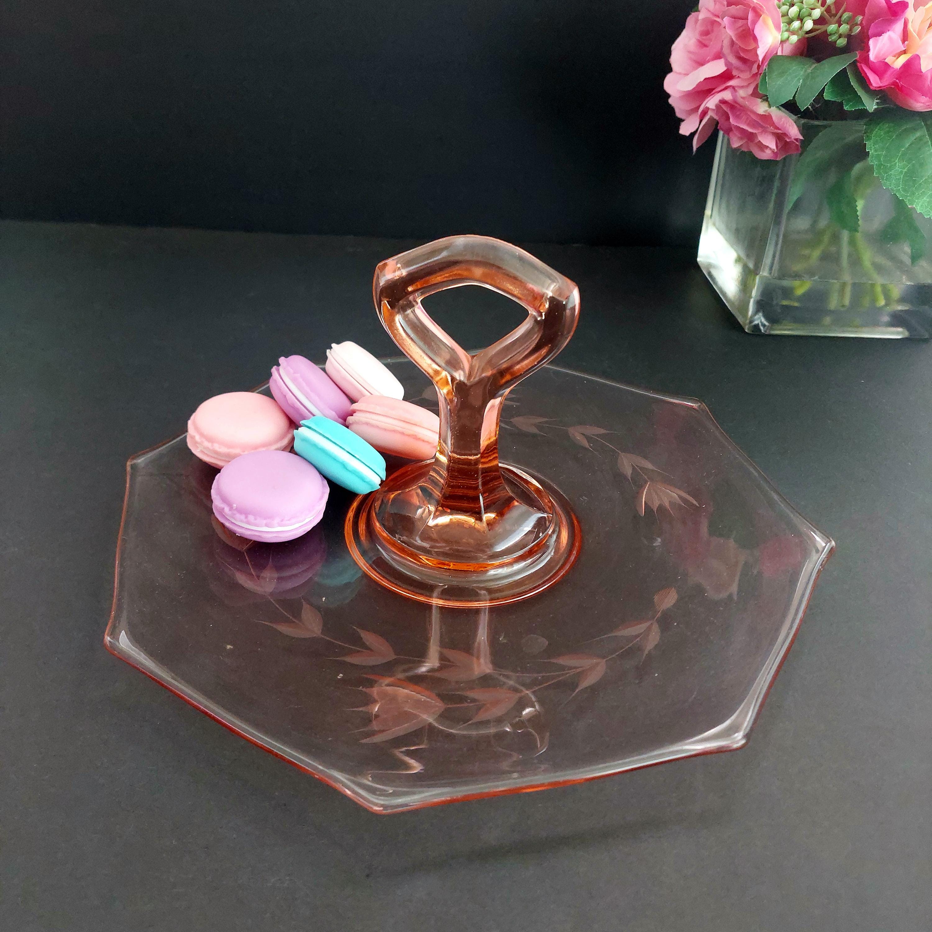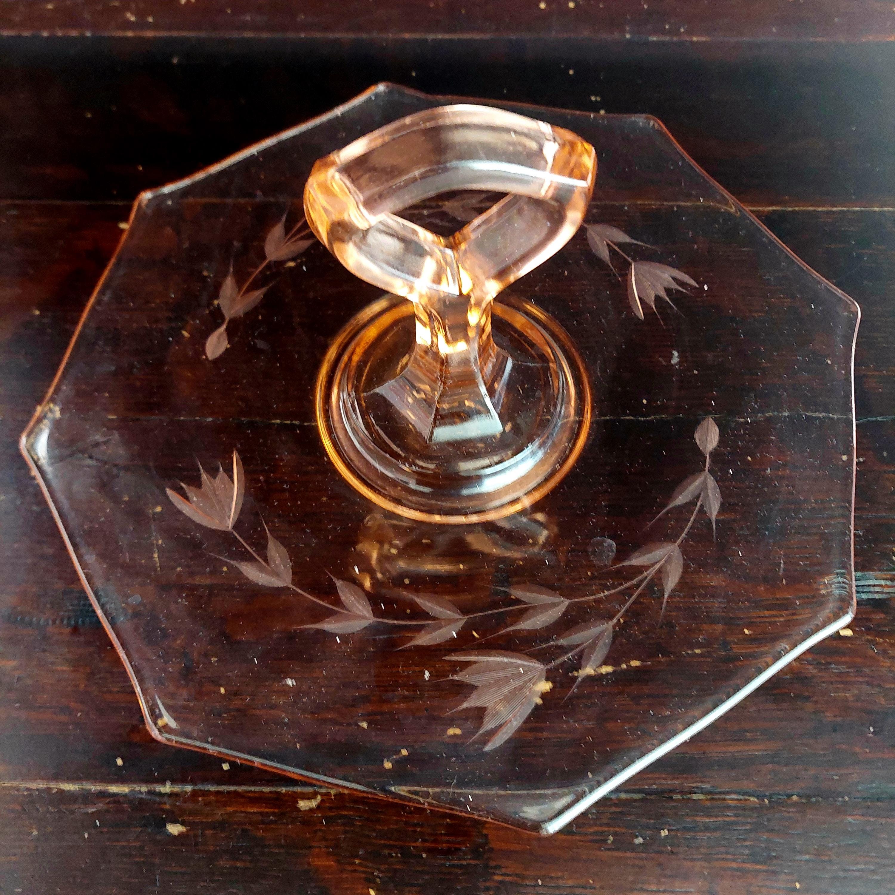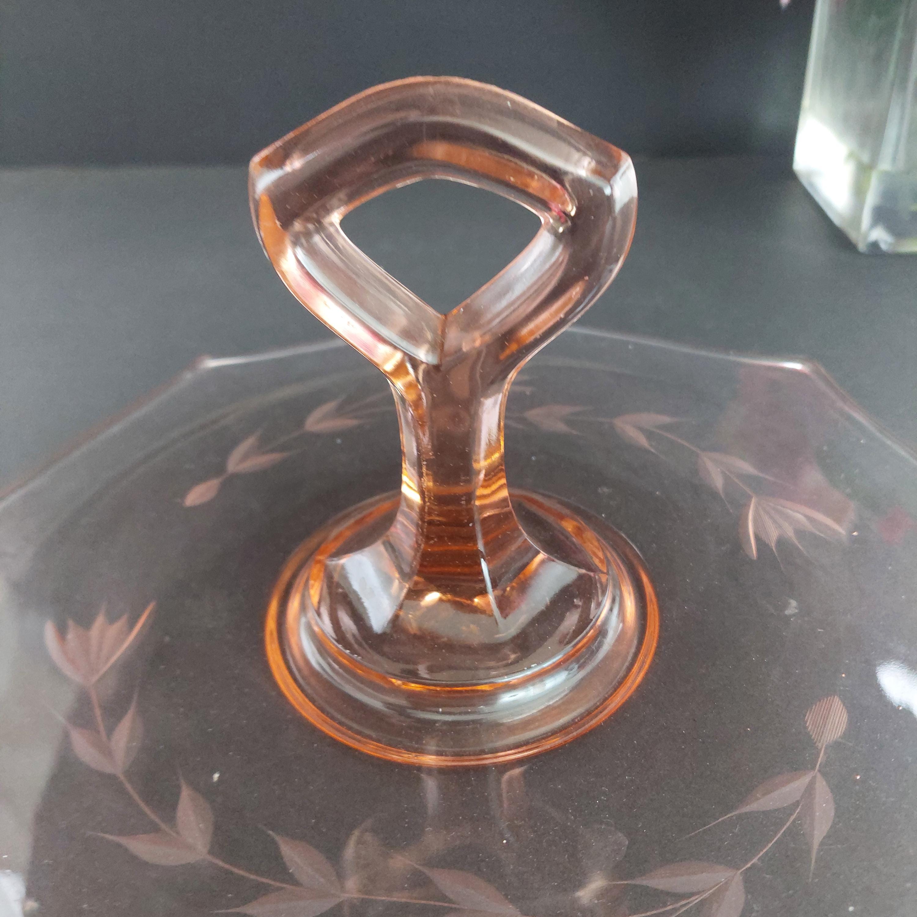 Pink Depression Glass Octagon Serving Plate Center Handle Etched Floral Design