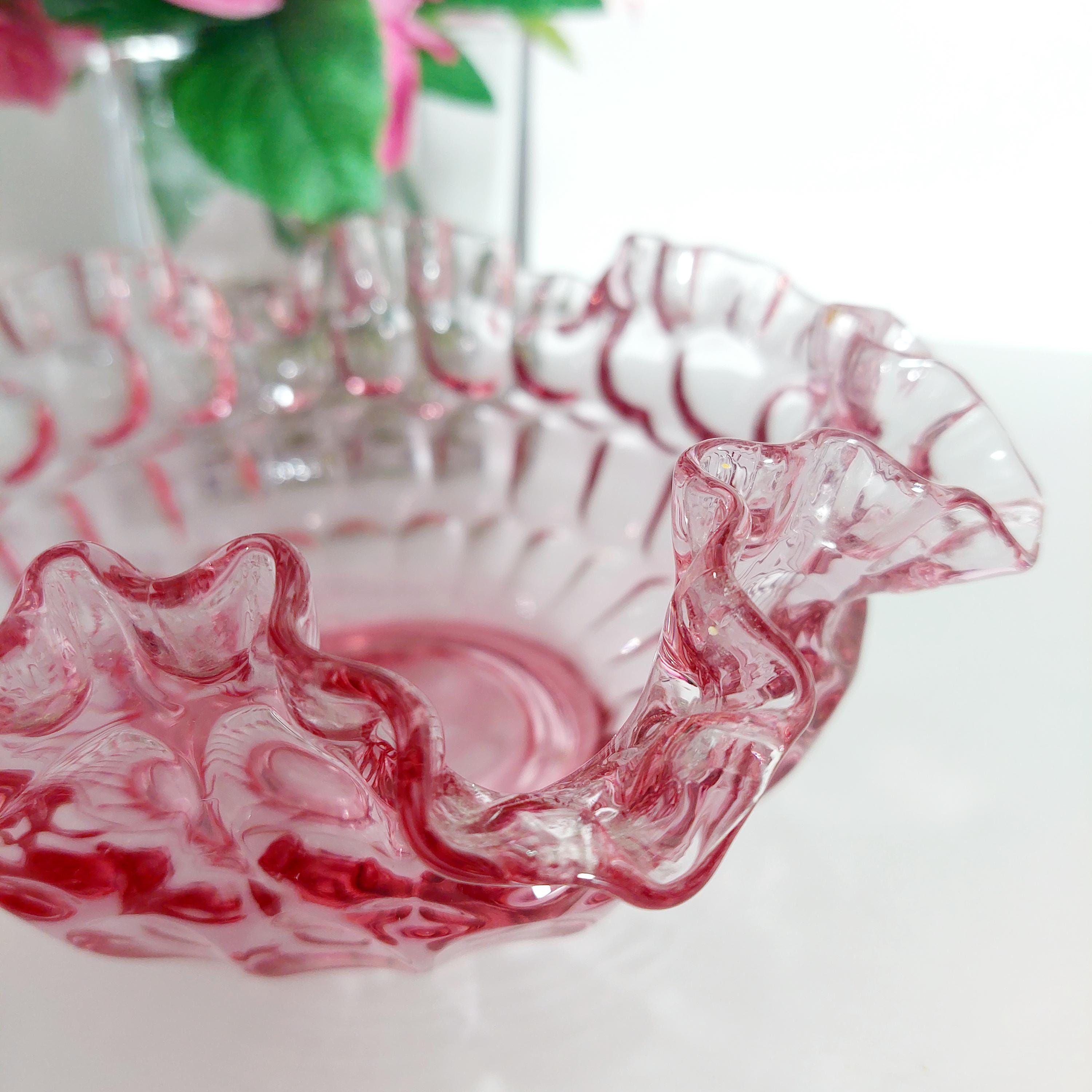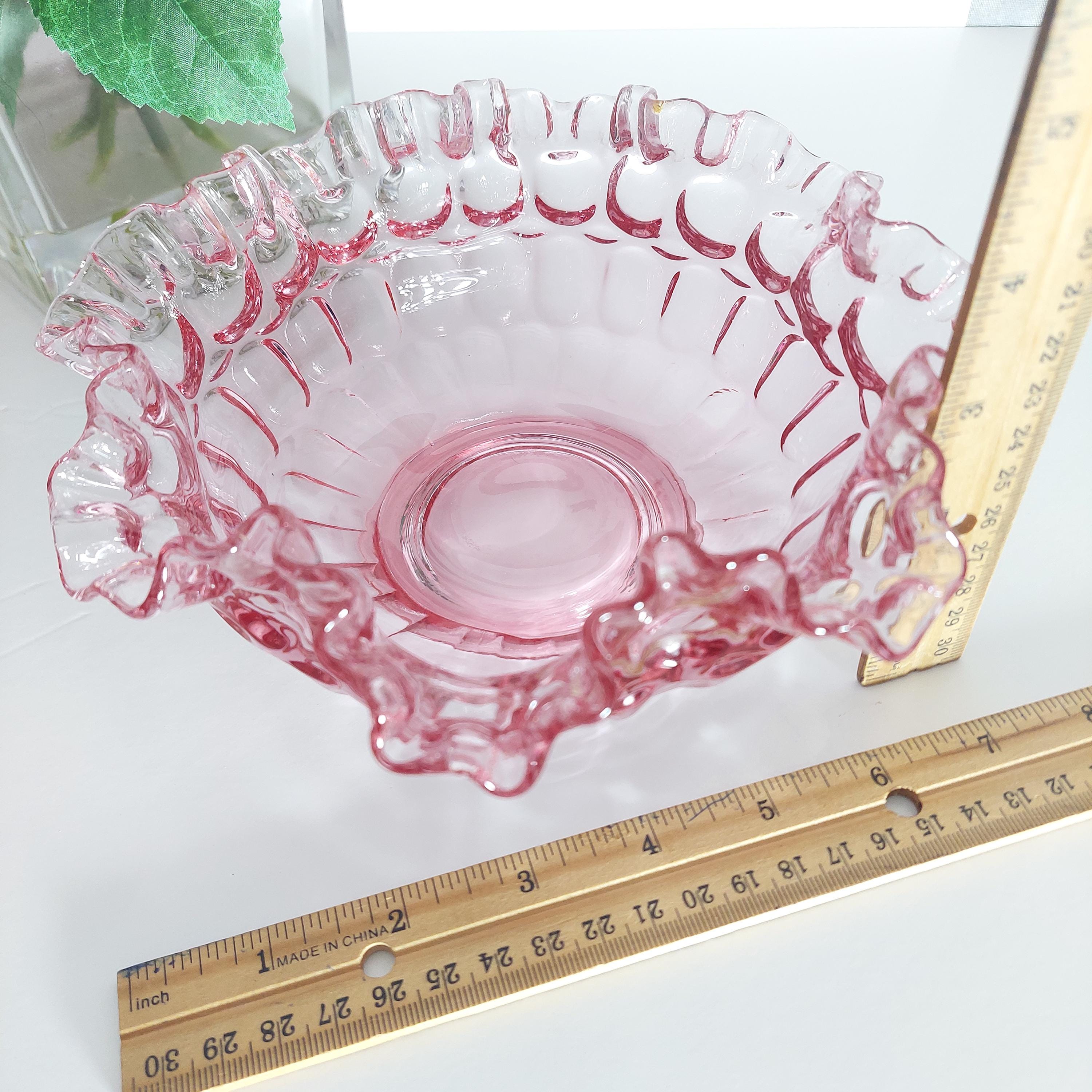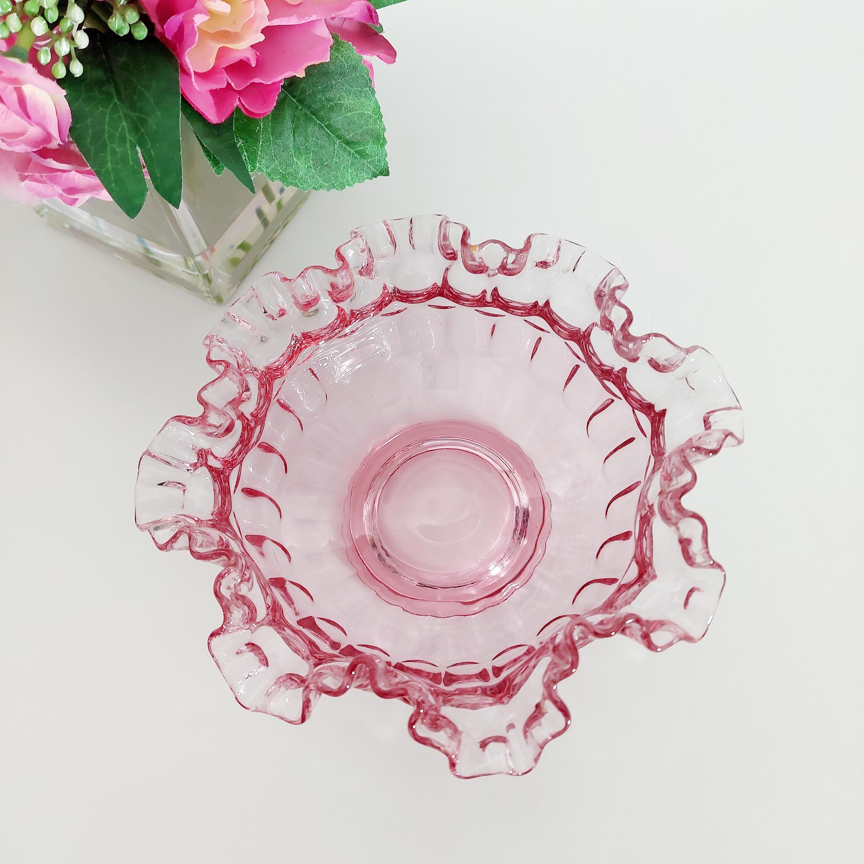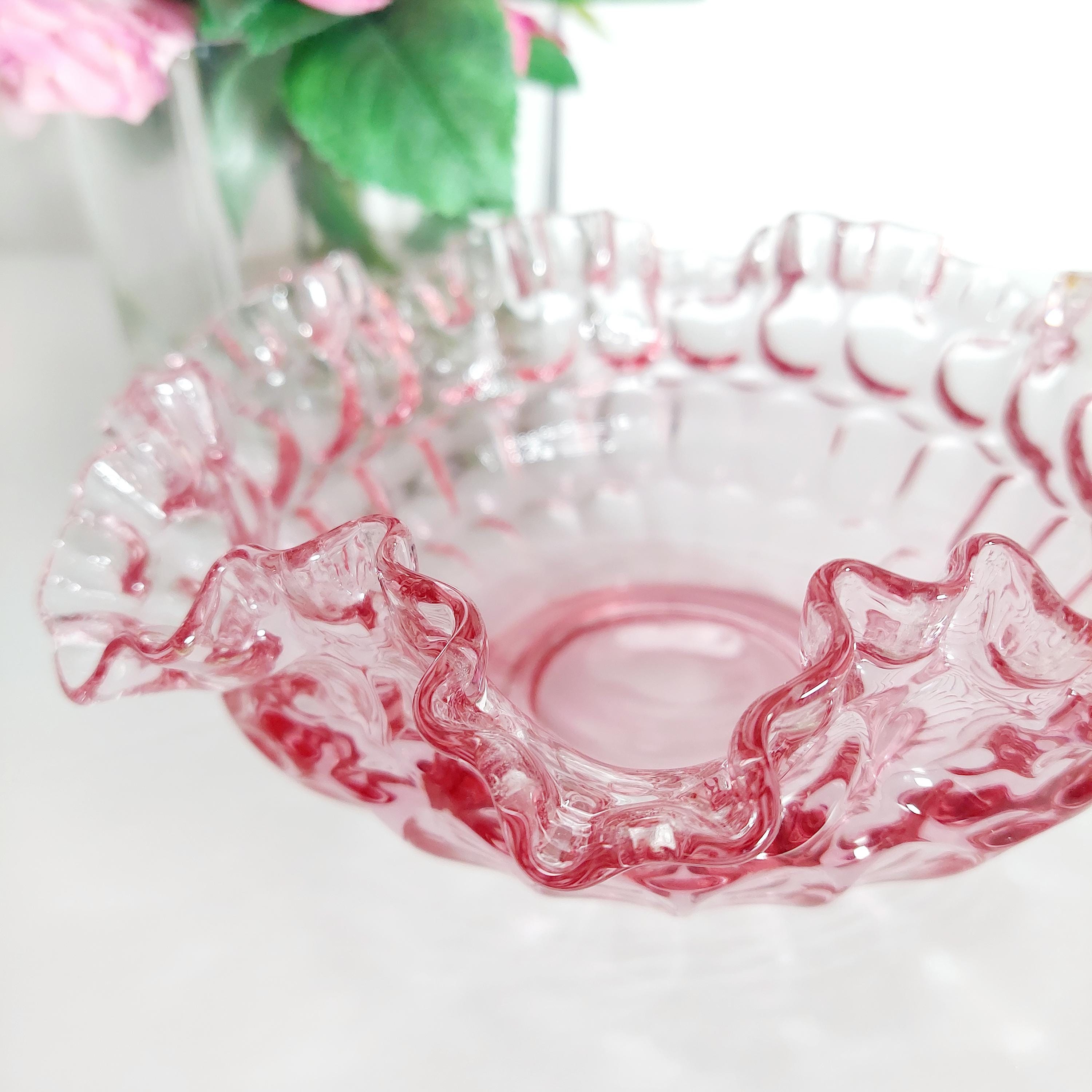 Vintage Fenton pink cranberry compote bowl with ruffled, crimped rim and thumbprint pattern.