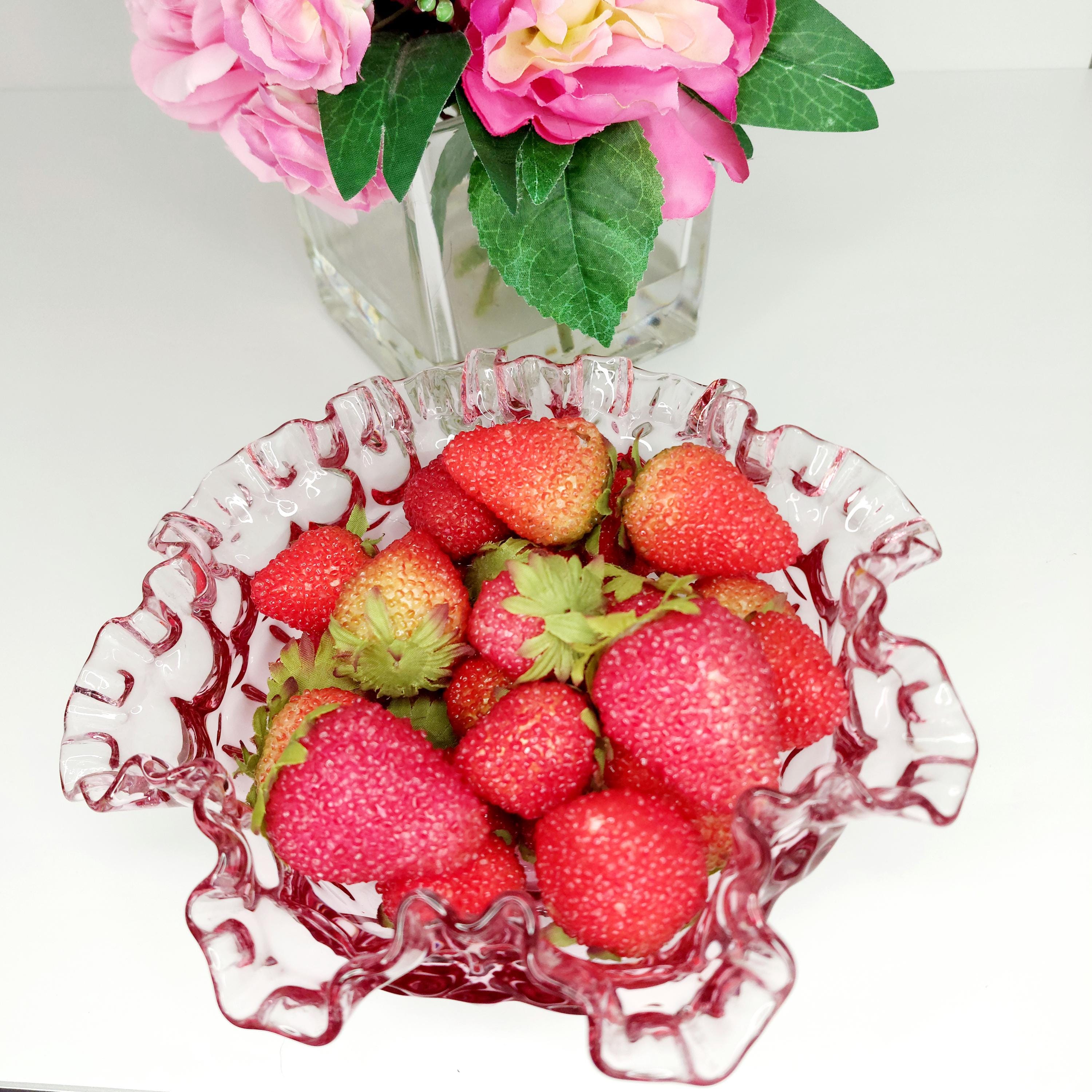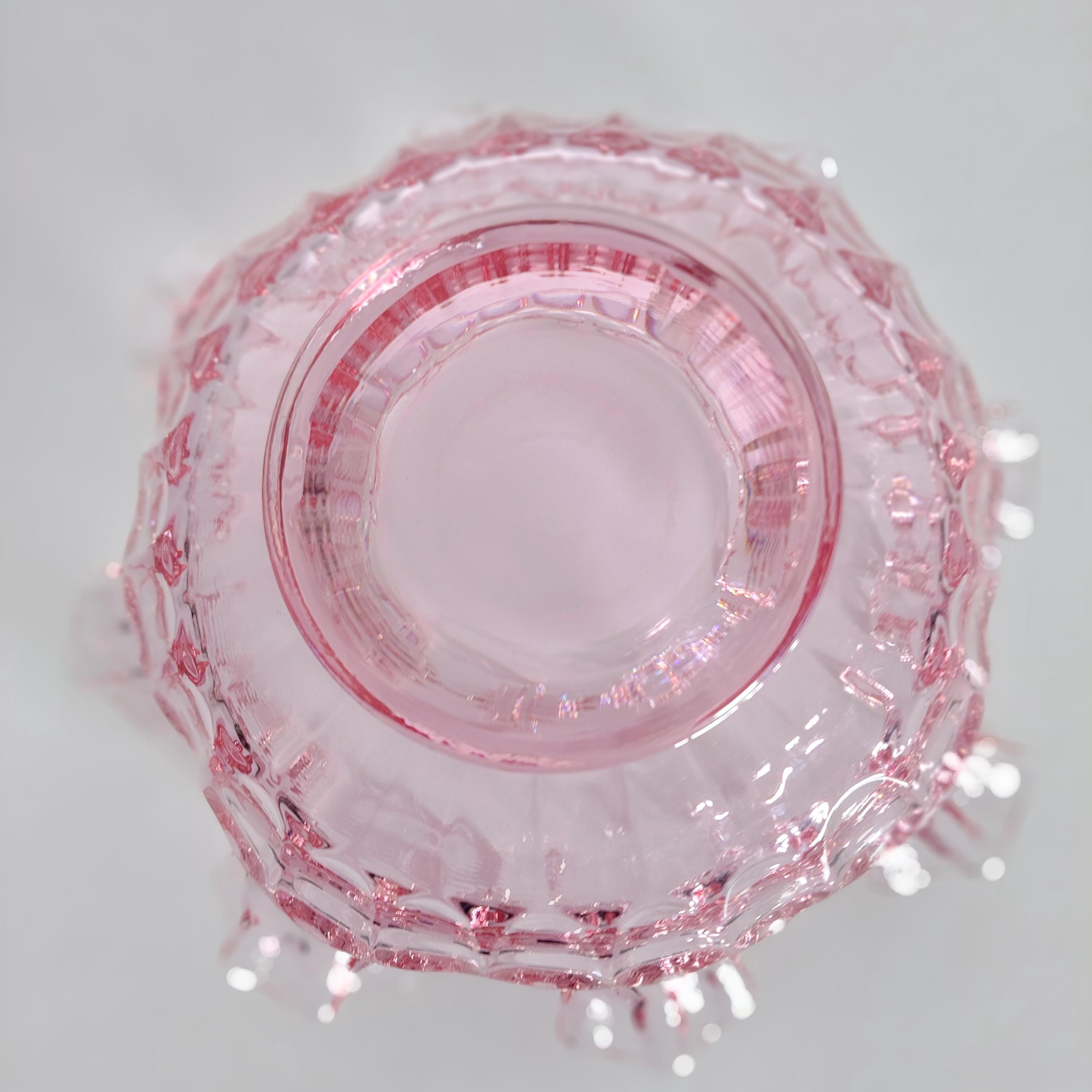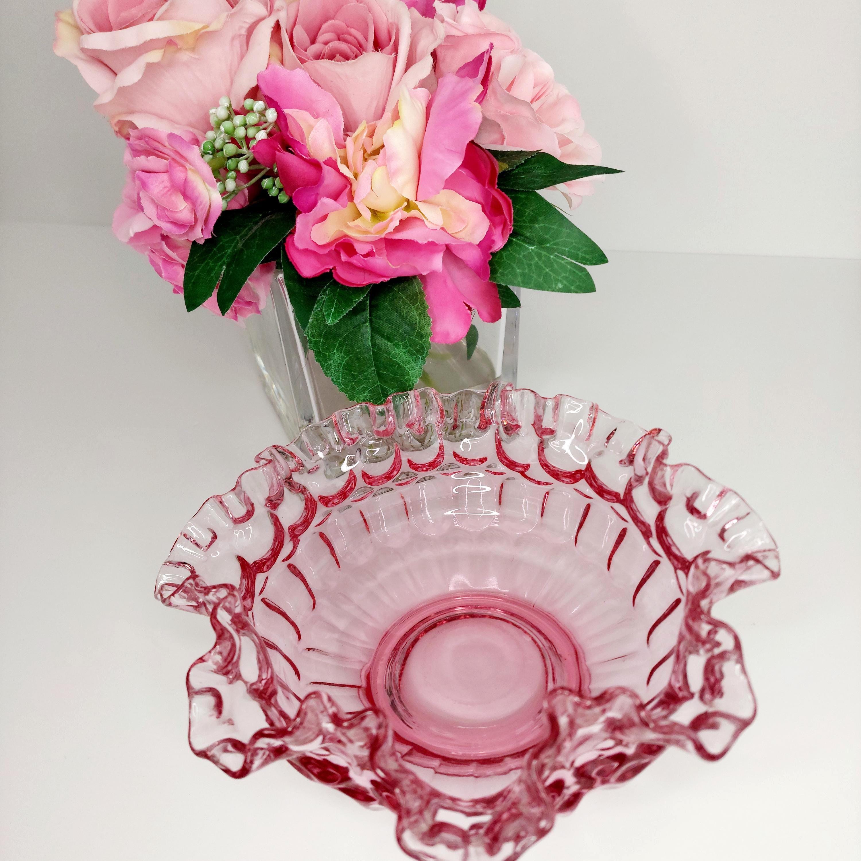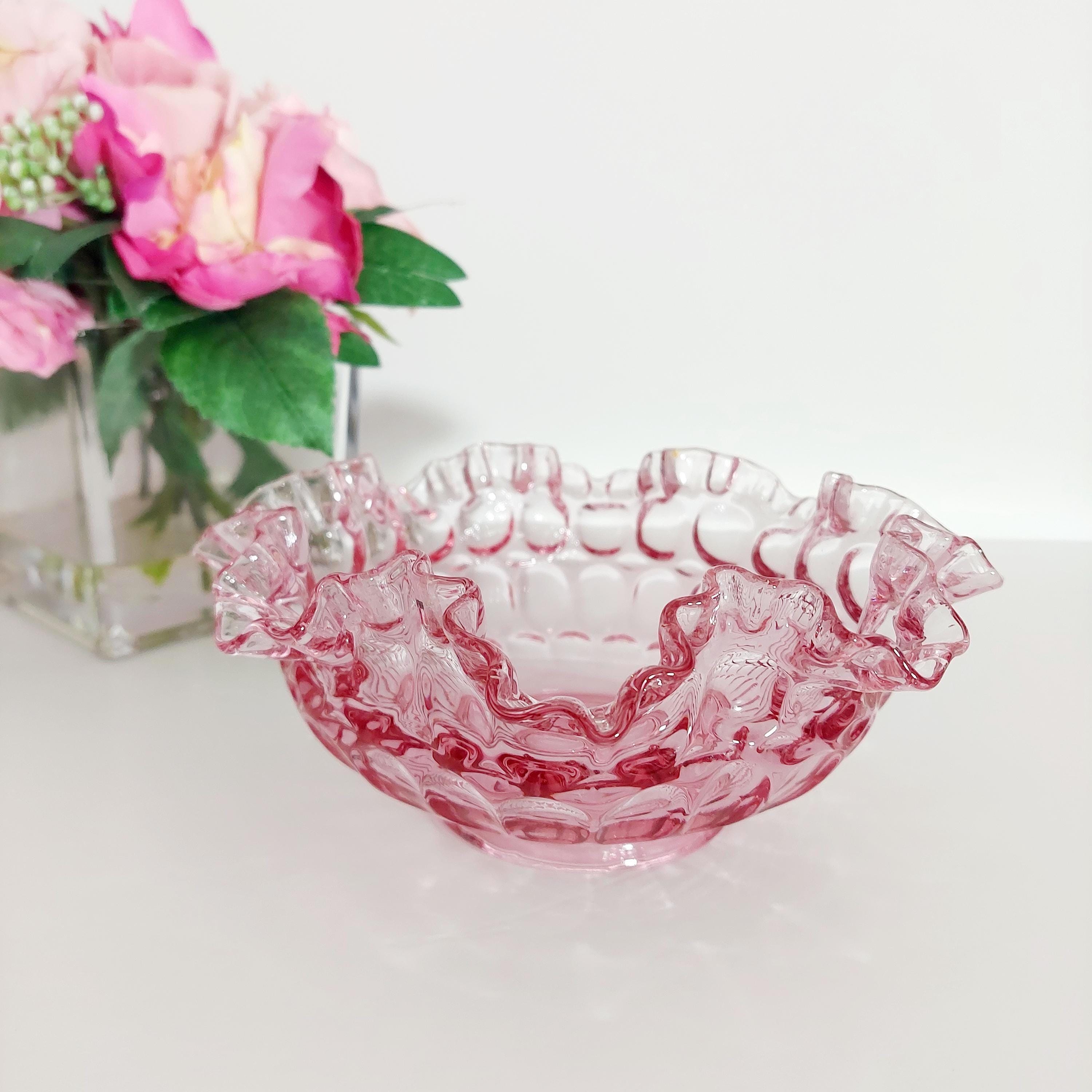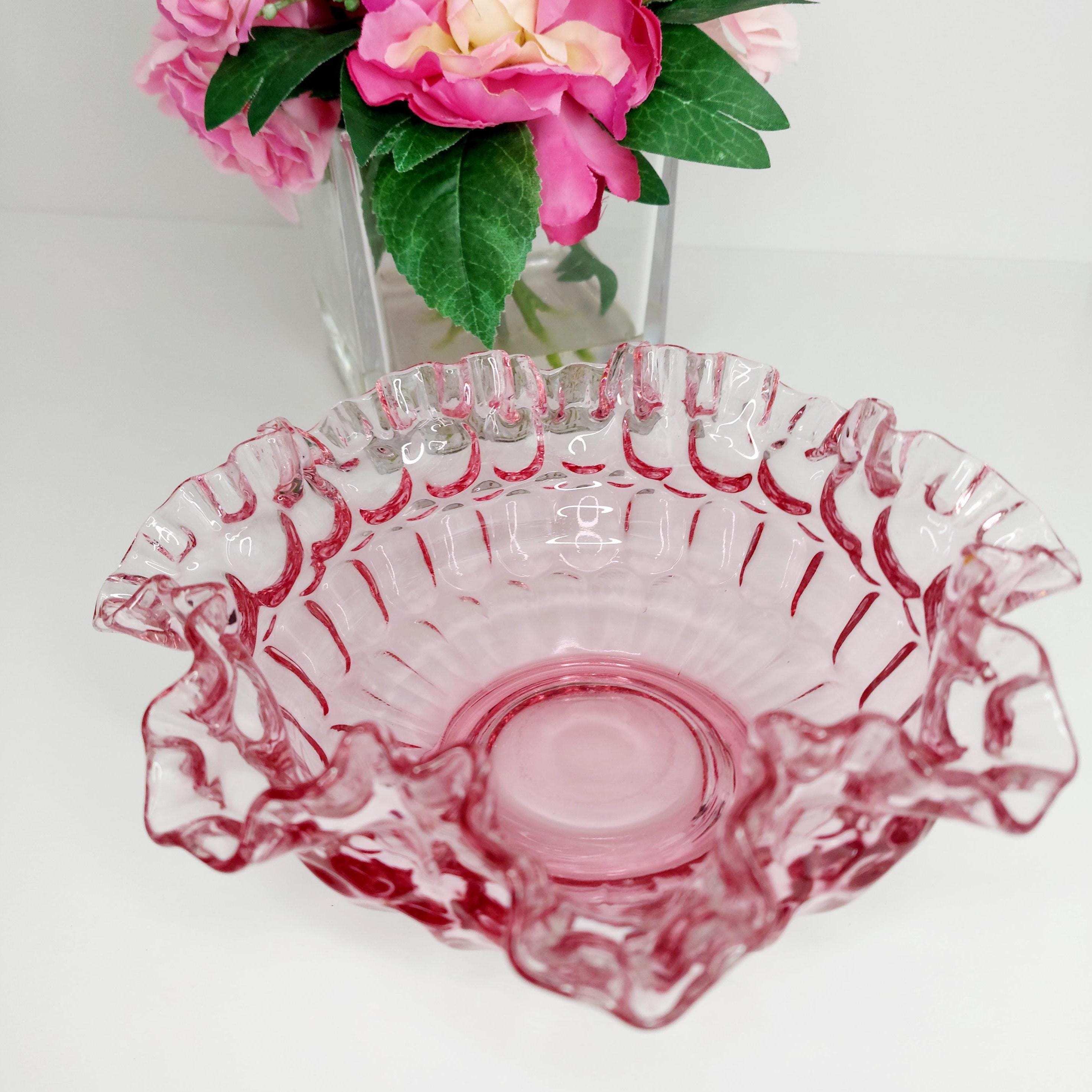 Vintage Fenton pink cranberry compote bowl with ruffled, crimped rim and thumbprint pattern.