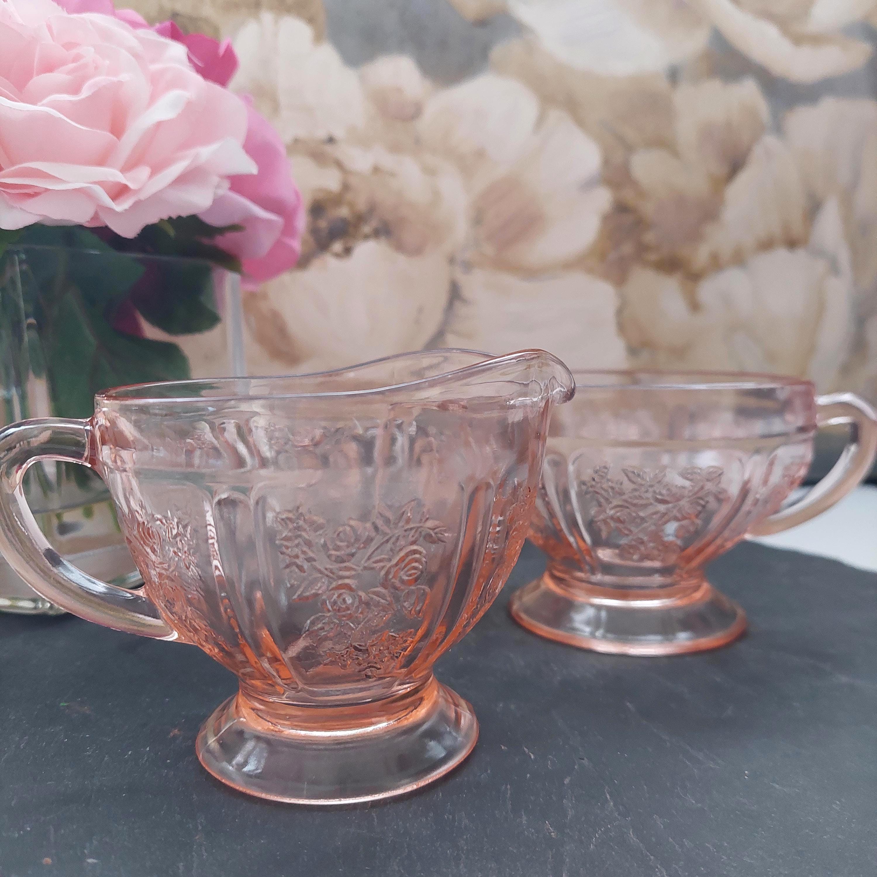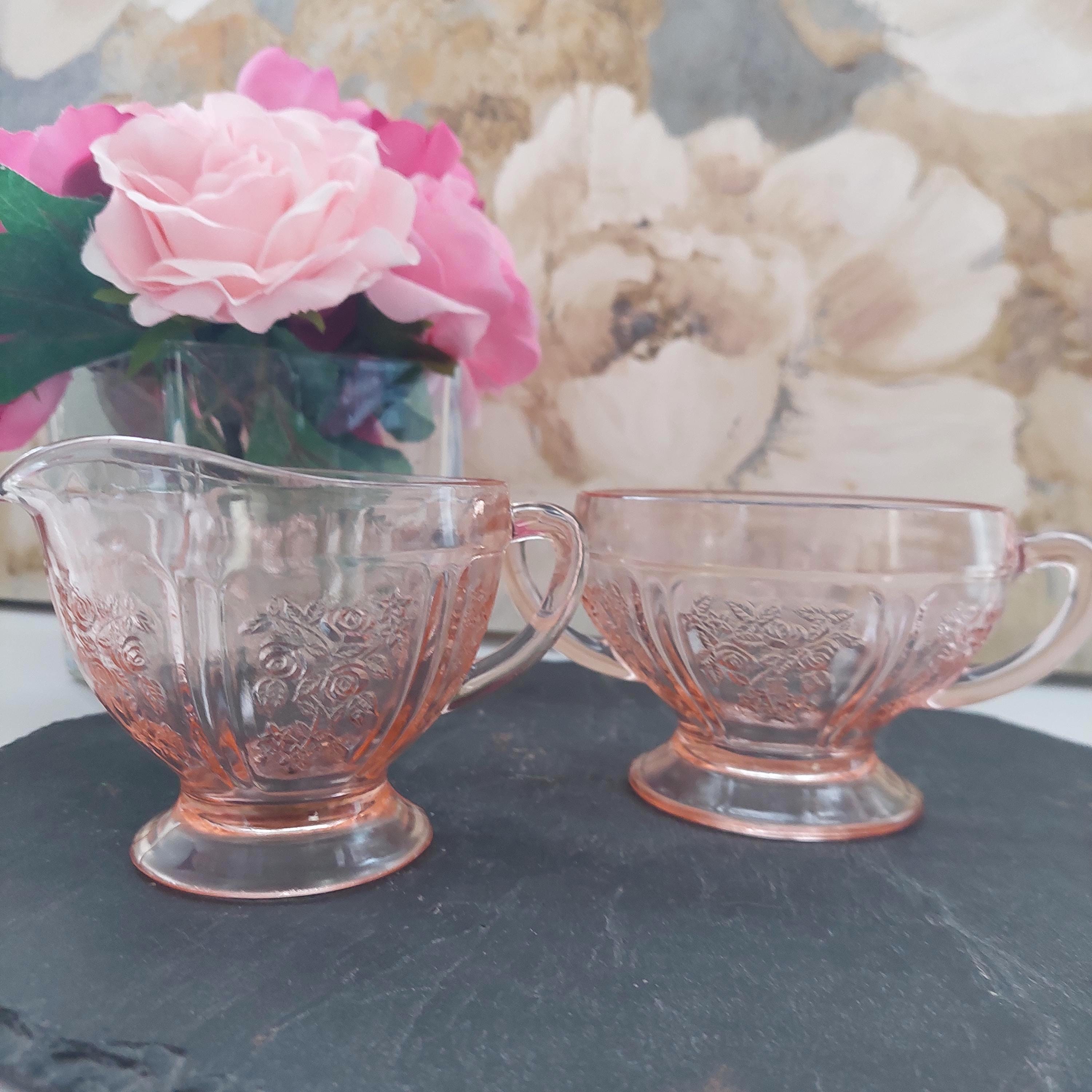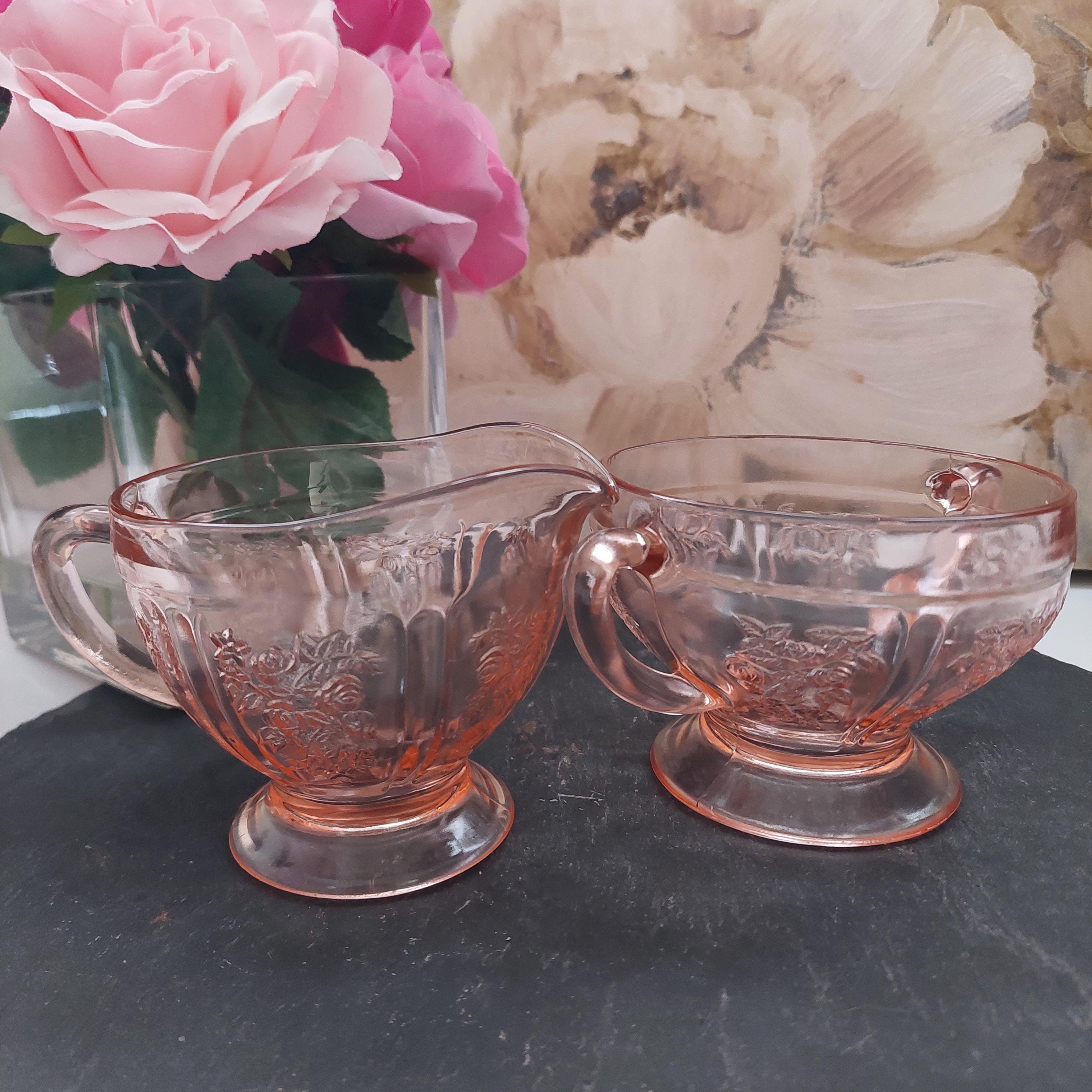 Pink Depression glass open sugar bowl & matching cream jug in Sharon or Cabbage Rose pattern by Federal Glass.