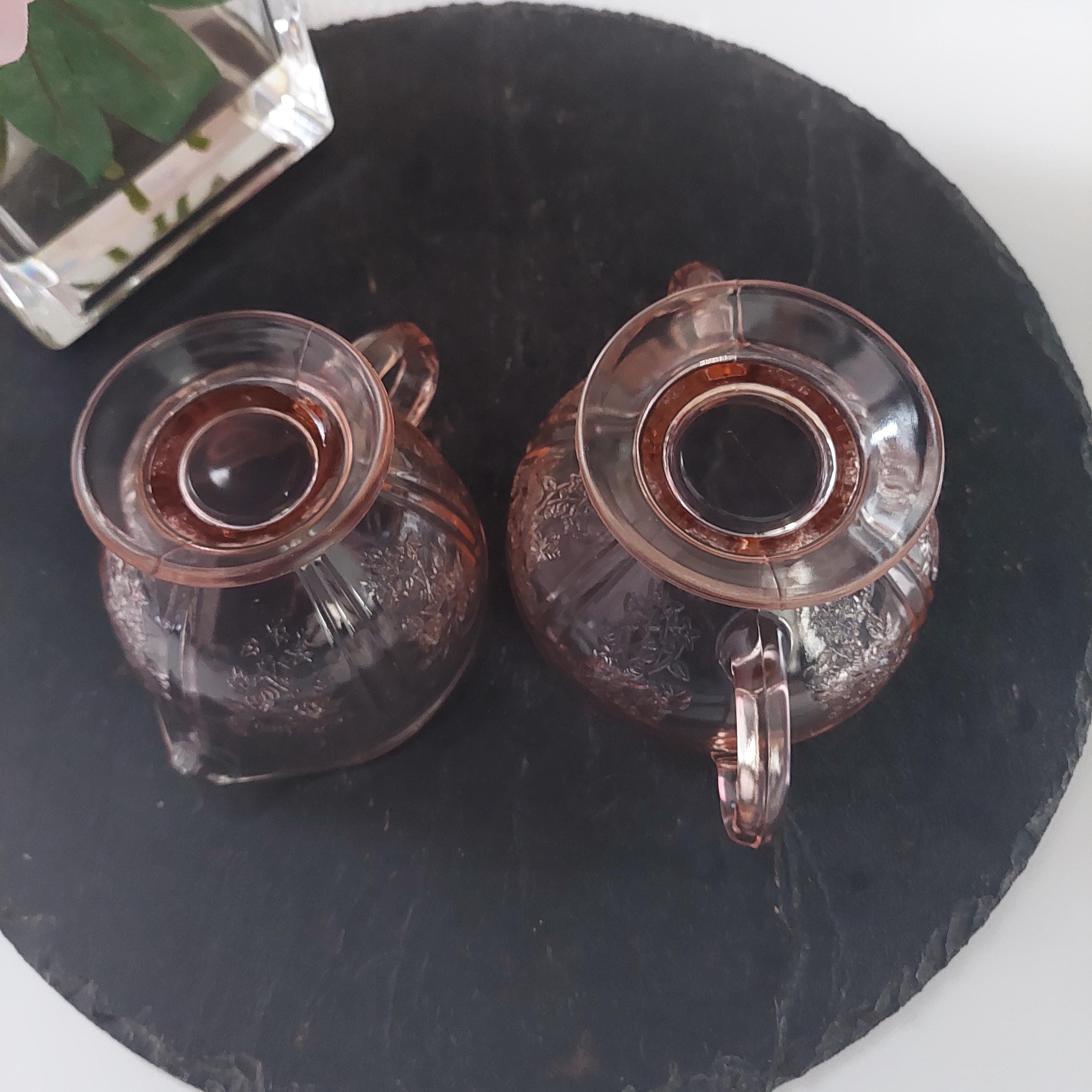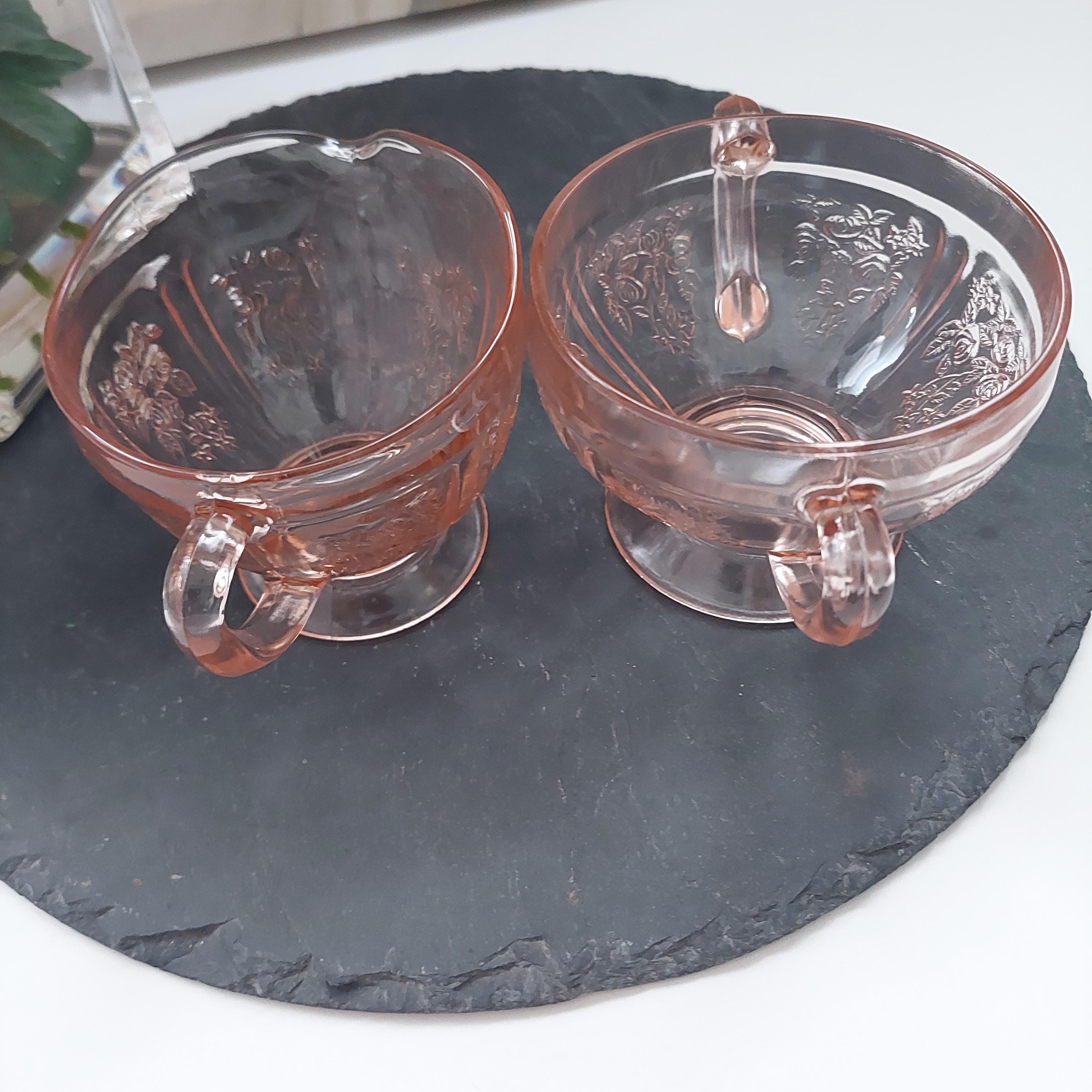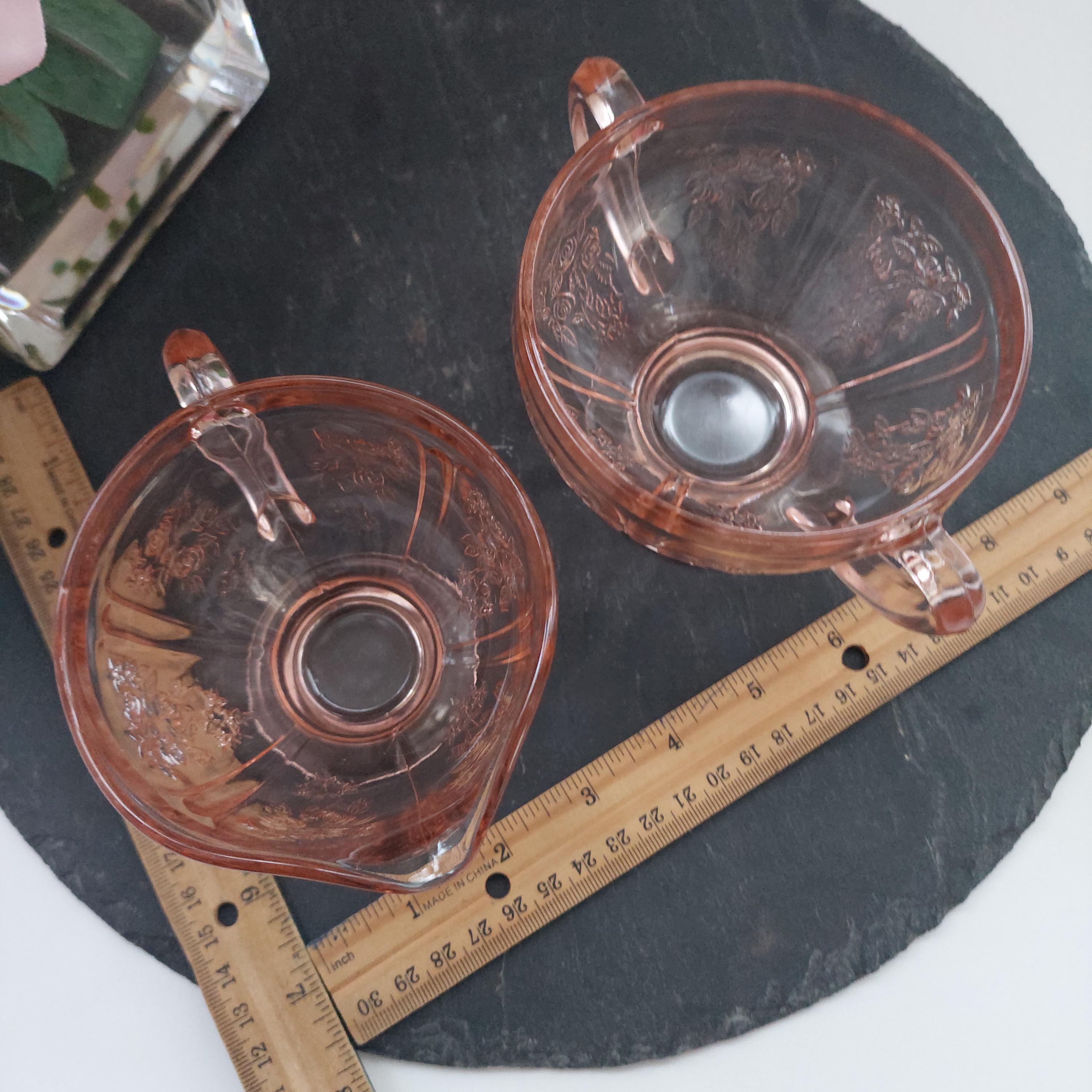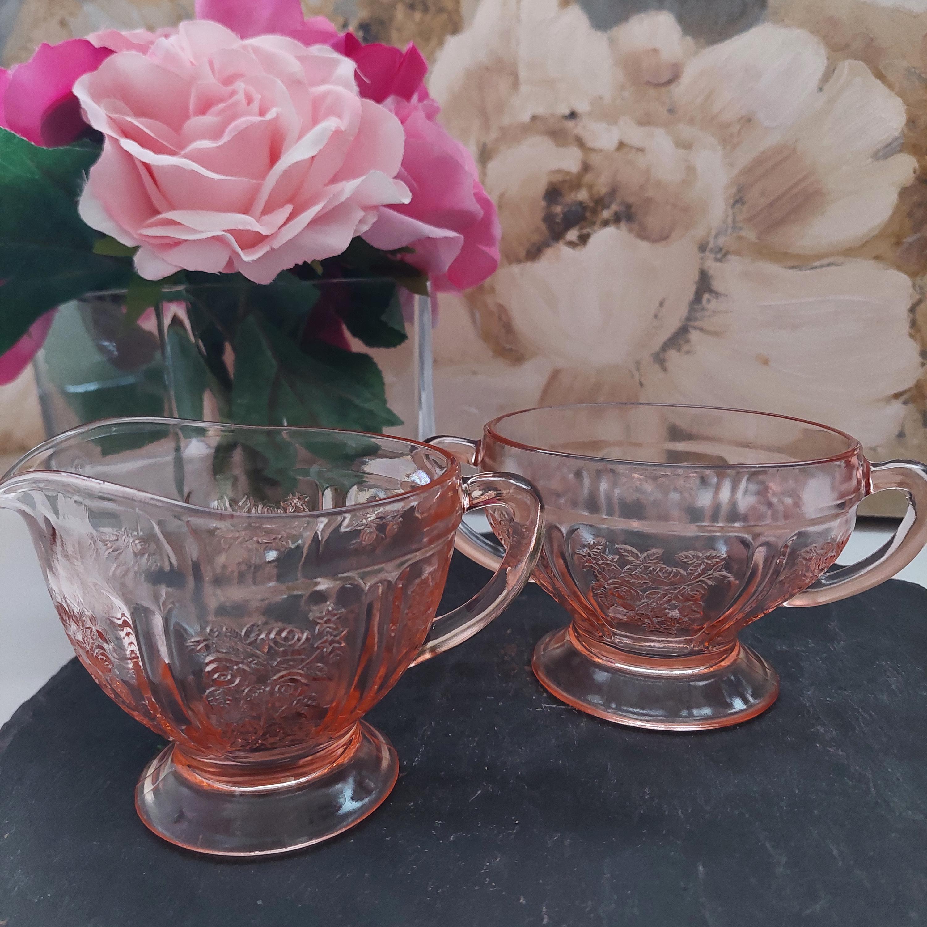Pink Depression glass open sugar bowl & matching cream jug in Sharon or Cabbage Rose pattern by Federal Glass.