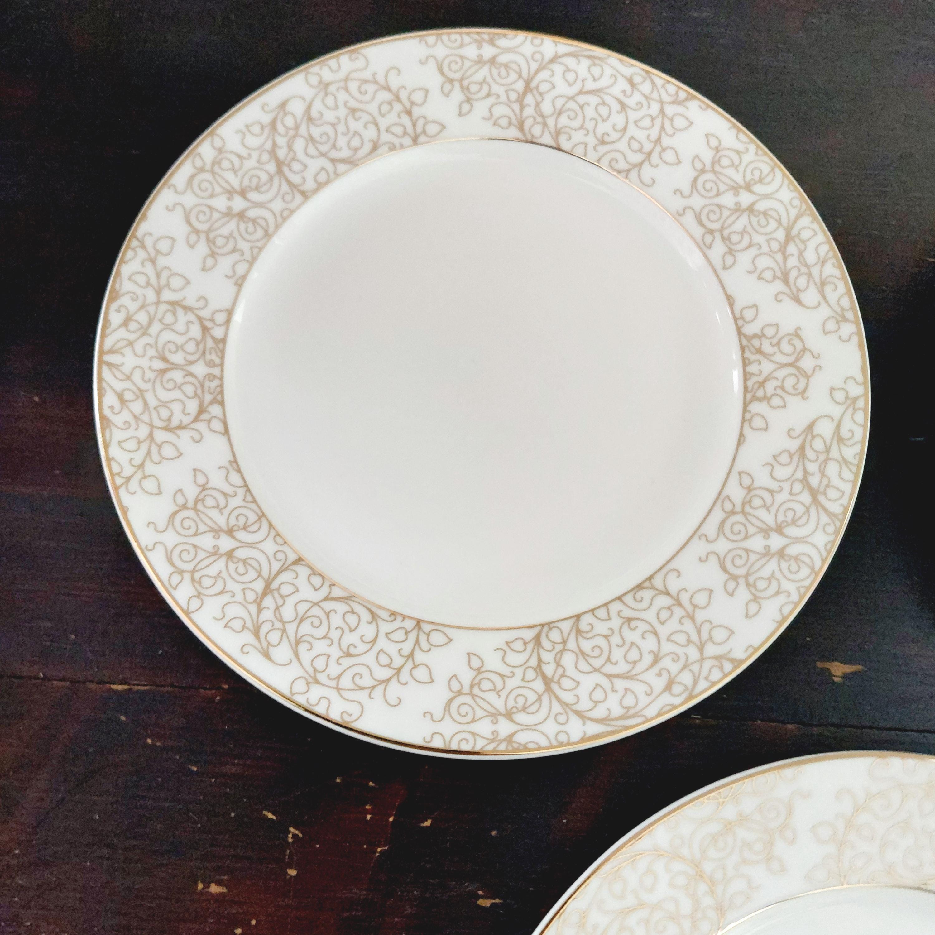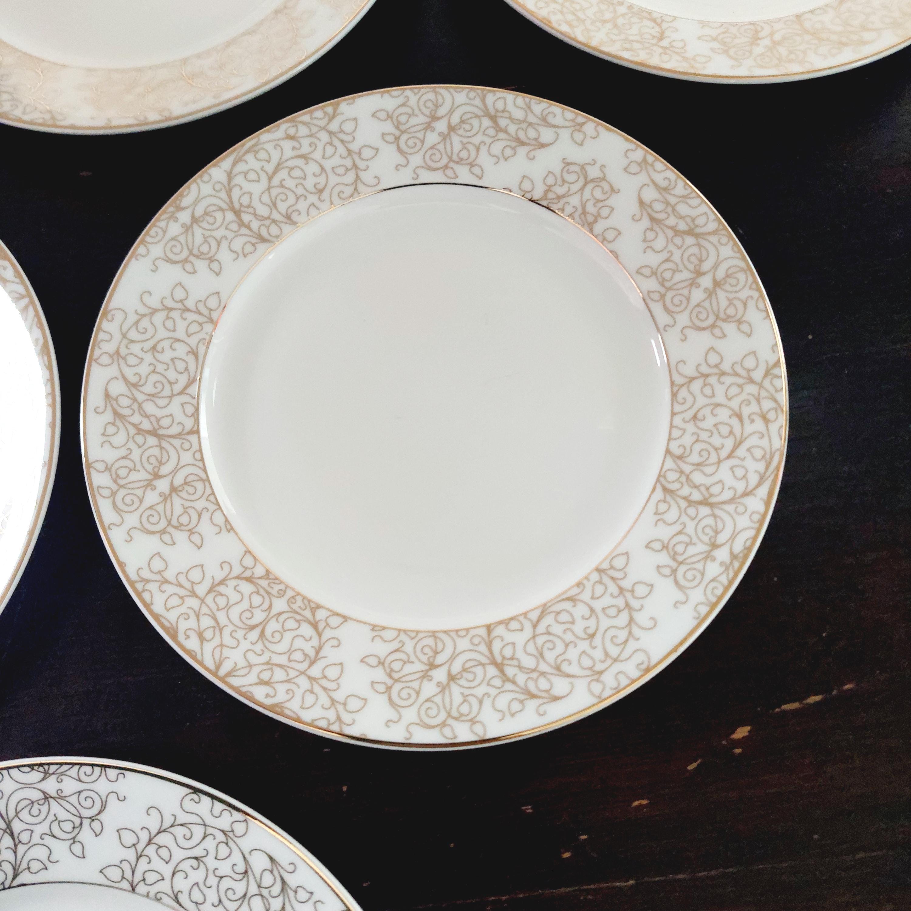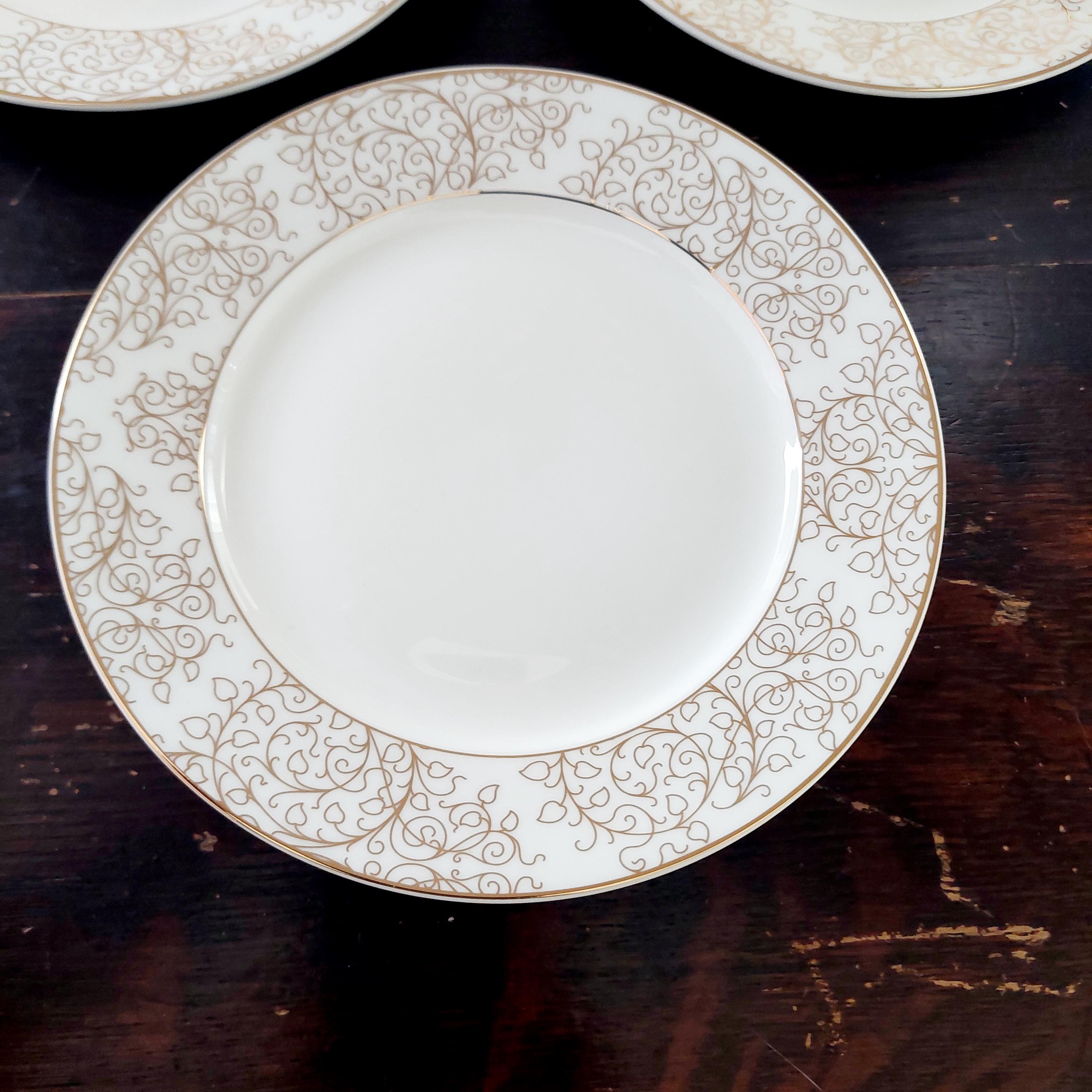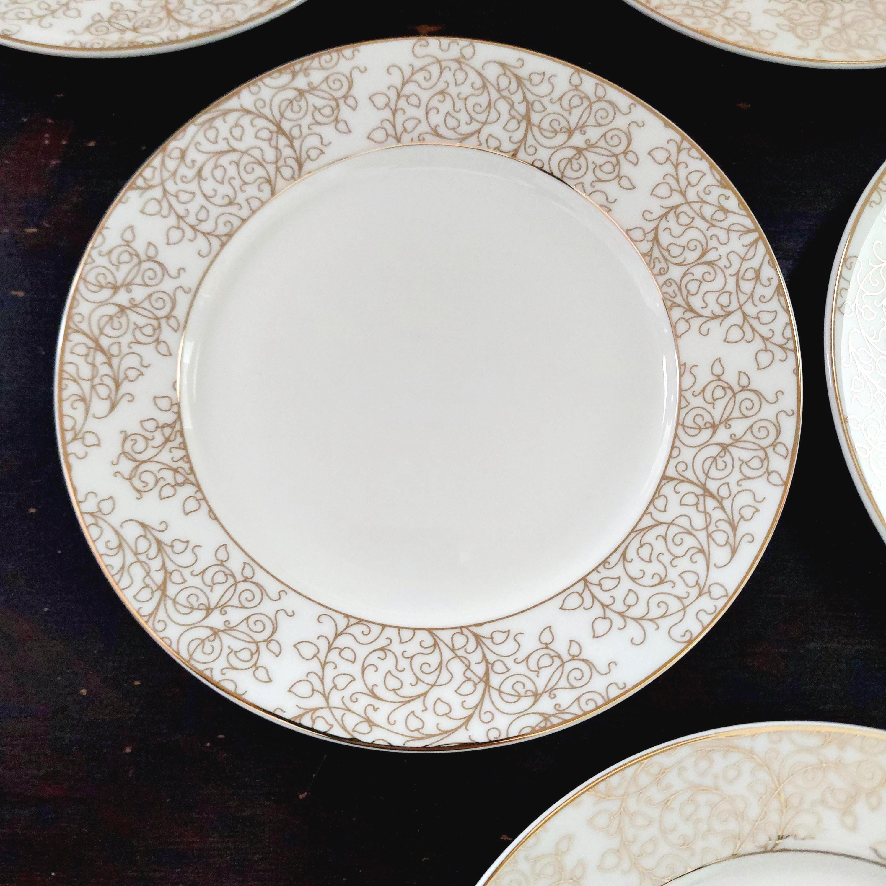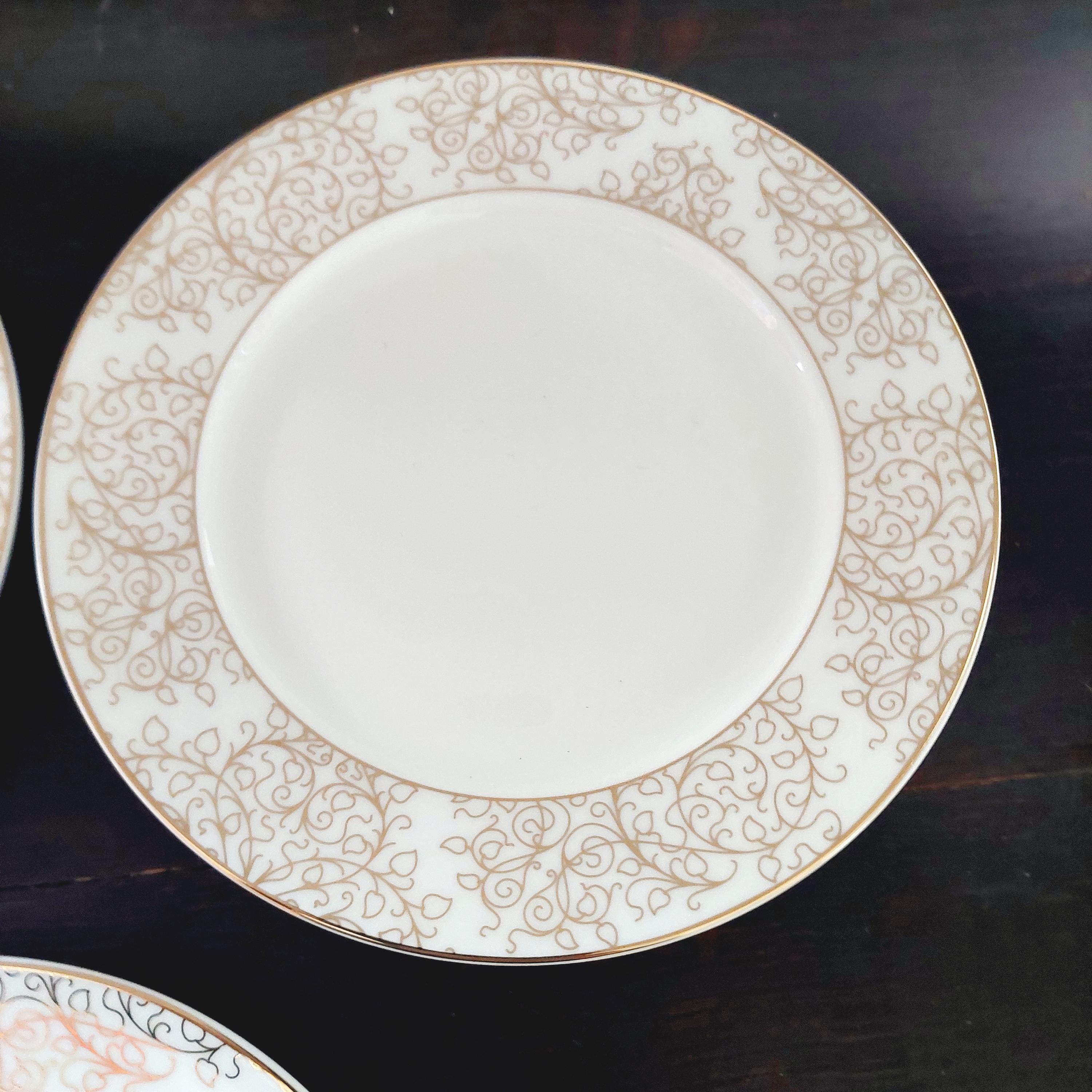 Vintage bone china side plate set featuring golden Florentine leaf vine design on rim with gold trimmed edge.