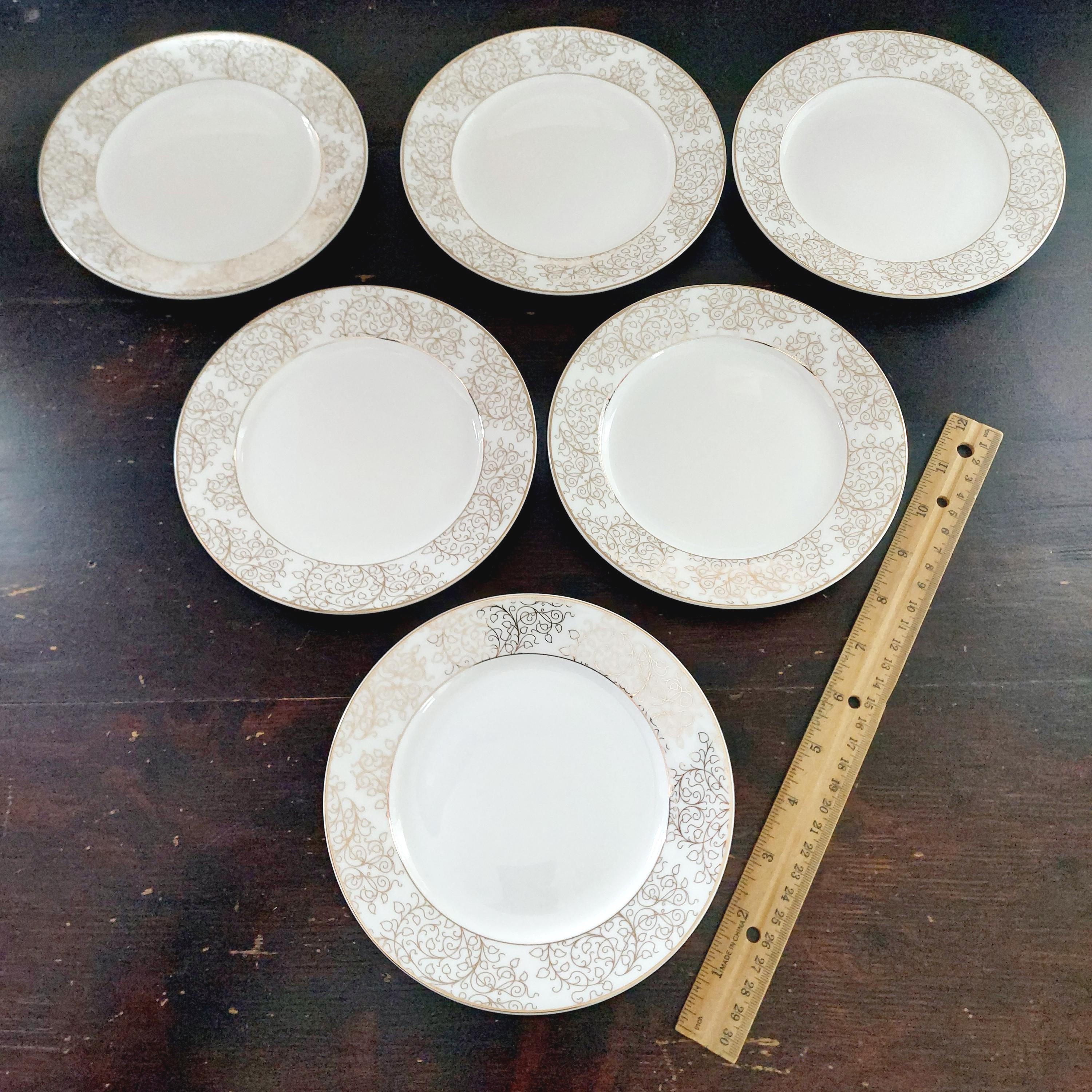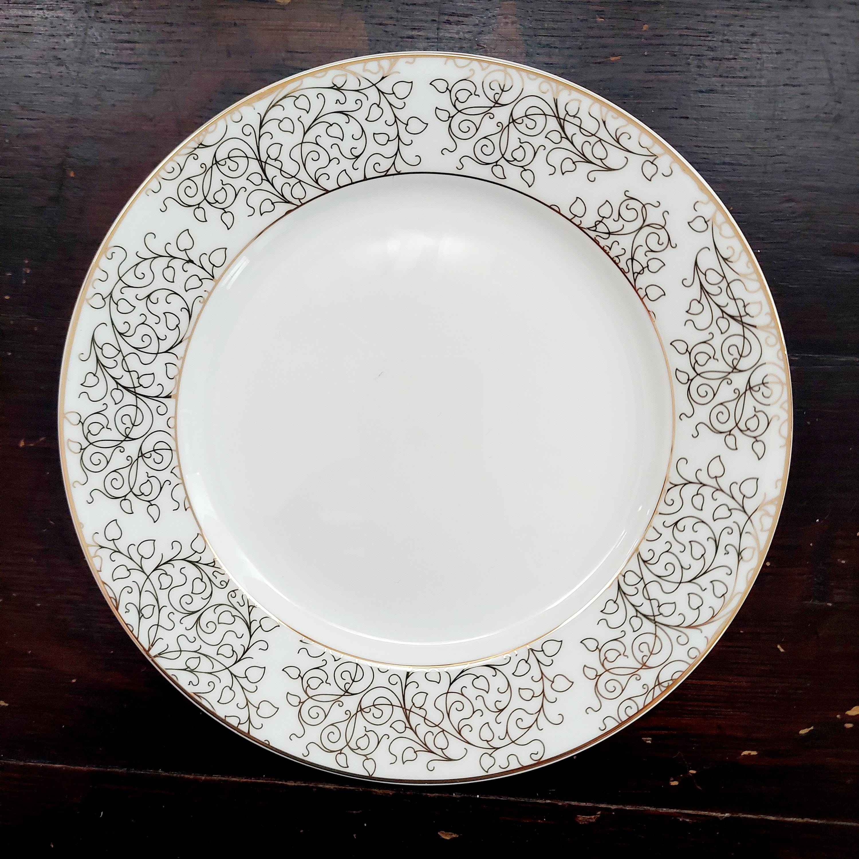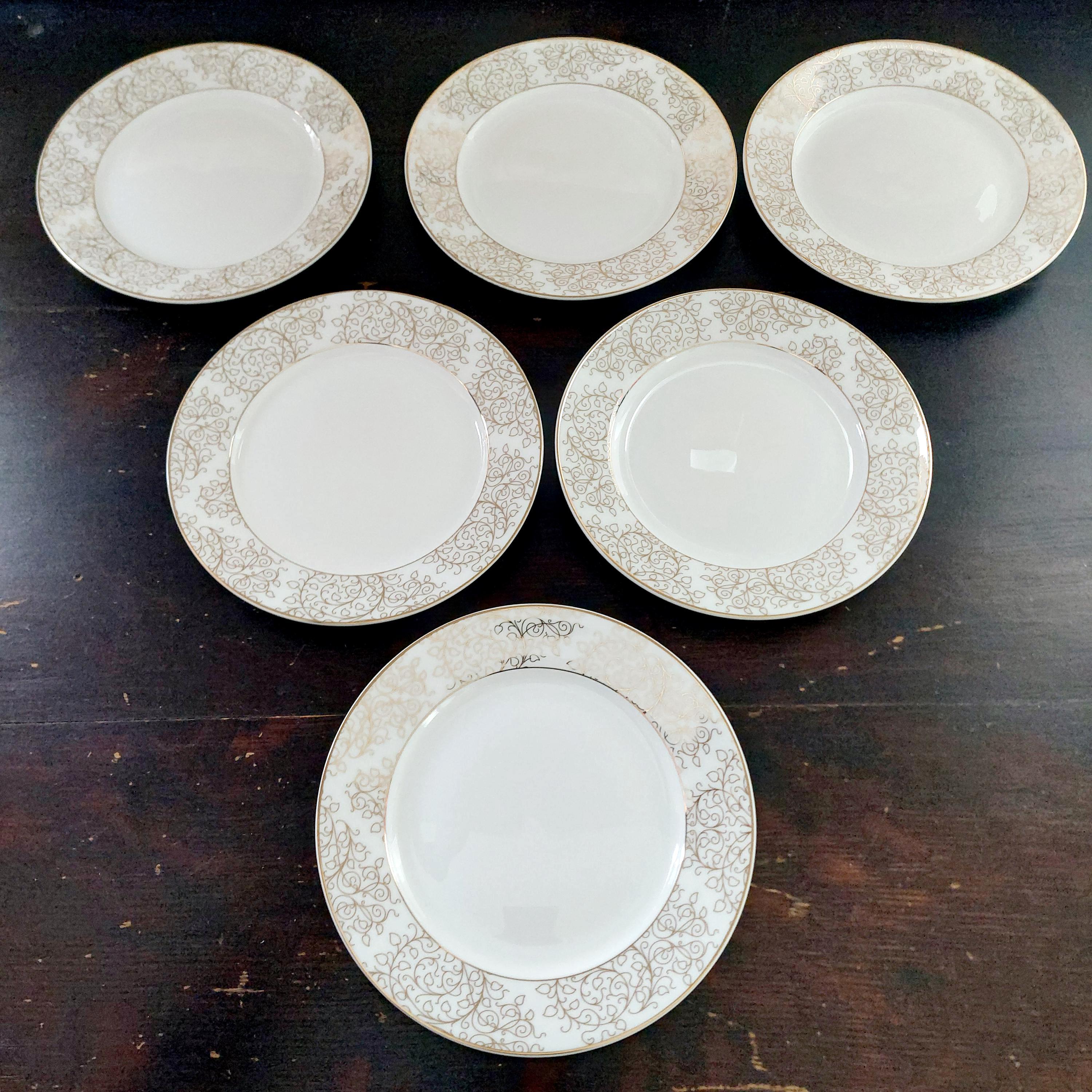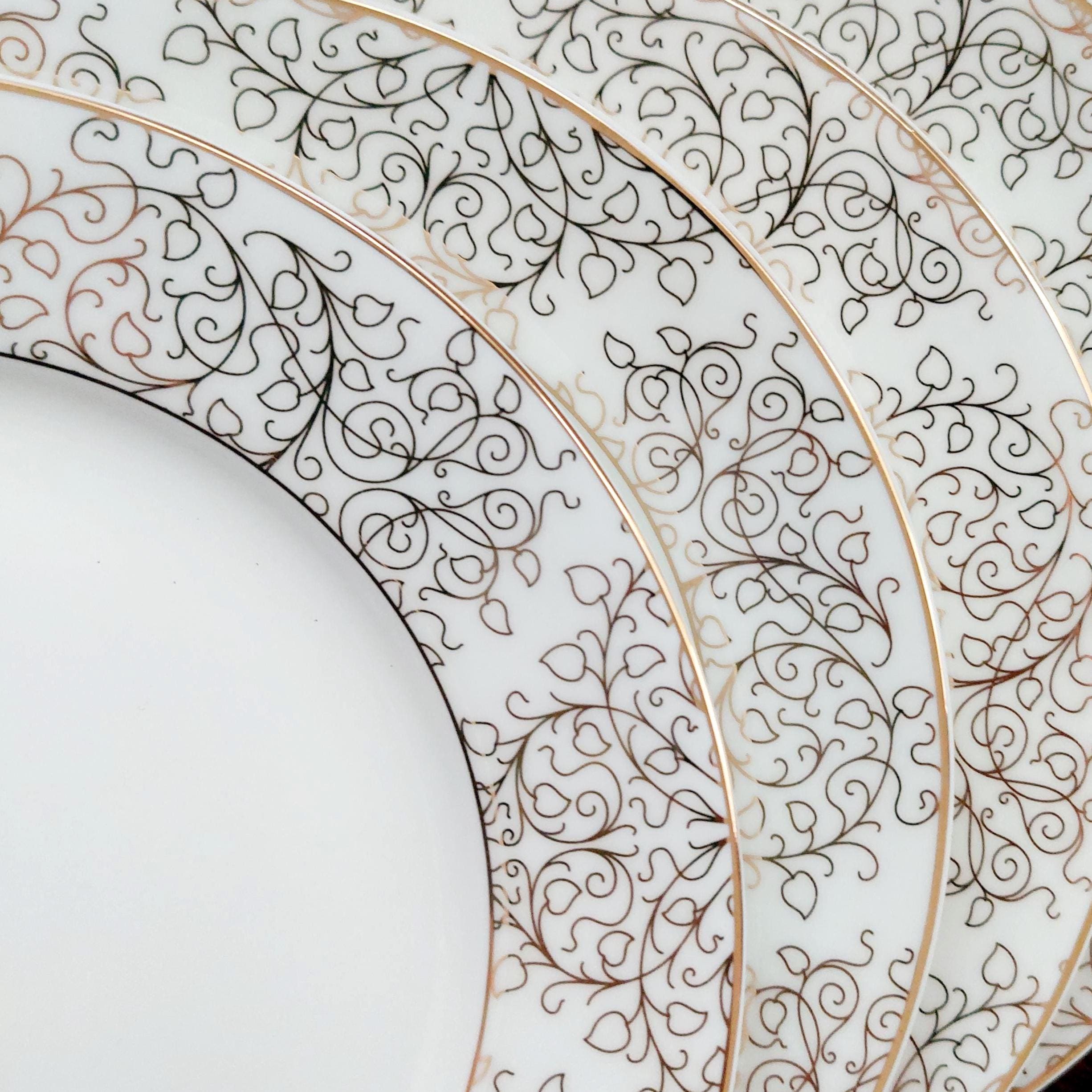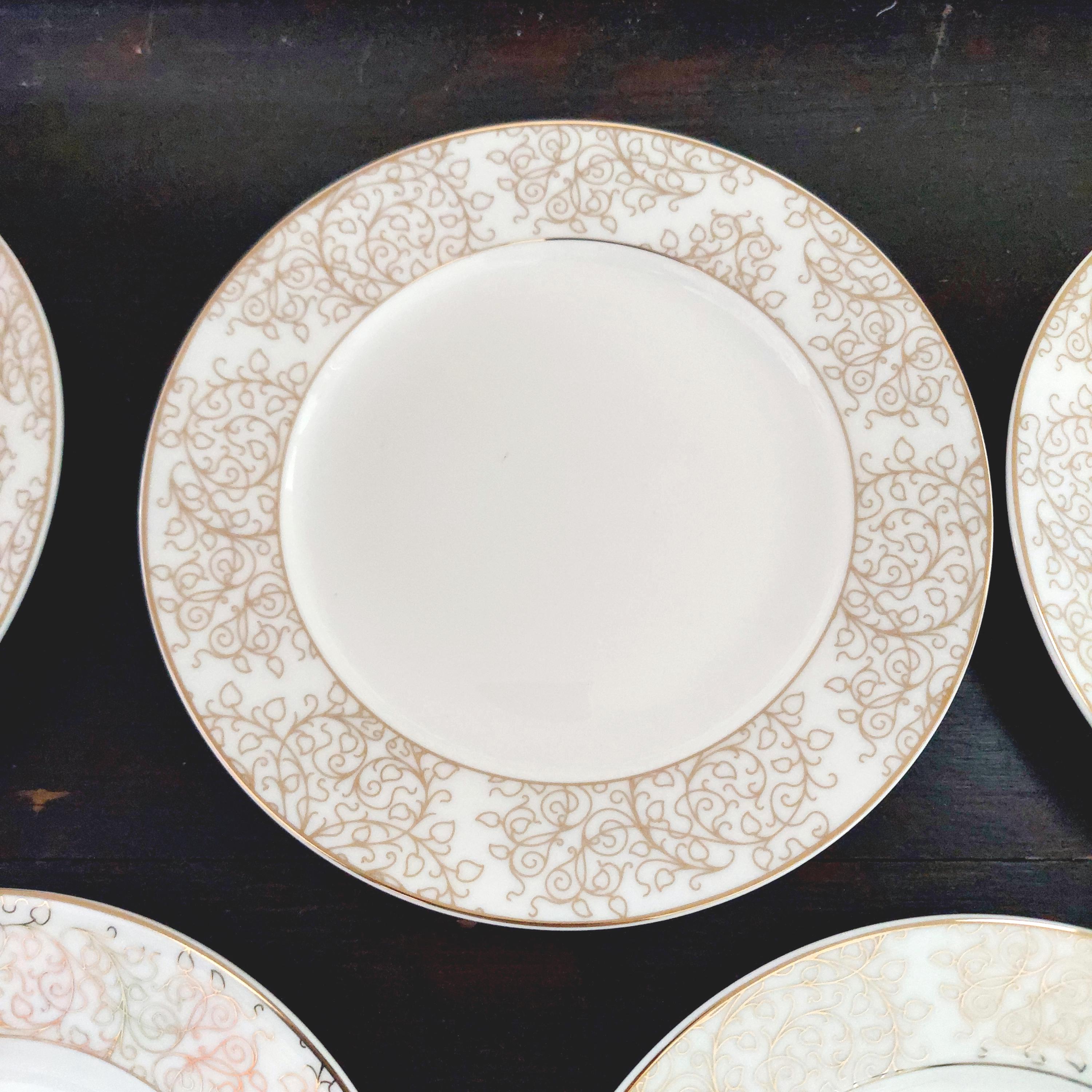 Vintage bone china side plate set featuring golden Florentine leaf vine design on rim with gold trimmed edge.
