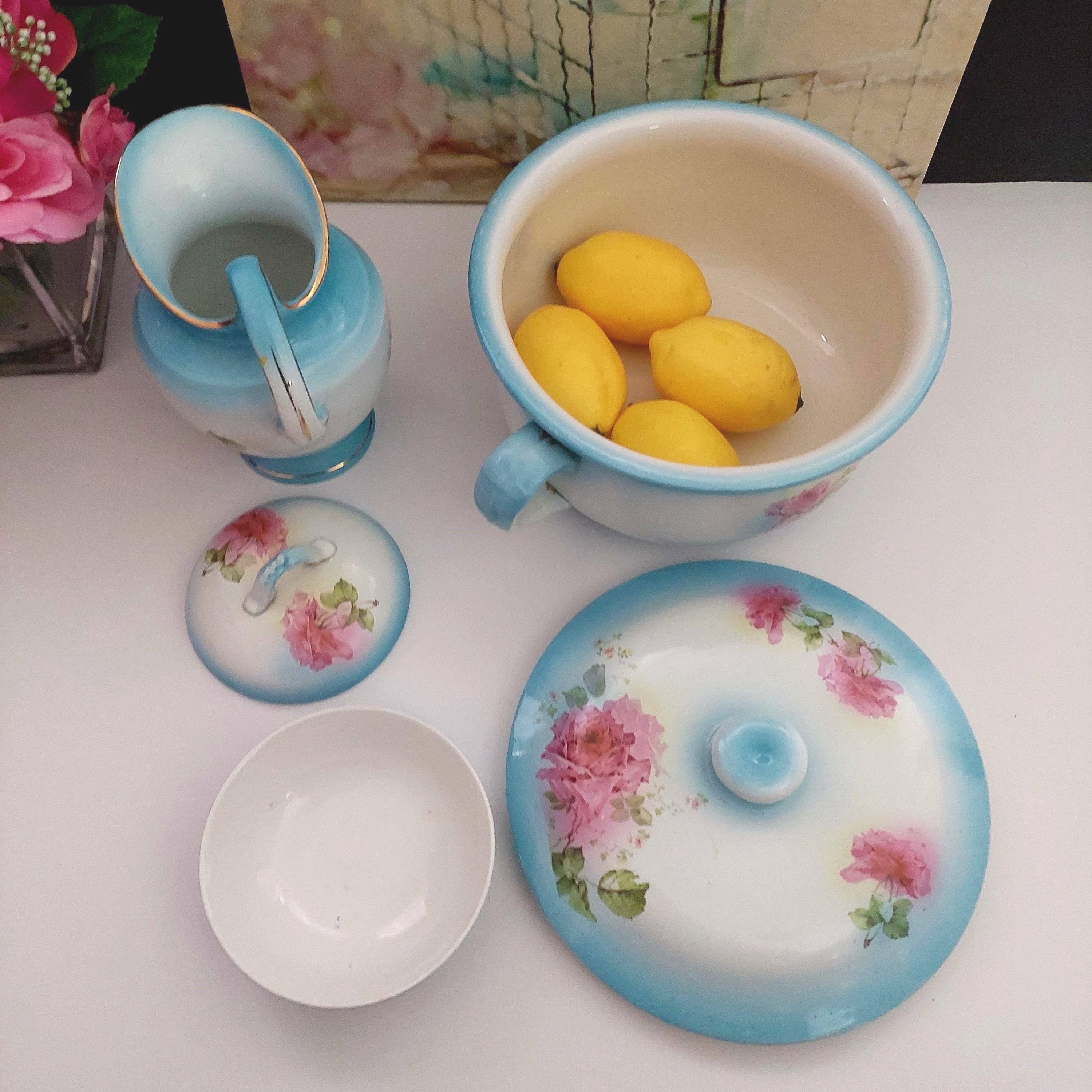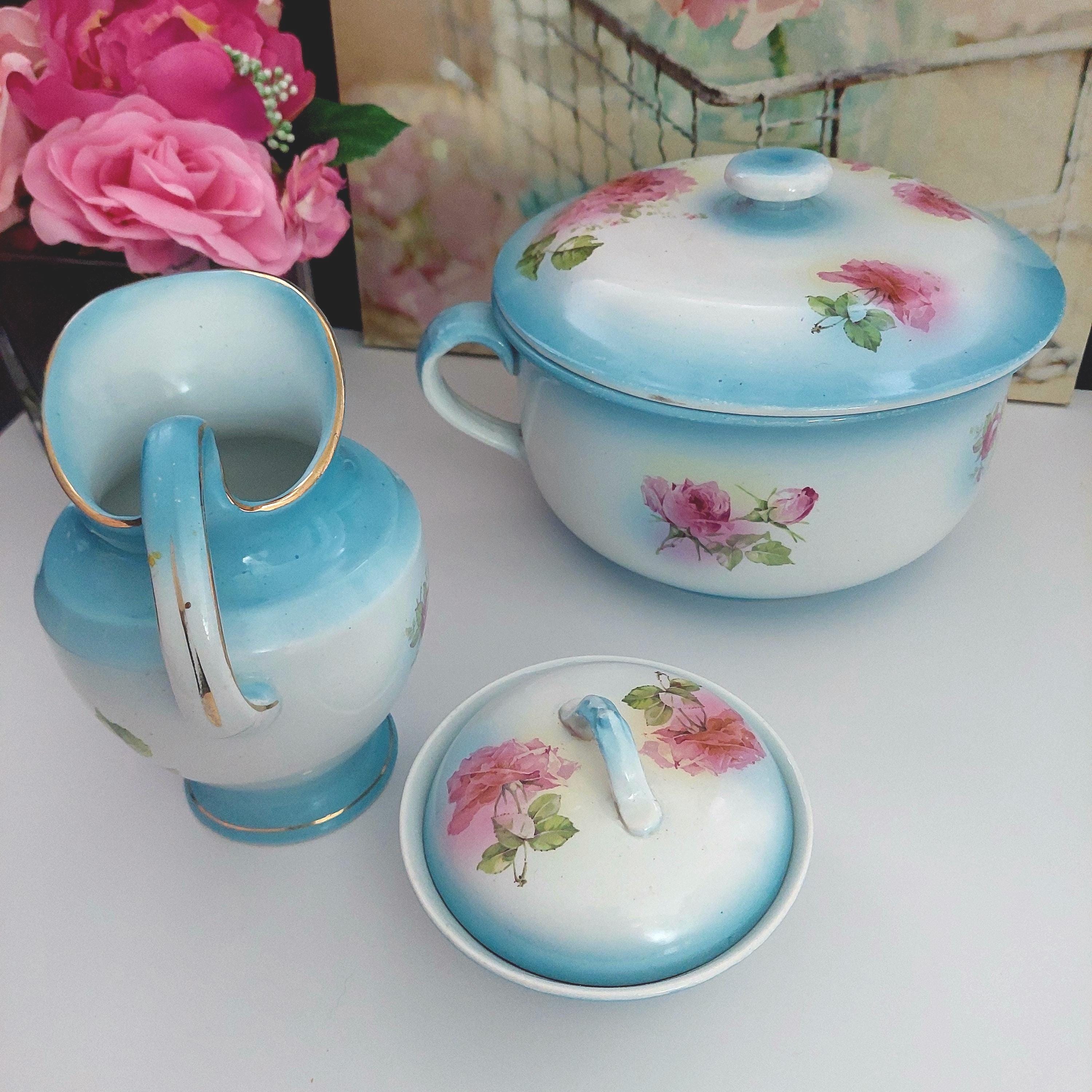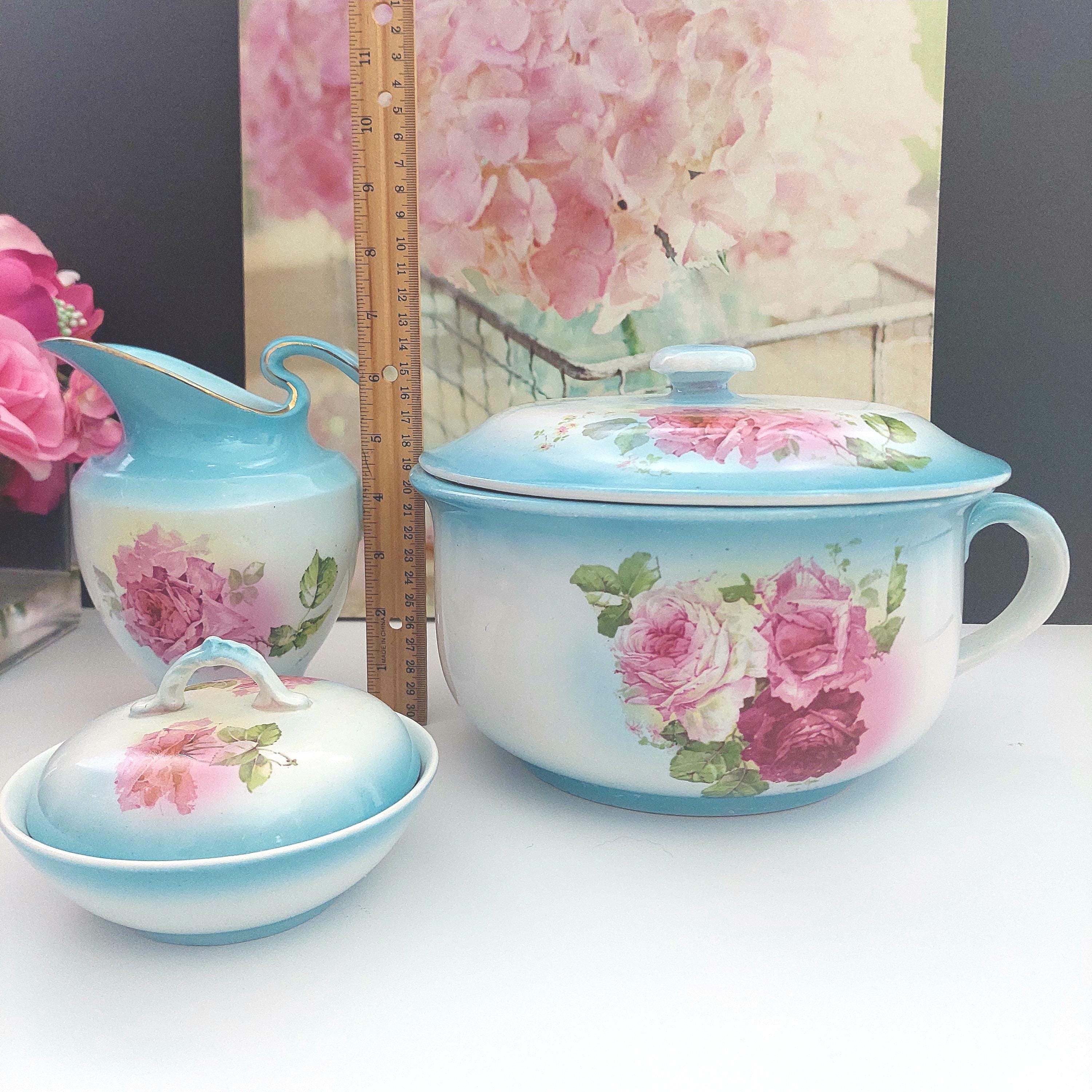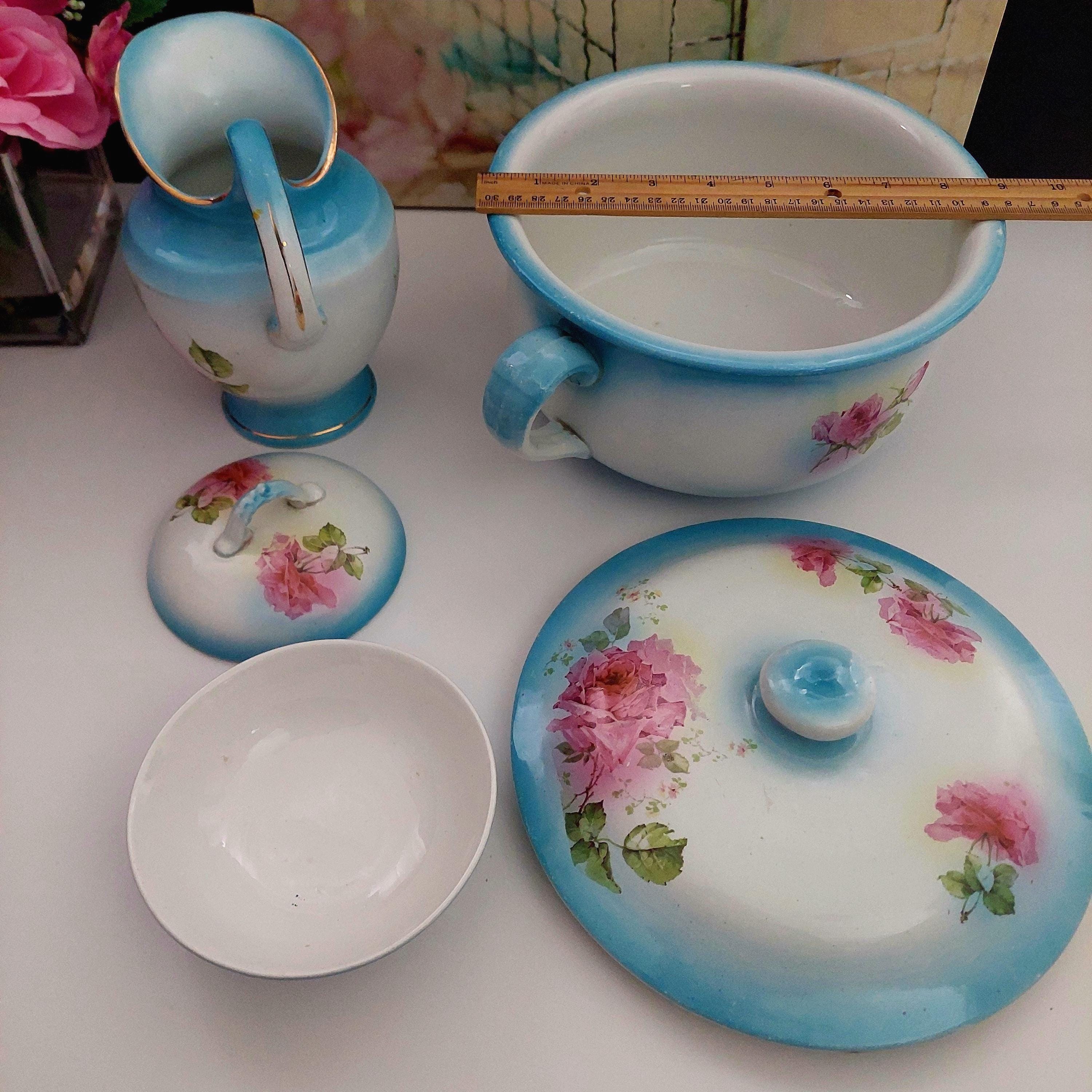 Vintage Condition: NO cracks. Wear and small surface scratches consistent with antique age. Small chip on bottom rim of chamber pot. Yellowish debris on handle of pitcher.