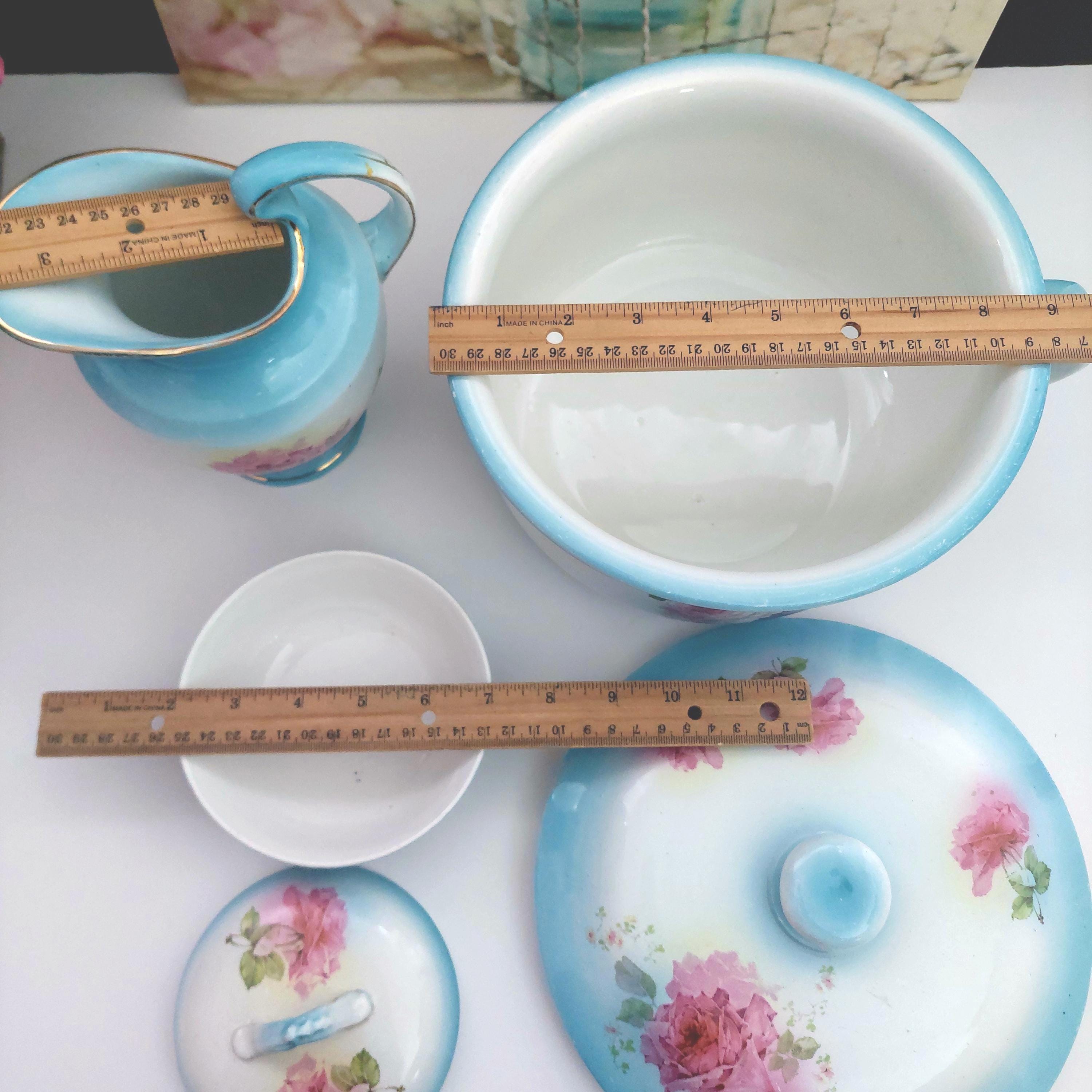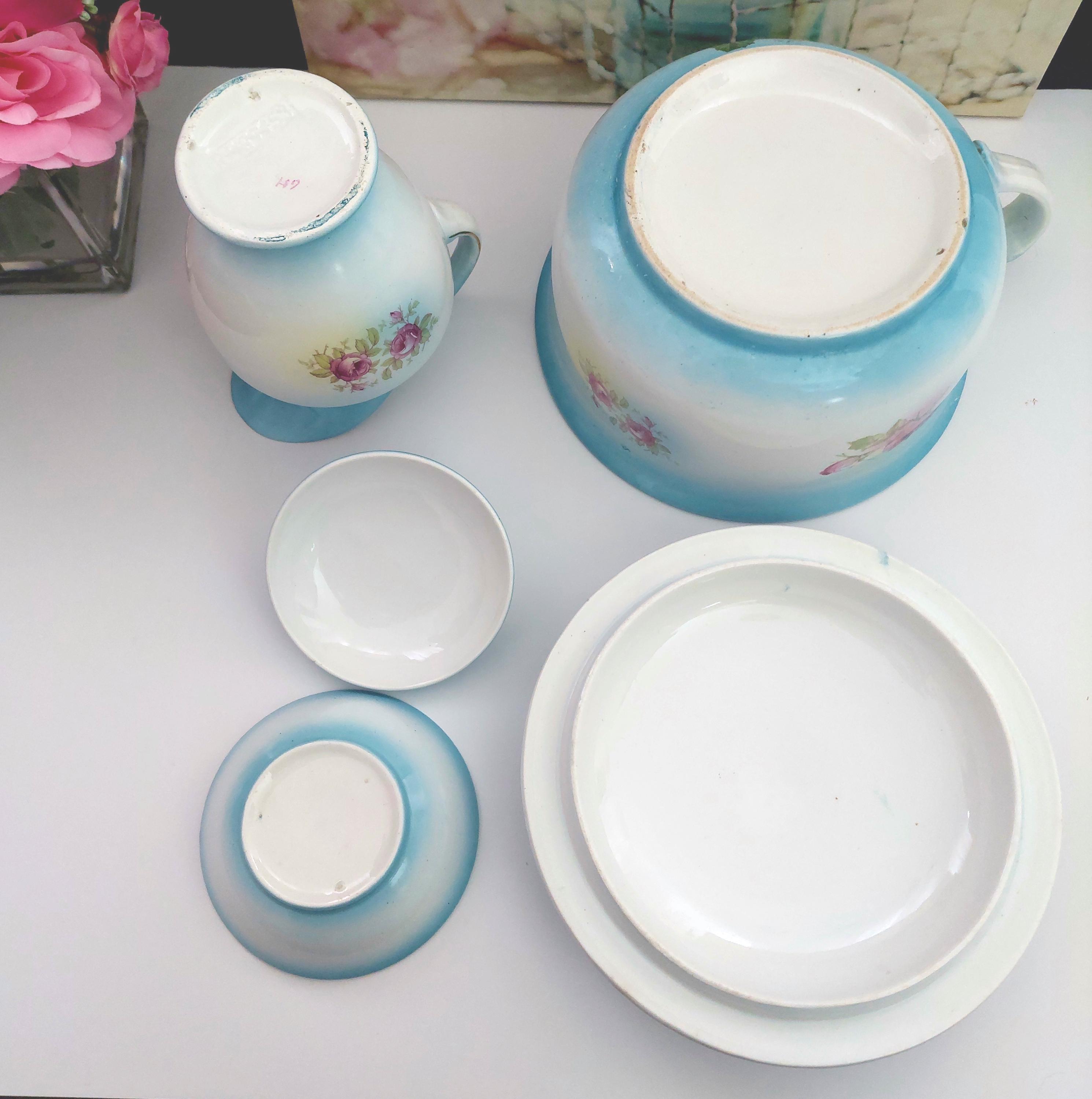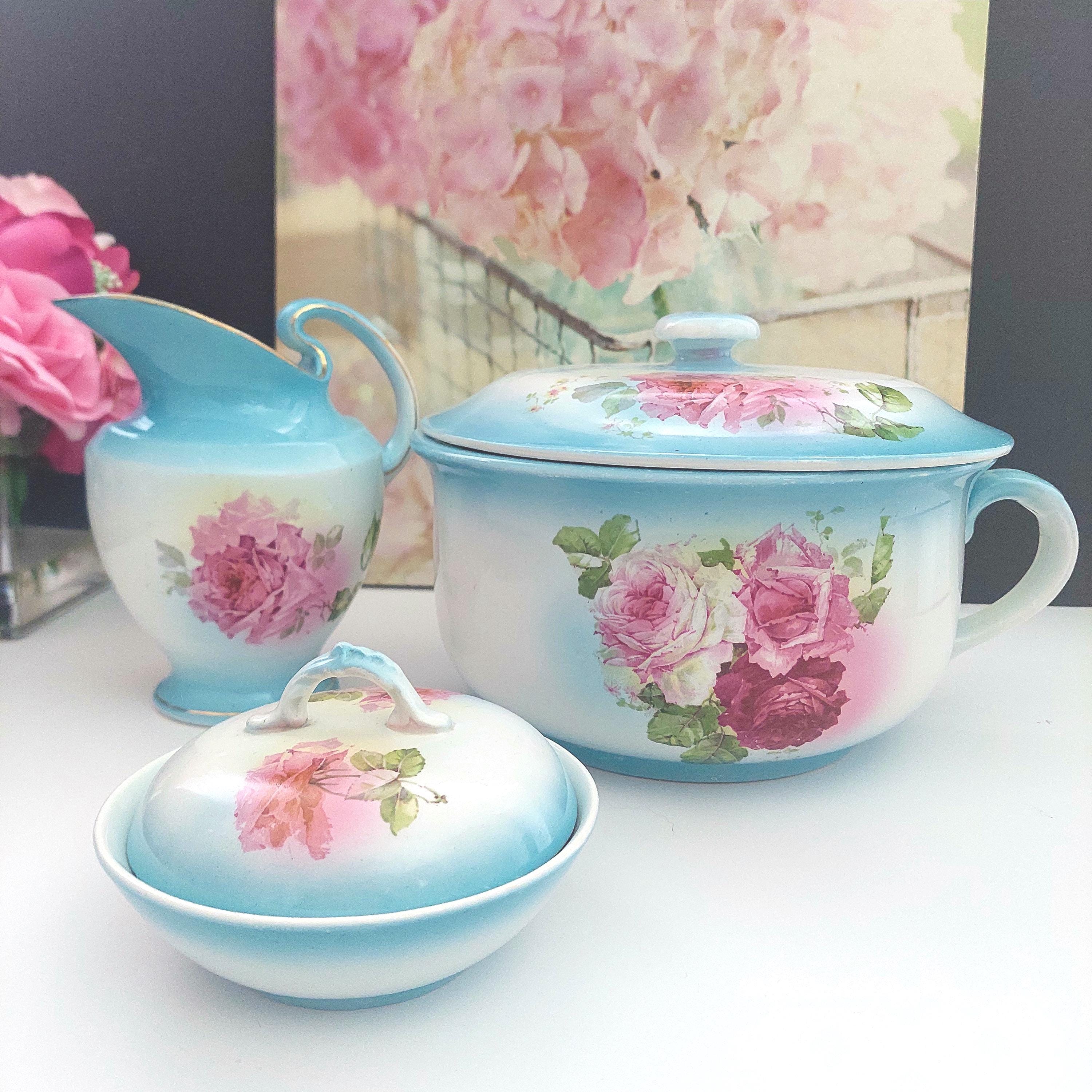 Vintage Condition: NO cracks. Wear and small surface scratches consistent with antique age. Small chip on bottom rim of chamber pot. Yellowish debris on handle of pitcher.