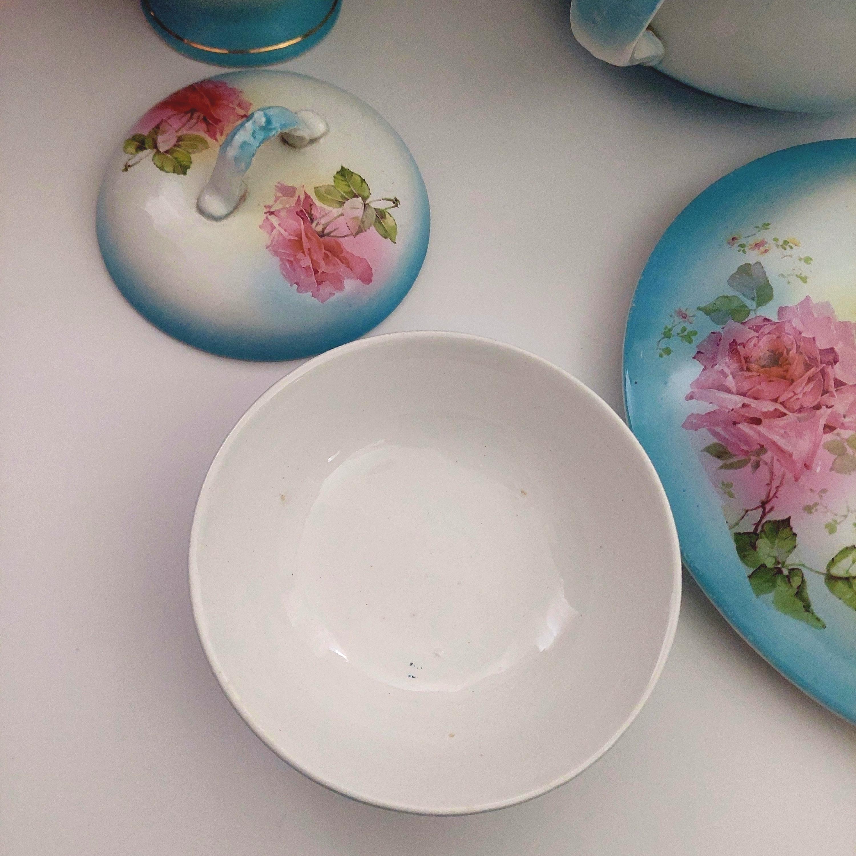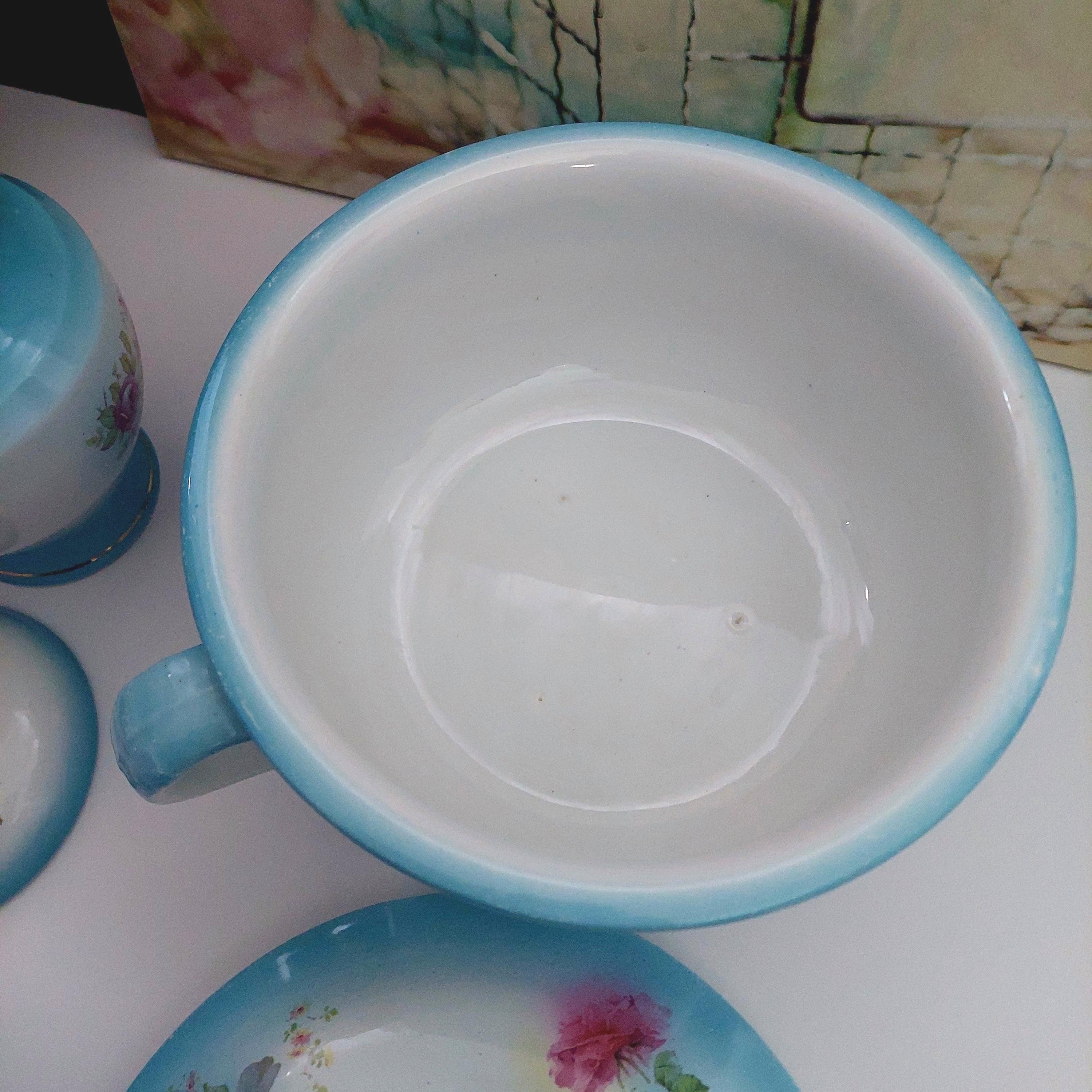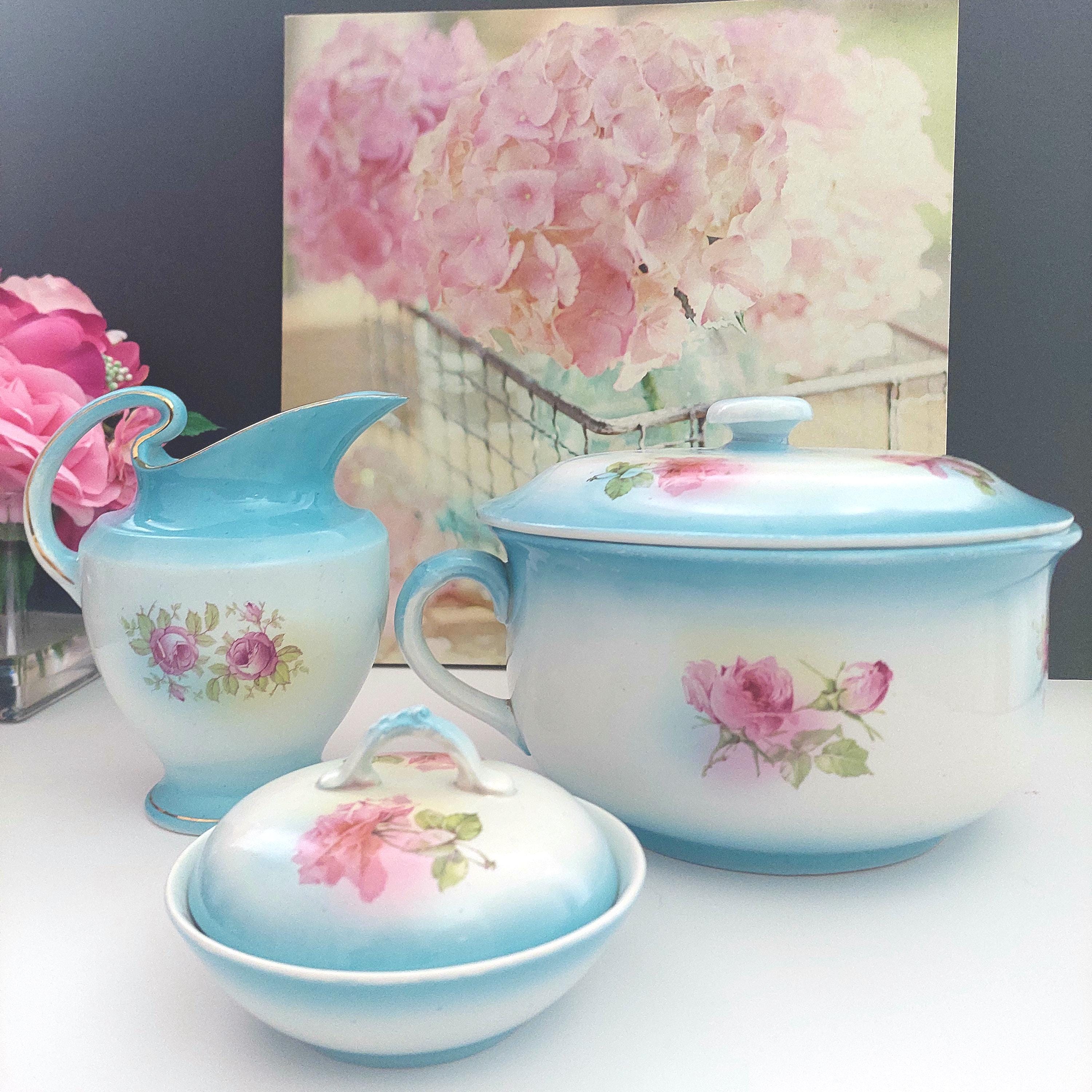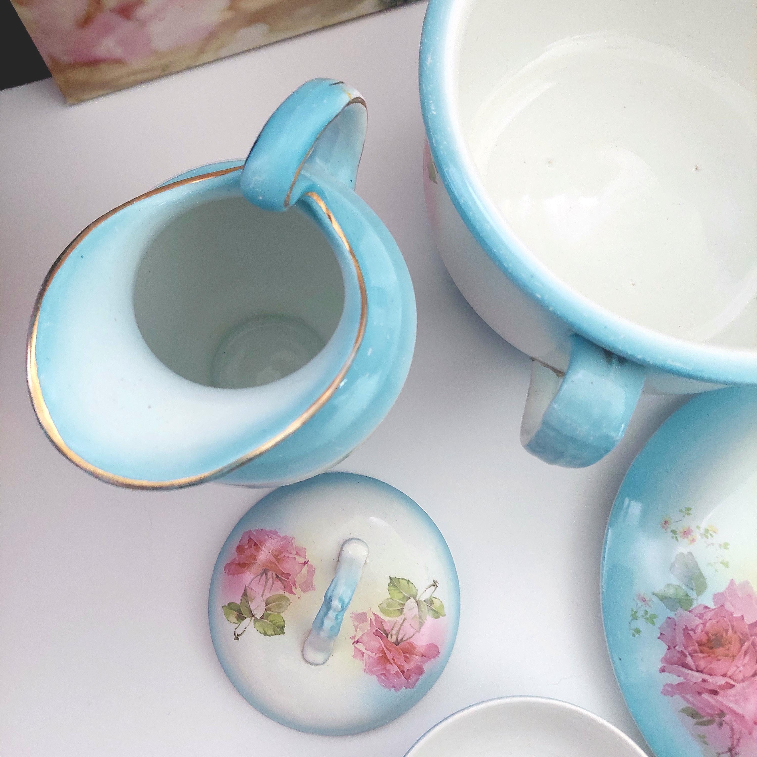 Vintage Condition: NO cracks. Wear and small surface scratches consistent with antique age. Small chip on bottom rim of chamber pot. Yellowish debris on handle of pitcher.