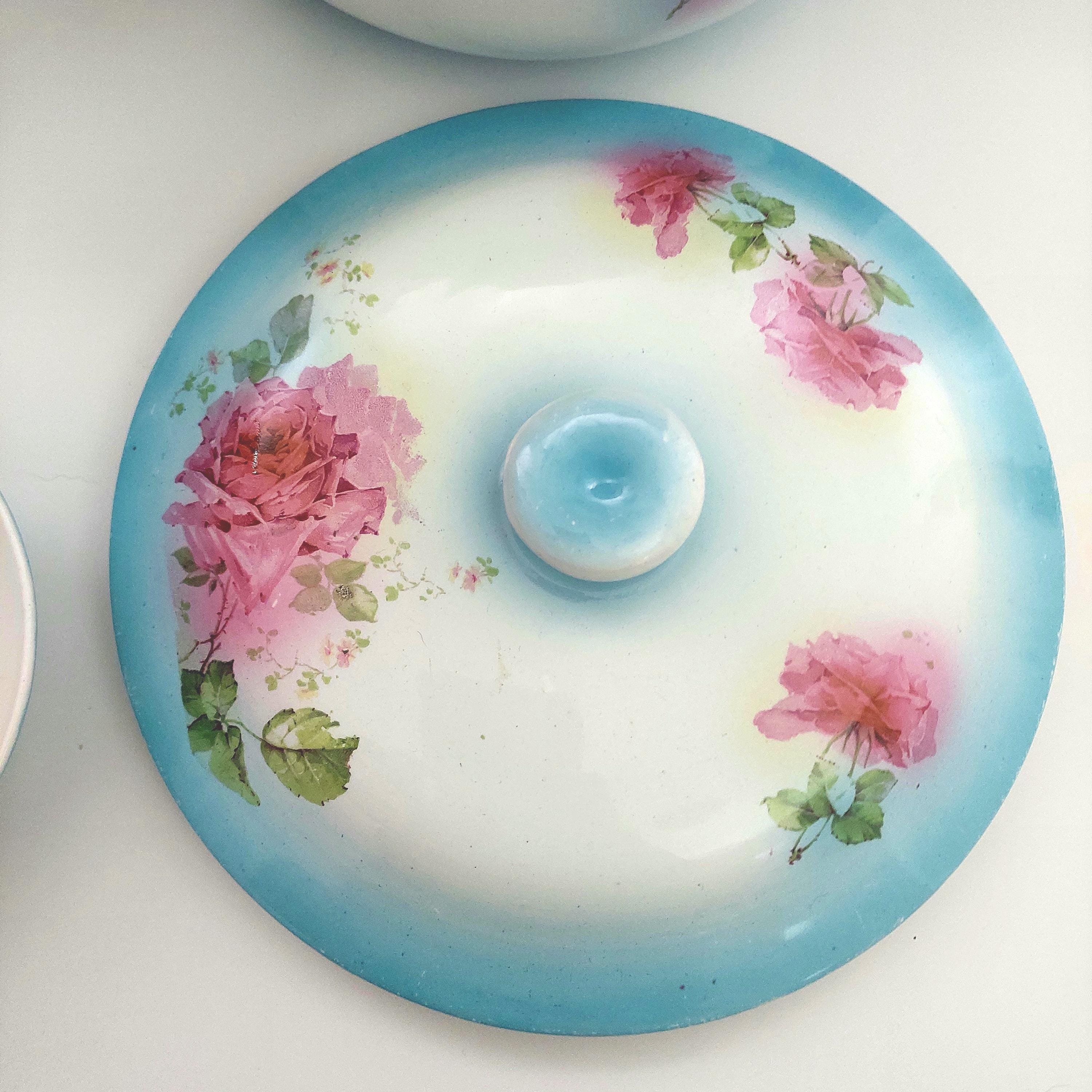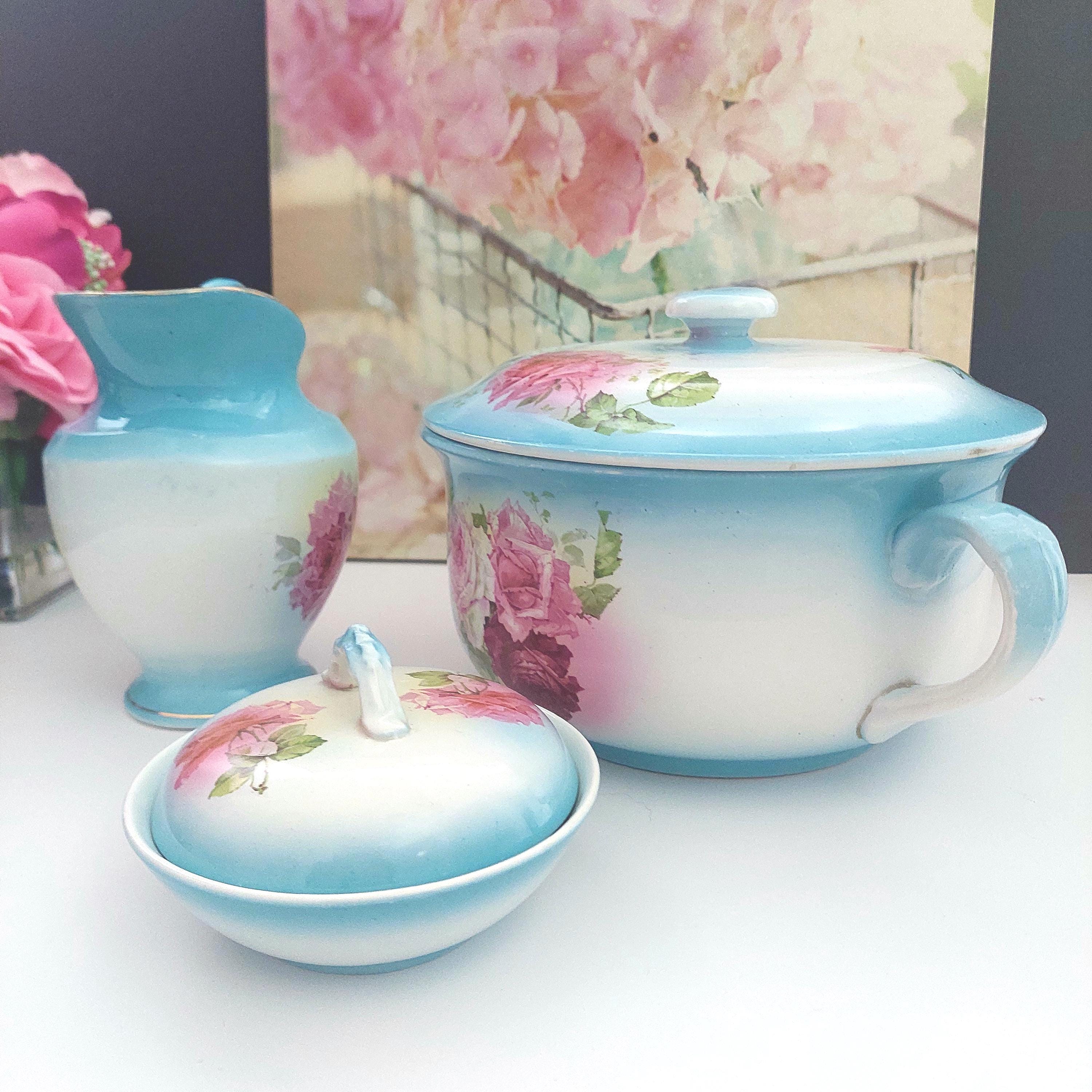 Antique English ceramic chamber pot with lid, water pitcher & covered soap dish wash set.