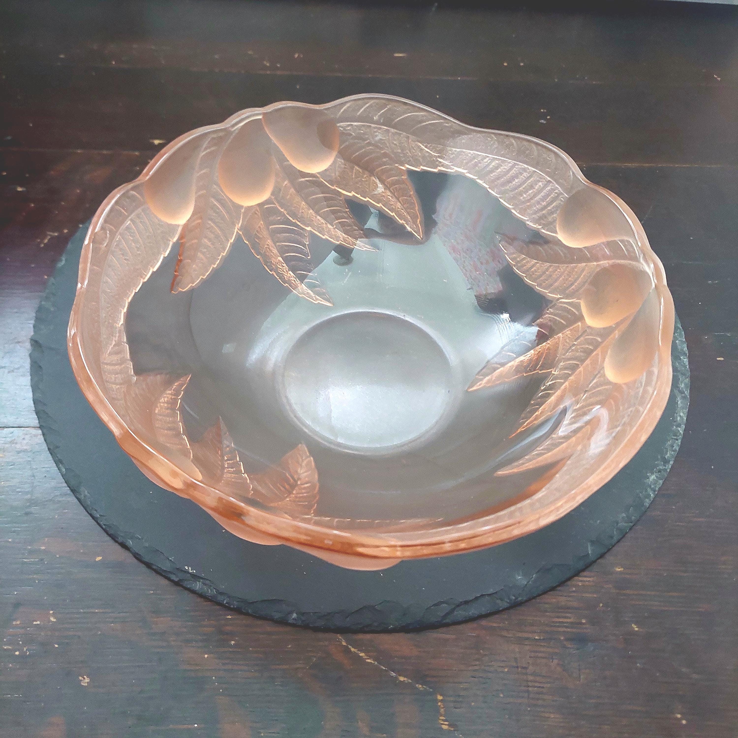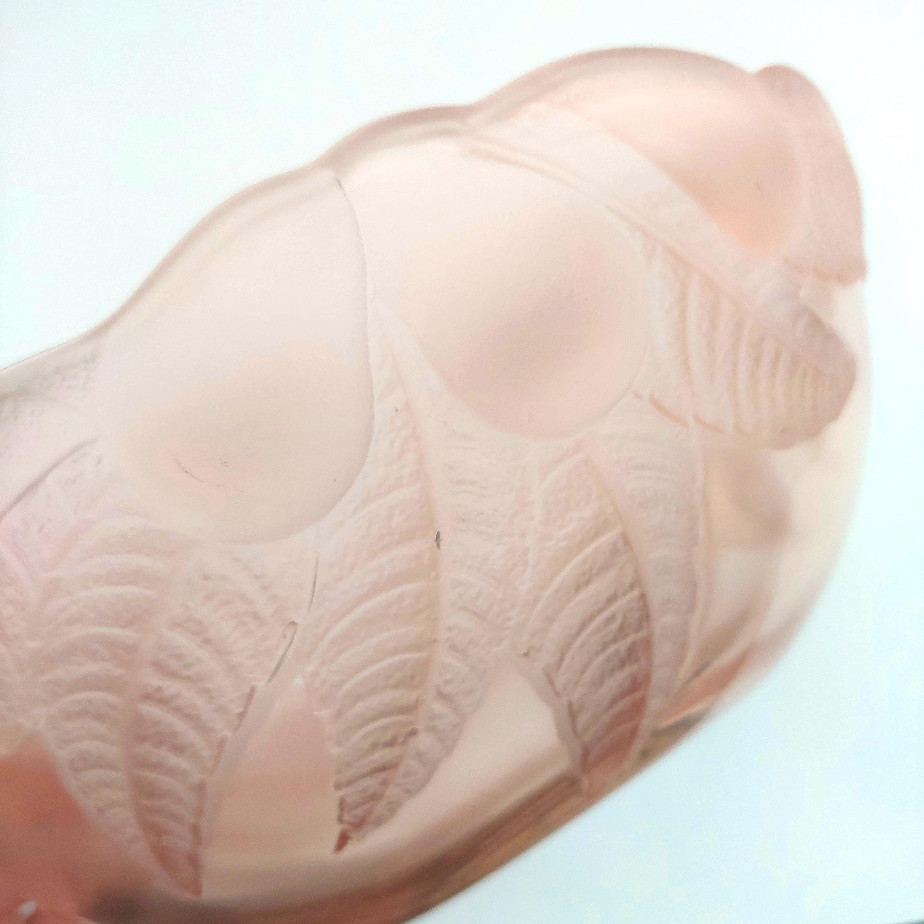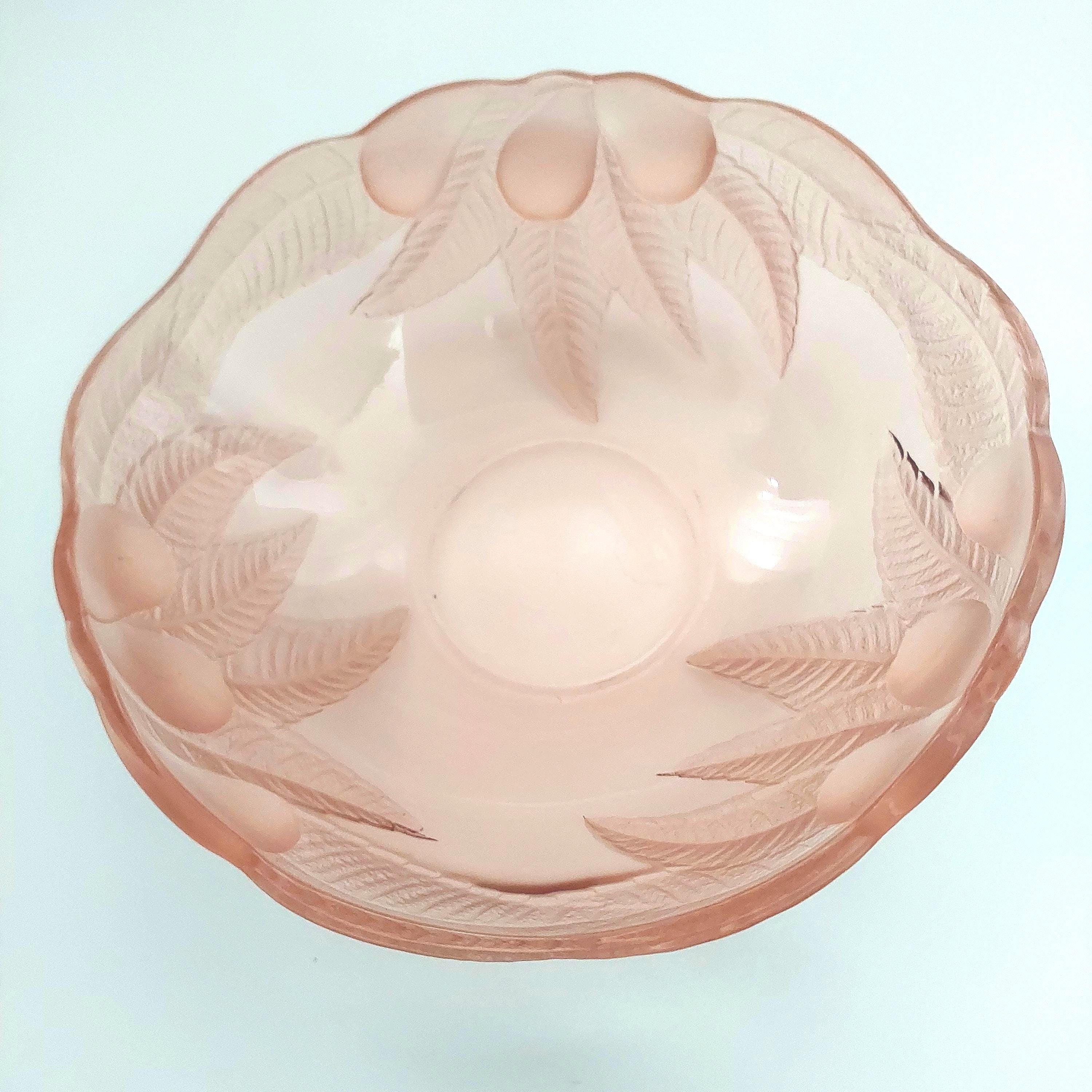 1980s vintage Rosaline pink glass serving bowl. Pattern features frosted & clear pink glass of raised leaves and fruit on the outside. Smooth glass inside bowl