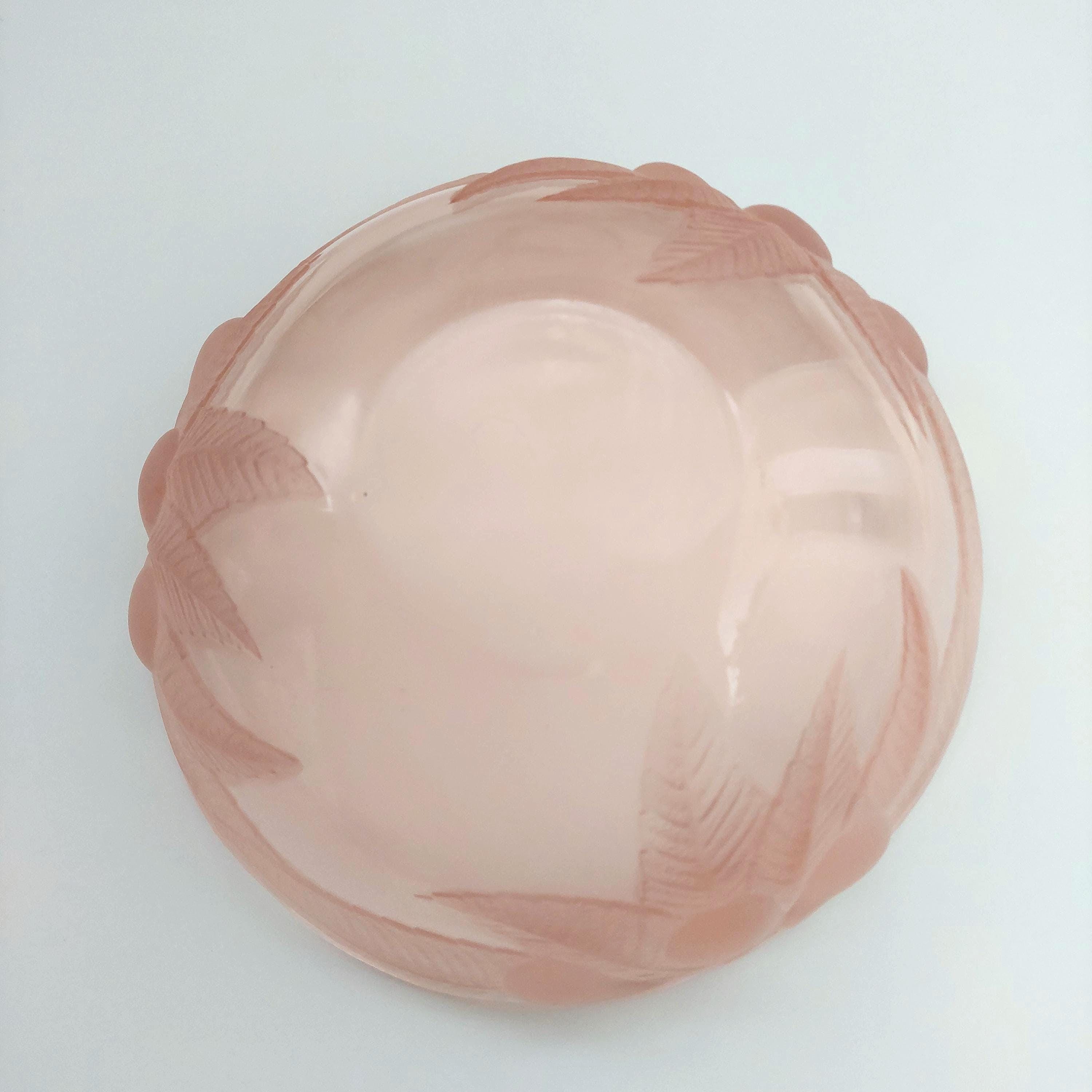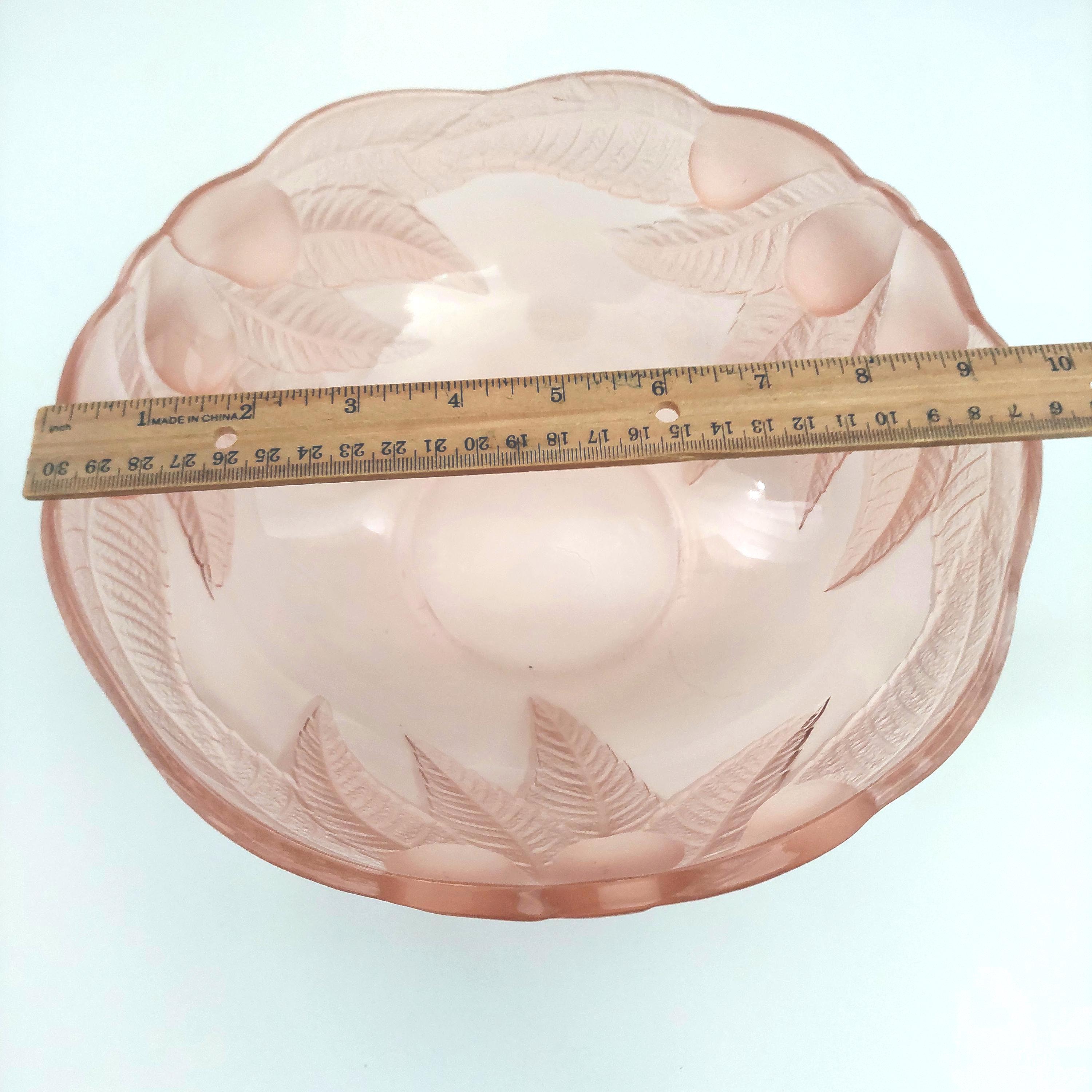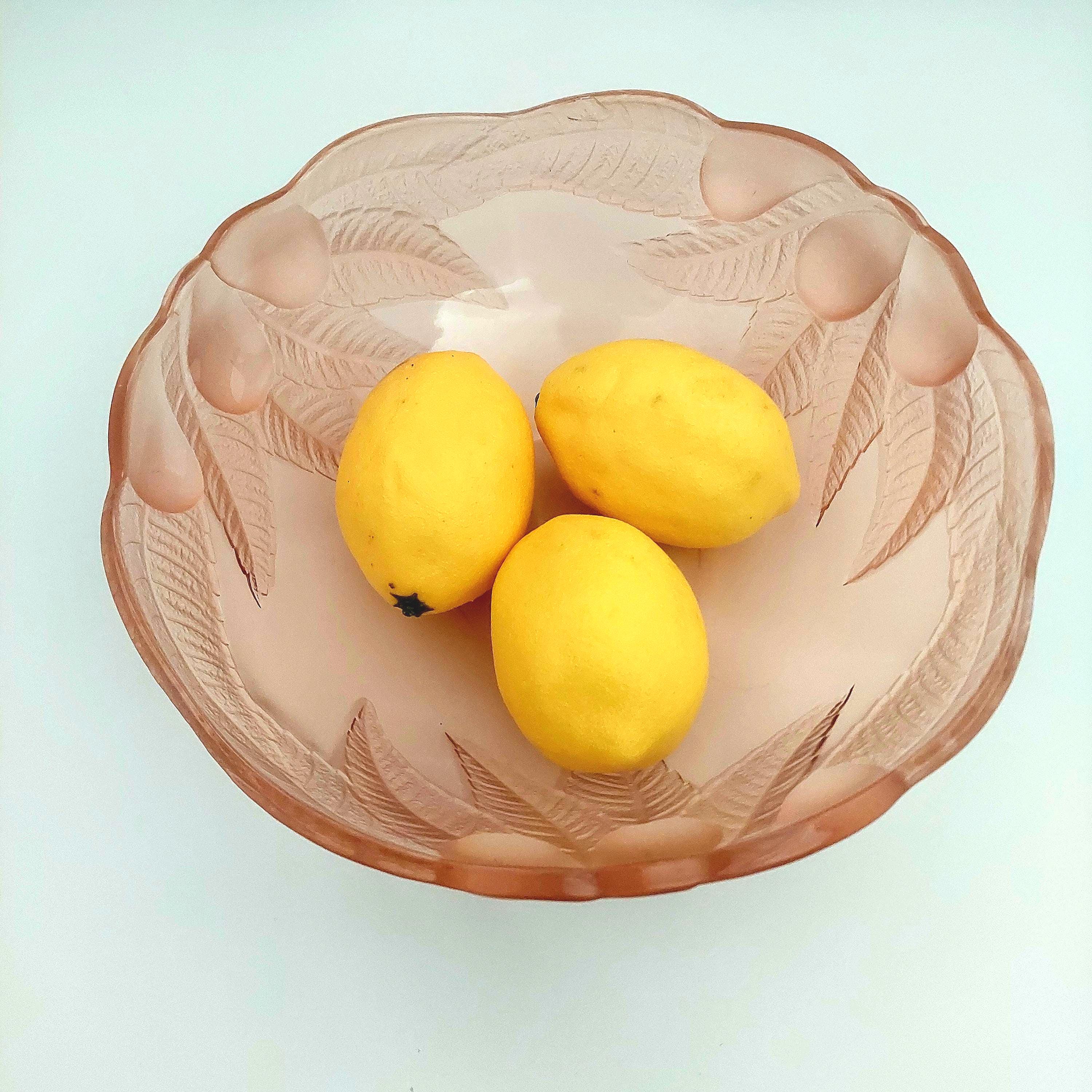 1980s vintage Rosaline pink glass serving bowl. Pattern features frosted & clear pink glass of raised leaves and fruit on the outside. Smooth glass inside bowl