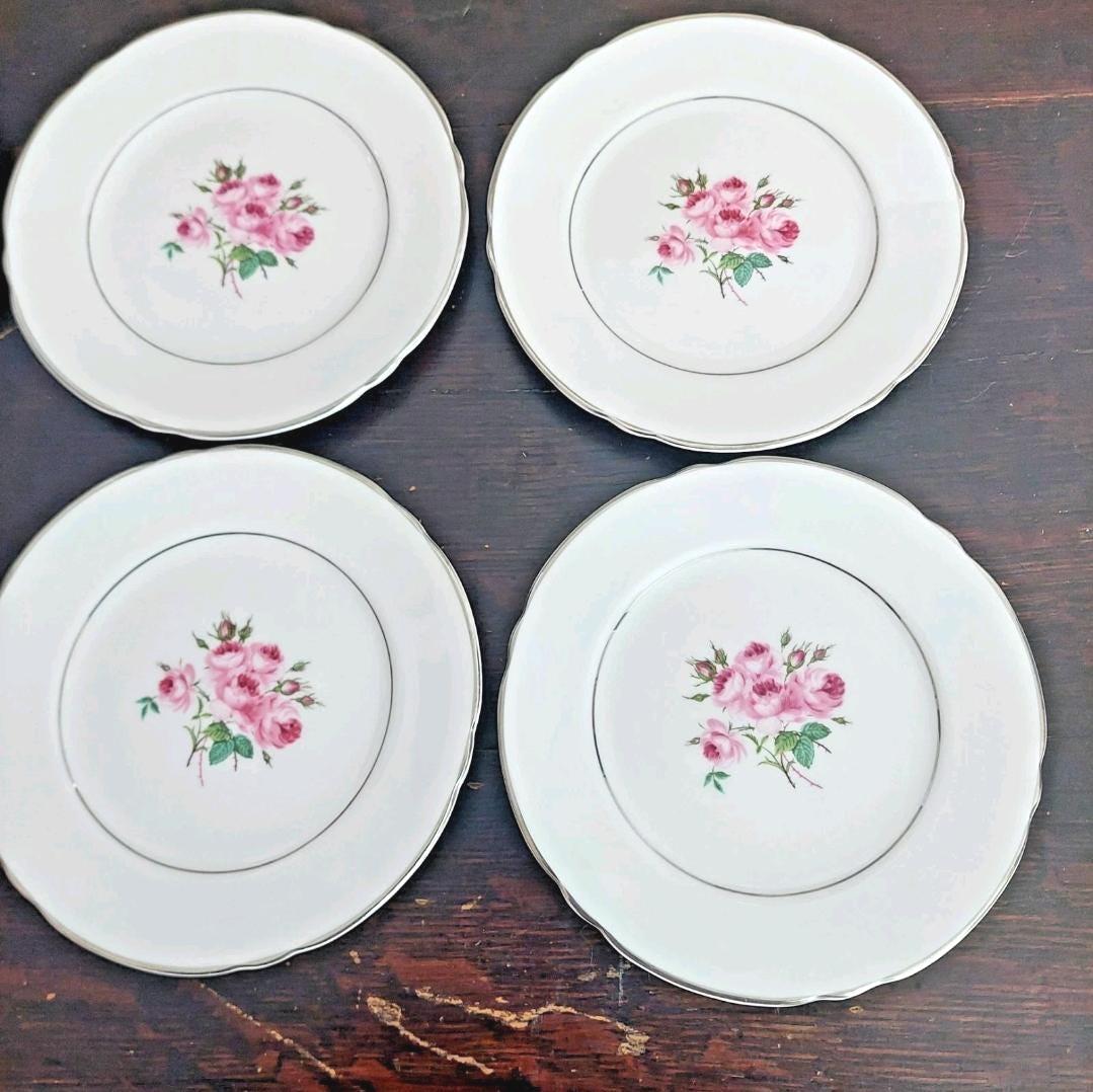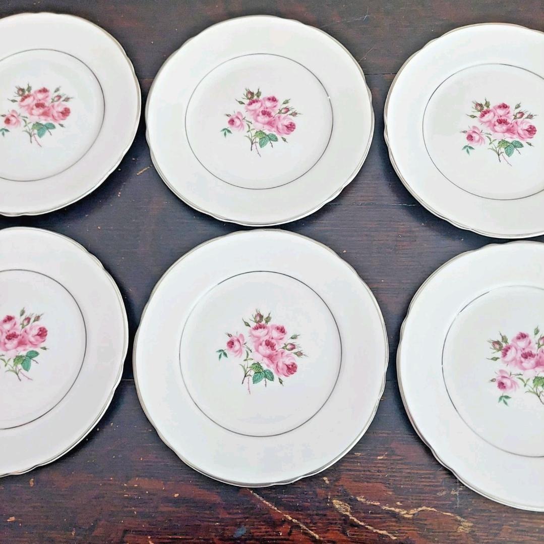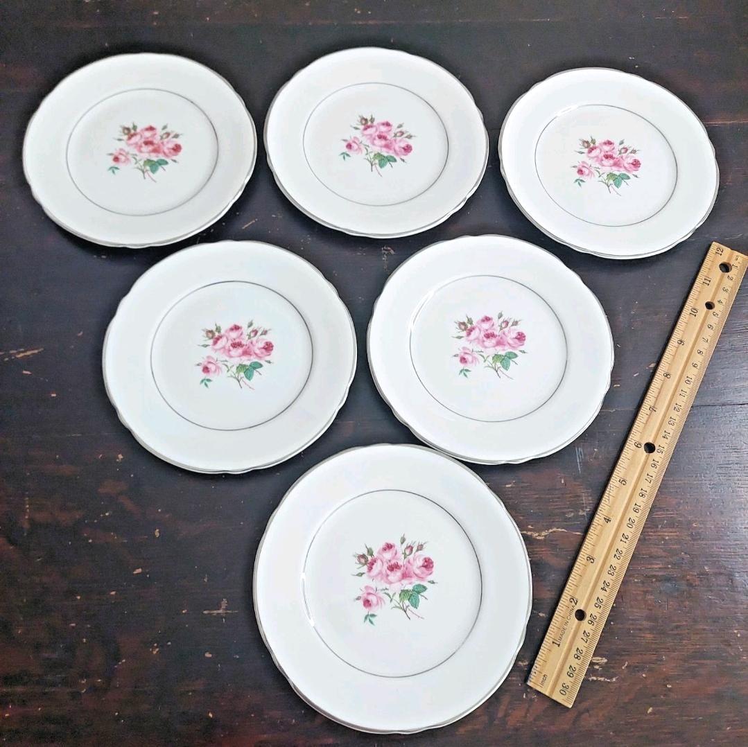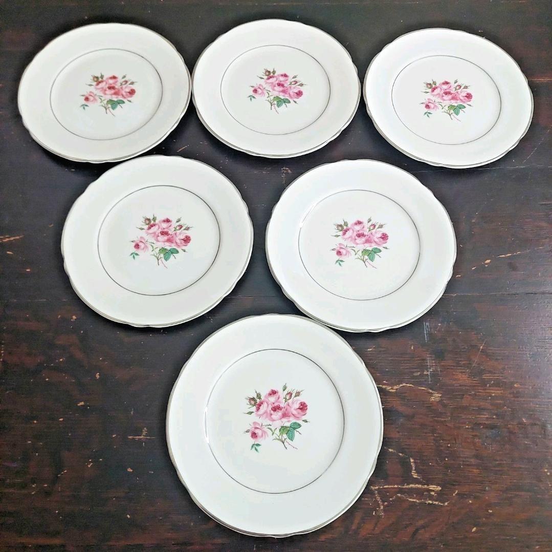 Plates feature pretty pink rose bouquet on crisp white English bone china with silver / platinum trim.