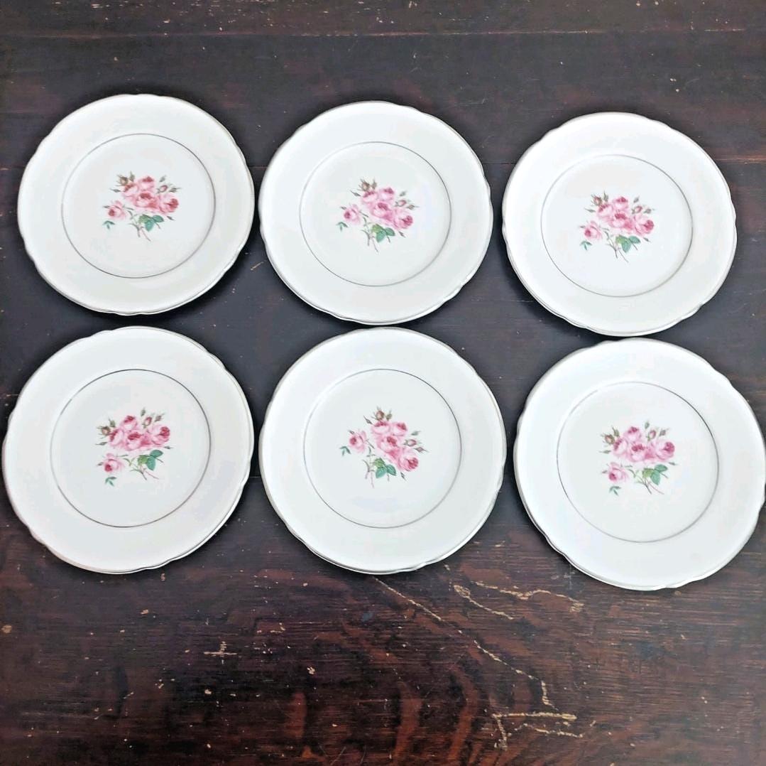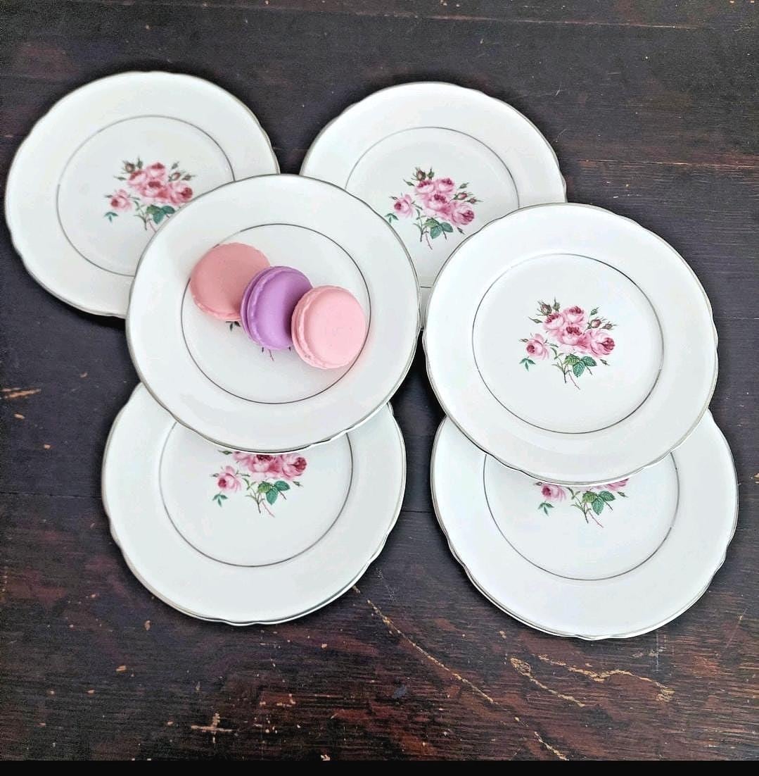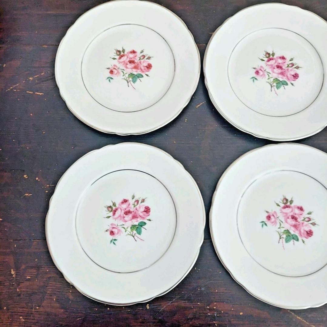 Plates feature pretty pink rose bouquet on crisp white English bone china with silver / platinum trim.