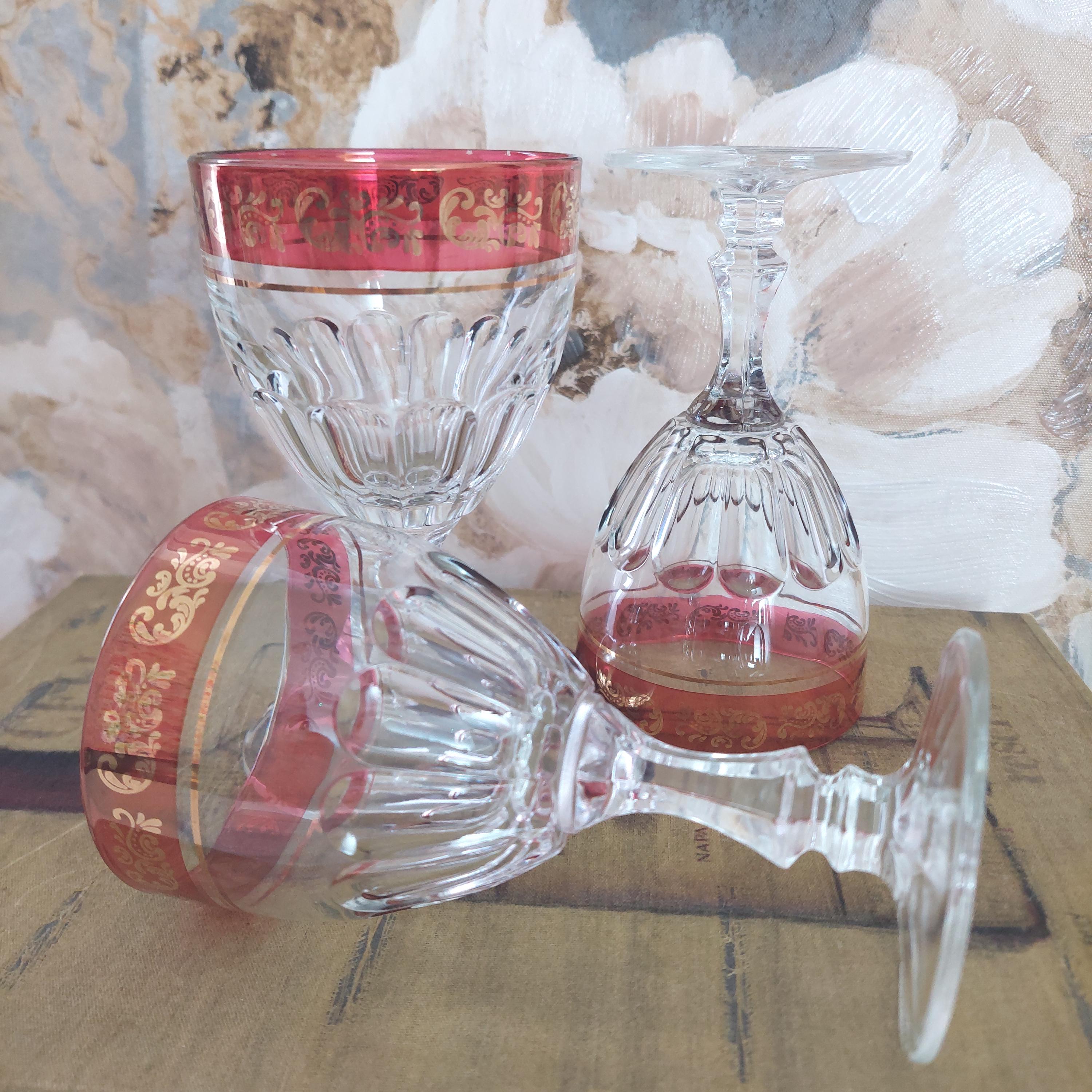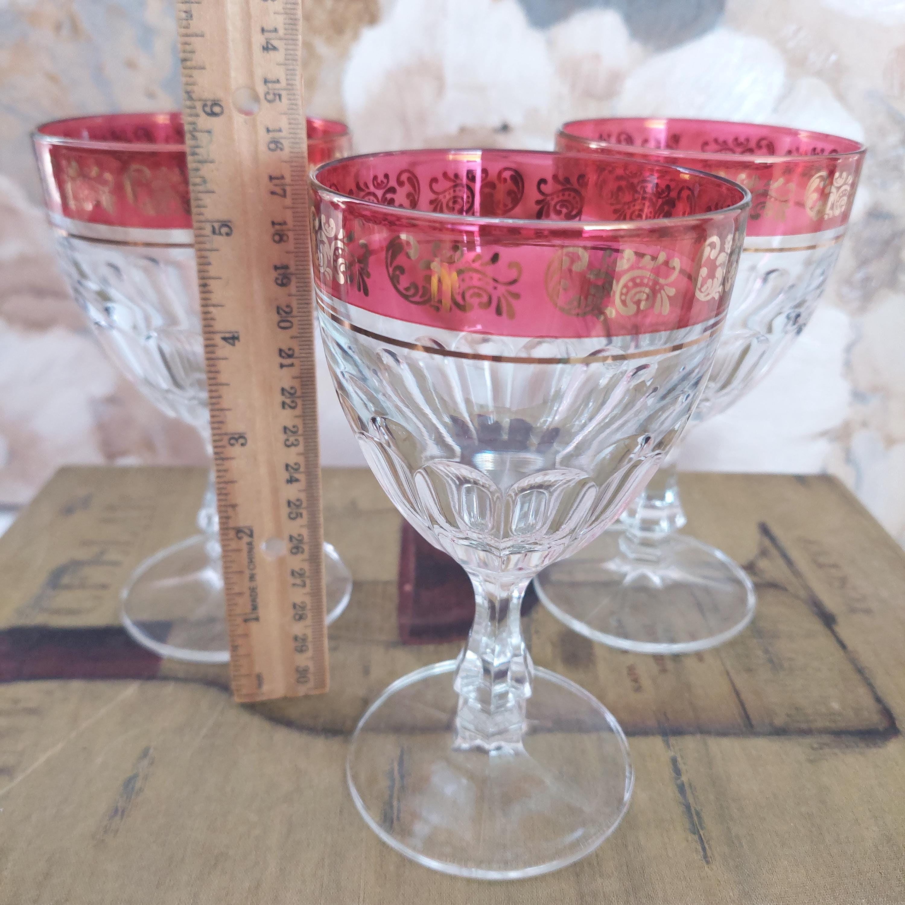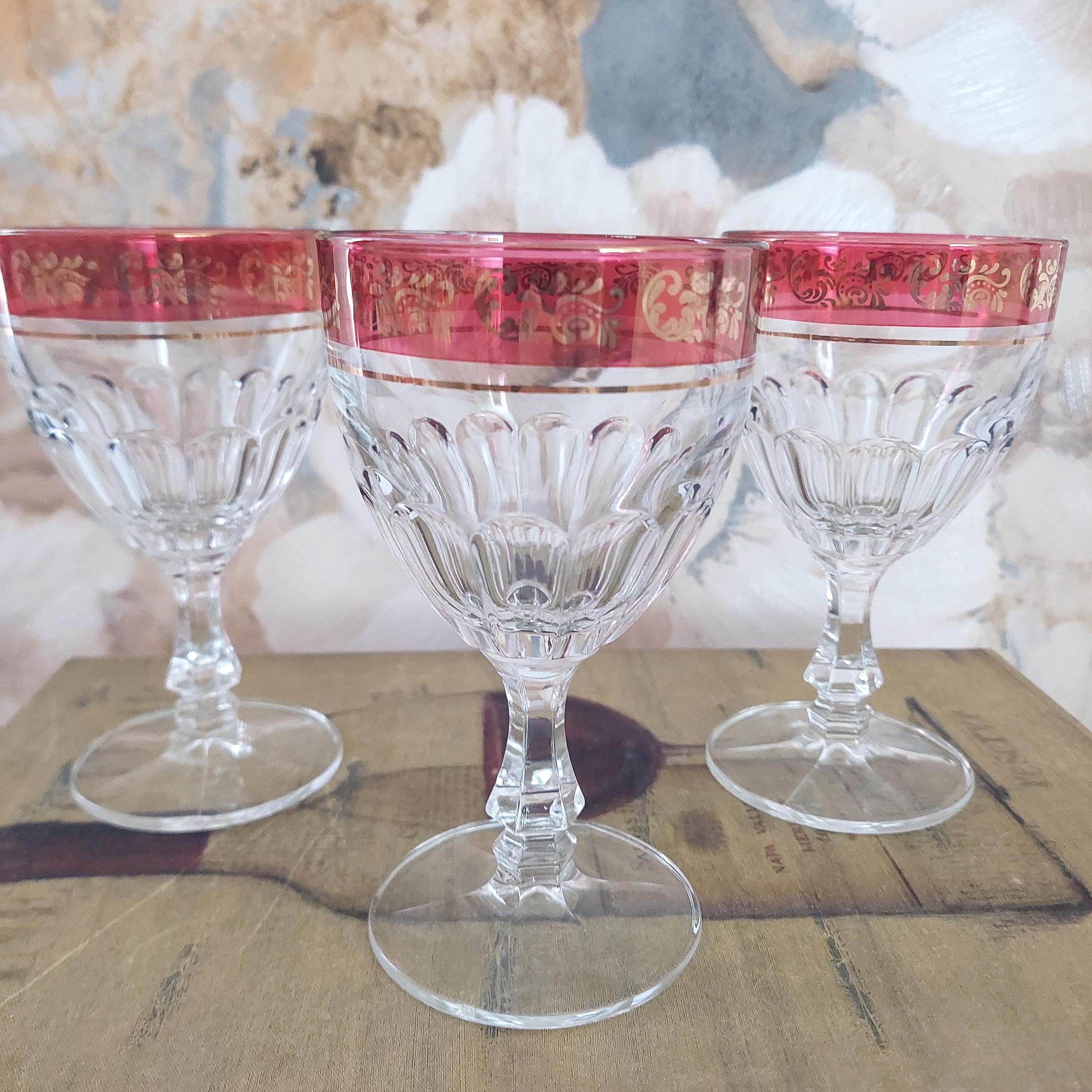 3-piece set of 6 ounce Thumbprint wine glasses featuring red flashing with gold scroll design.
