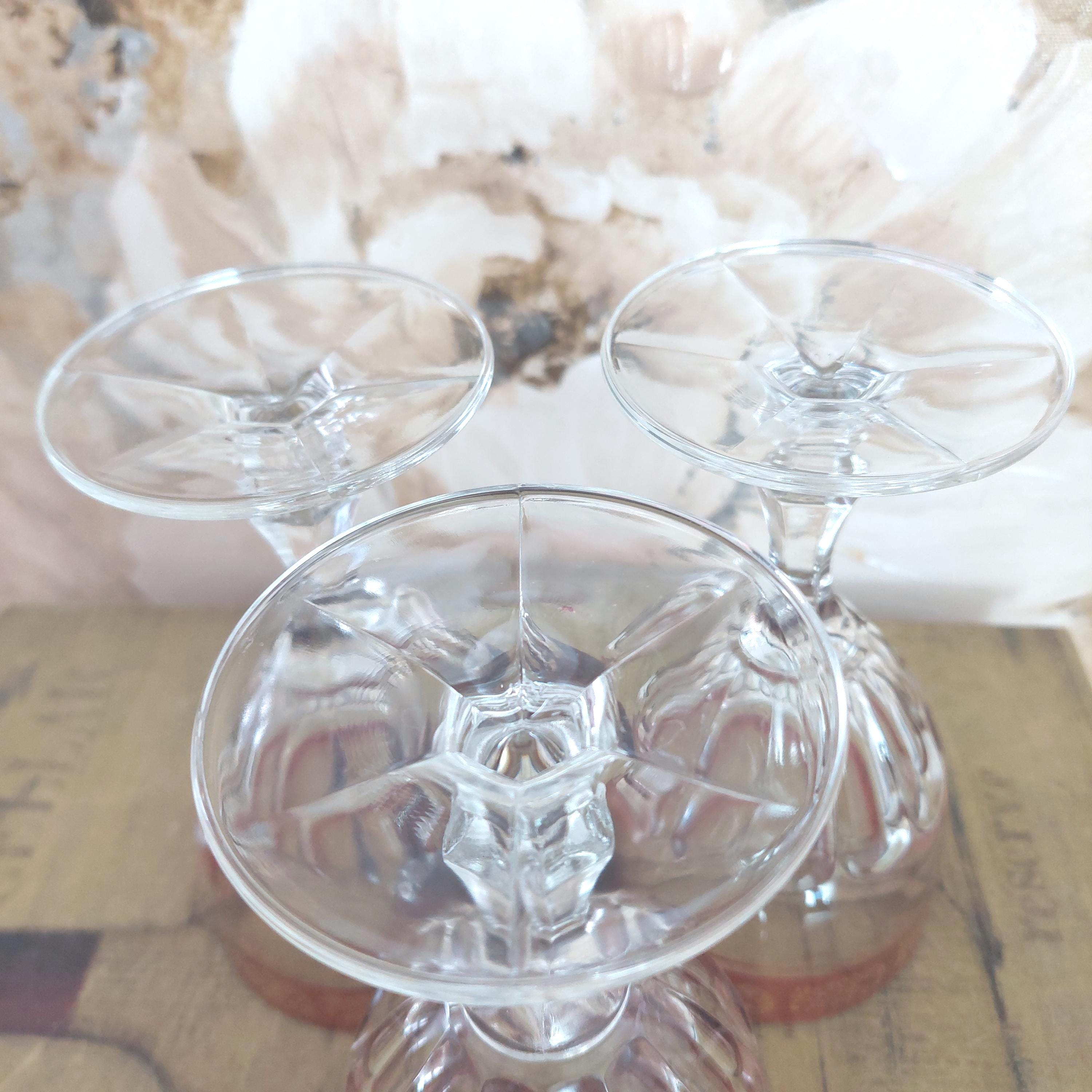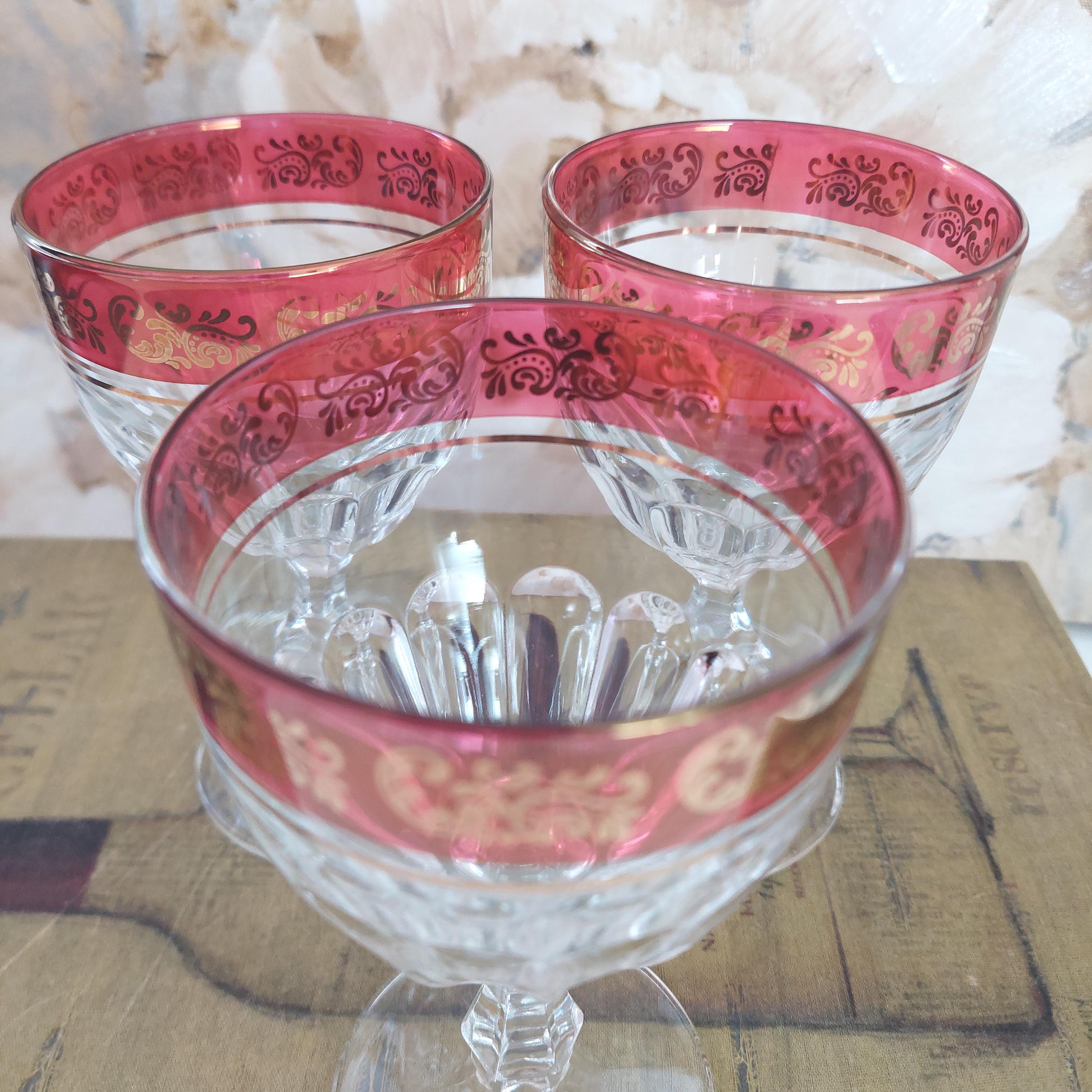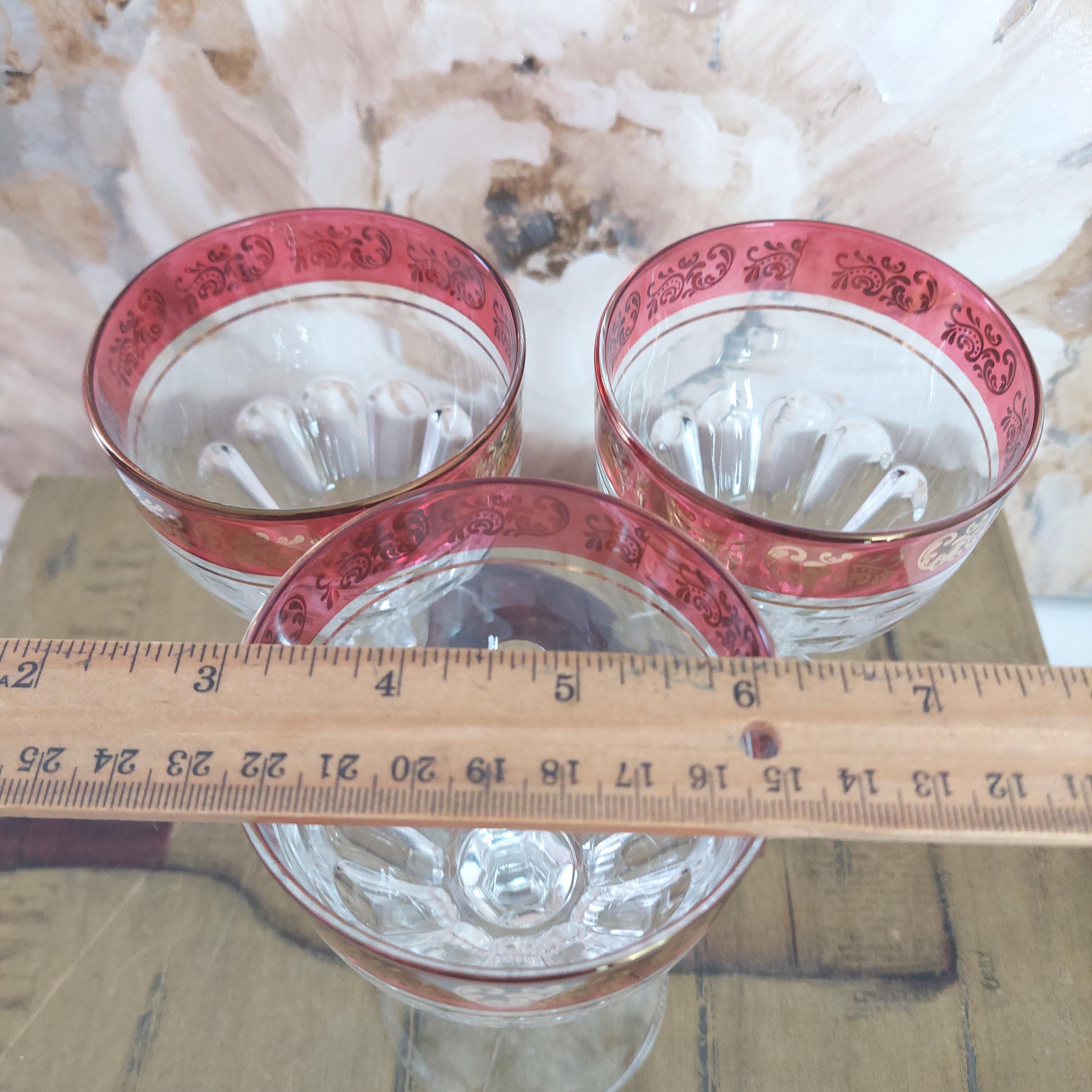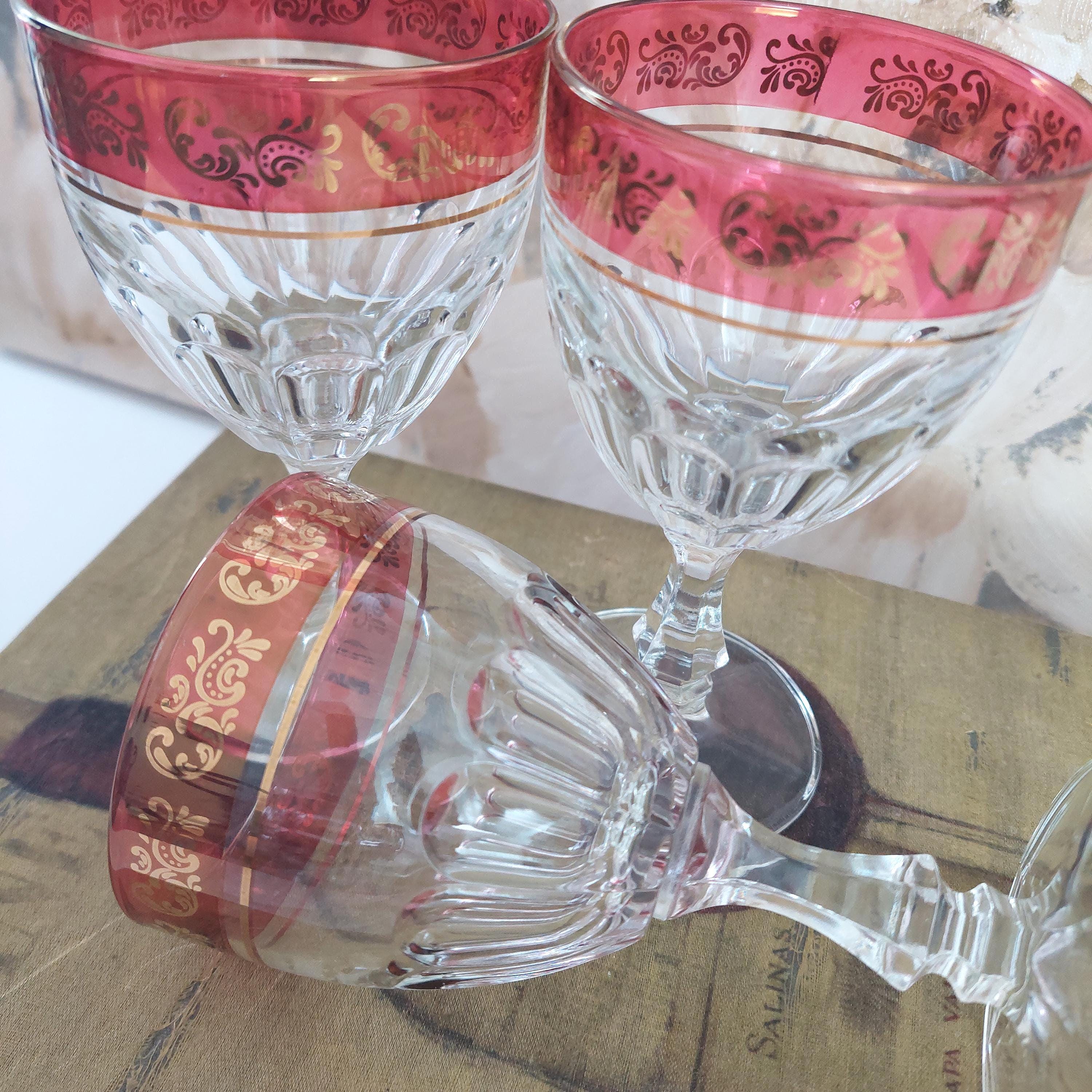 3-piece set of 6 ounce Thumbprint wine glasses featuring red flashing with gold scroll design.