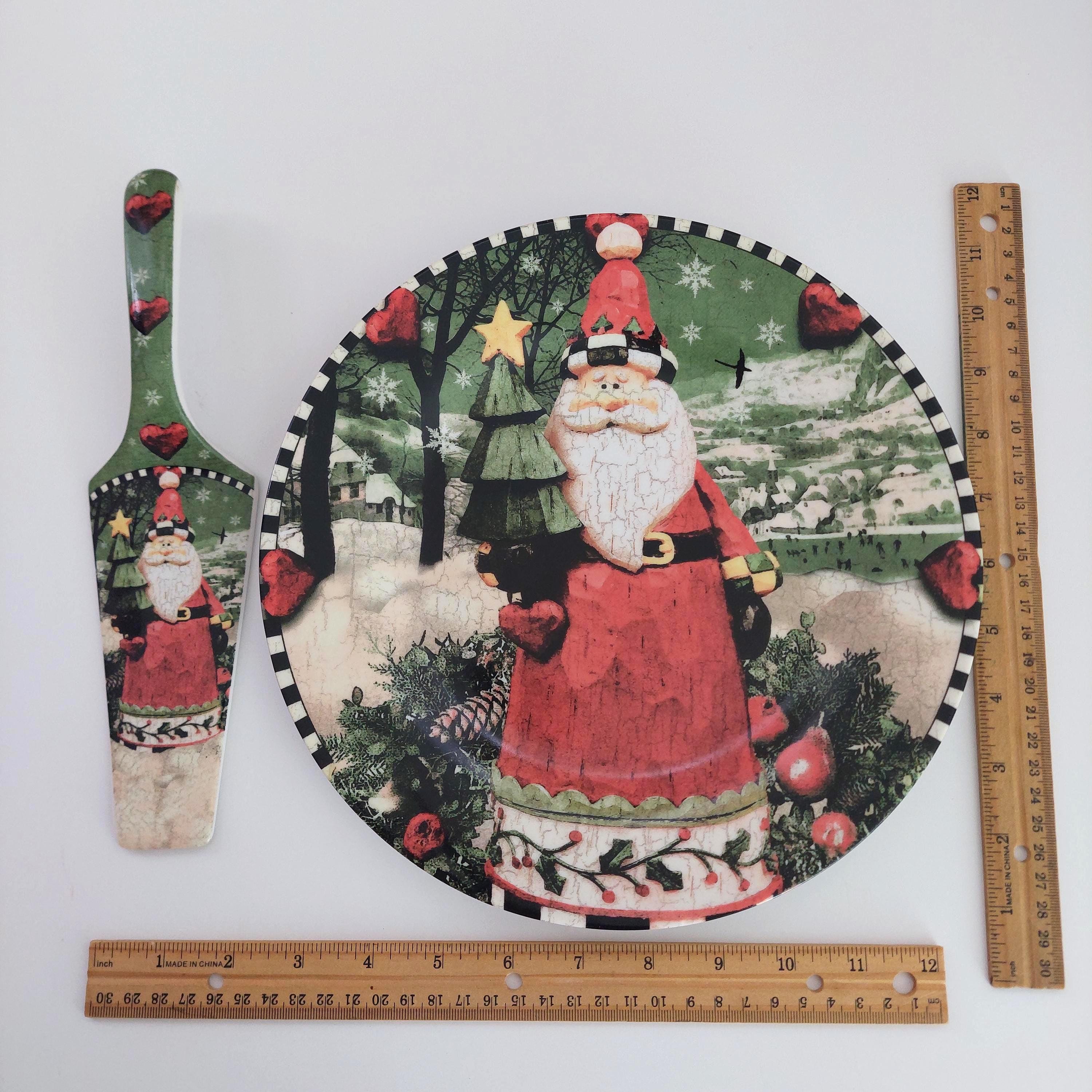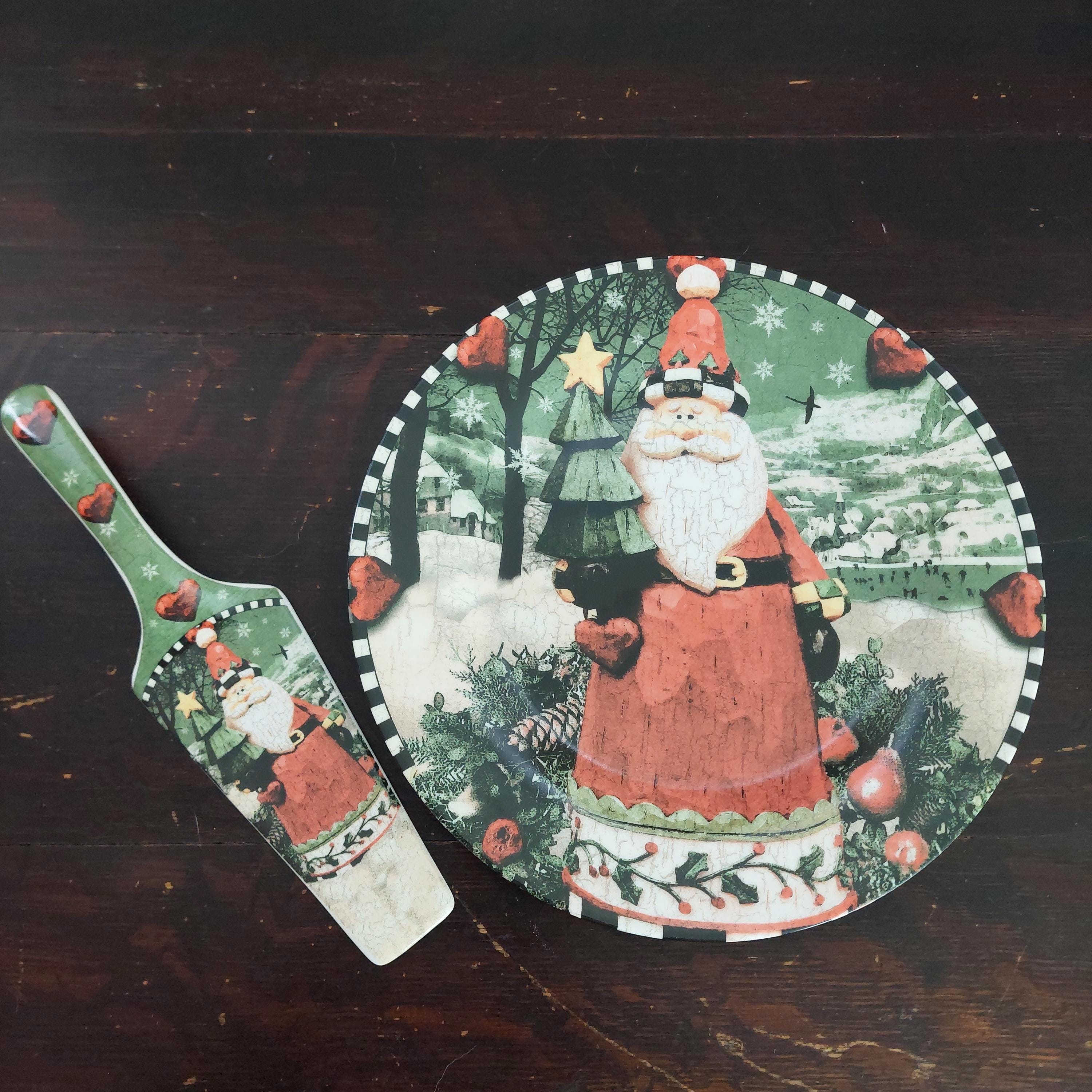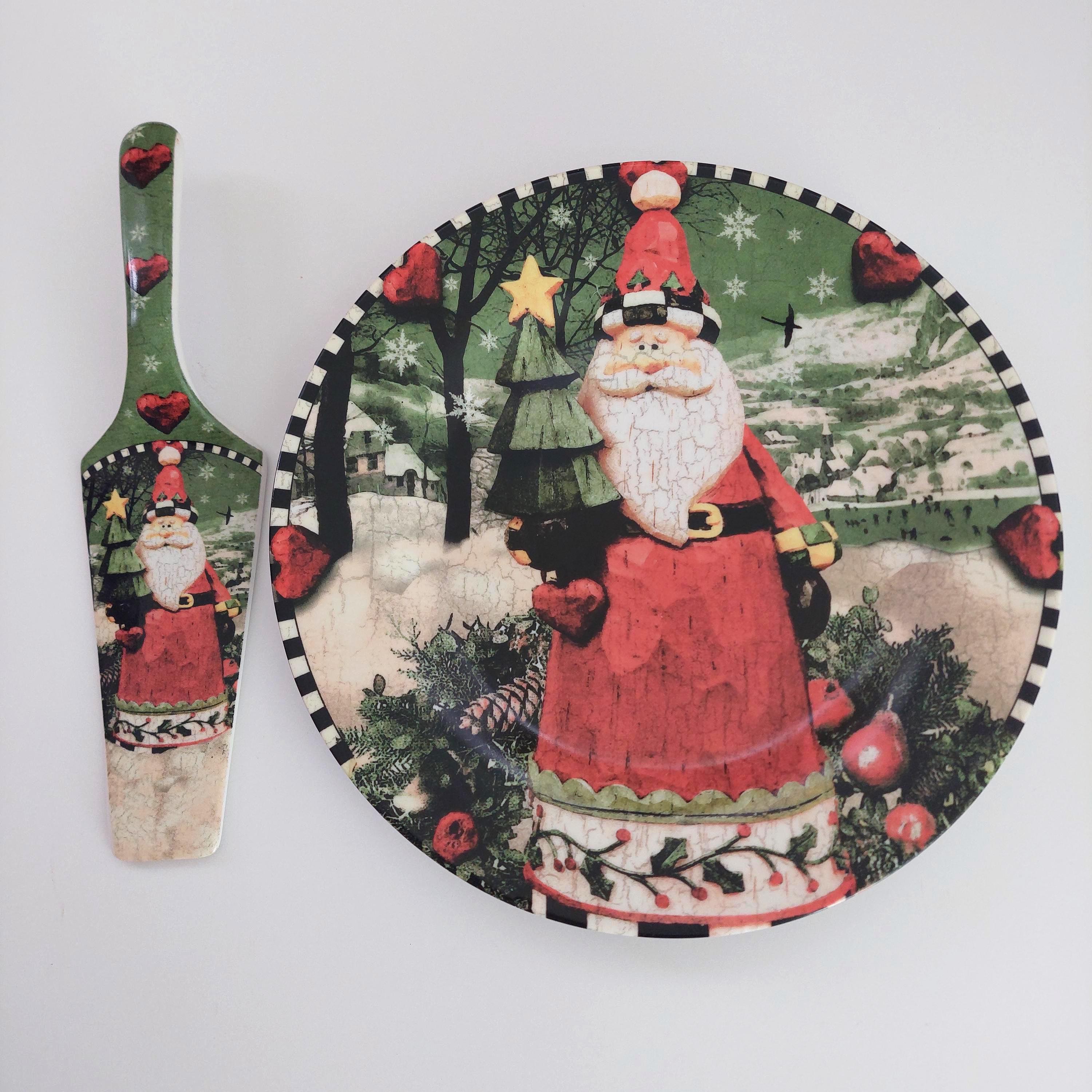 Vintage Certified International Christmas Lodge Santa ceramic cake serving plate with matching server.