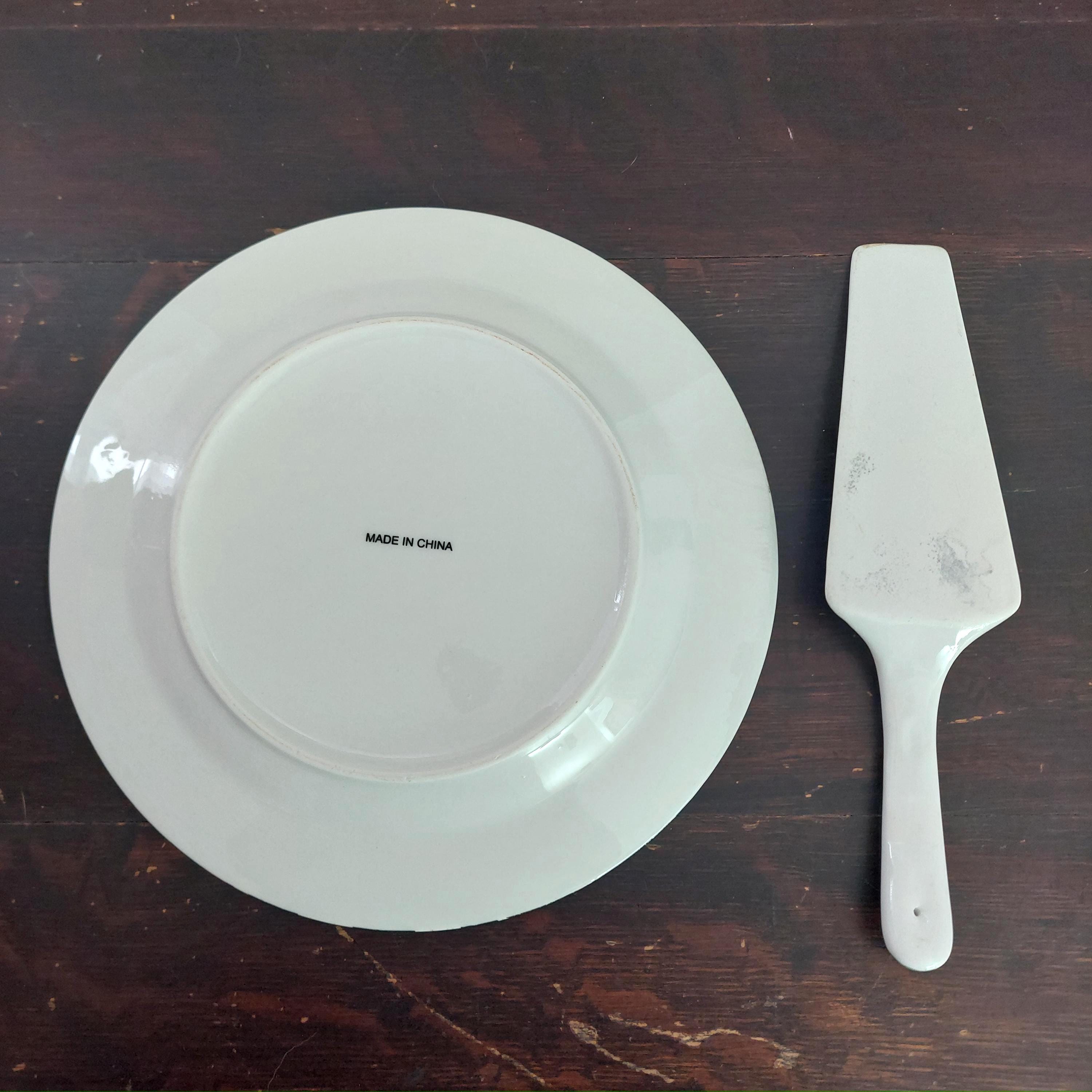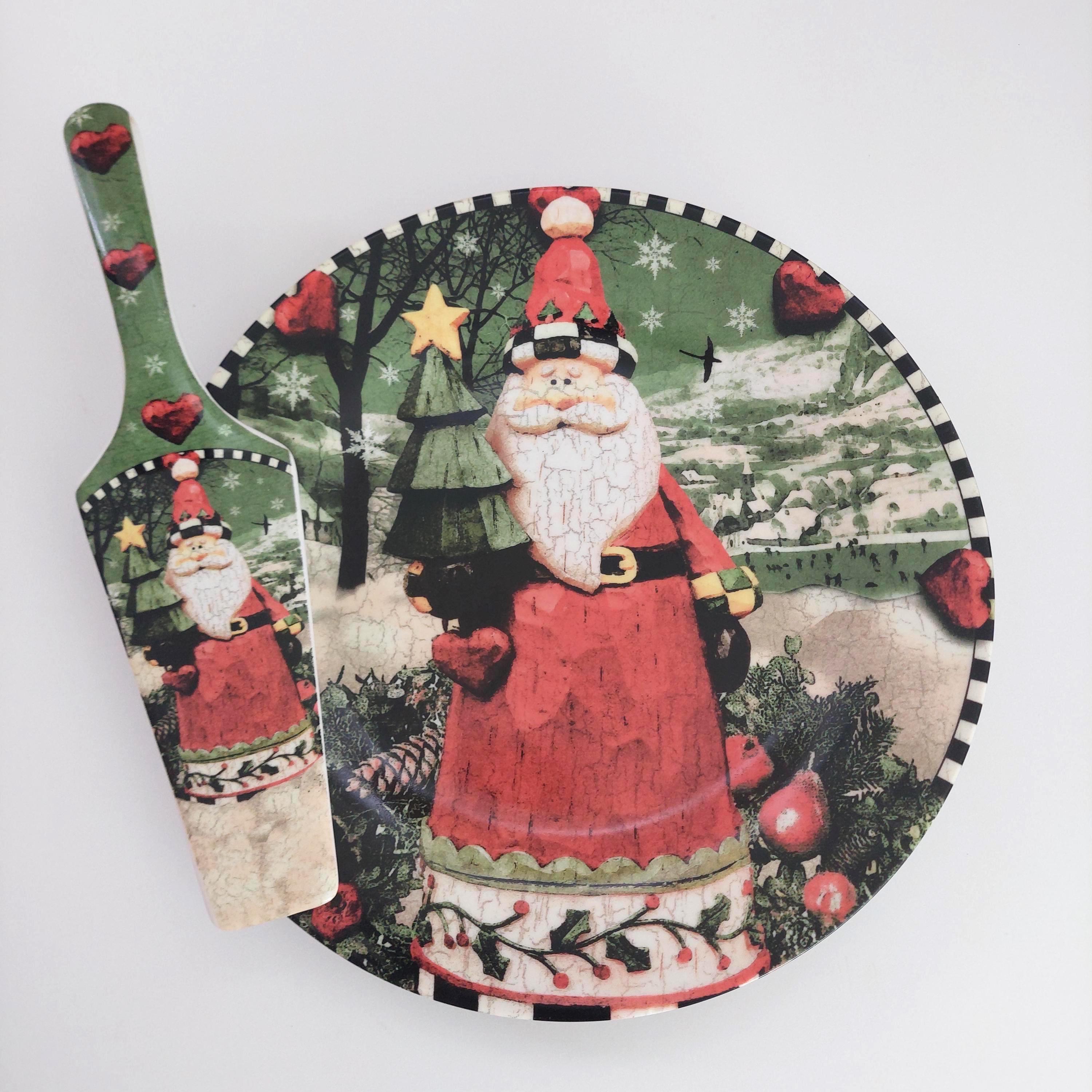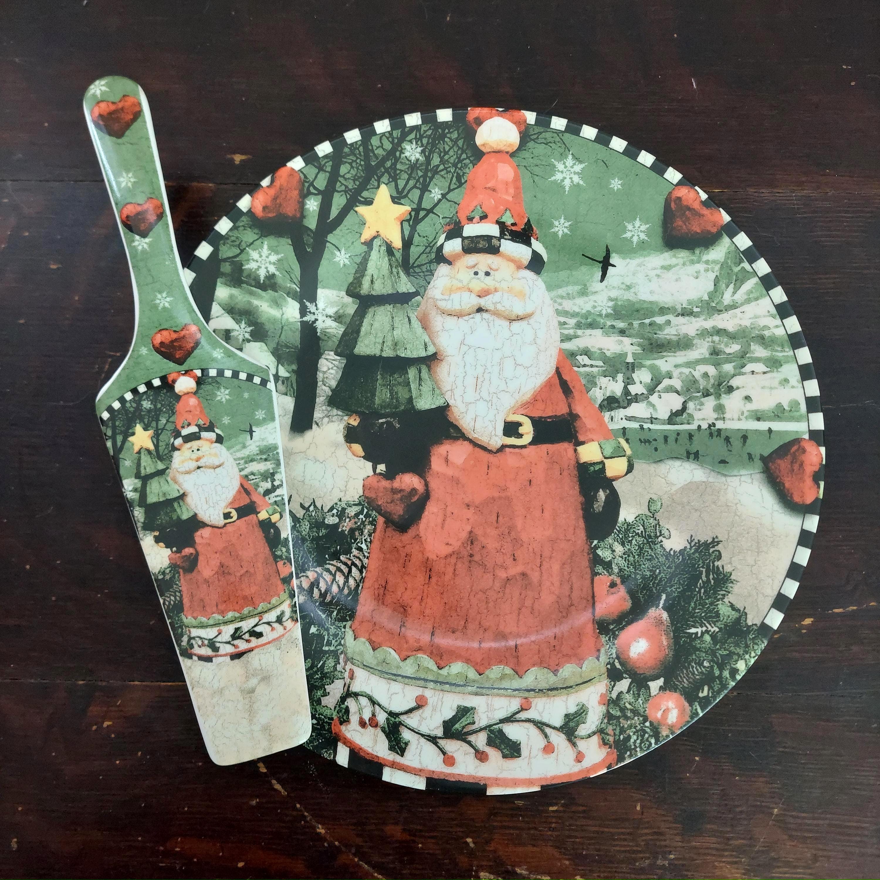 Vintage Certified International Christmas Lodge Santa ceramic cake serving plate with matching server.