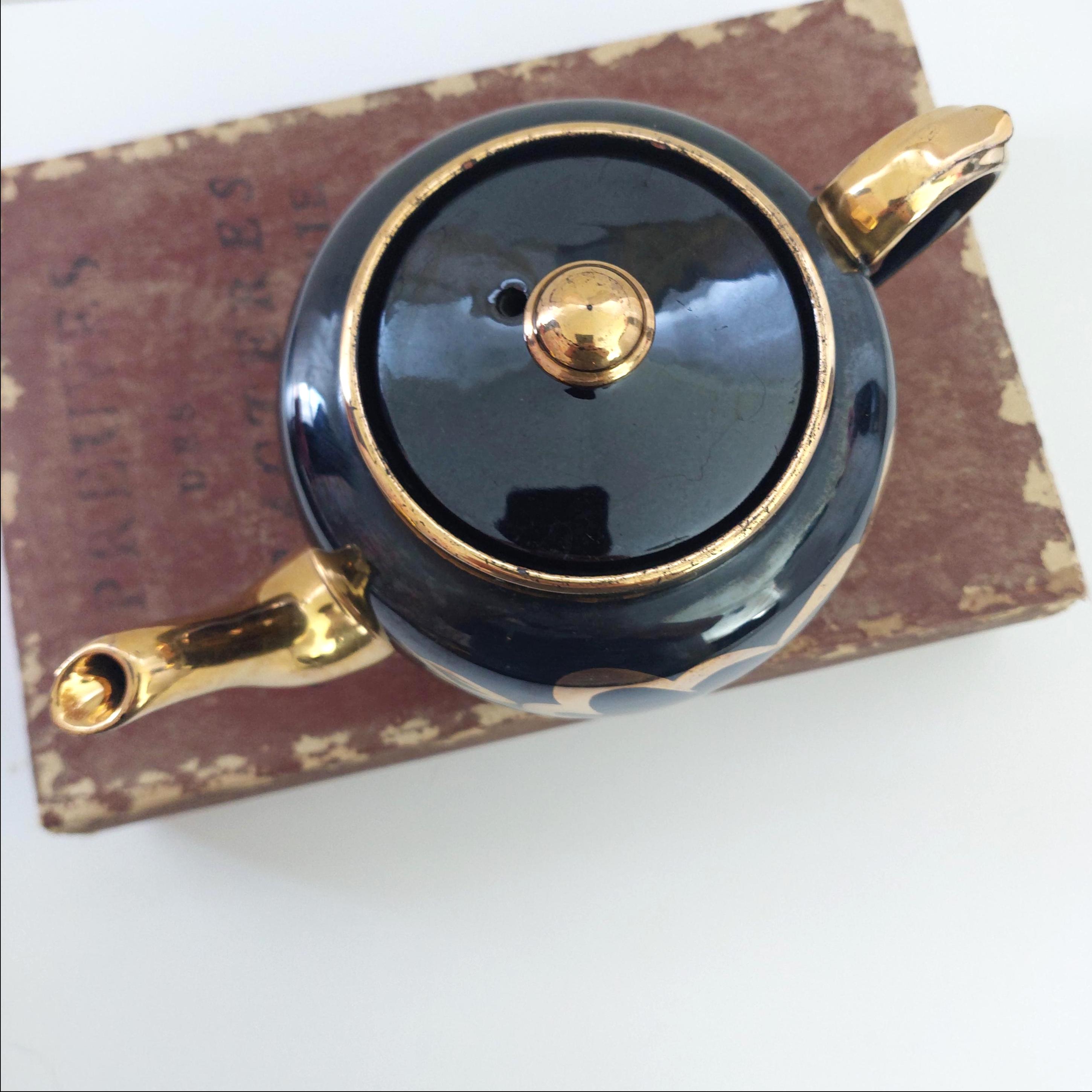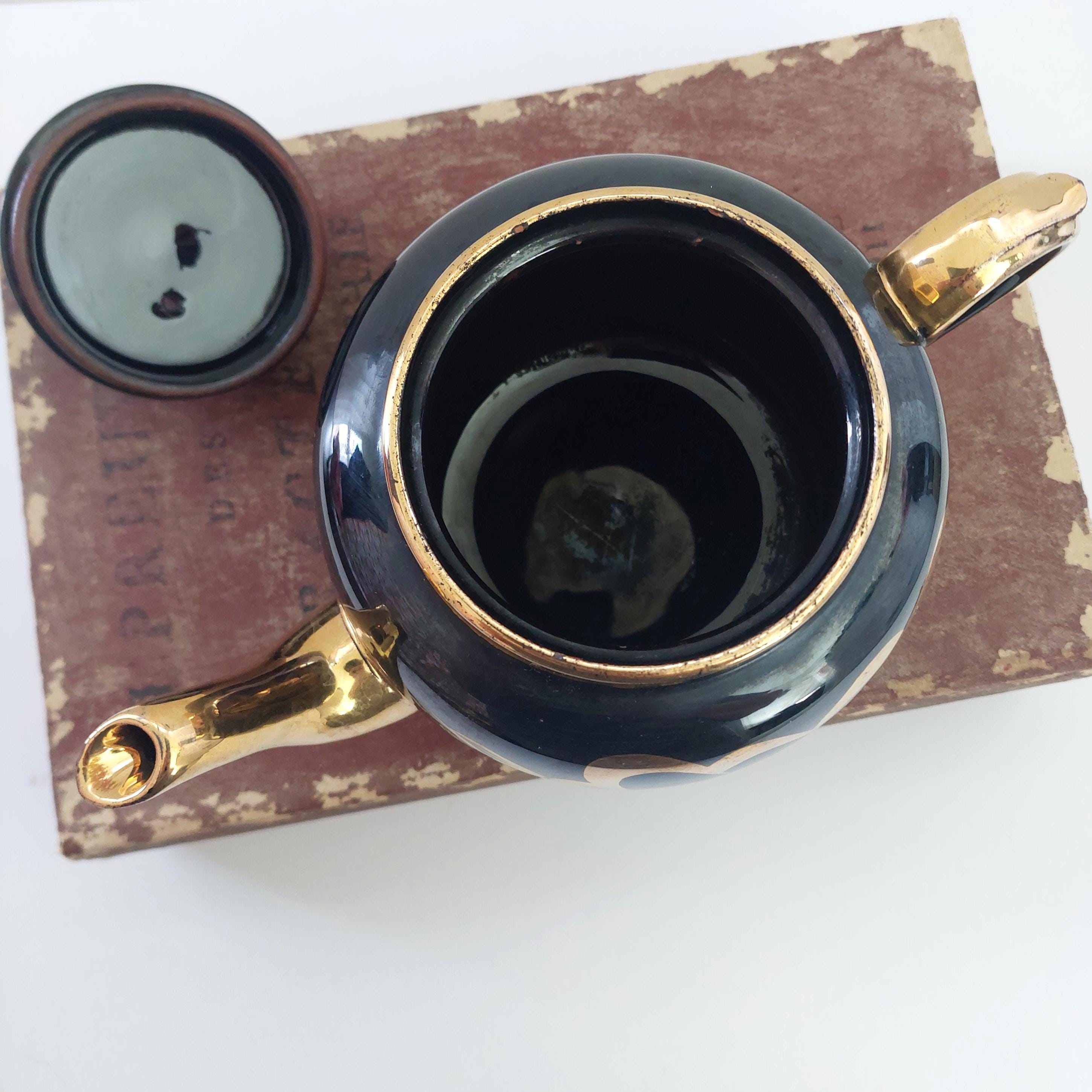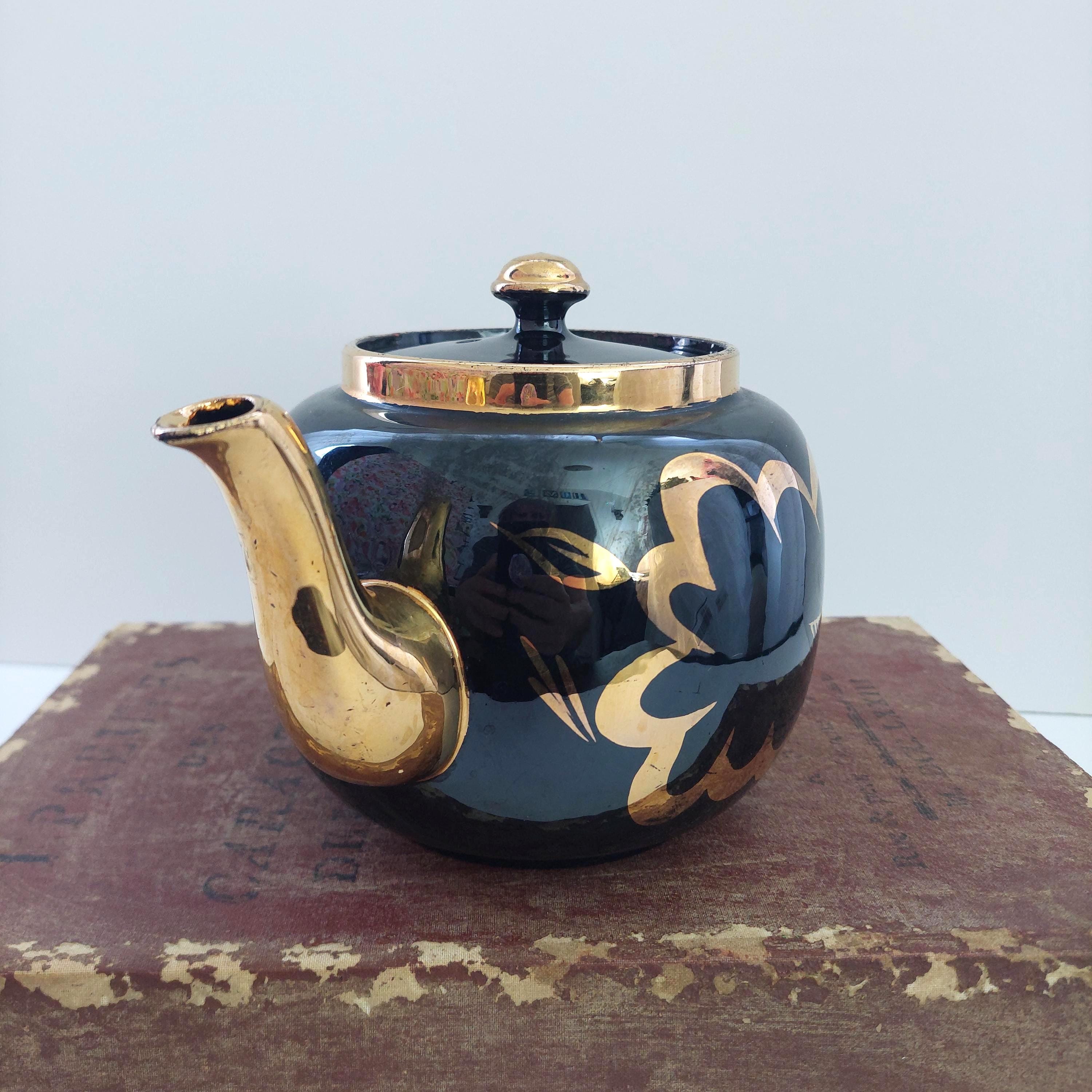 Vintage English teapot by Gibsons of England. This "Brown Betty" teapot is made of red clay, glaze and then hand painted a dark blue with gold detailing. A lovely gold gilded spout and handle.