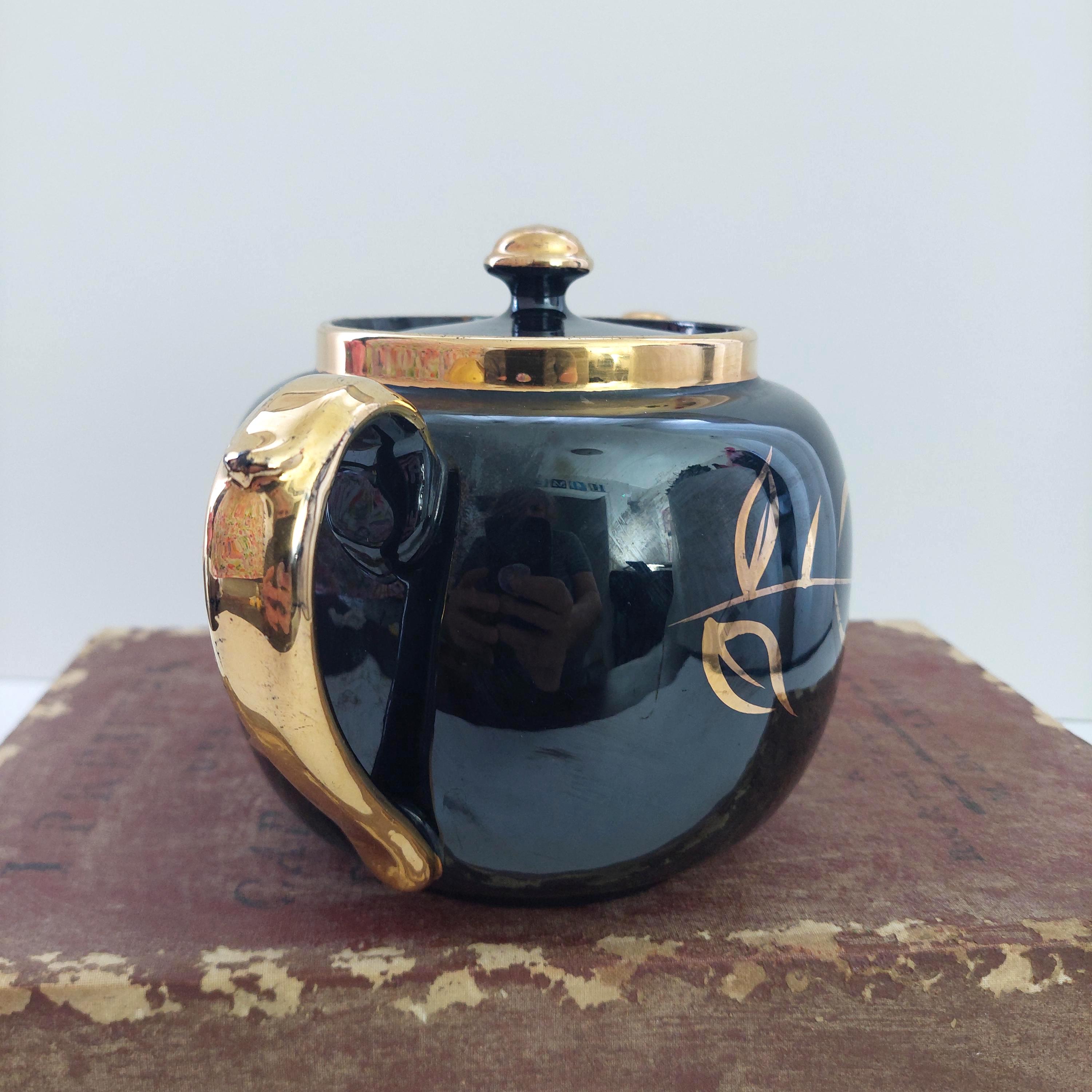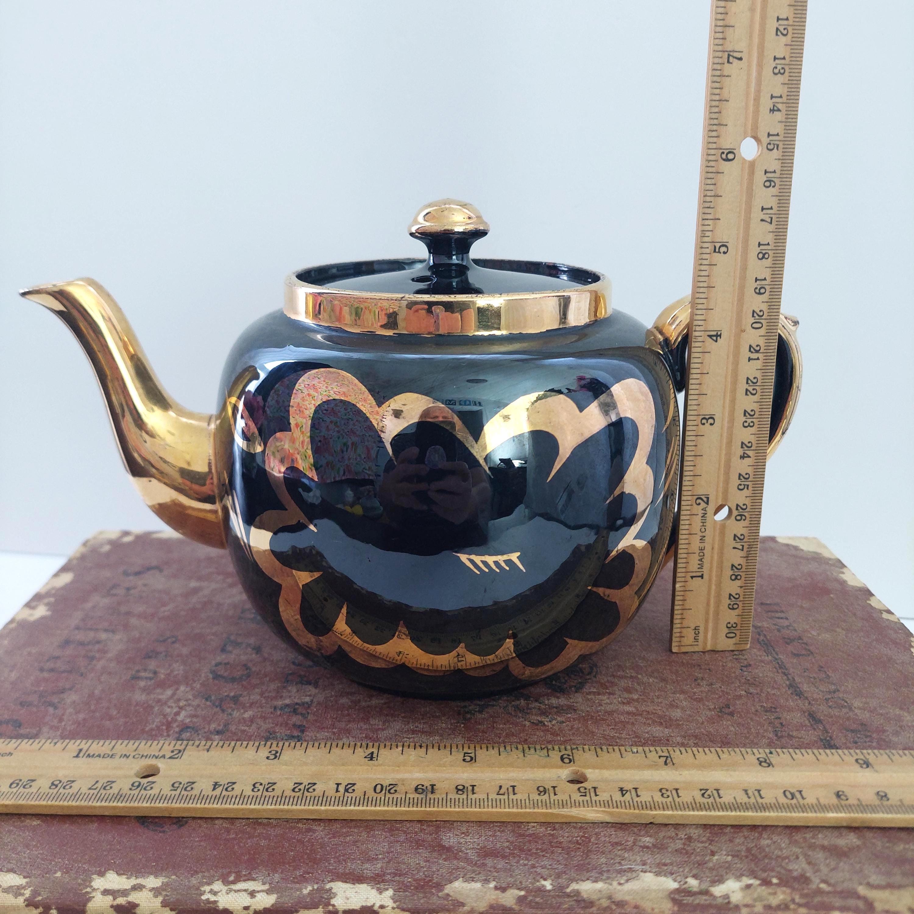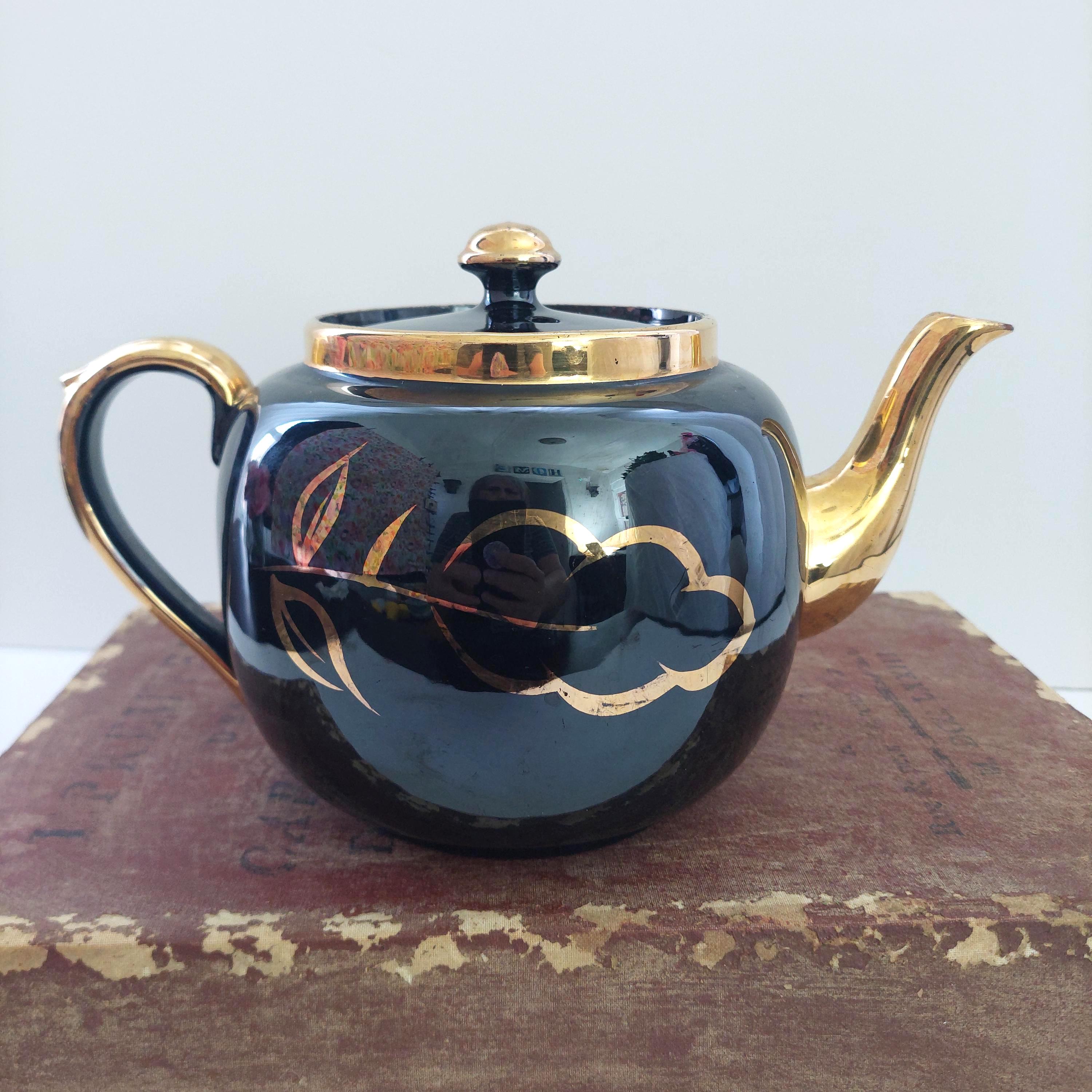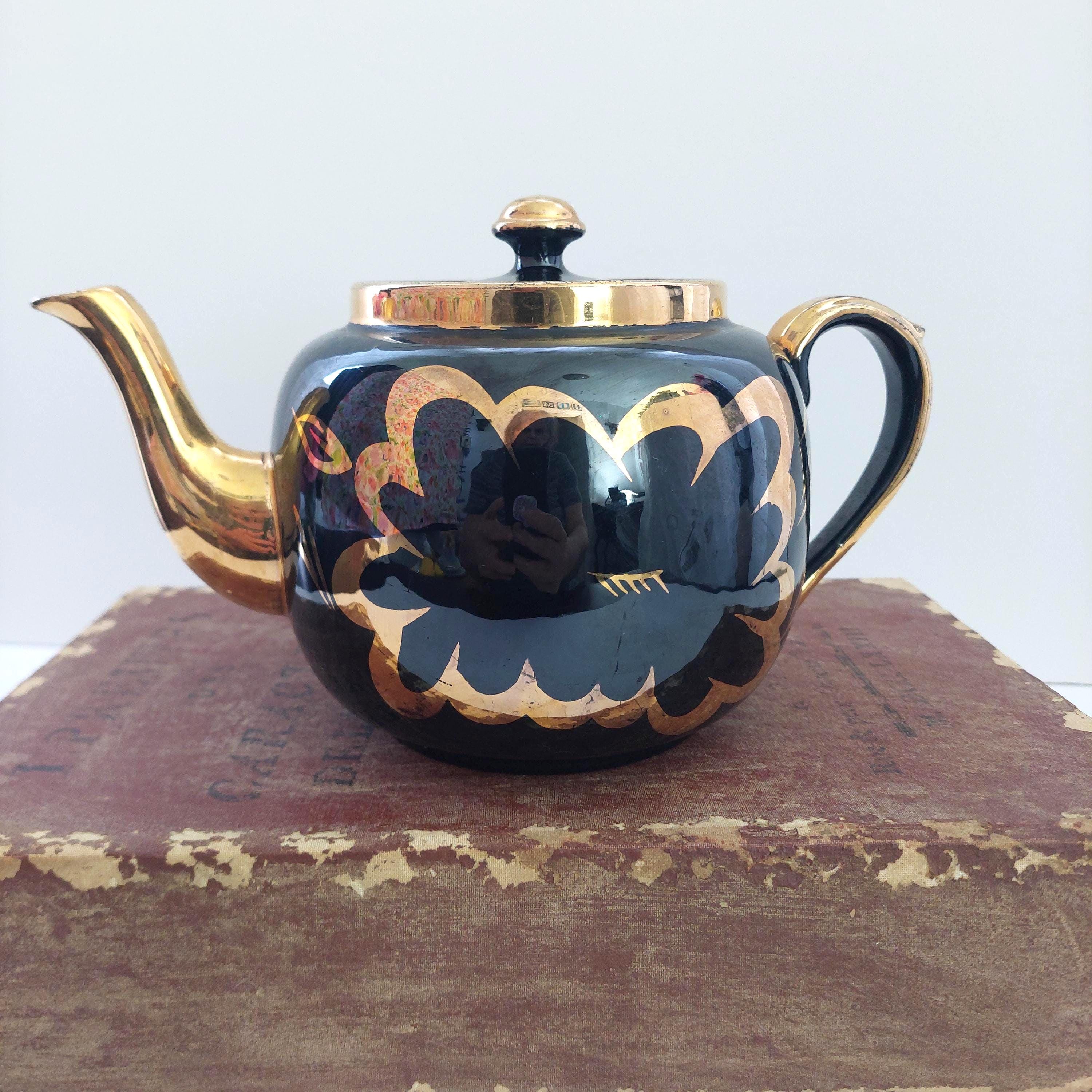 Vintage English teapot by Gibsons of England. This "Brown Betty" teapot is made of red clay, glaze and then hand painted a dark blue with gold detailing. A lovely gold gilded spout and handle.