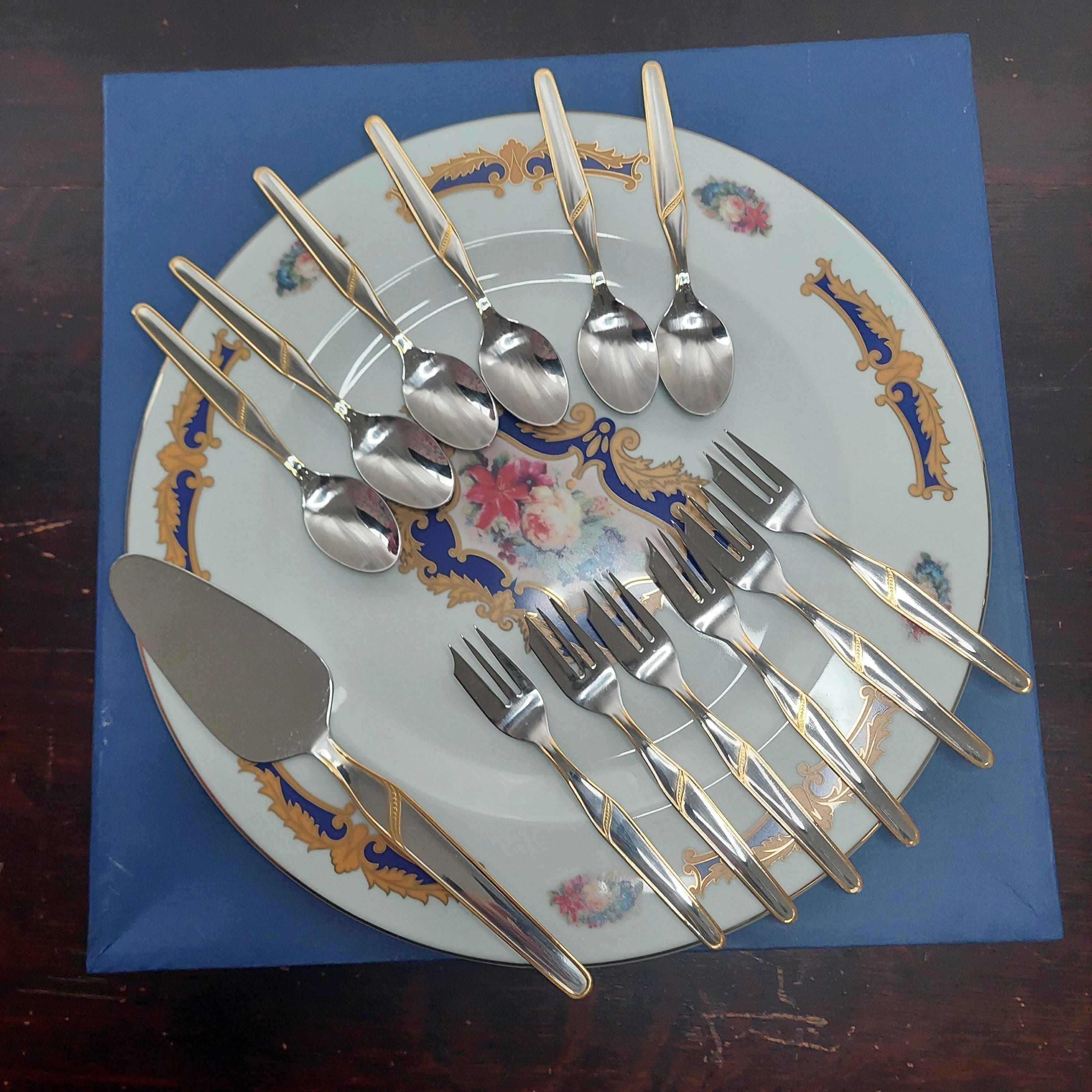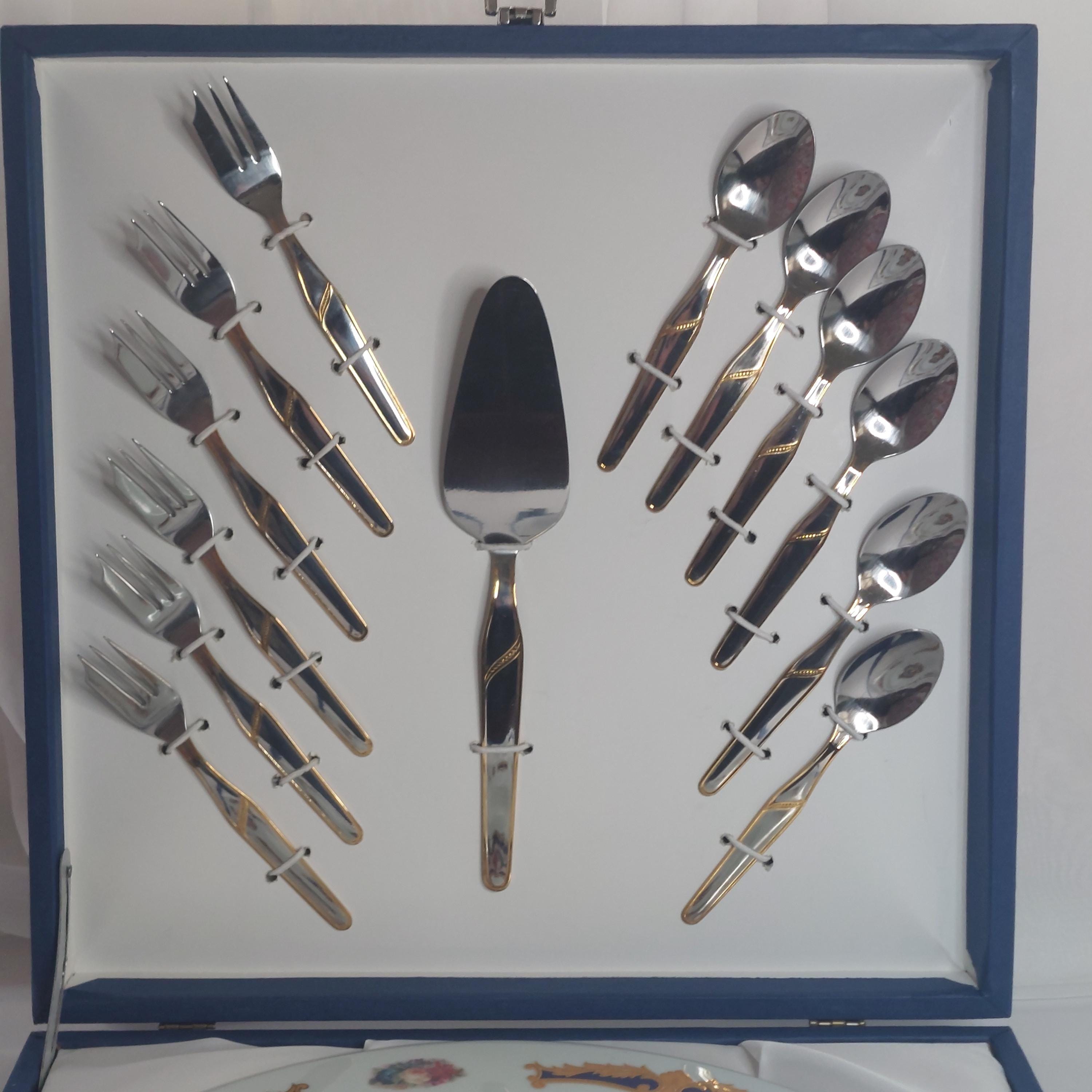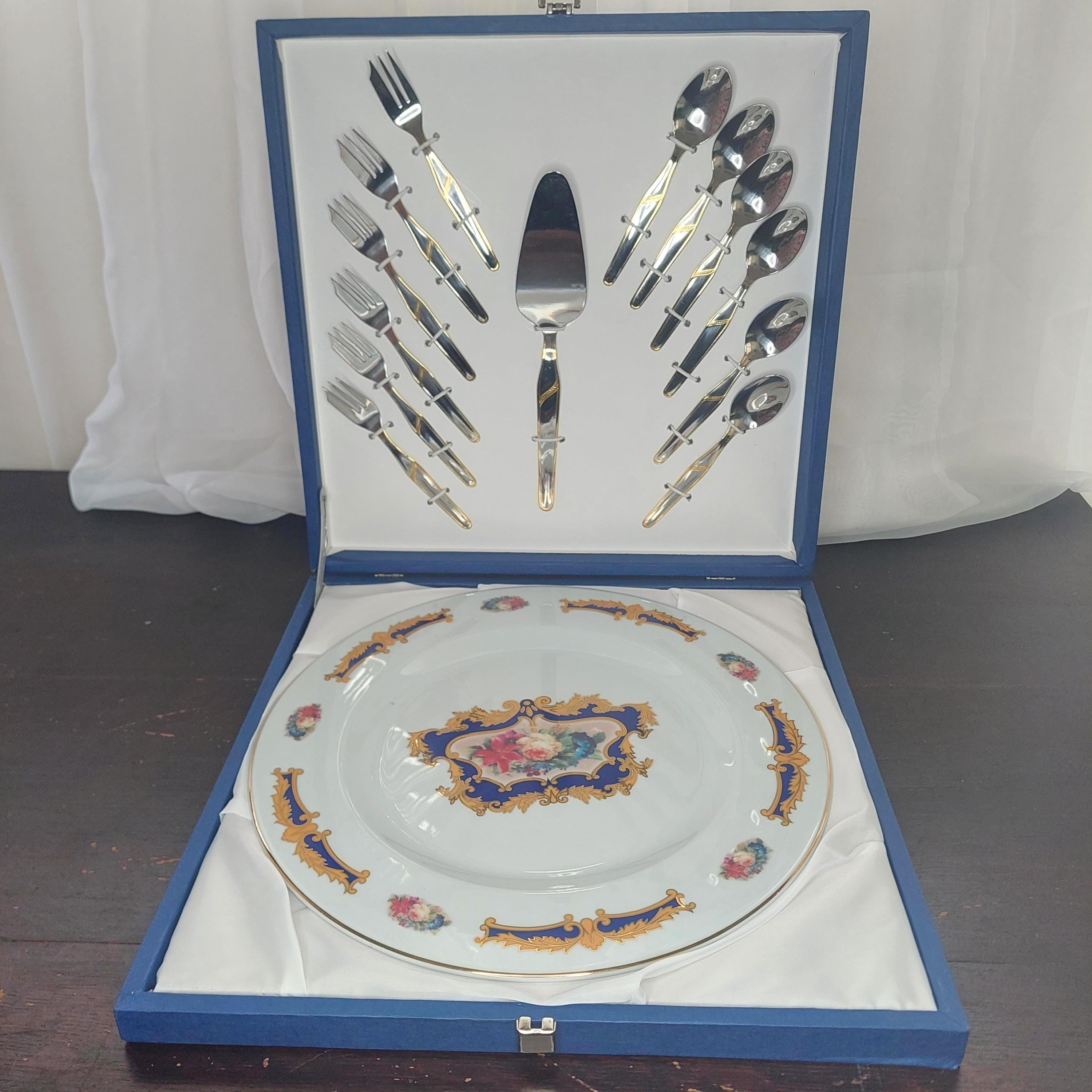 Large round cake or dessert platter featuring florals, cobalt blue, tan scrolls and gold details. Dessert set includes 6 each of stainless steel cake fork and tea spoons and one stainless steel cake server. Set comes in its own storage box.