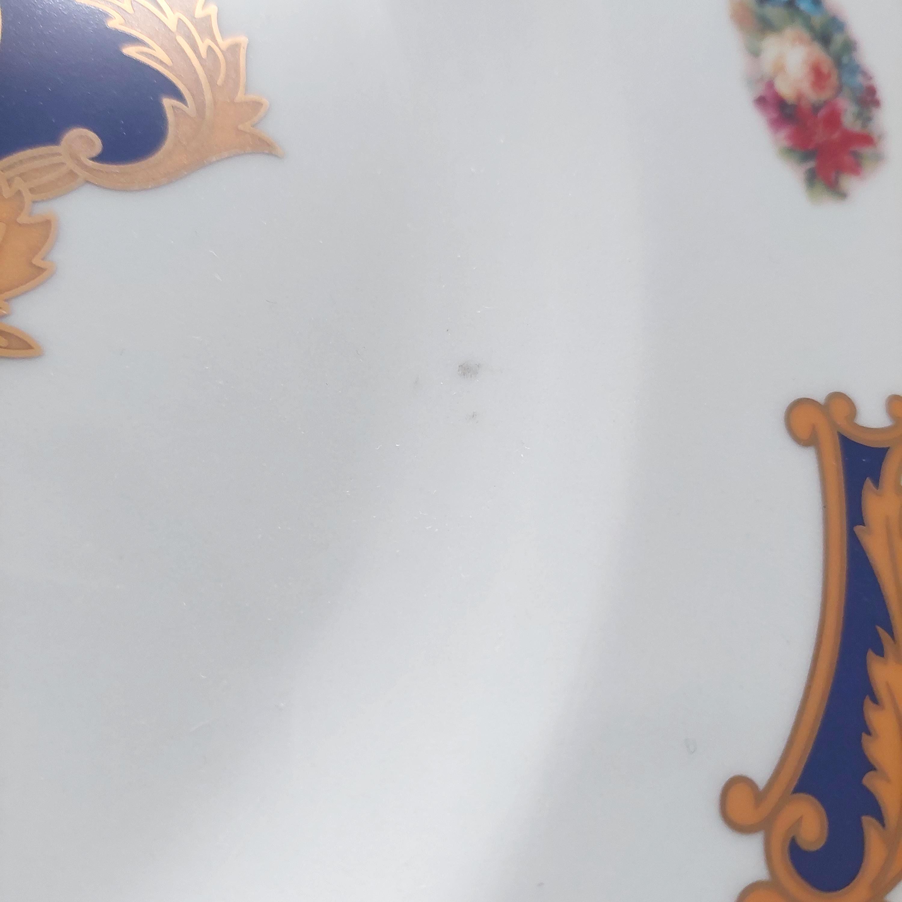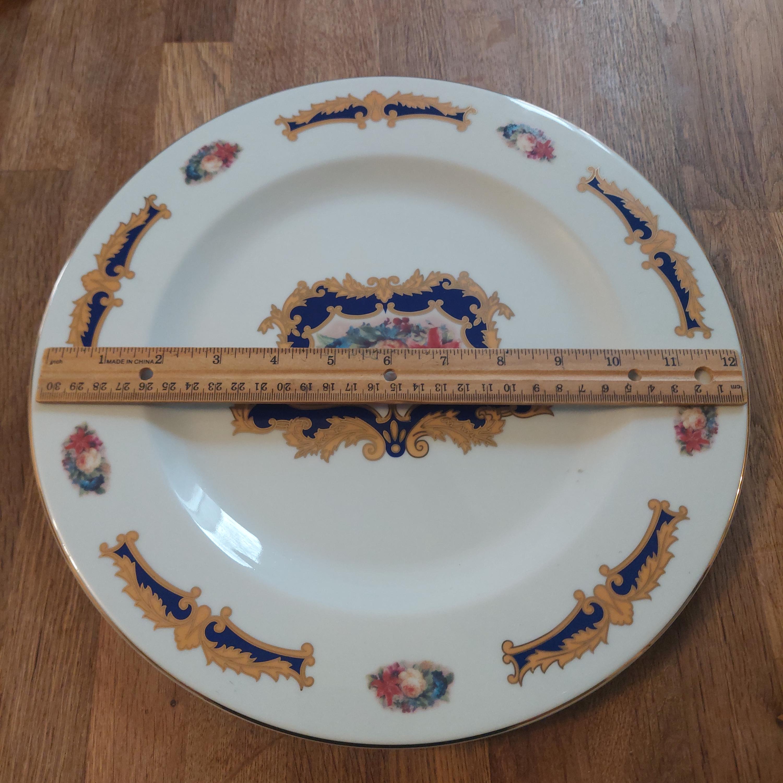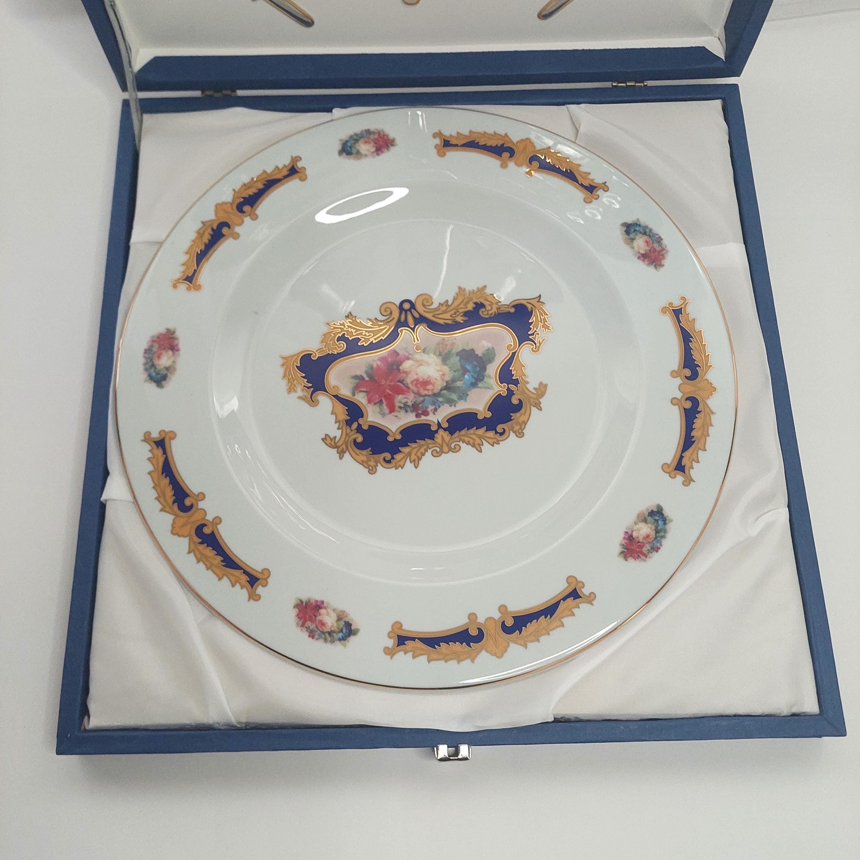 Large round cake or dessert platter featuring florals, cobalt blue, tan scrolls and gold details. Dessert set includes 6 each of stainless steel cake fork and tea spoons and one stainless steel cake server. Set comes in its own storage box.