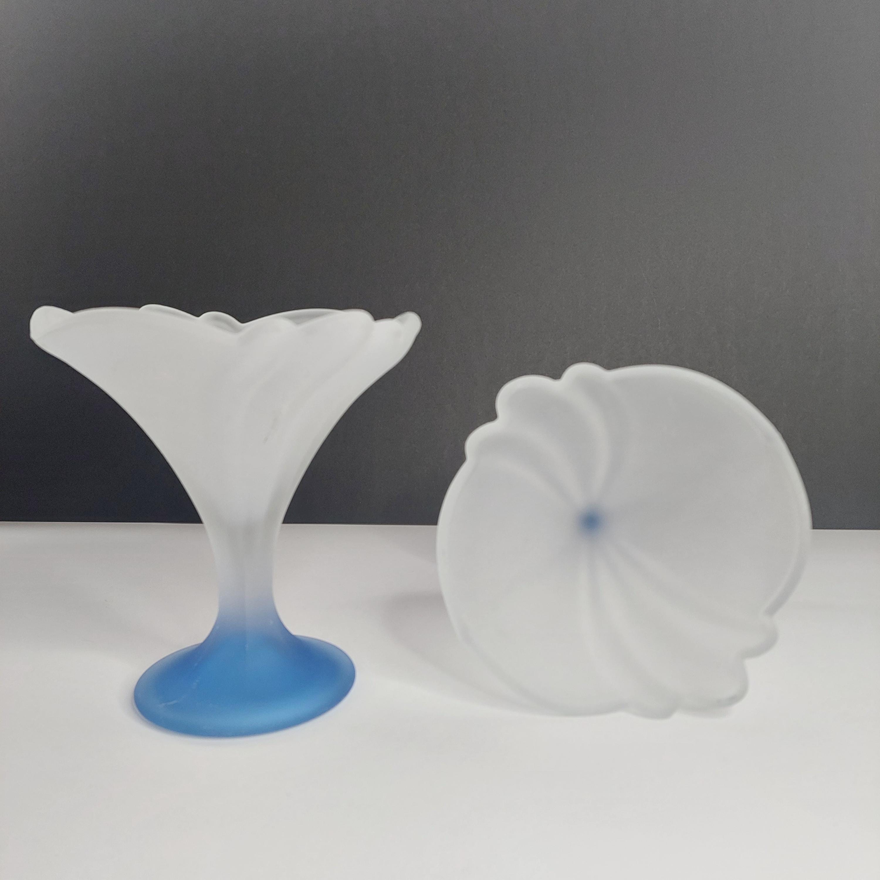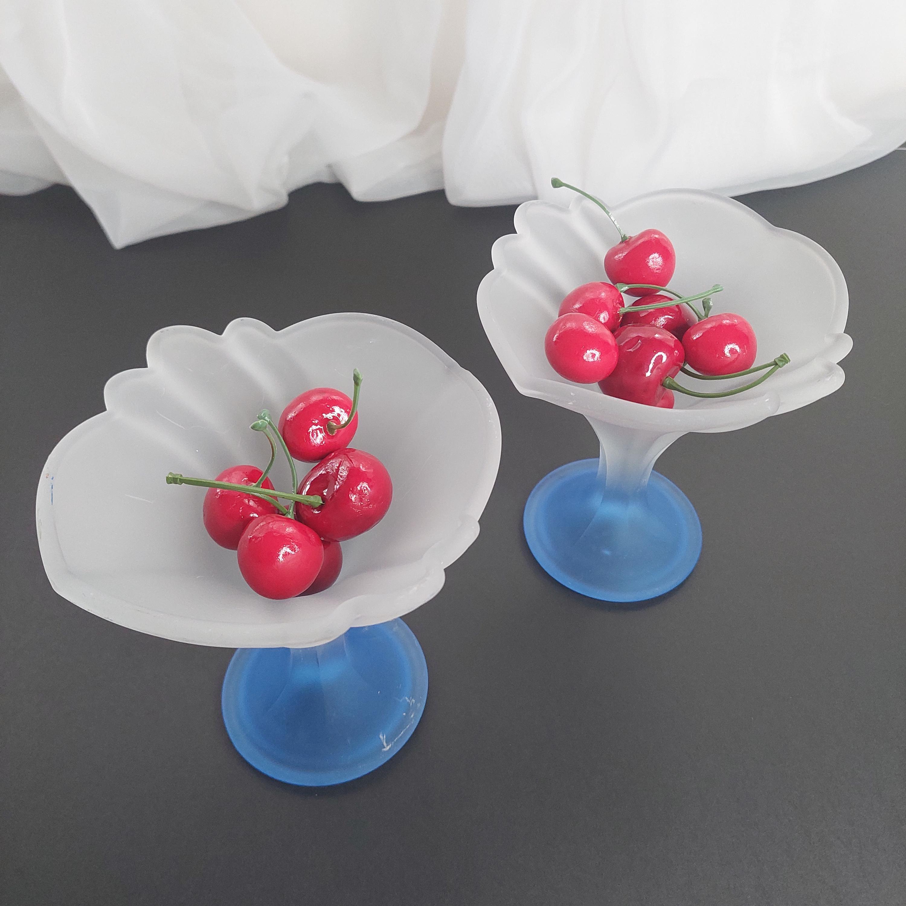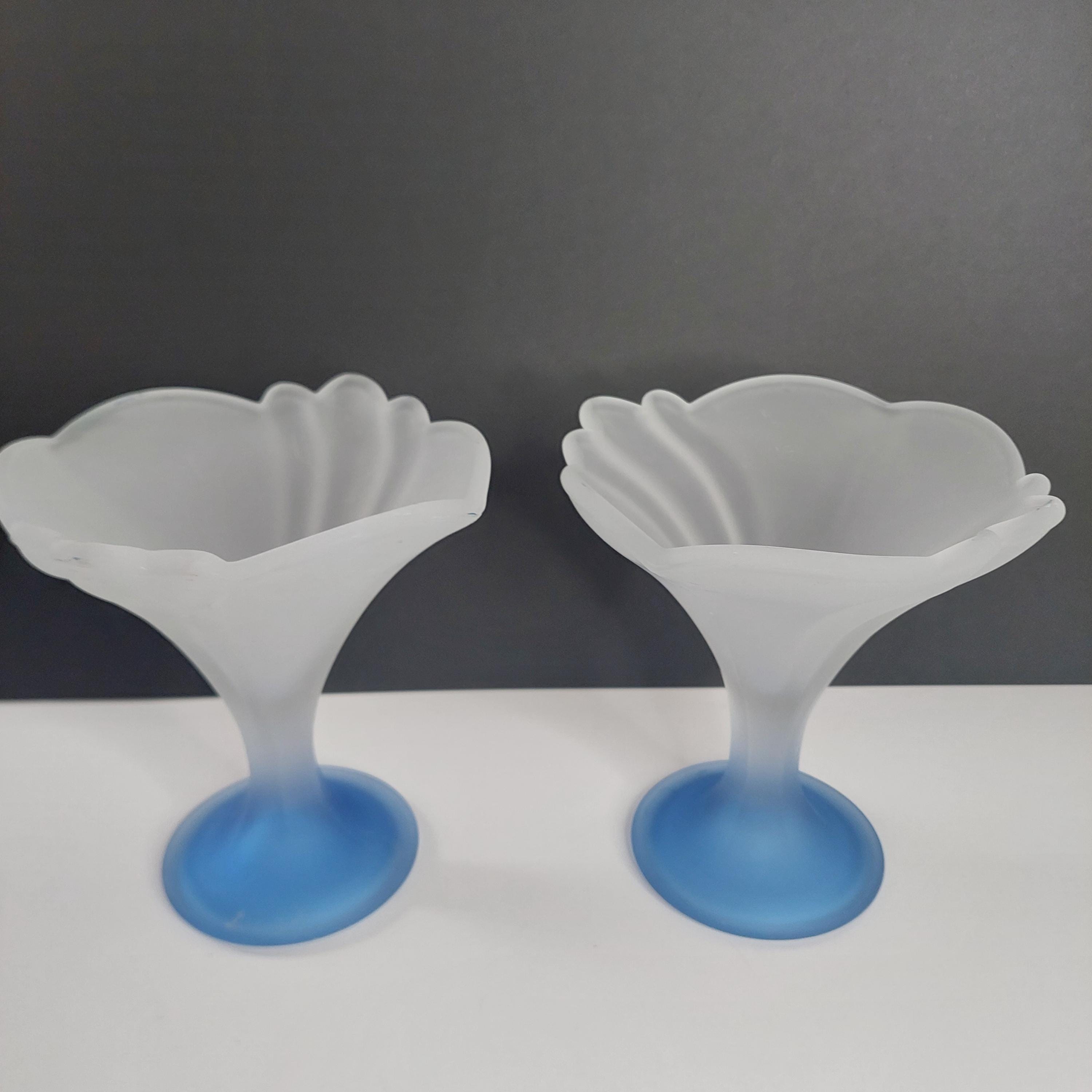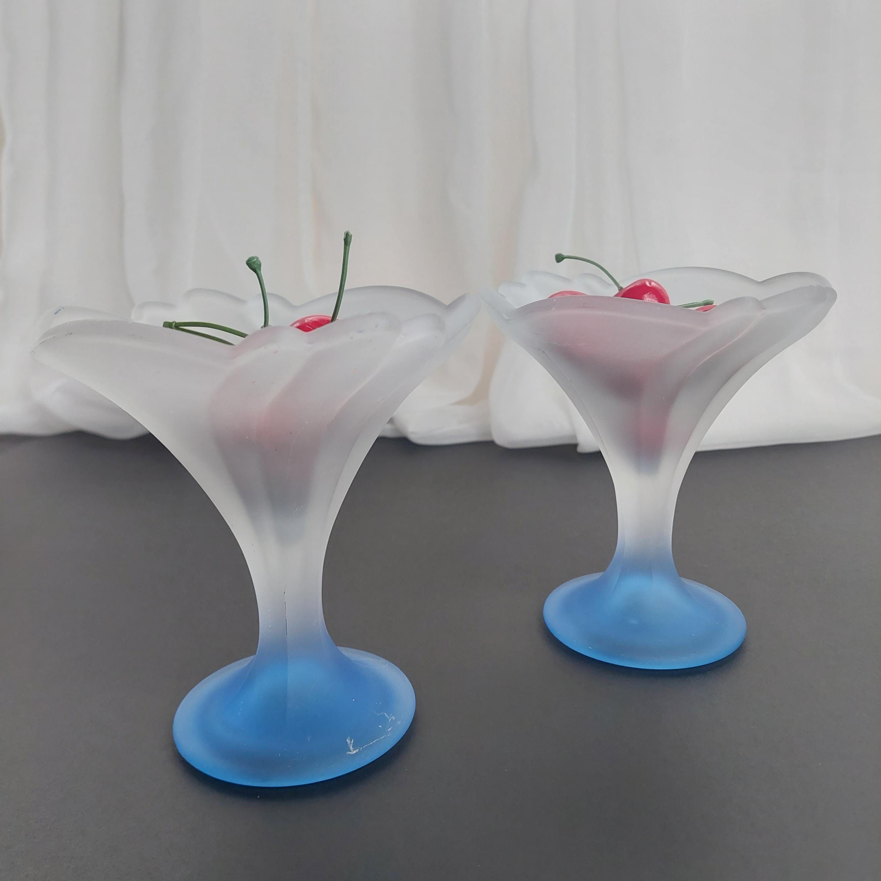 Vintage Italian flower-shaped sundae glasses featuring white frosted / satin cup and translucent blue foot.