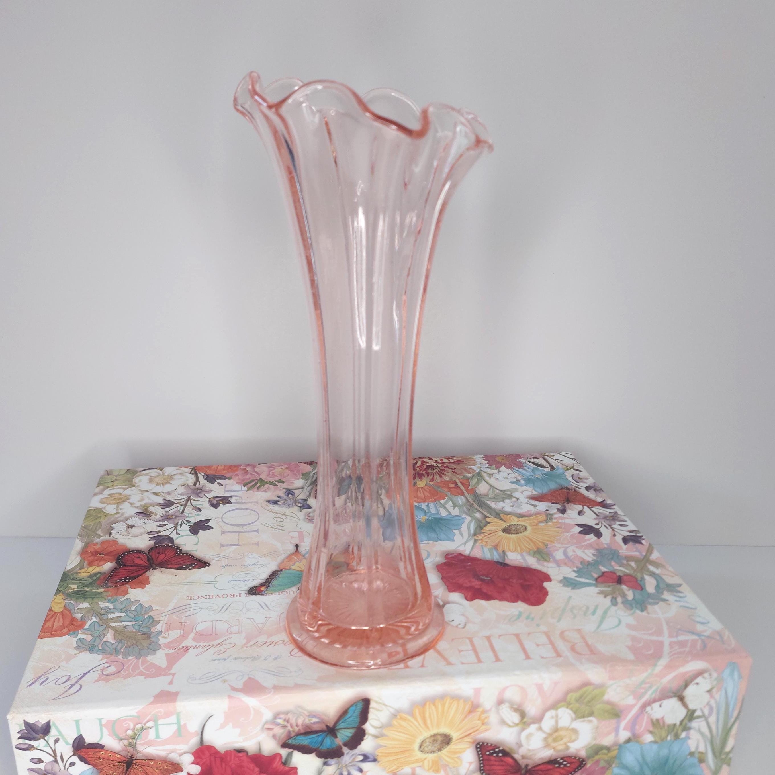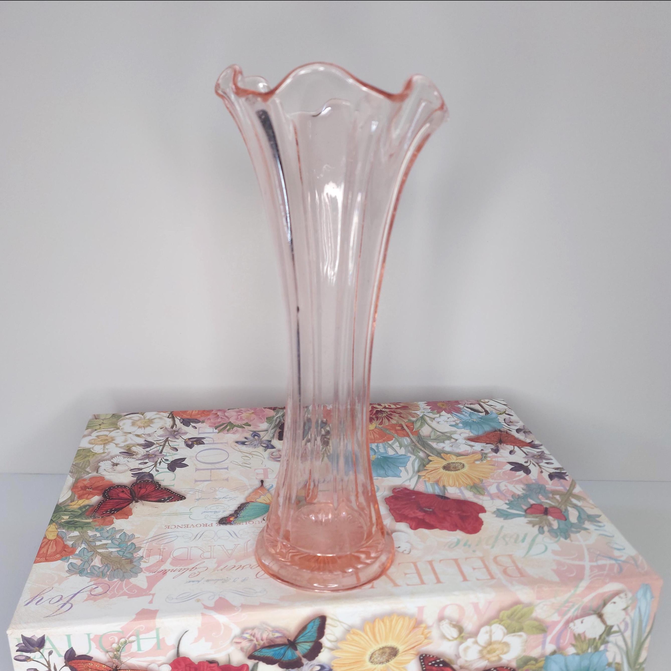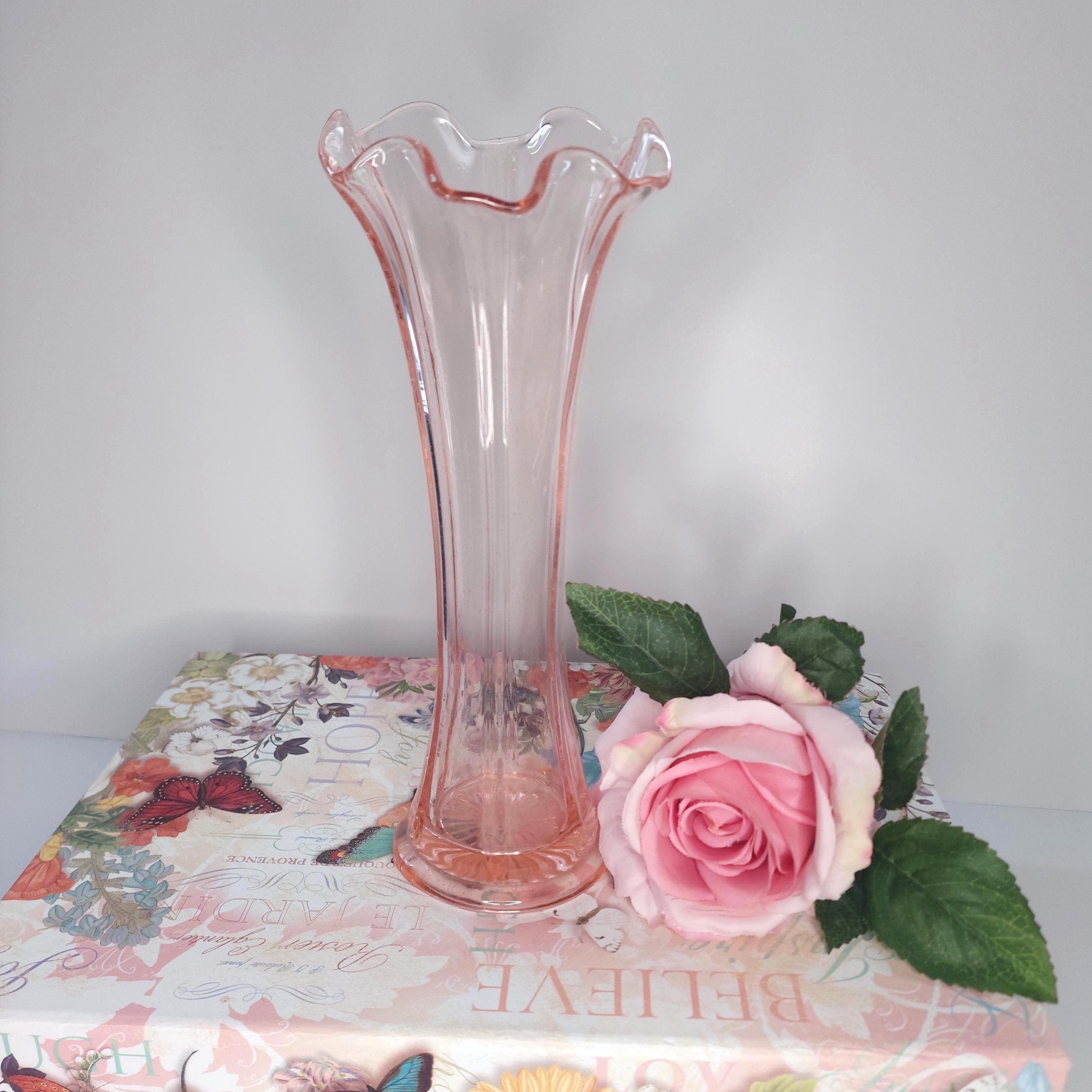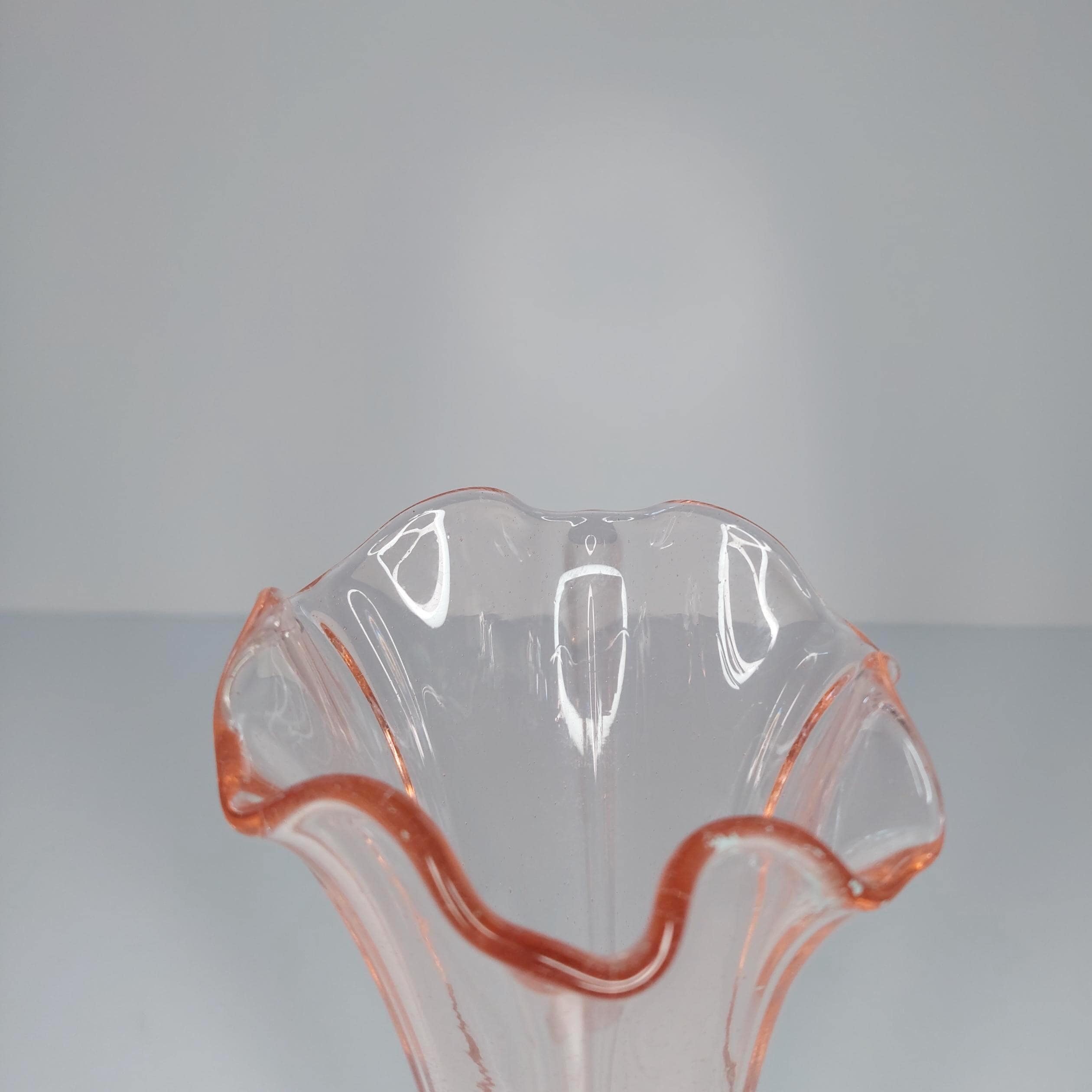 Vintage pink vase with a lovely ruffled edge. May be Fenton. Lots of tiny bubbles