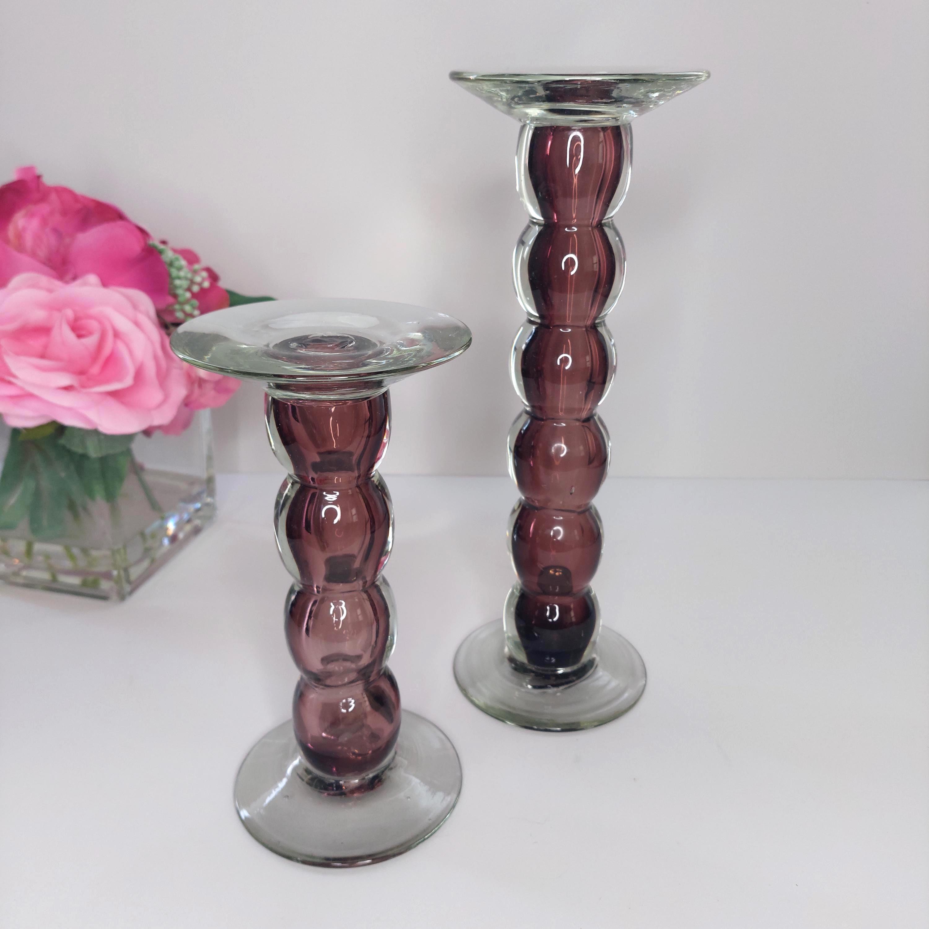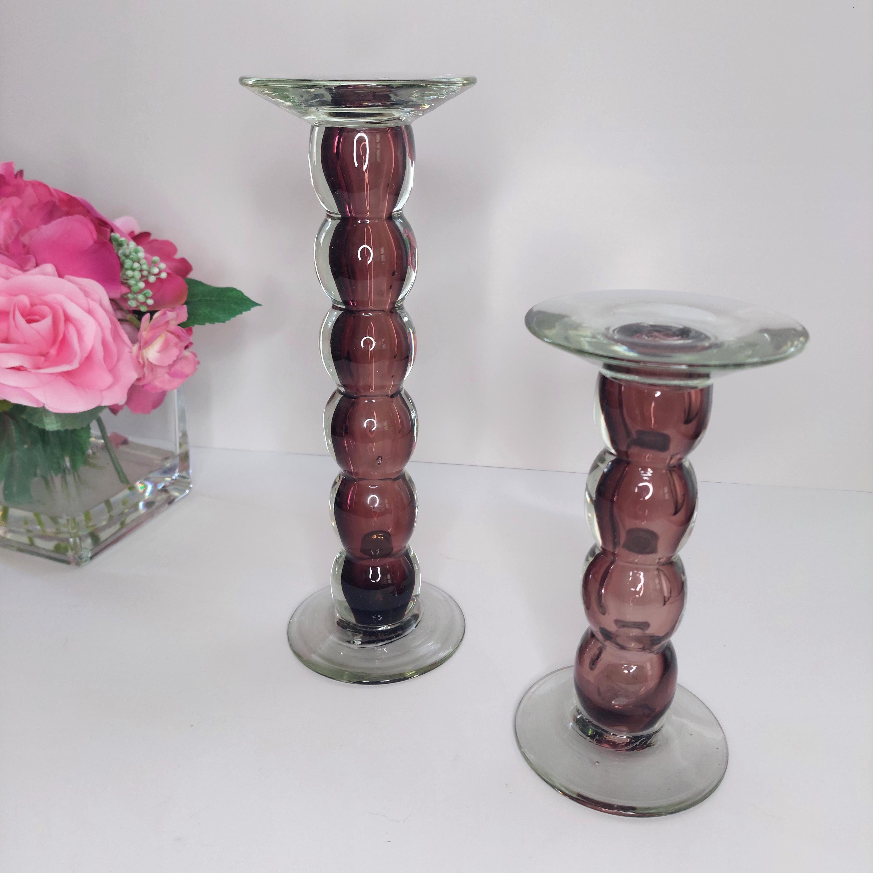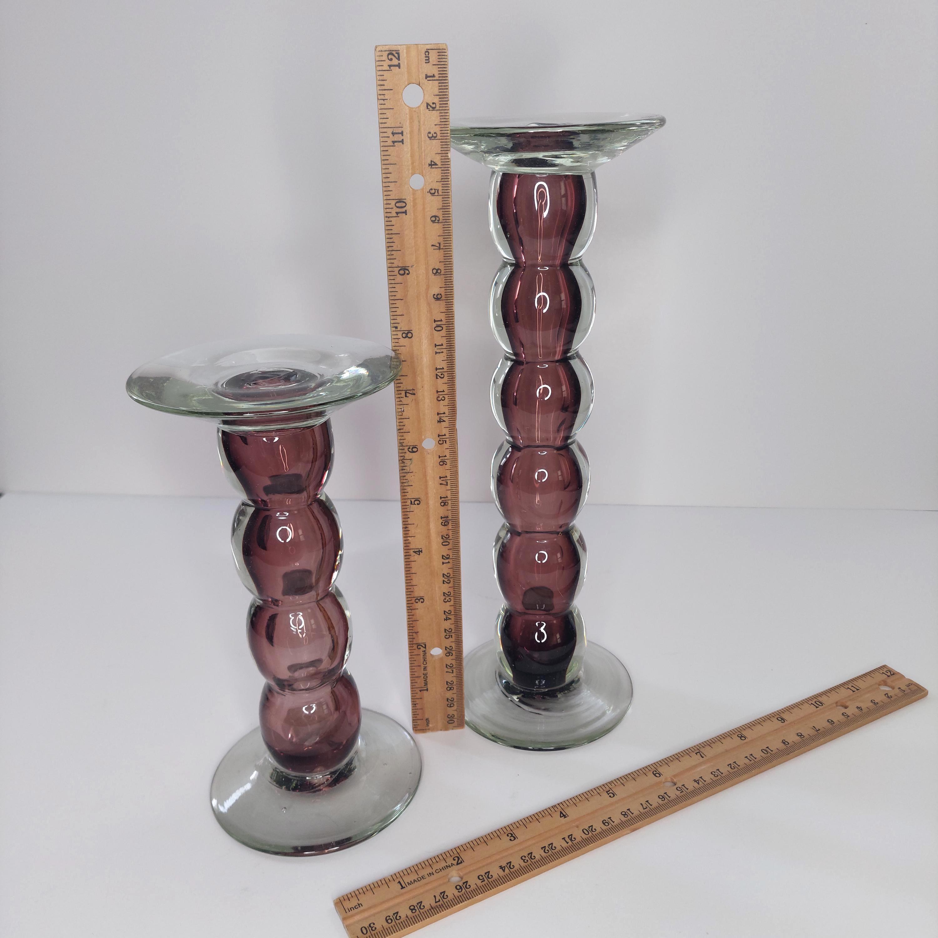Vintage set of solid blown glass pillar candle holders. Amethyst glass ball shaped stems with clear glass for pillar candles.