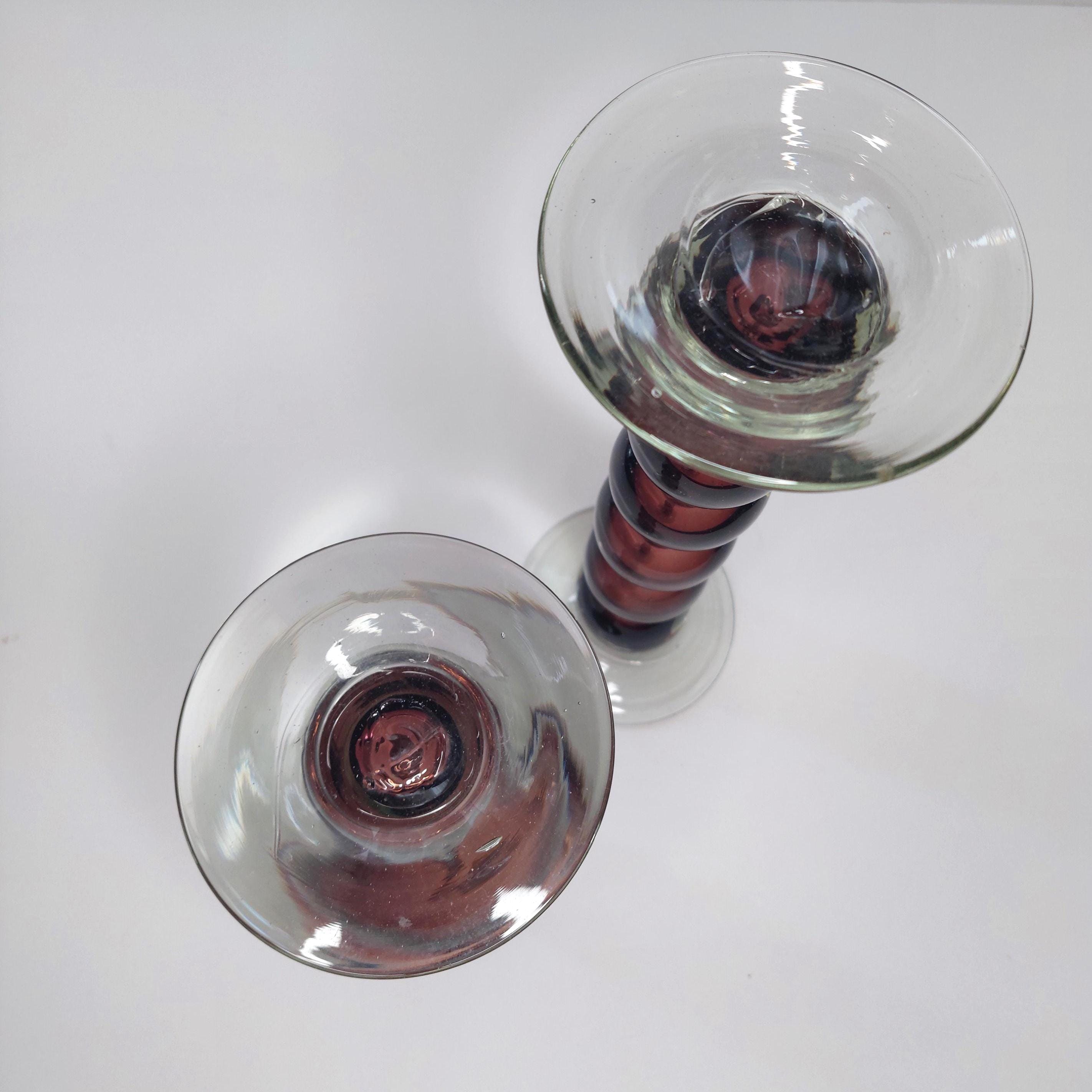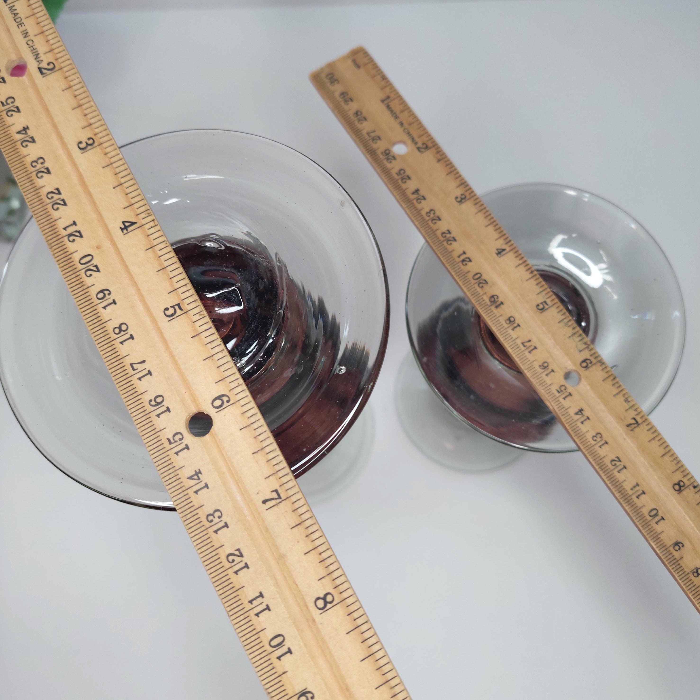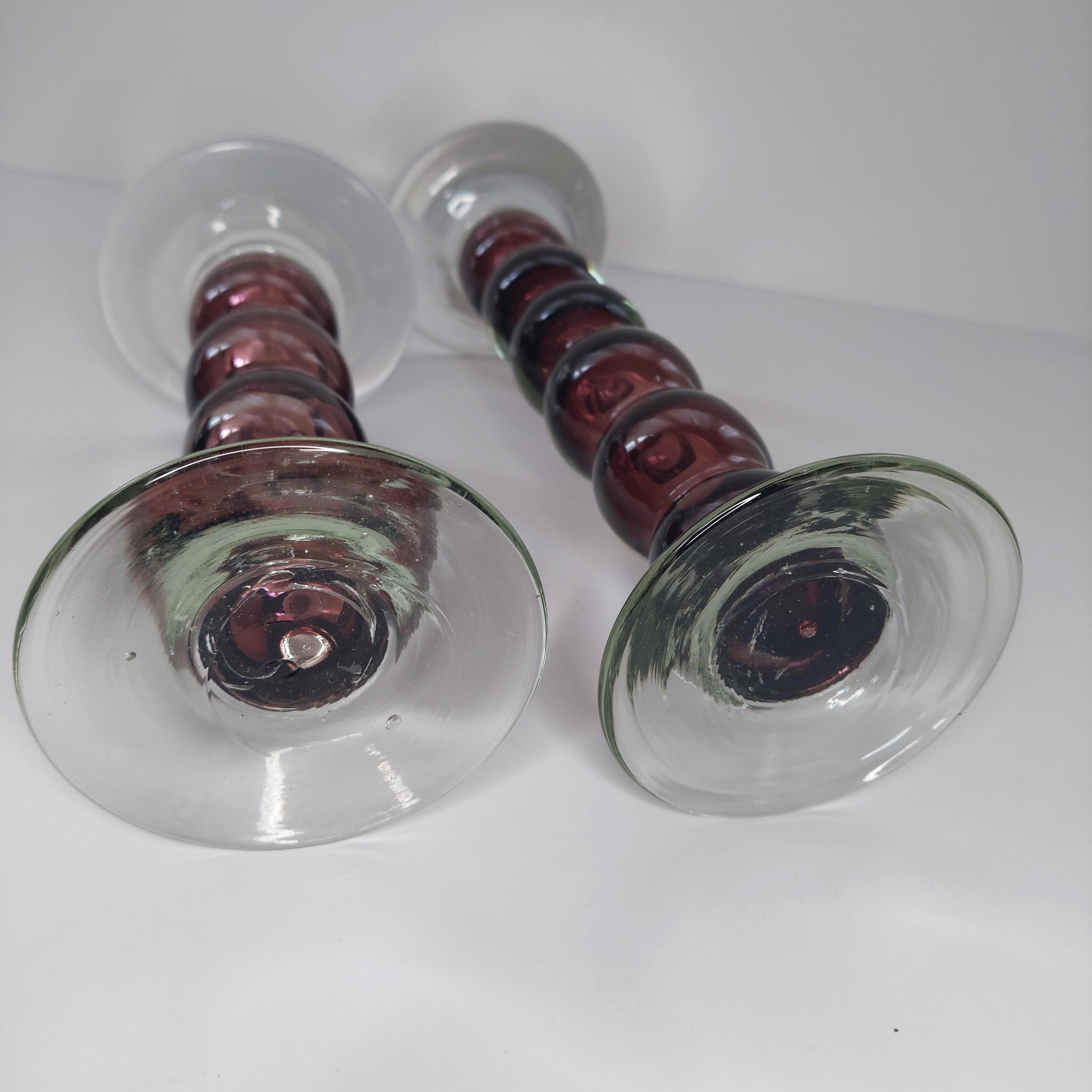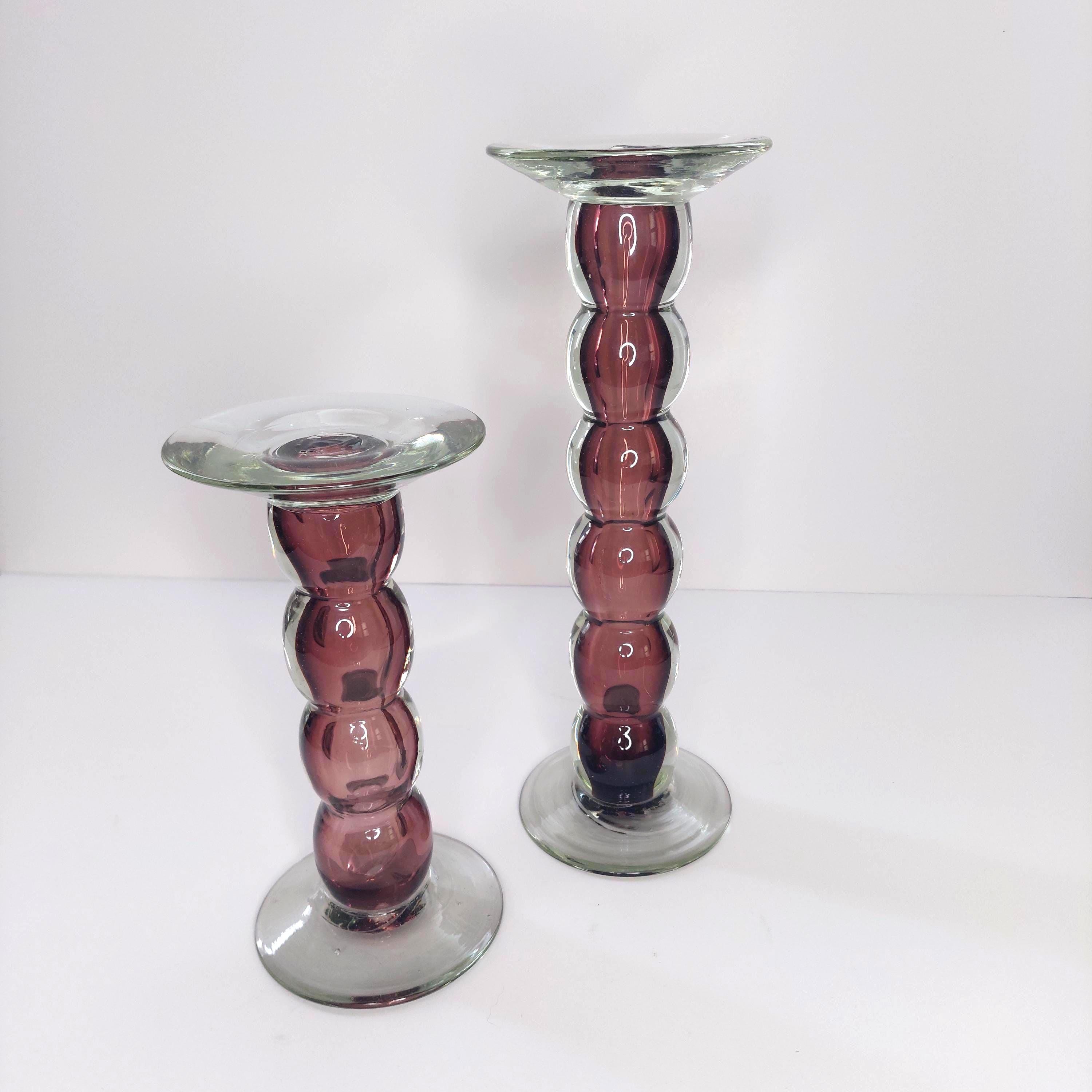 Vintage set of solid blown glass pillar candle holders. Amethyst glass ball shaped stems with clear glass for pillar candles.