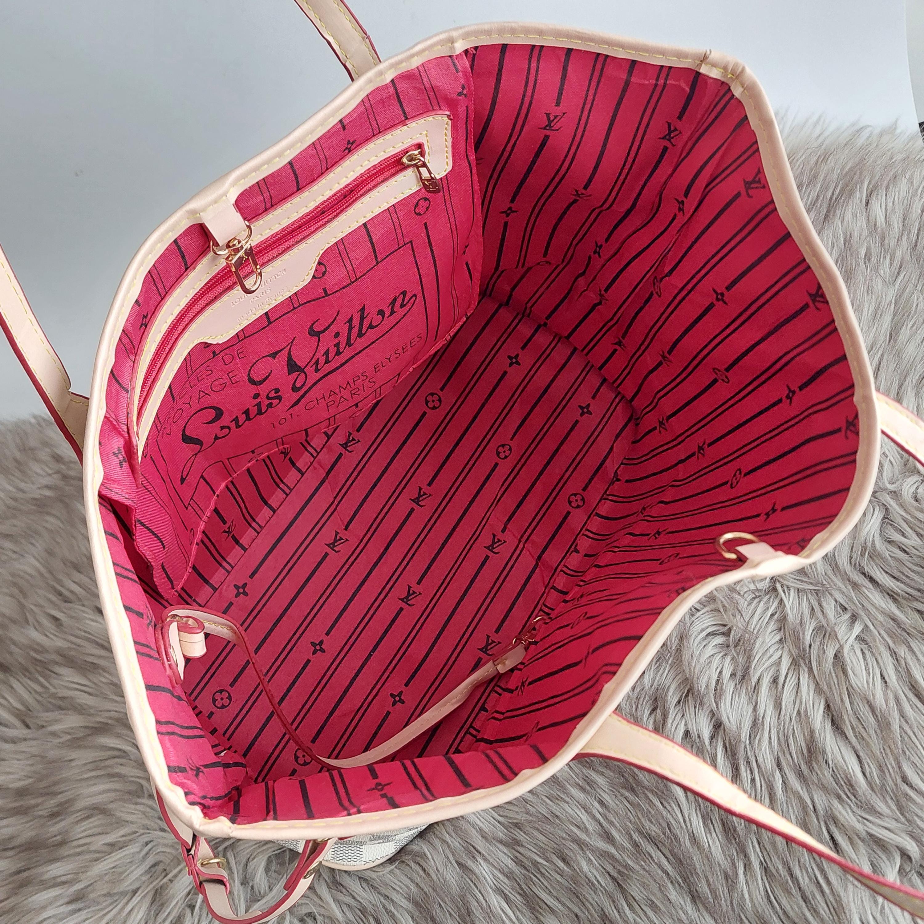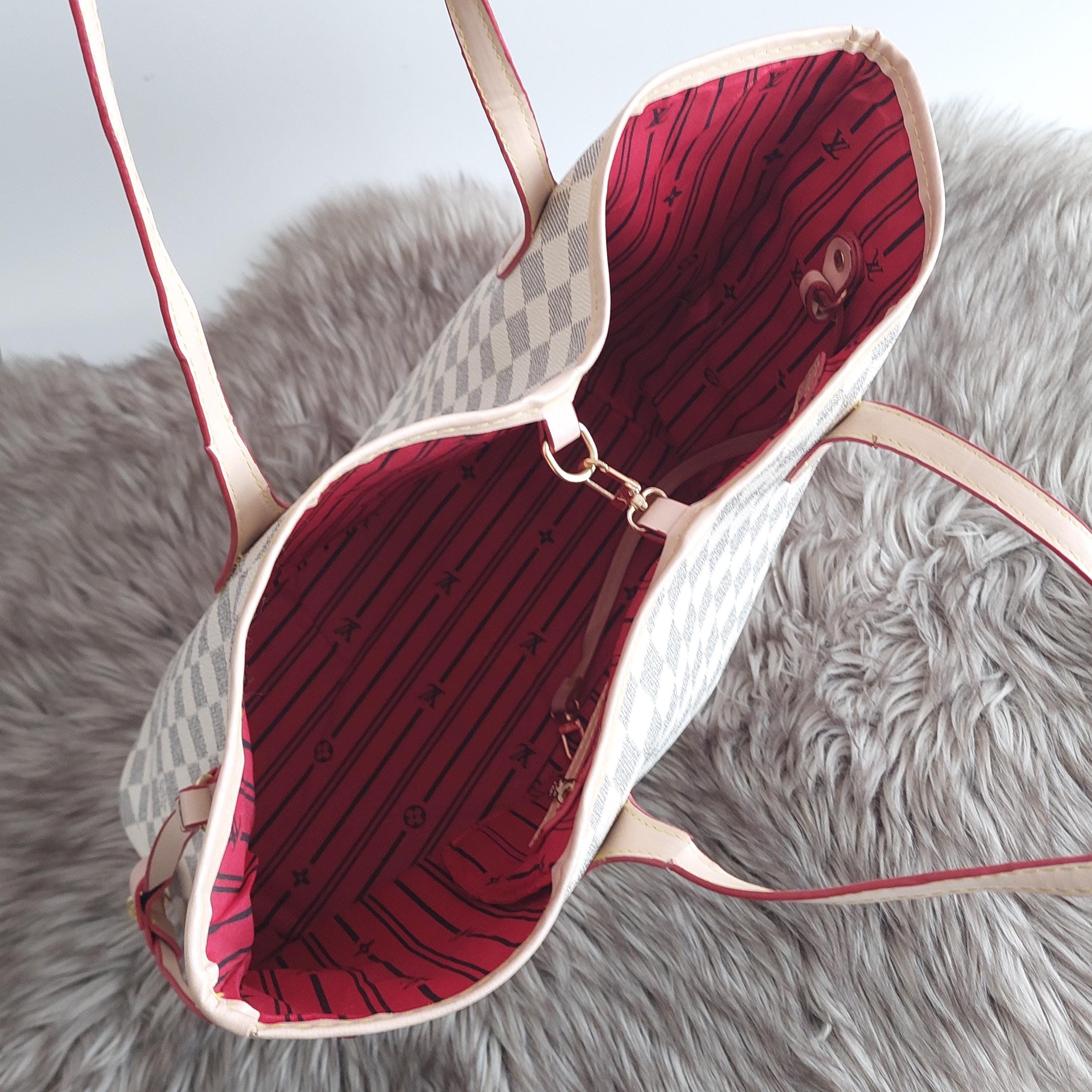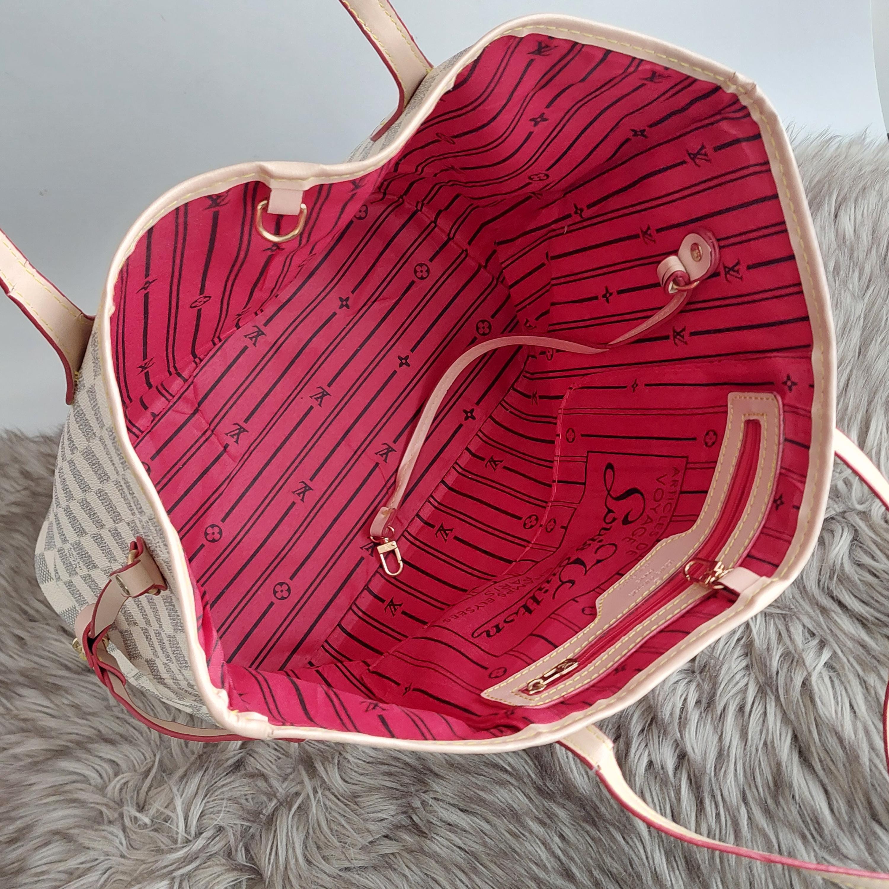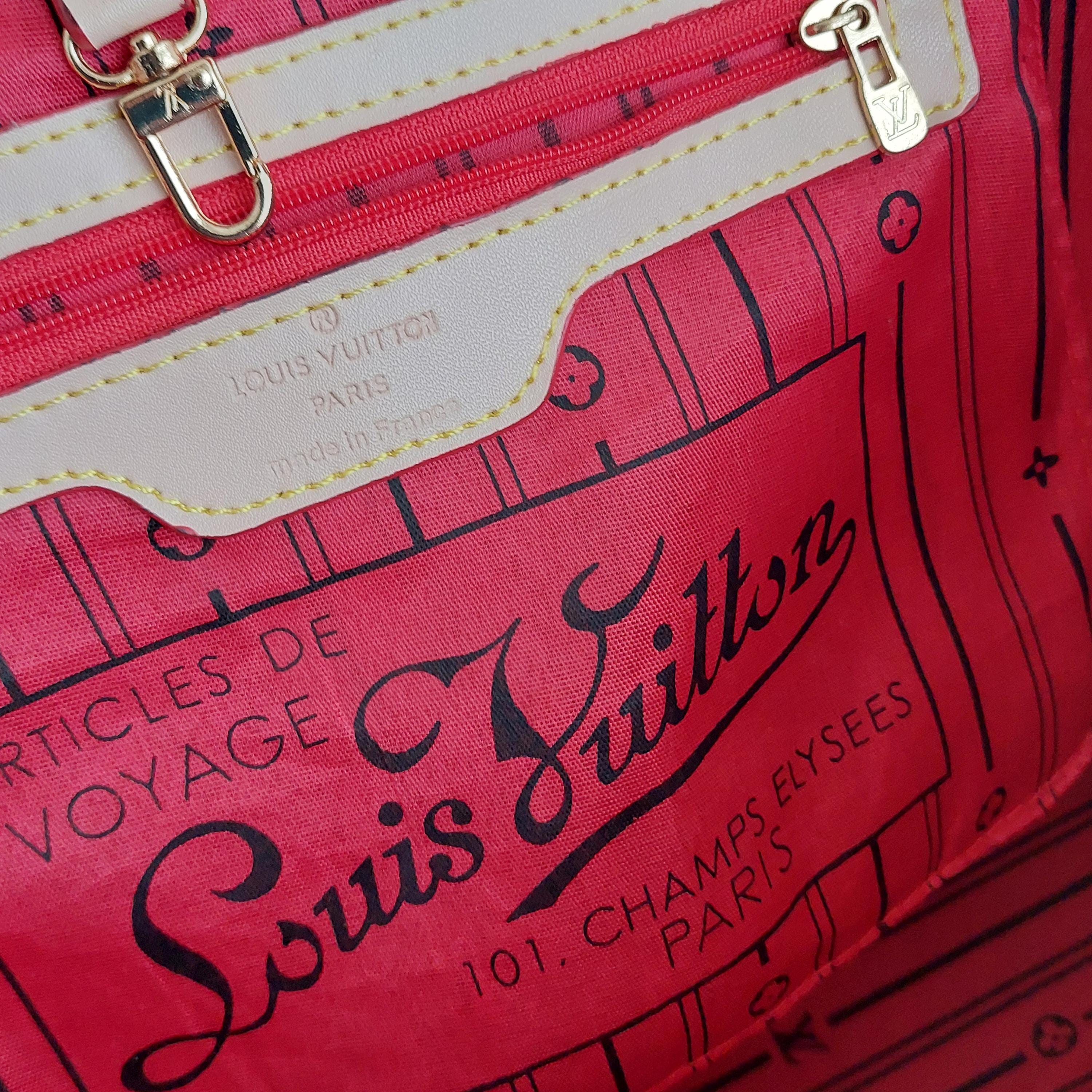 Louis Vuitton Neverfull Shoulder Bag Monogram coated canvas with leather trim. Lined in colorful red & black fabric. One zippered side-wall pocket. D-ring / hook top closure. Fits: 9-inch tablet