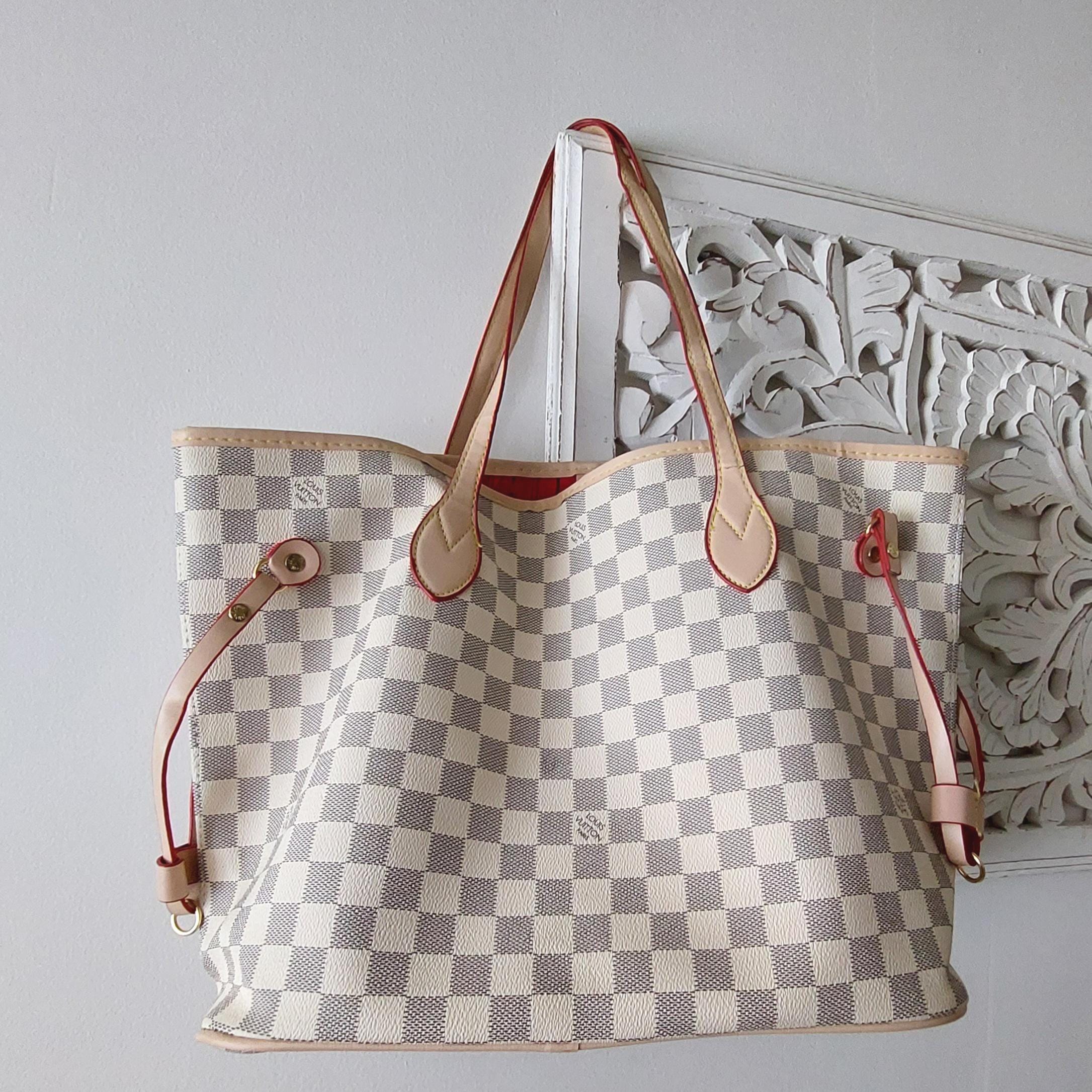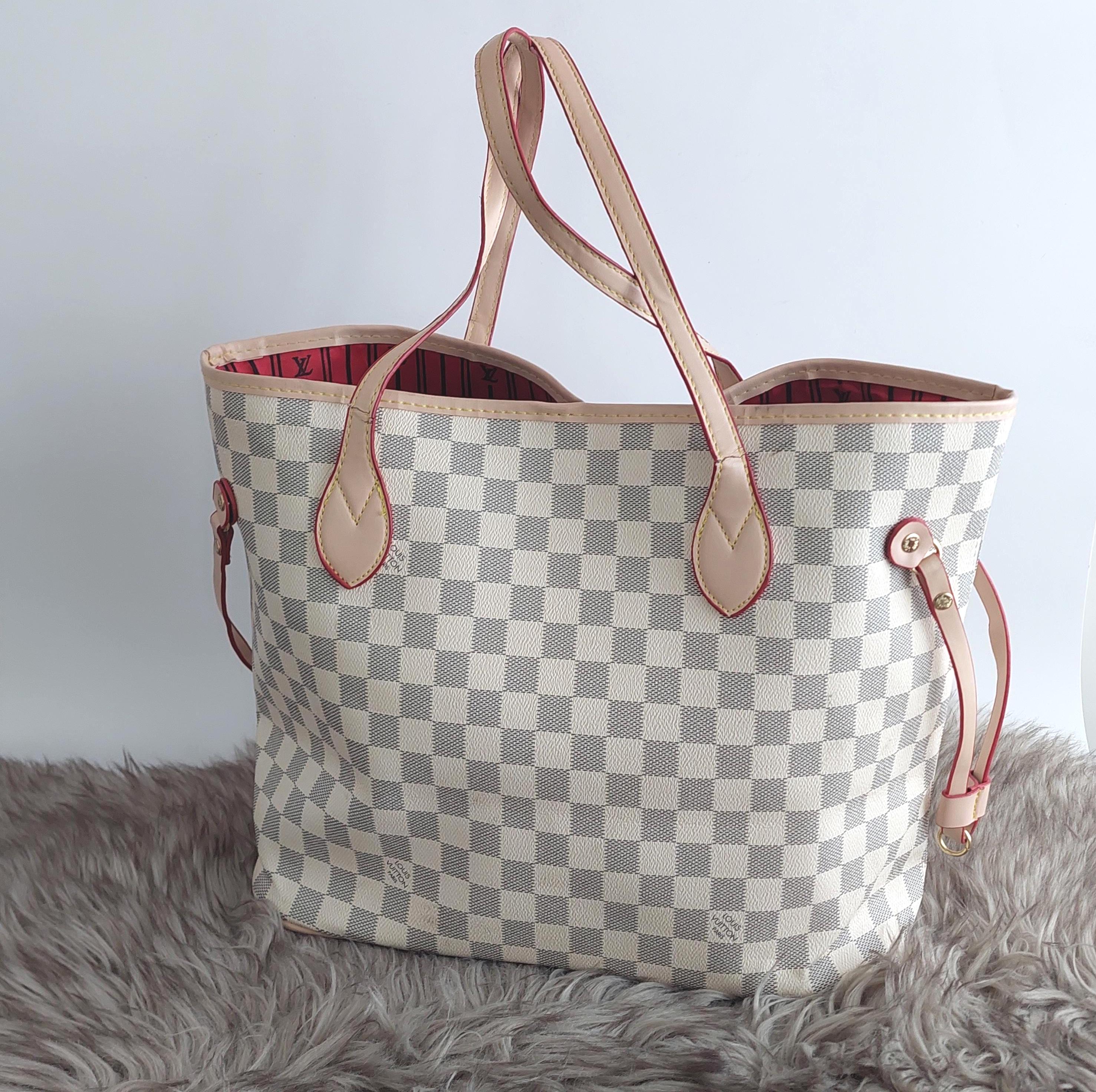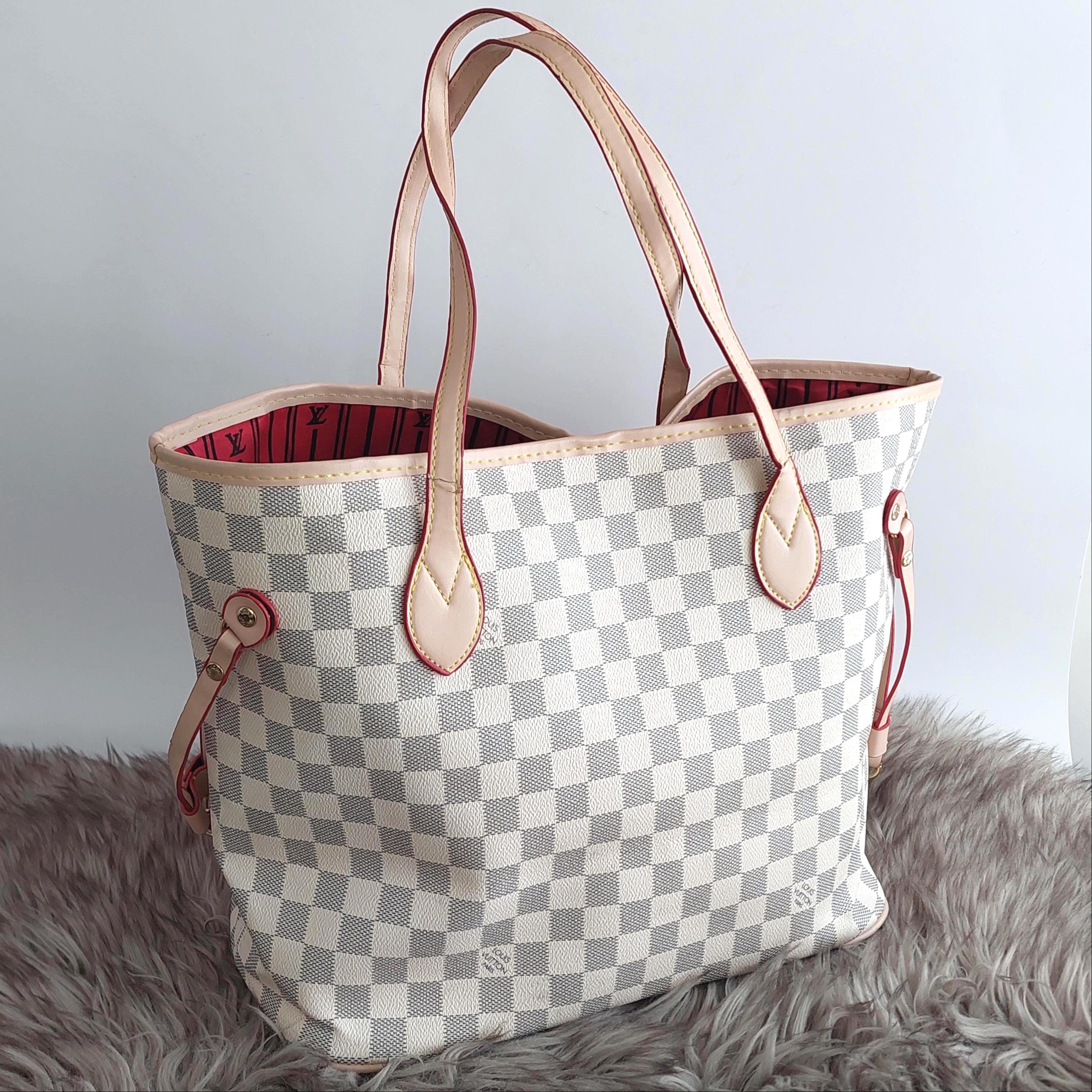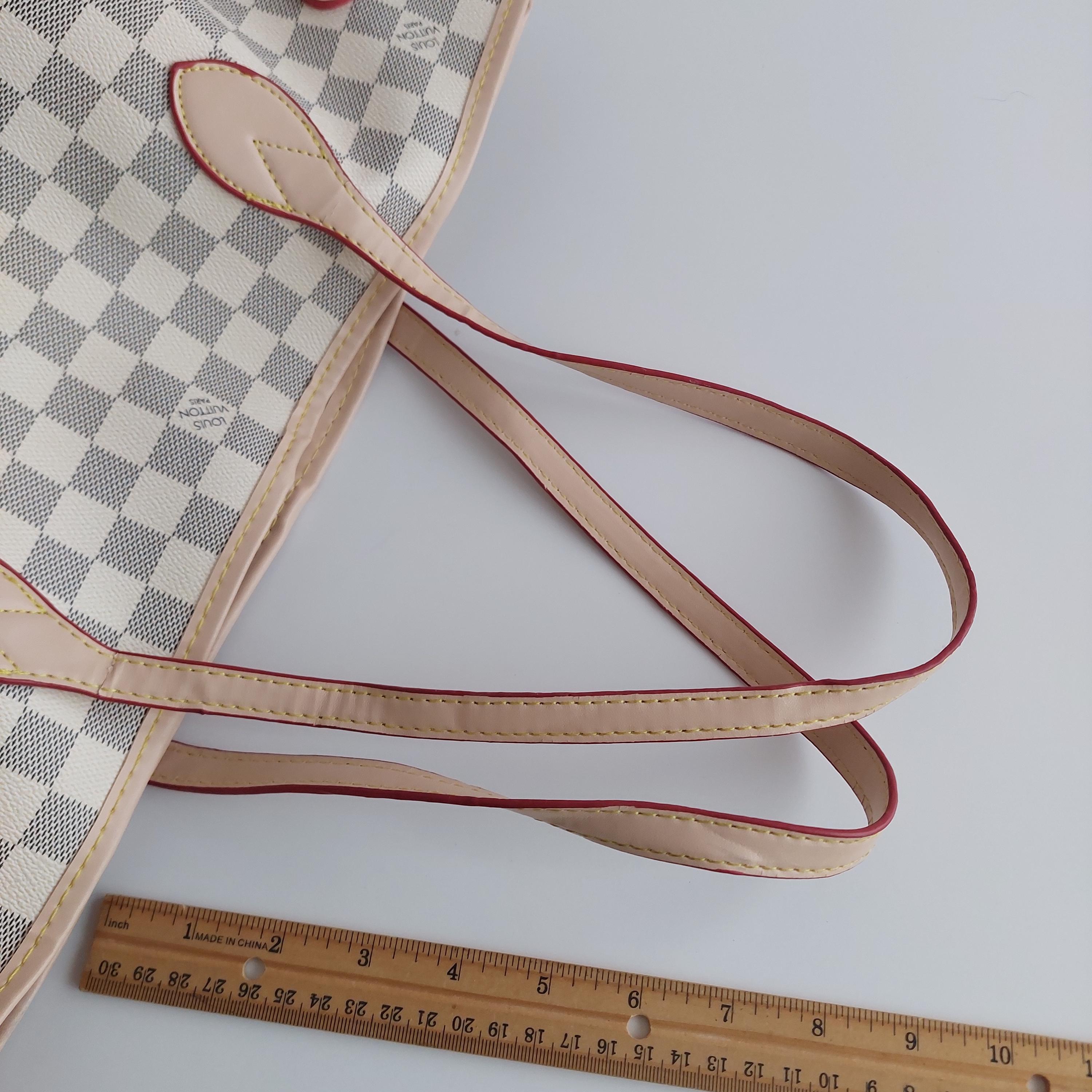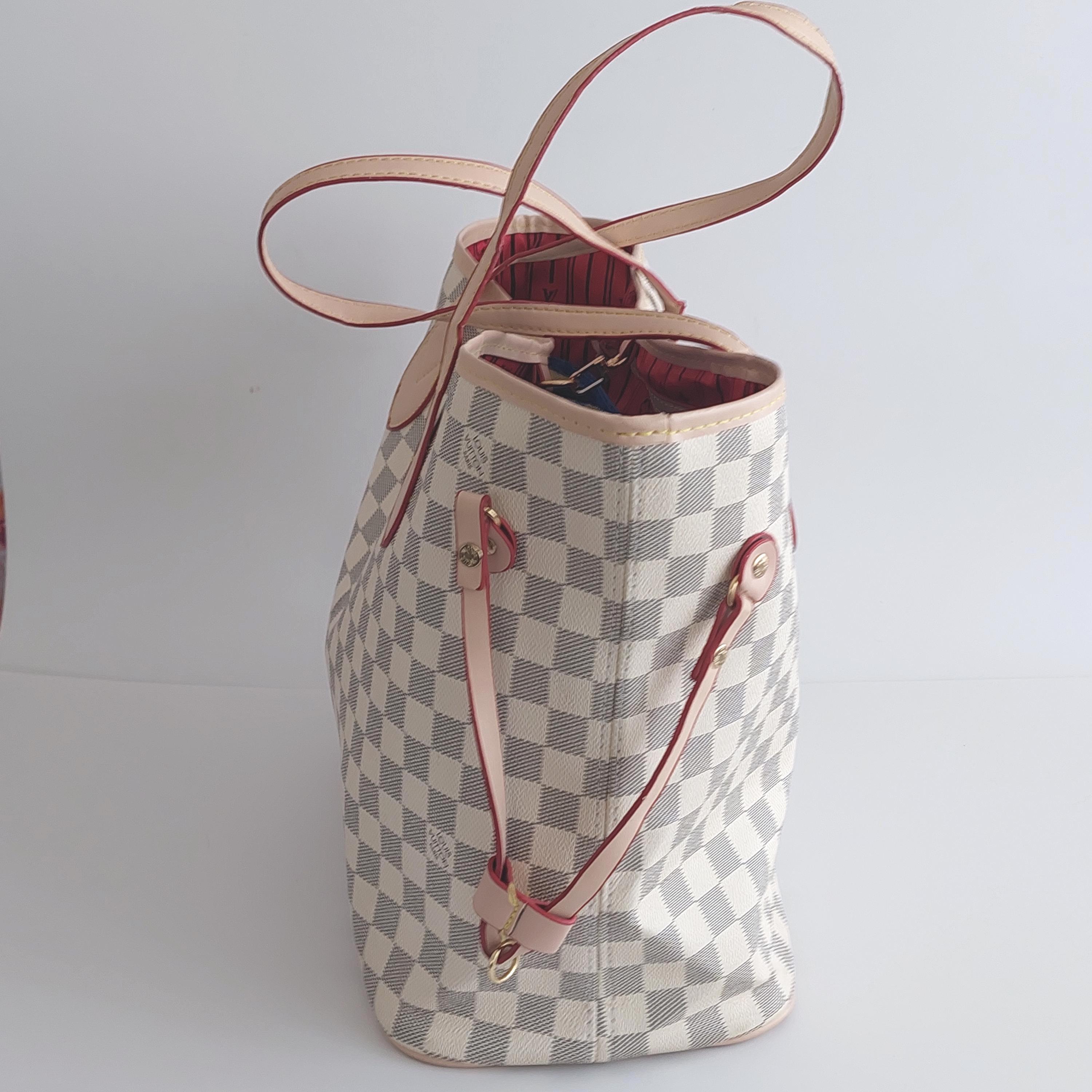 Louis Vuitton Neverfull Shoulder Bag Monogram coated canvas with leather trim. Lined in colorful red & black fabric. One zippered side-wall pocket. D-ring / hook top closure. Fits: 9-inch tablet