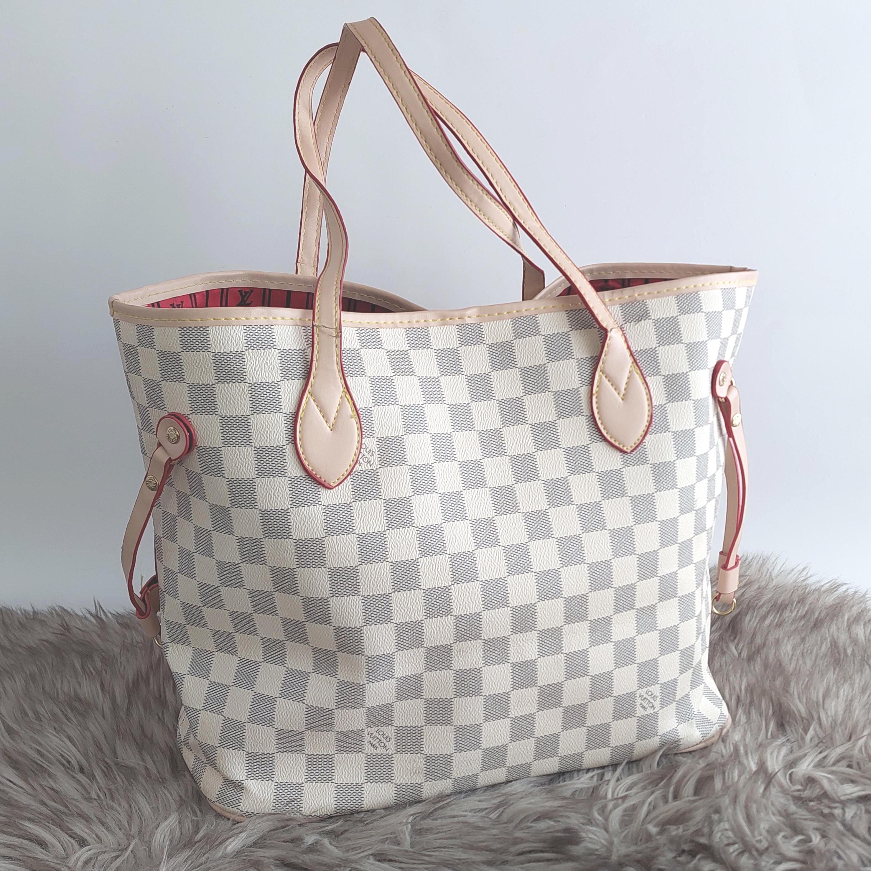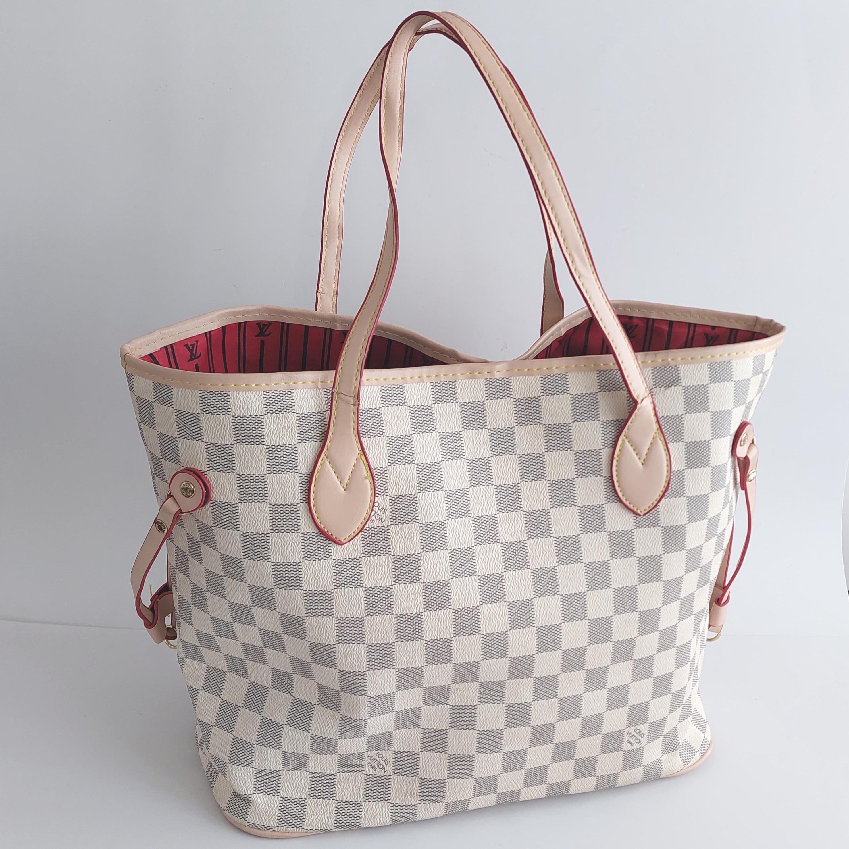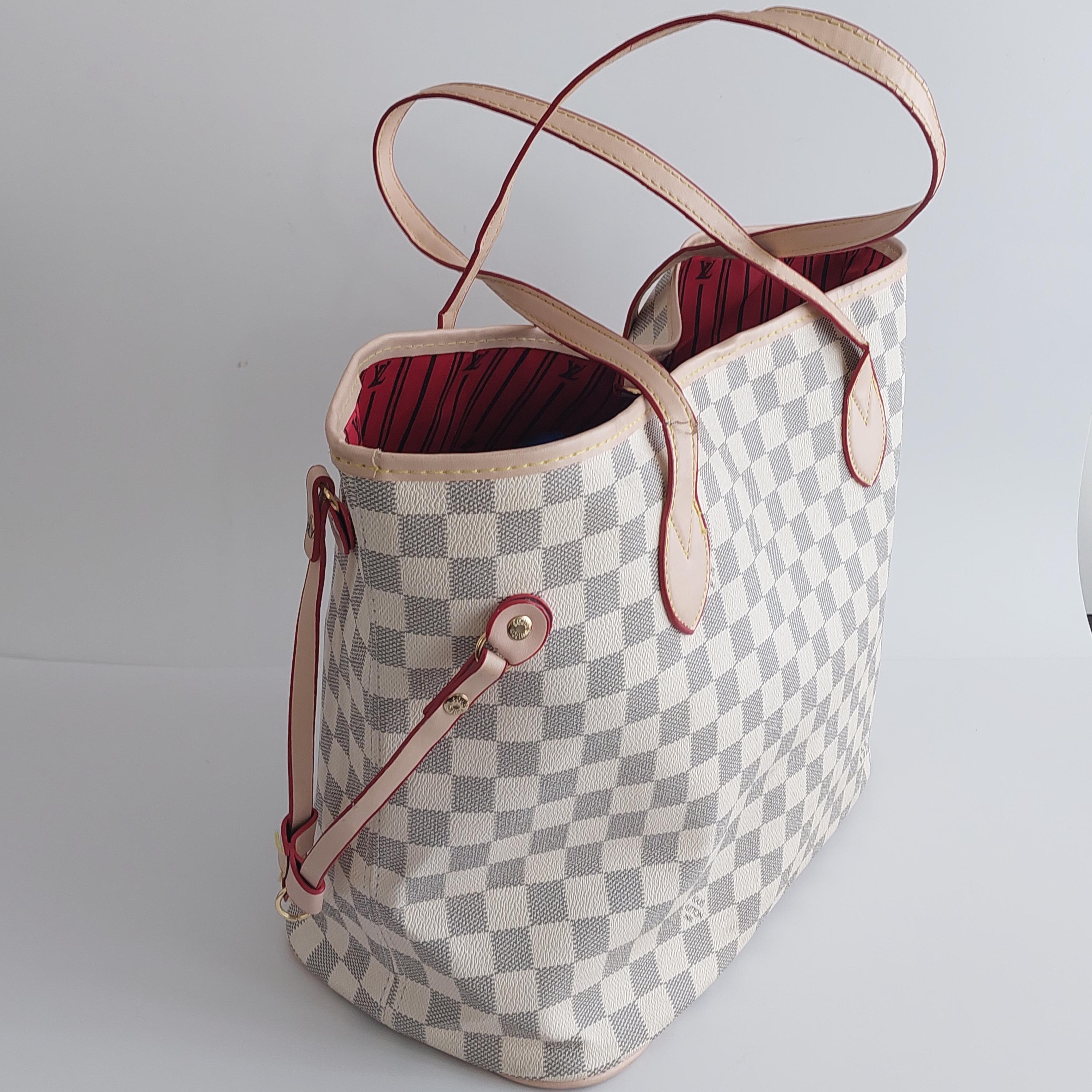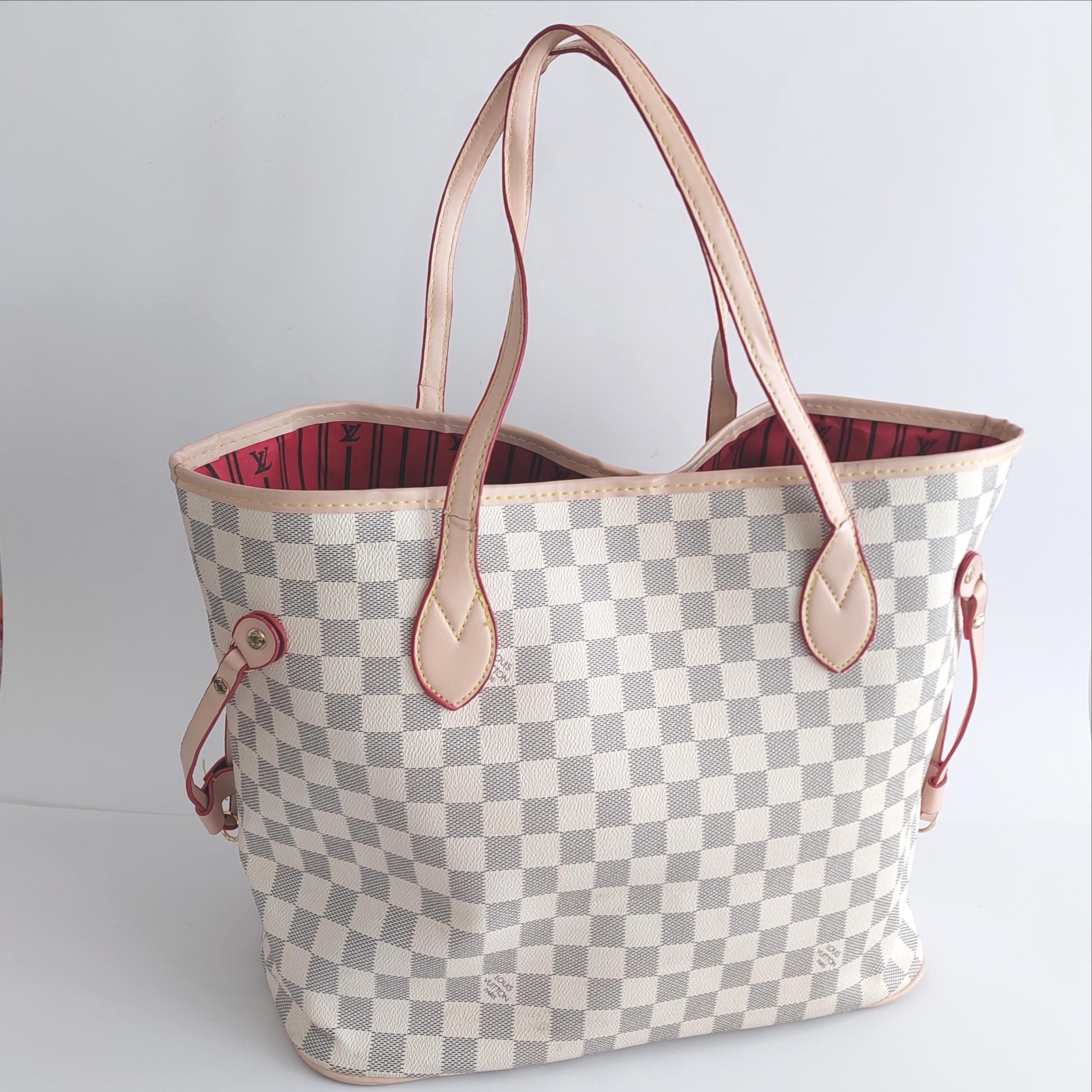 Louis Vuitton Neverfull Shoulder Bag Monogram coated canvas with leather trim. Lined in colorful red & black fabric. One zippered side-wall pocket. D-ring / hook top closure. Fits: 9-inch tablet