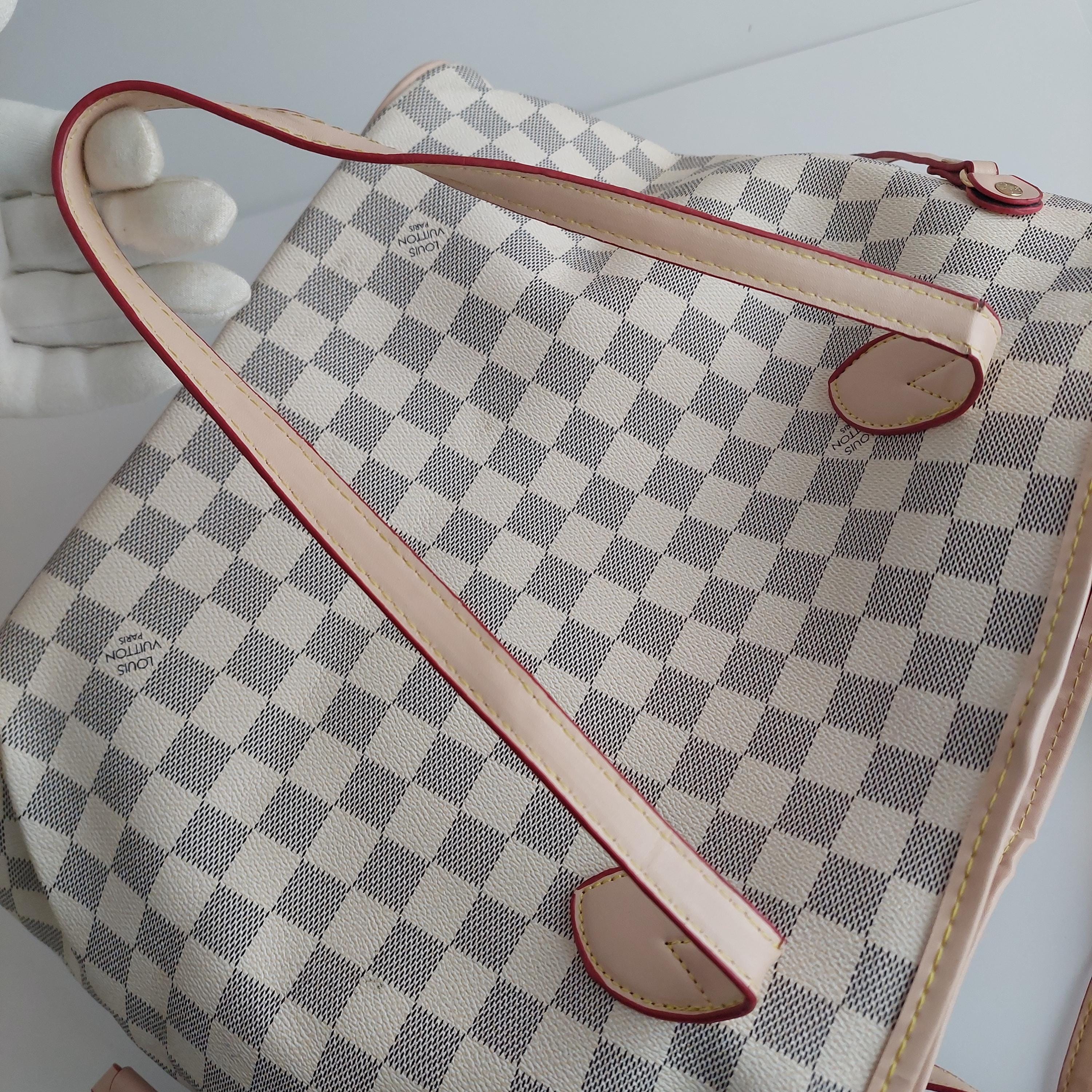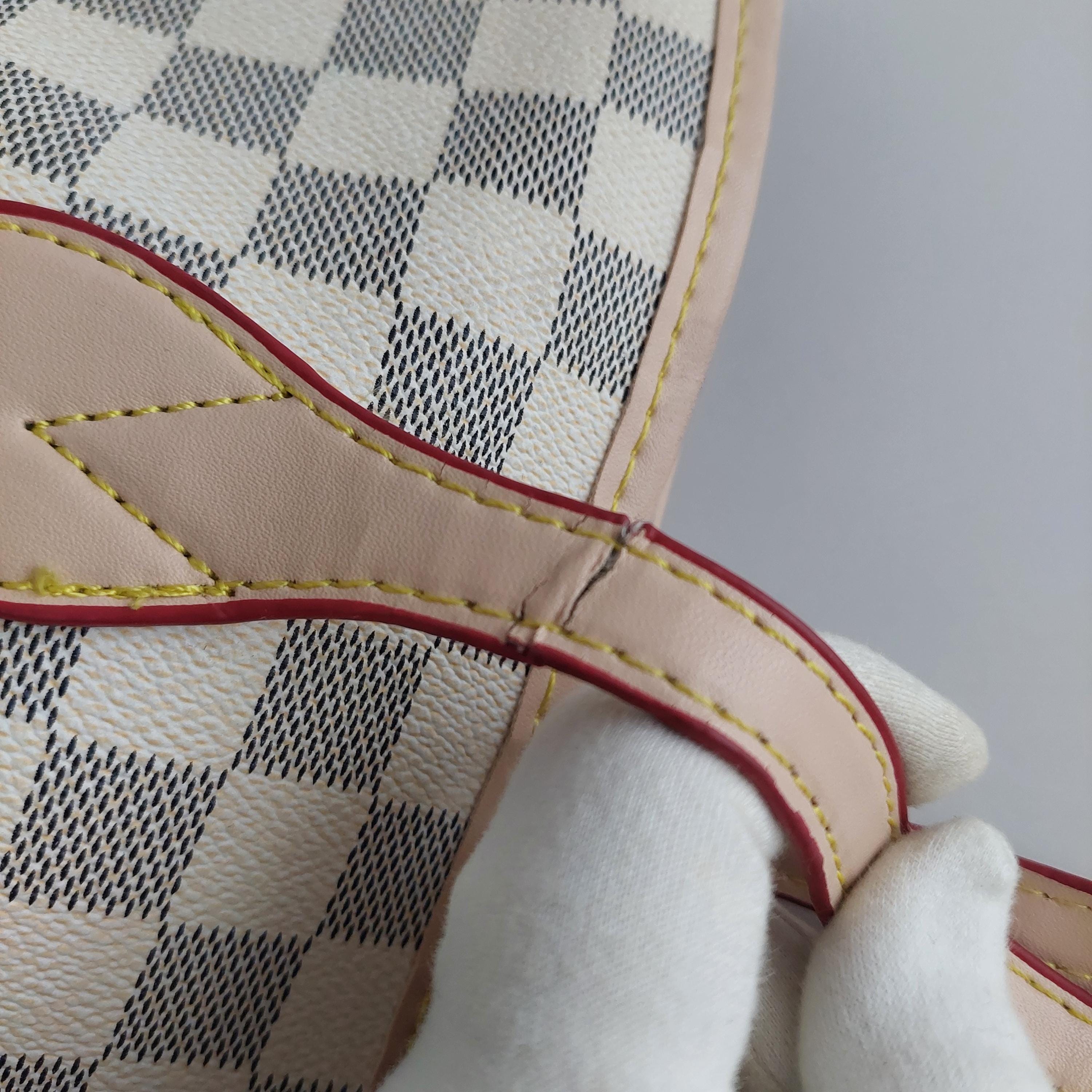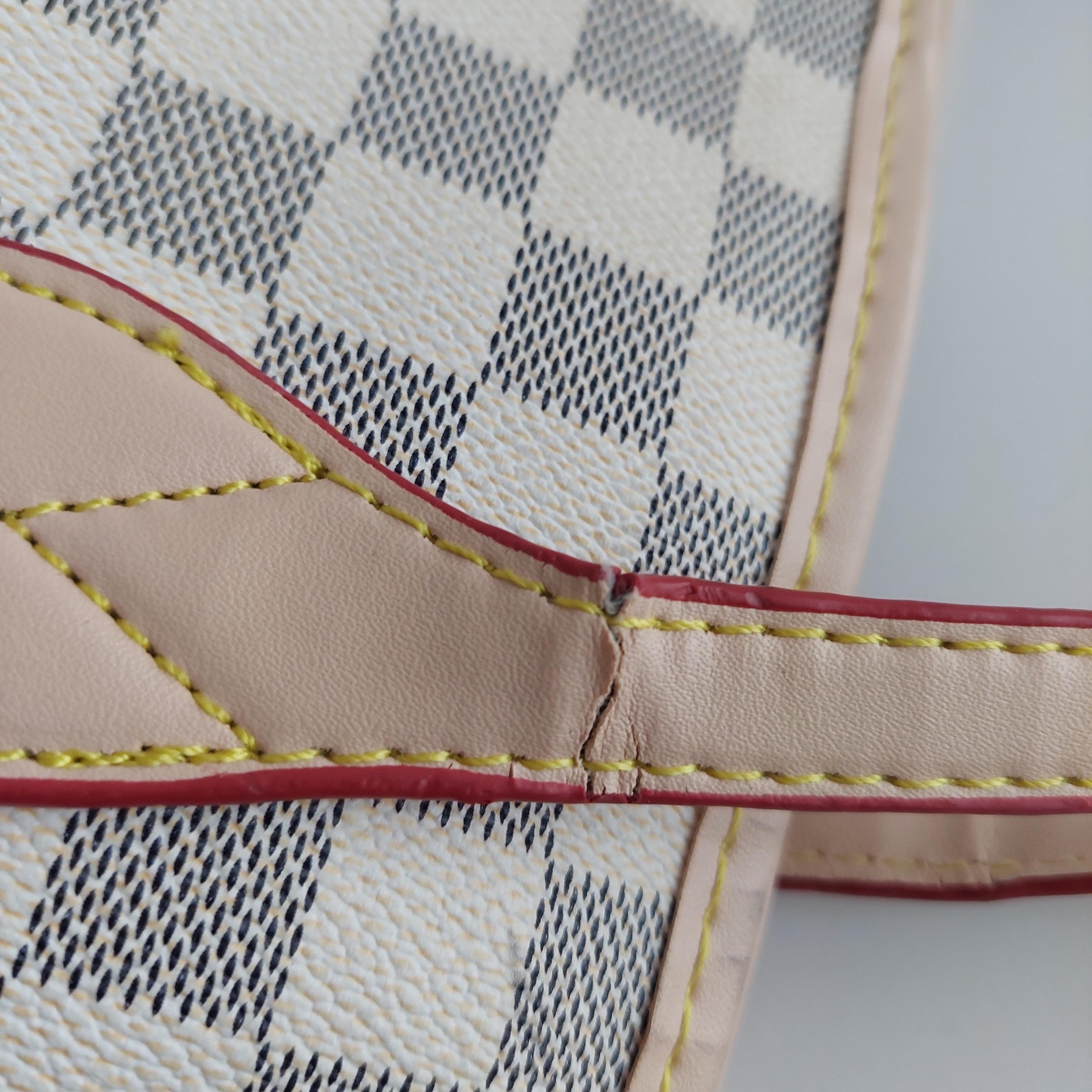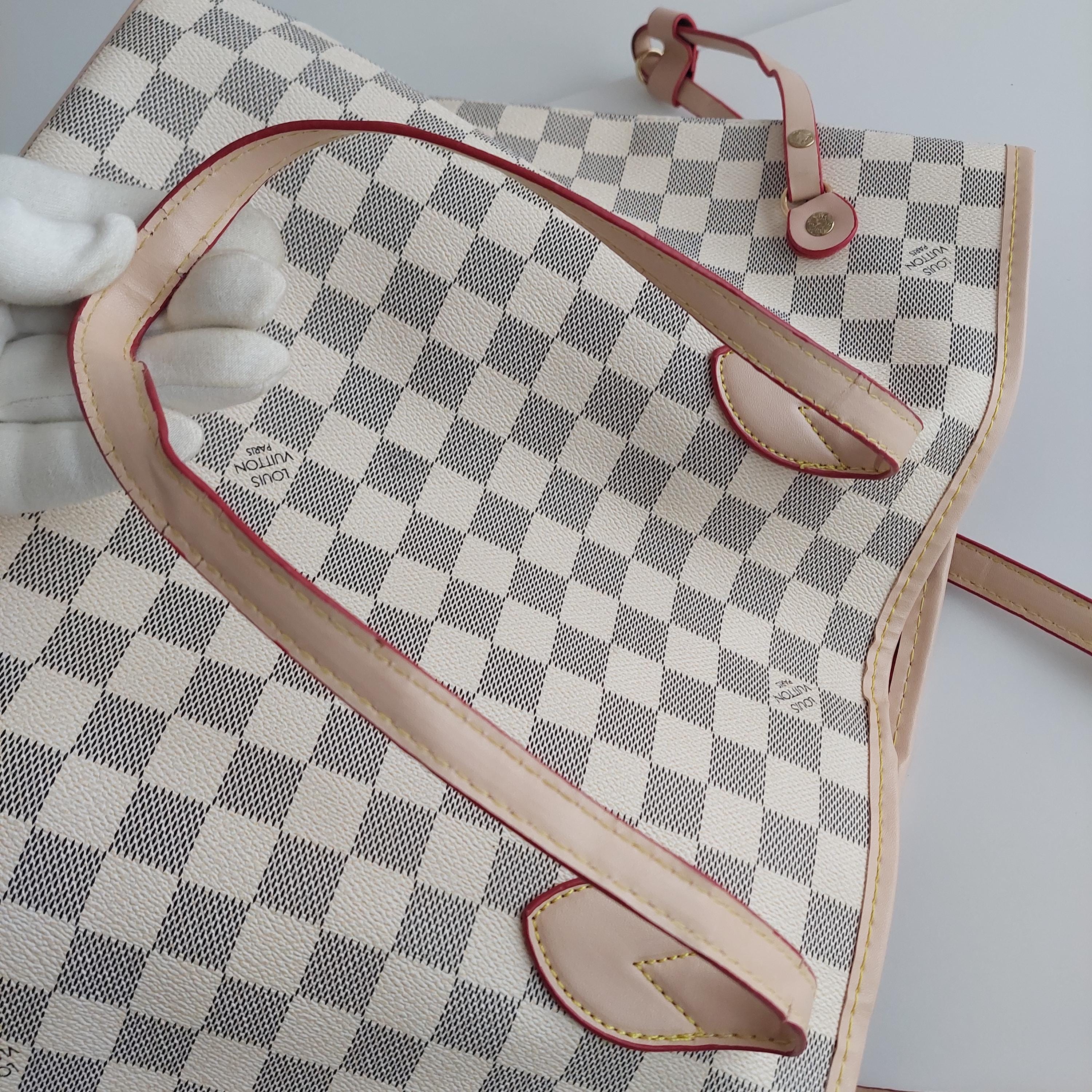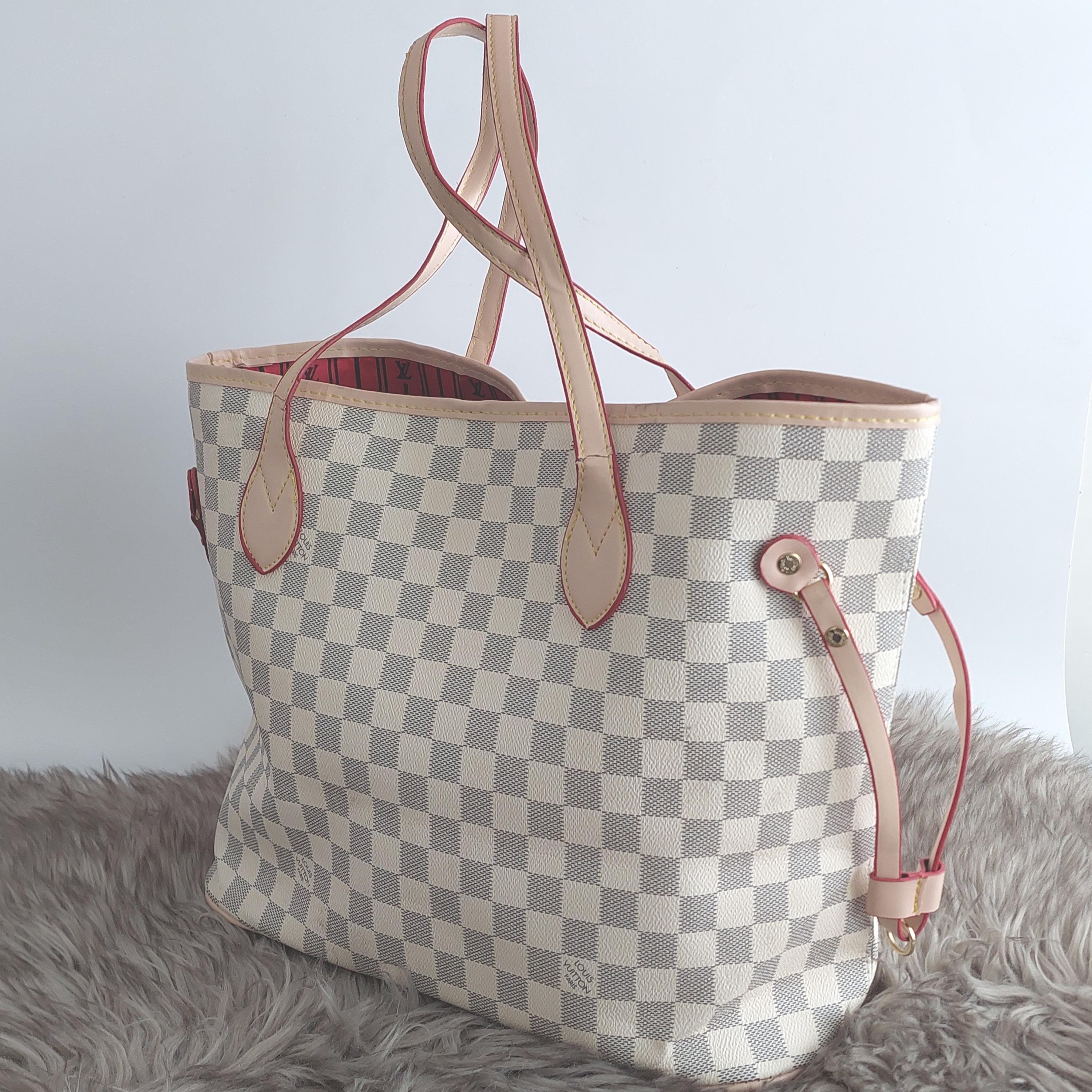 Louis Vuitton Neverfull Shoulder Bag Monogram coated canvas with leather trim. Lined in colorful red & black fabric. One zippered side-wall pocket. D-ring / hook top closure. Fits: 9-inch tablet