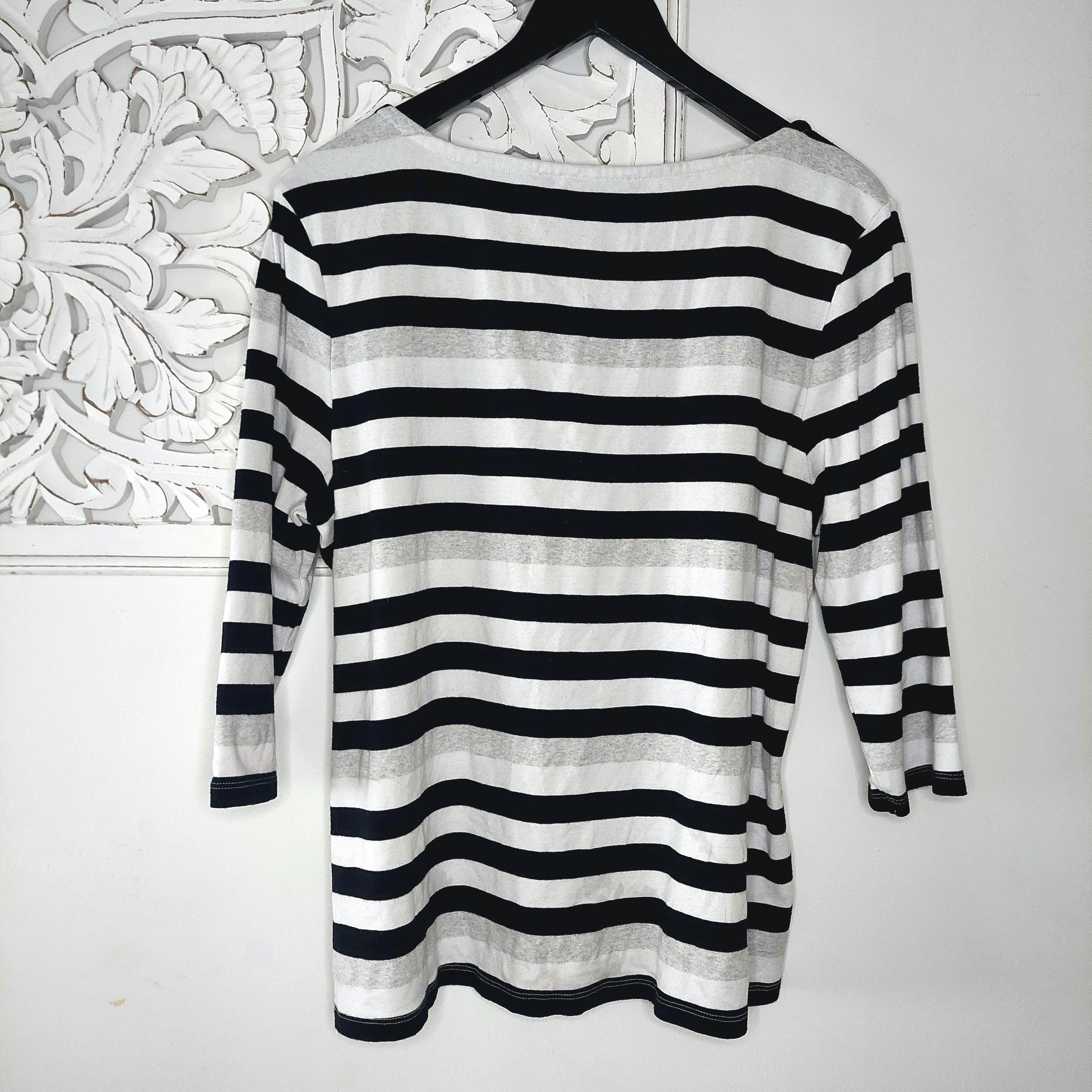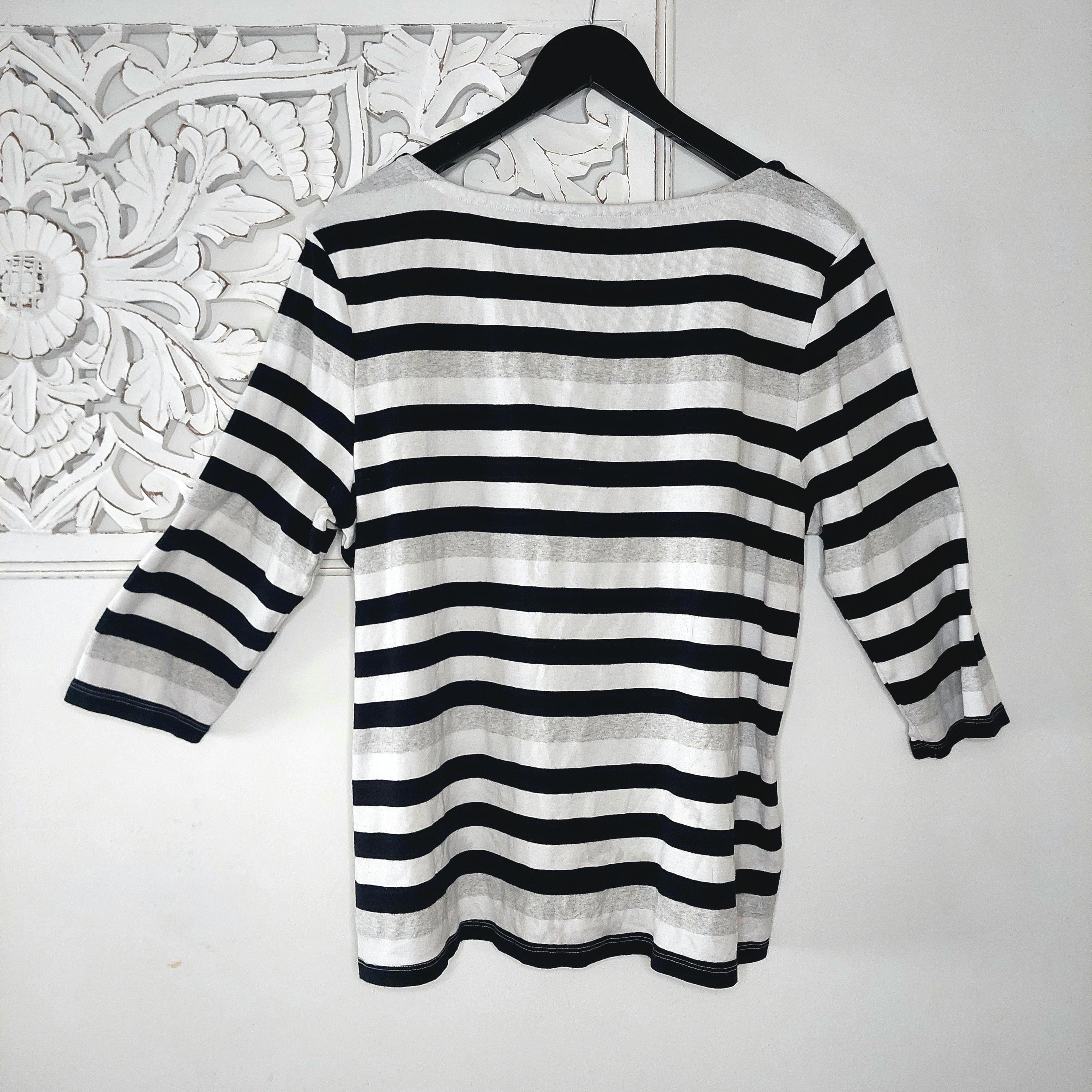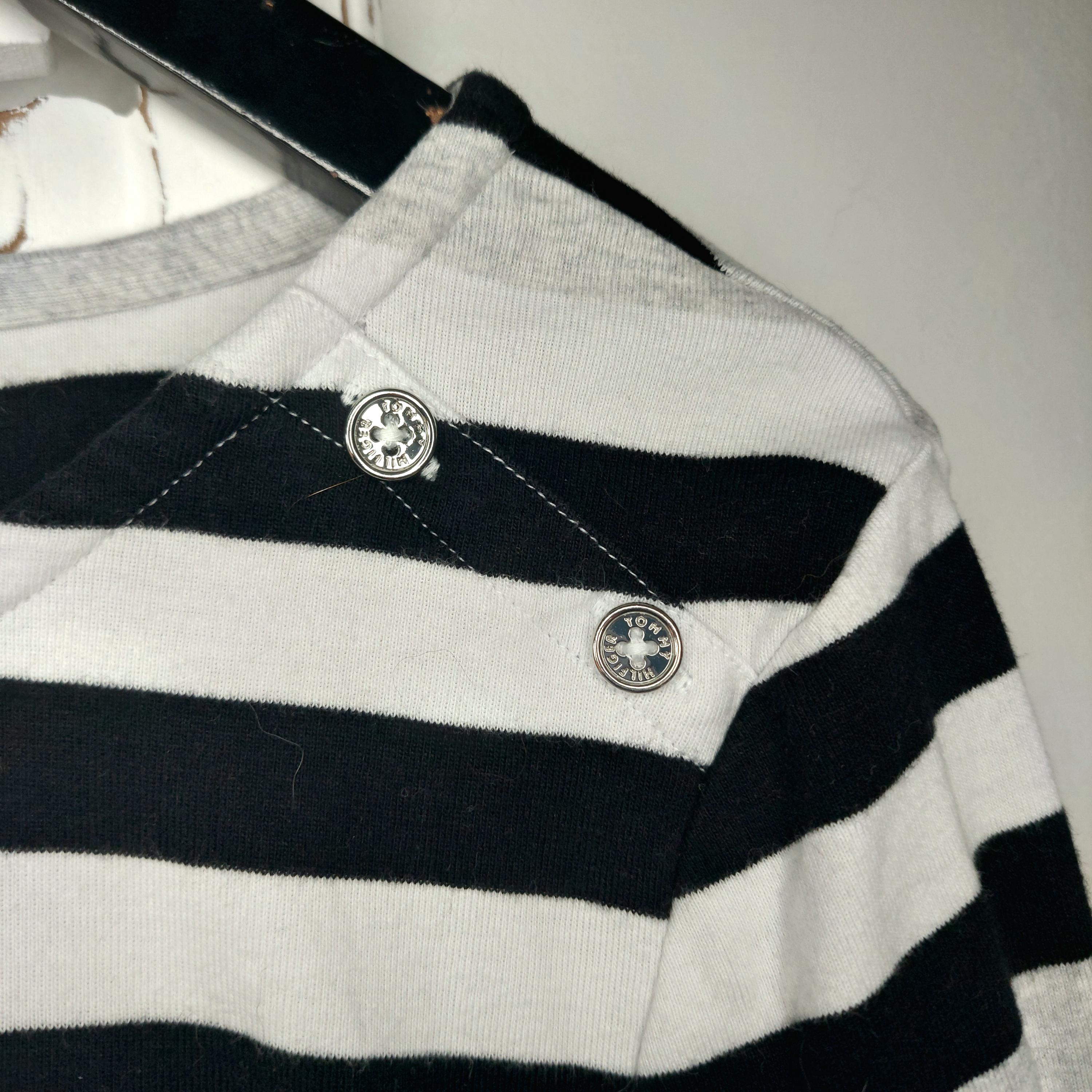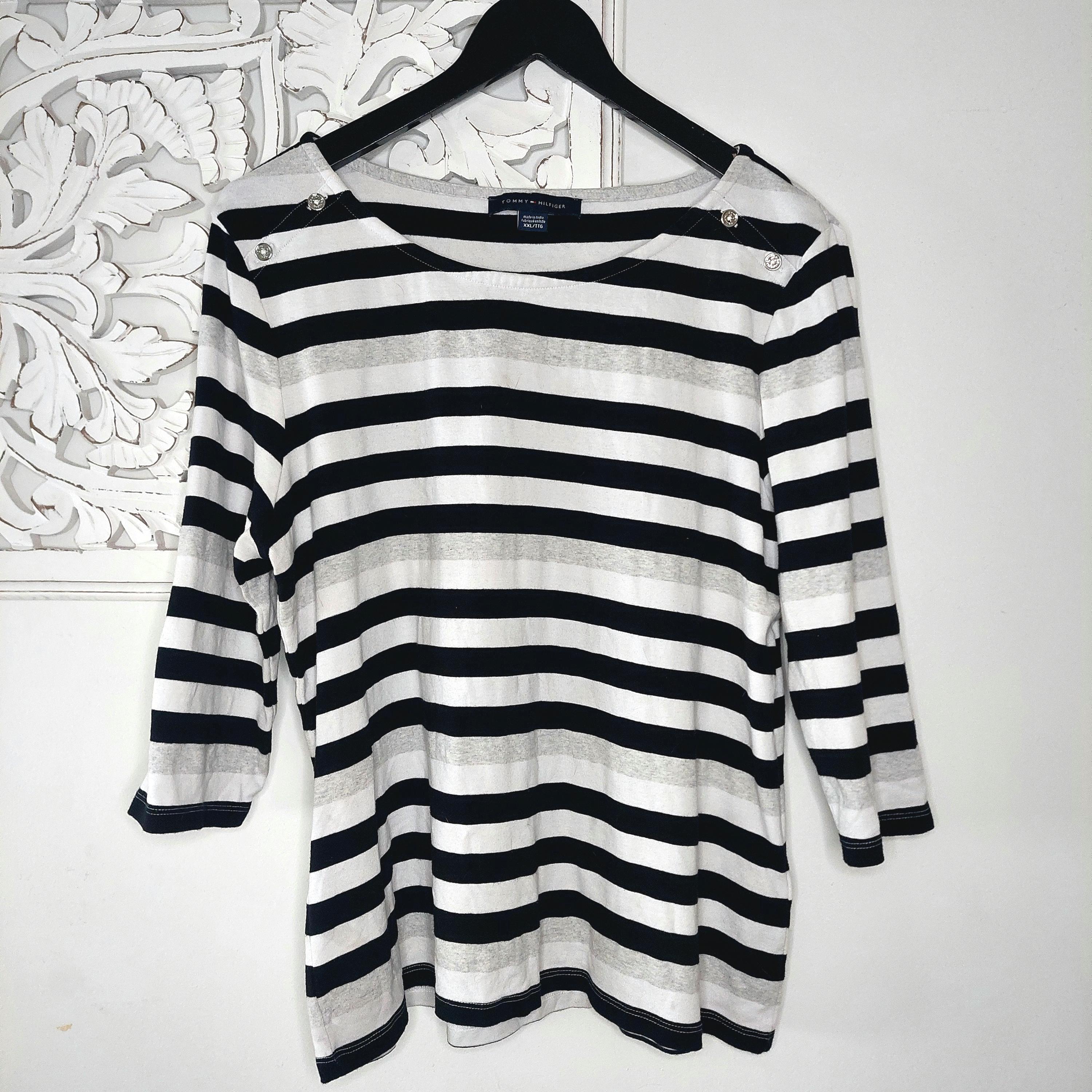 Vintage Tommy Hilfiger 3/4 sleeve 100% cotton top with black, white and gray stripes and decorative buttons on the shoulders.