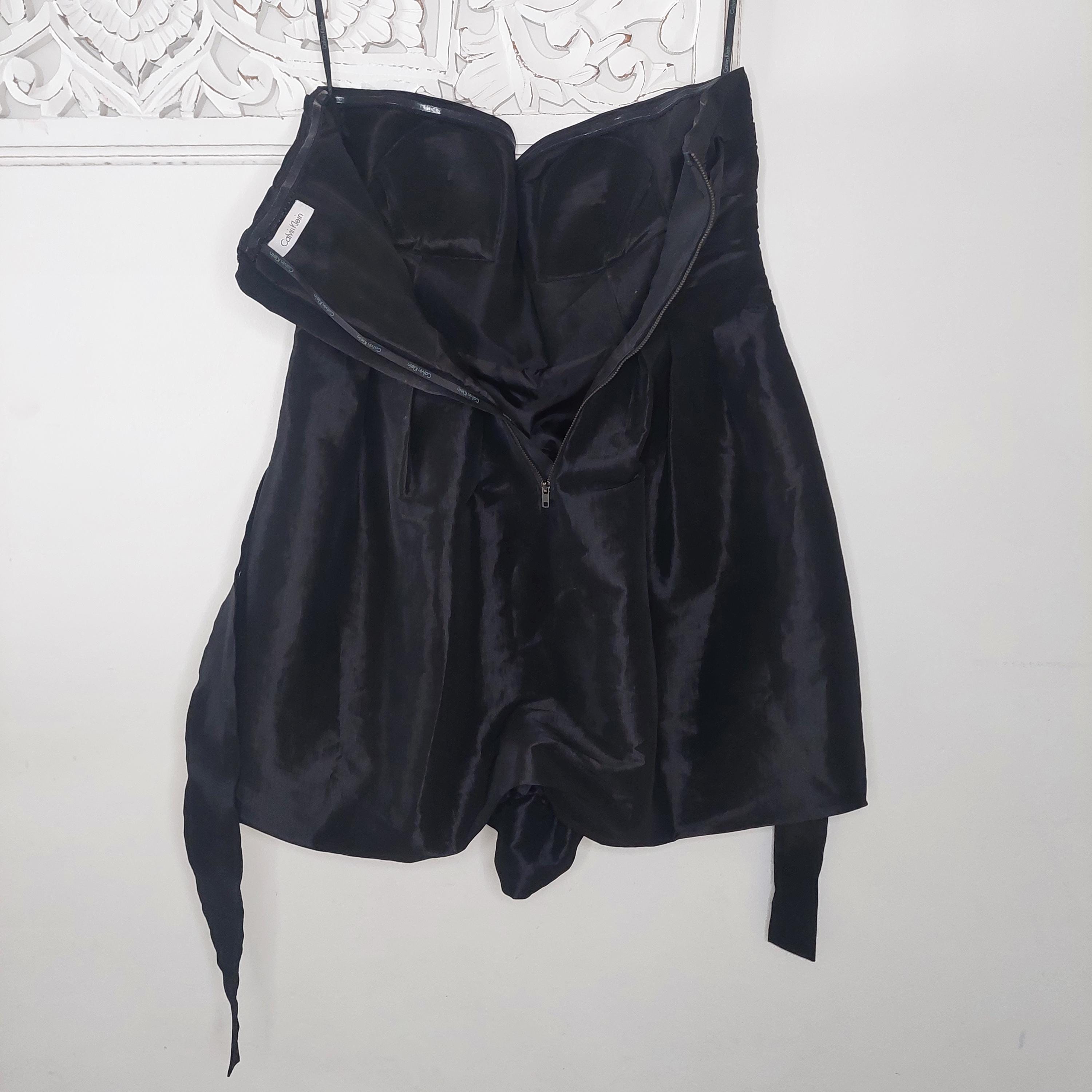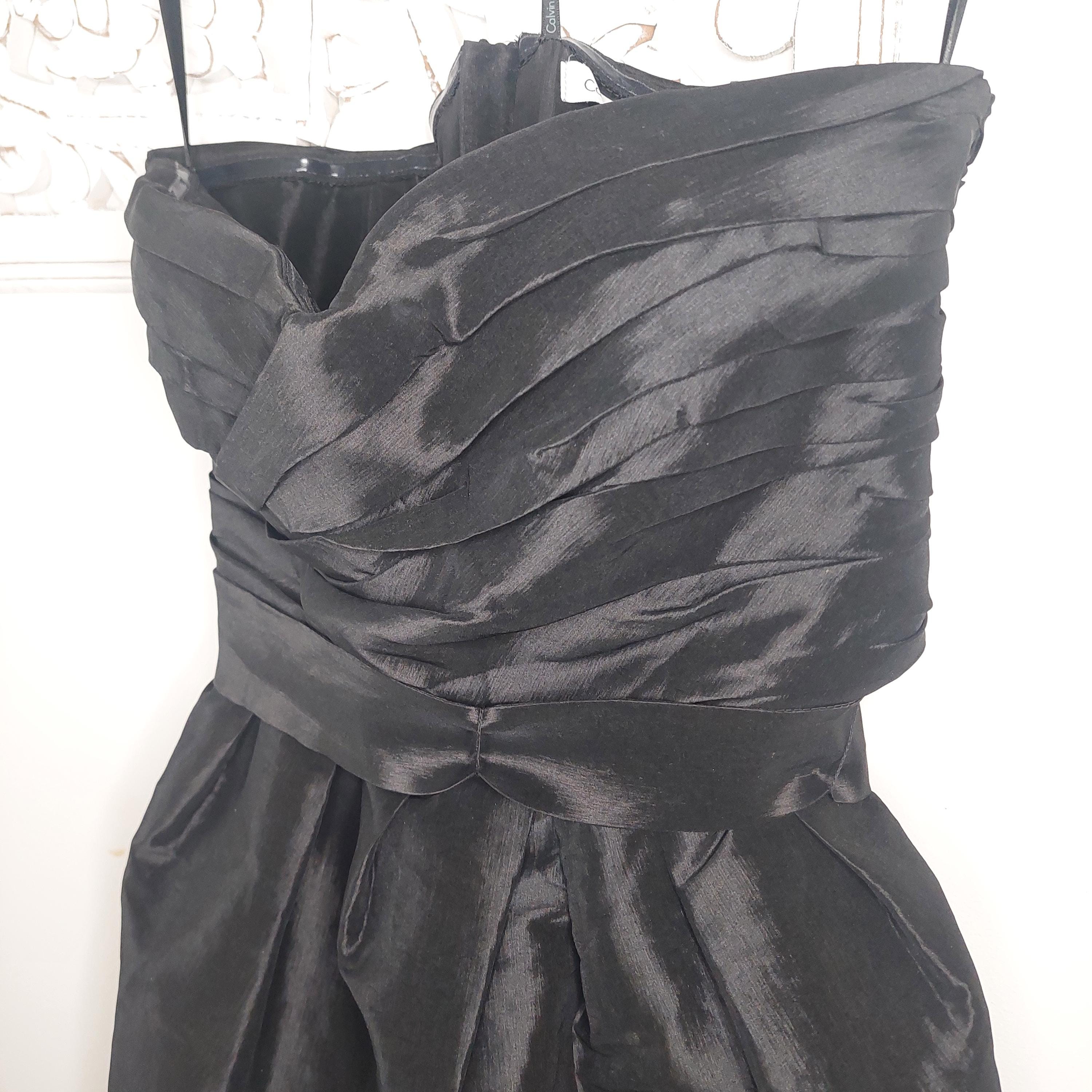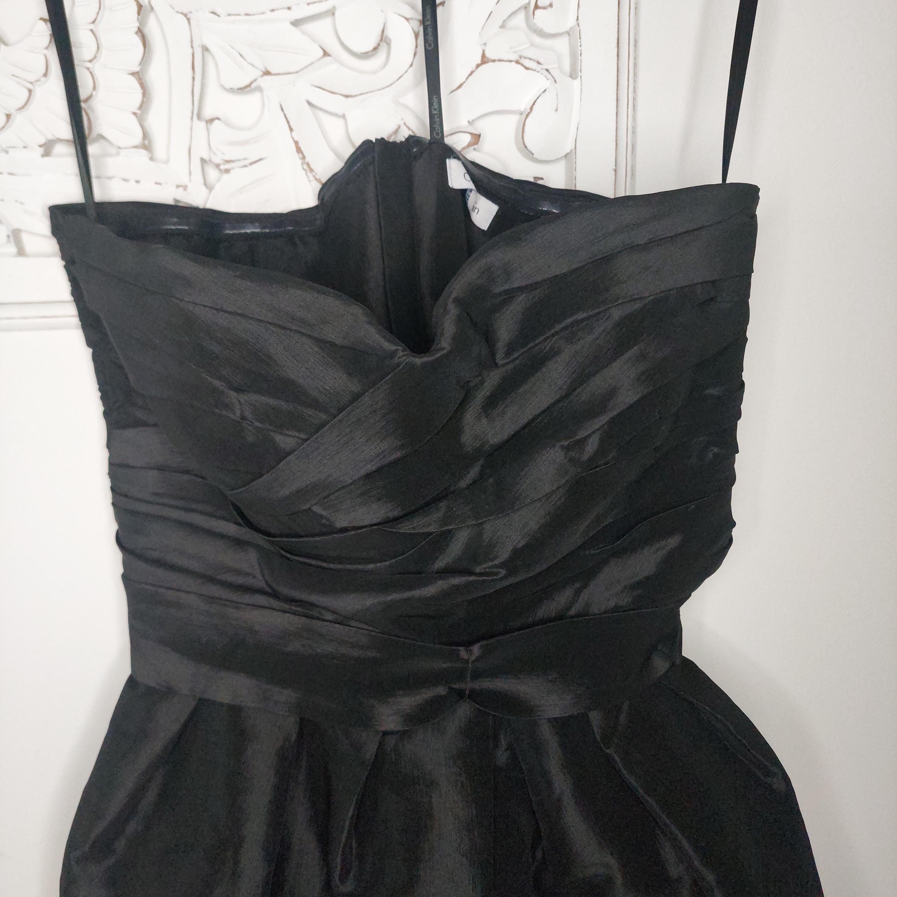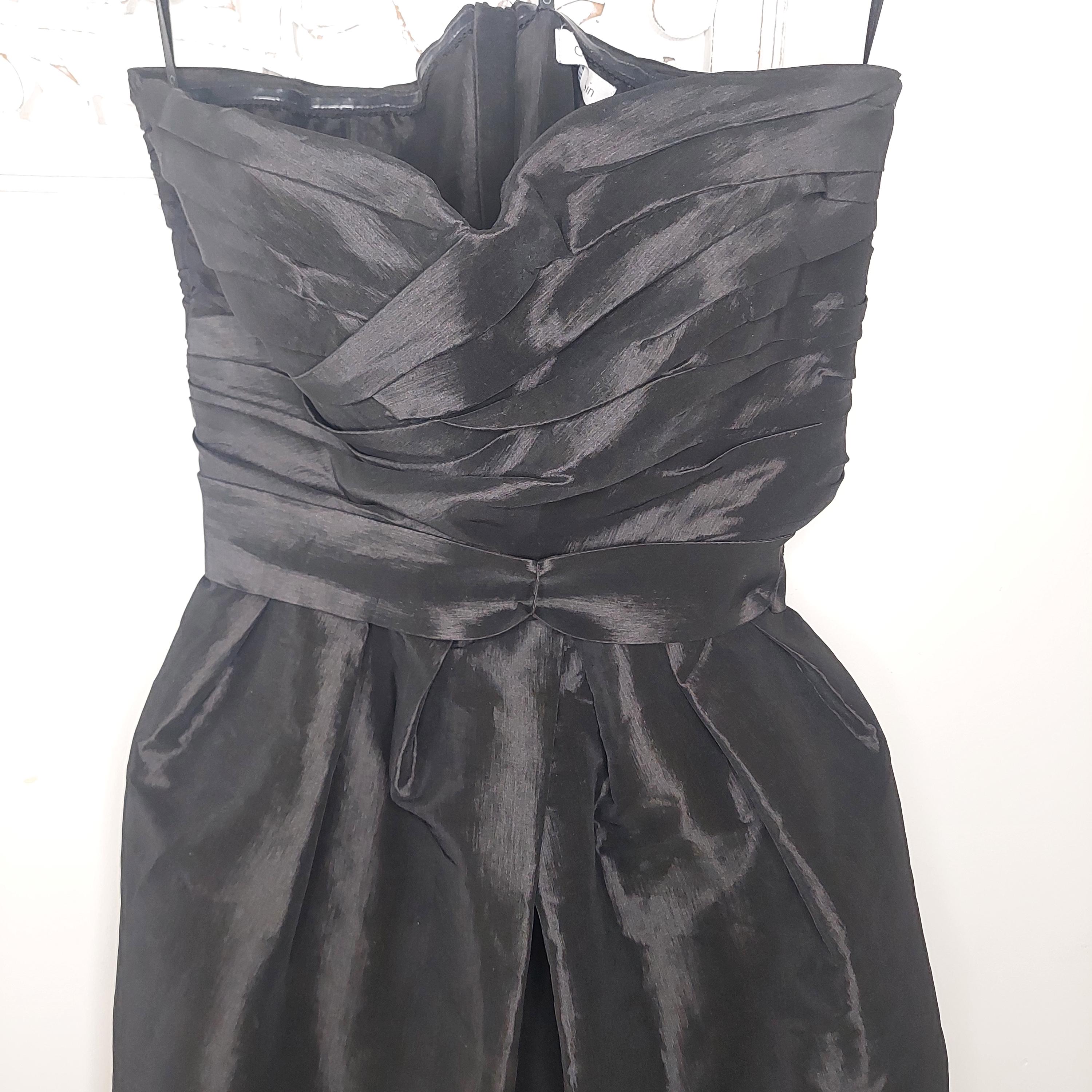 Vintage Calvin Klein strapless black evening dress with crossover sweetheart neckline. Pleated bust and ruched waist with removeable waist band tie. Faux wrap bubble skirt. Zippered back . Size 4