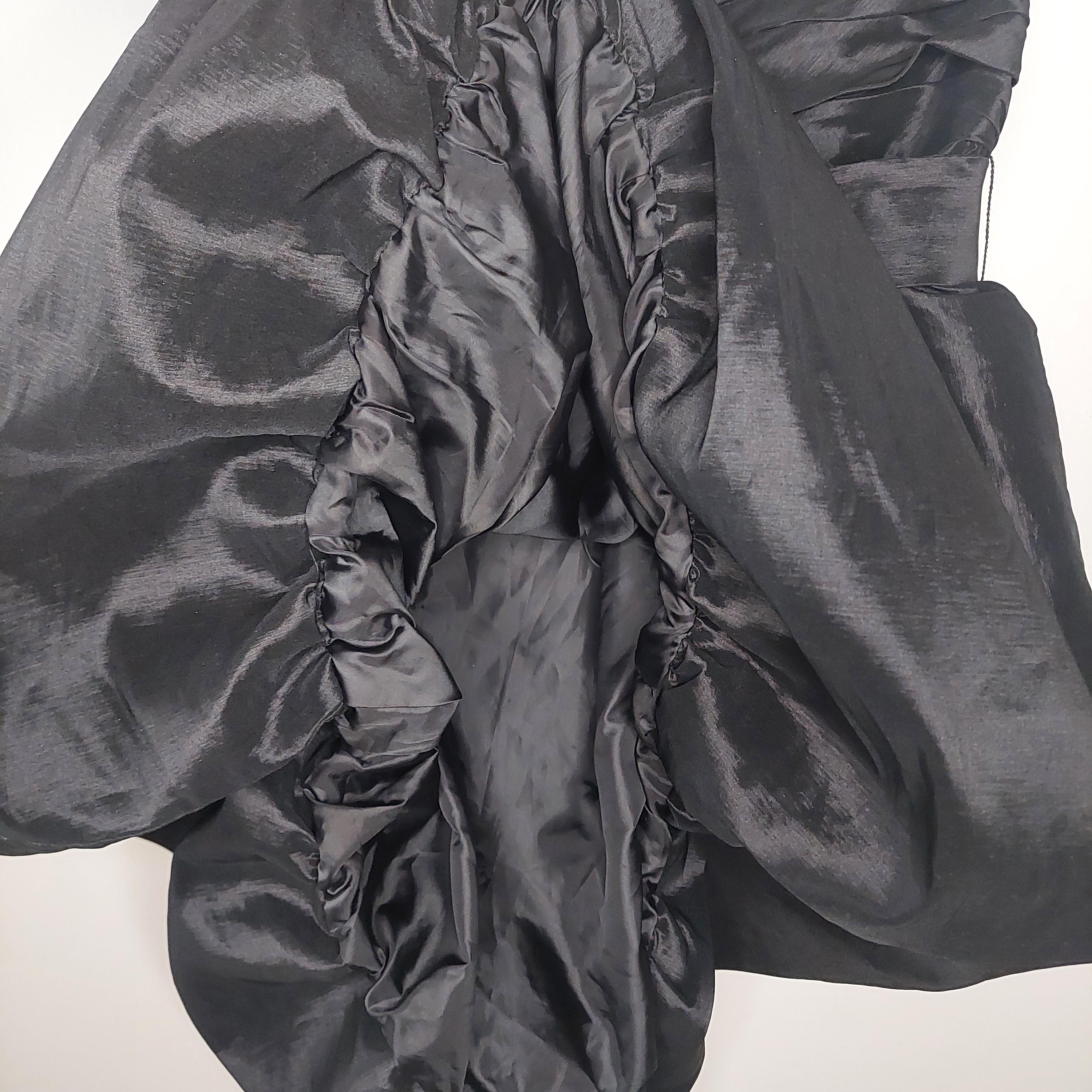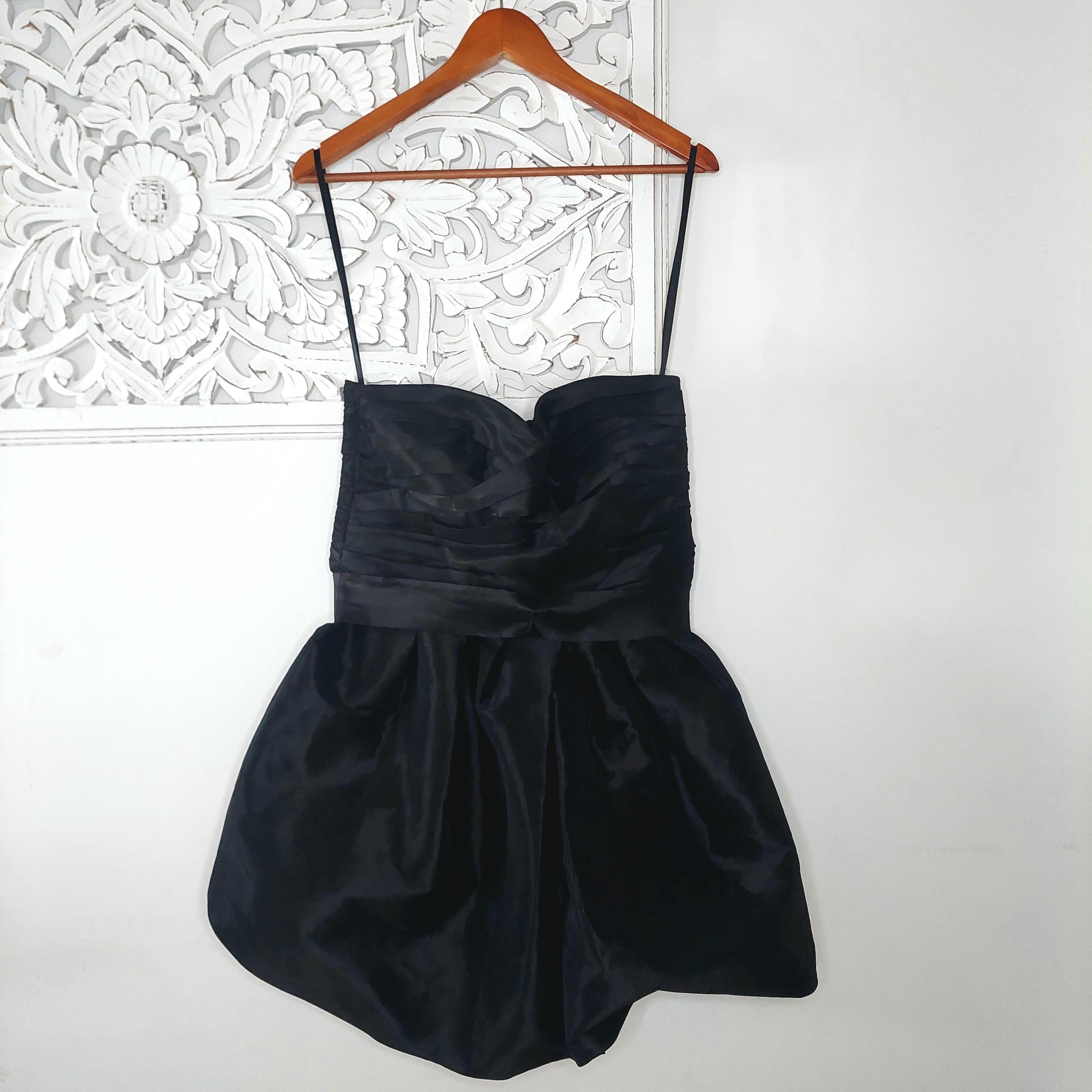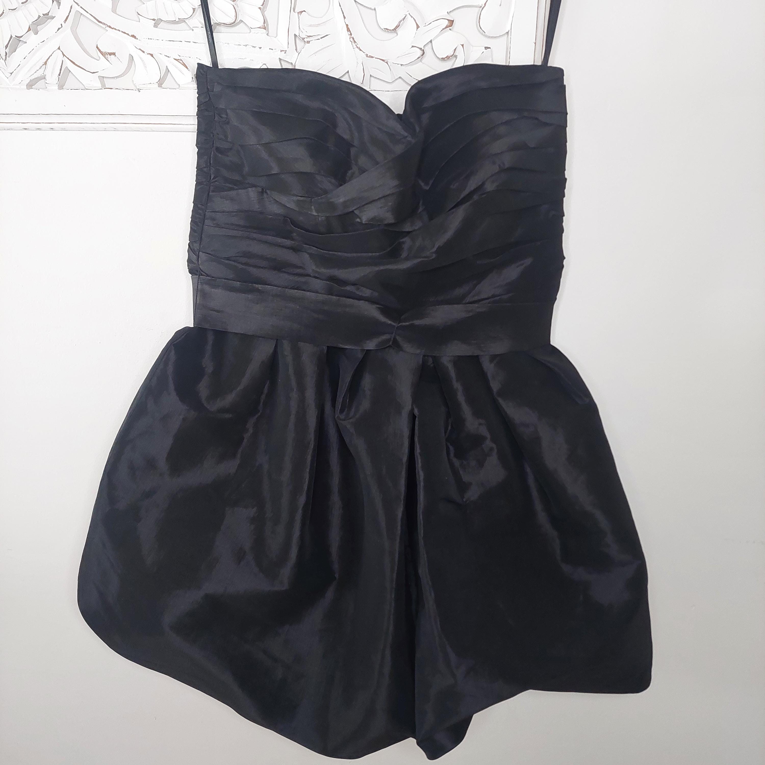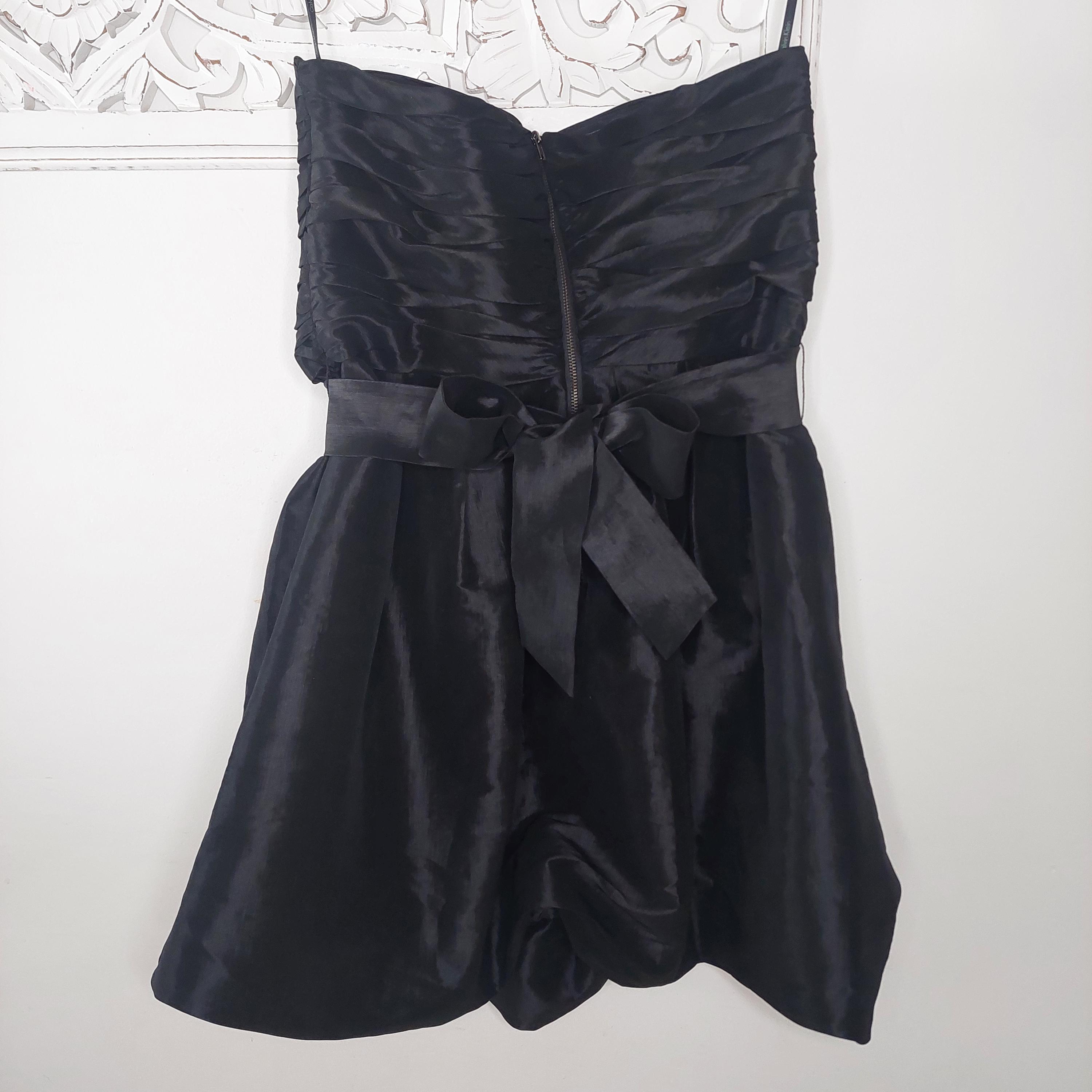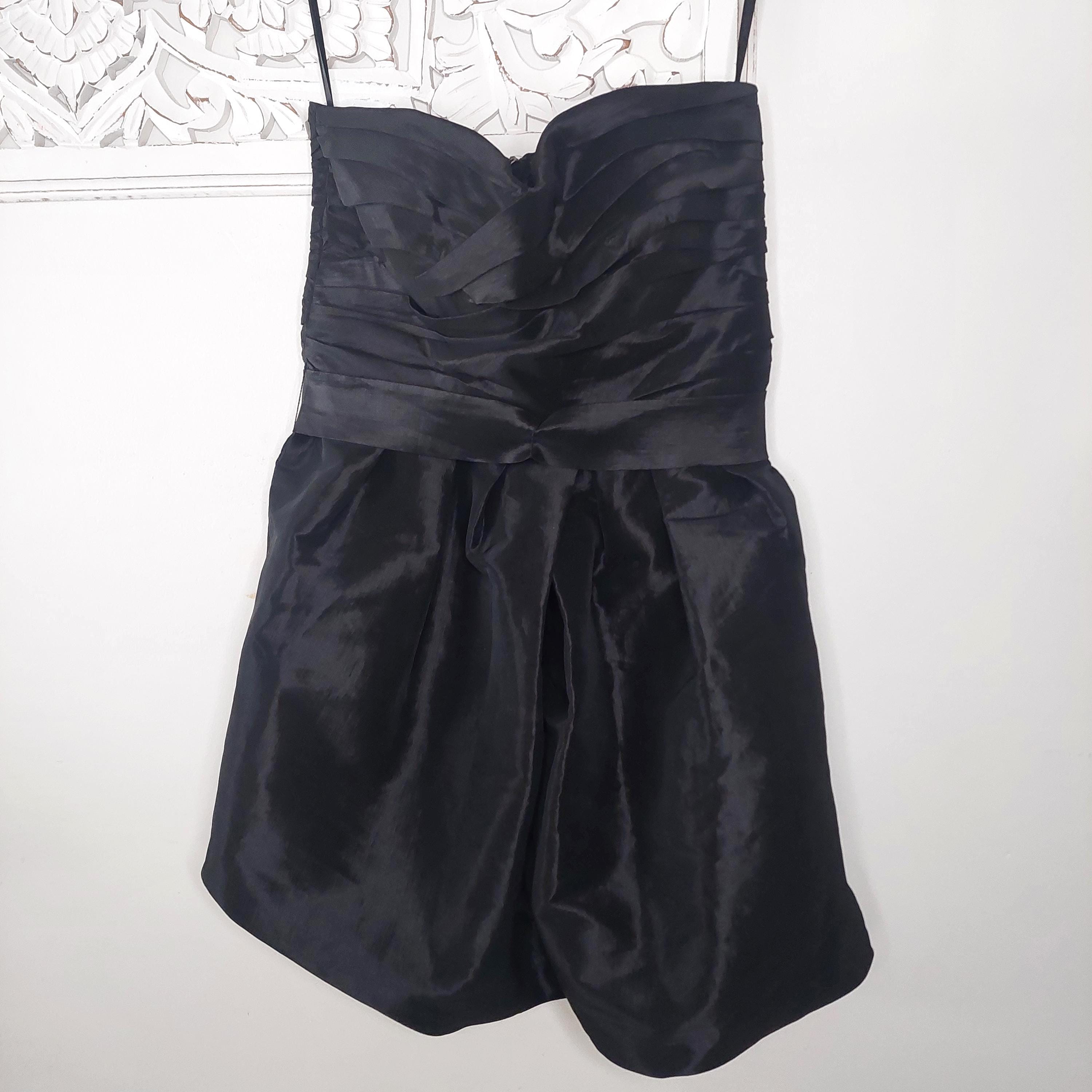 Vintage Calvin Klein strapless black evening dress with crossover sweetheart neckline. Pleated bust and ruched waist with removeable waist band tie. Faux wrap bubble skirt. Zippered back . Size 4