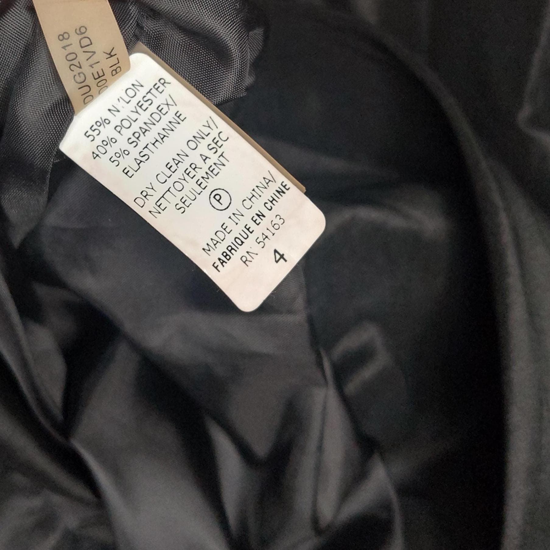 Tag: "Calvin Klein - 55% Nylon, 40% Polyester, 5% Spandex - Dry Clean Only - Made in China - 4"