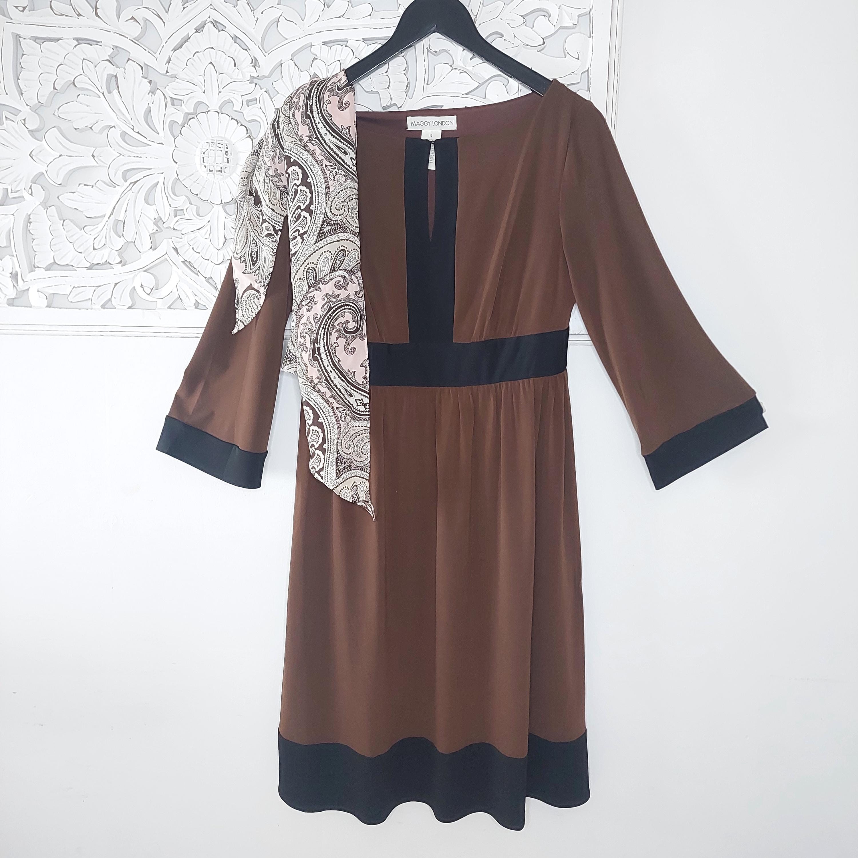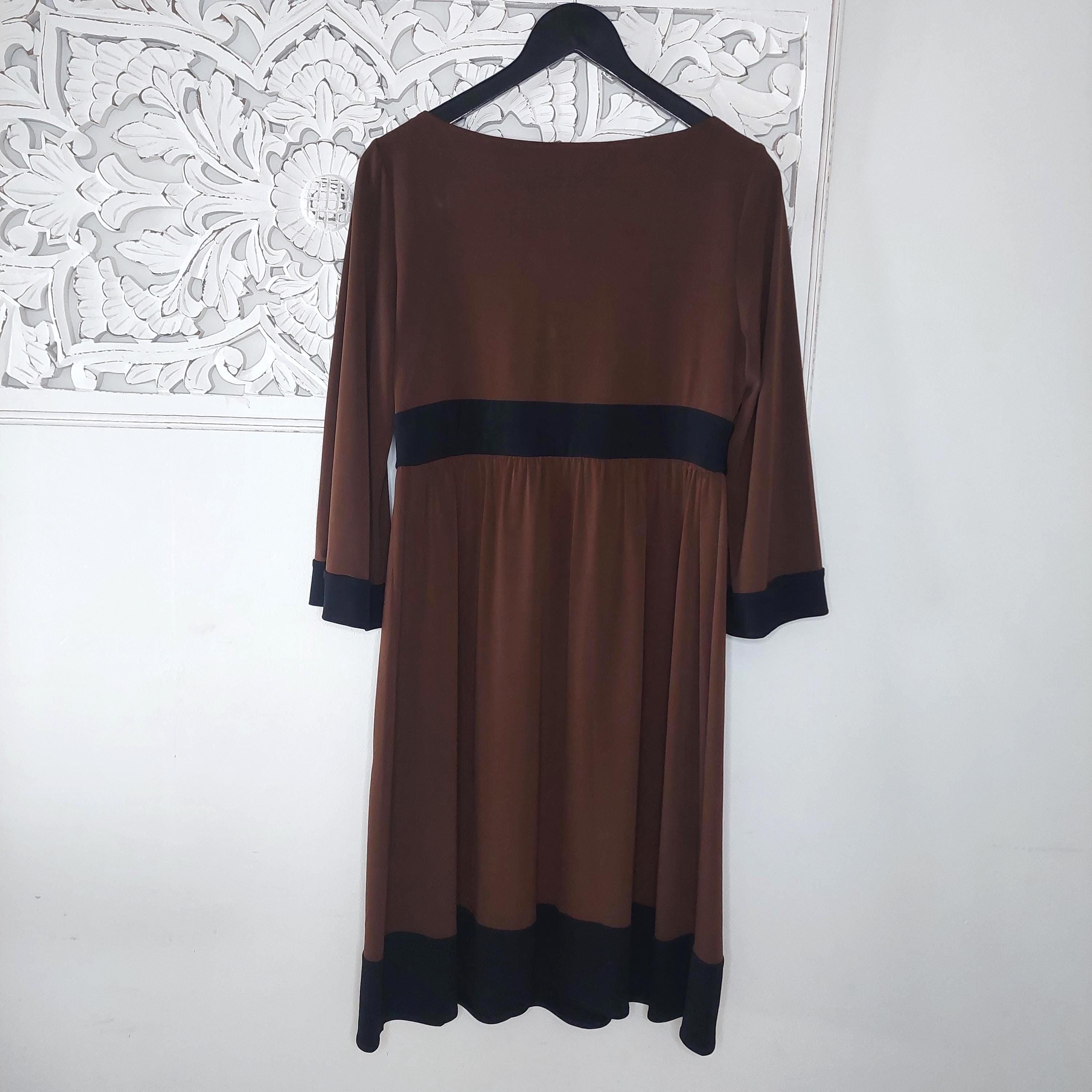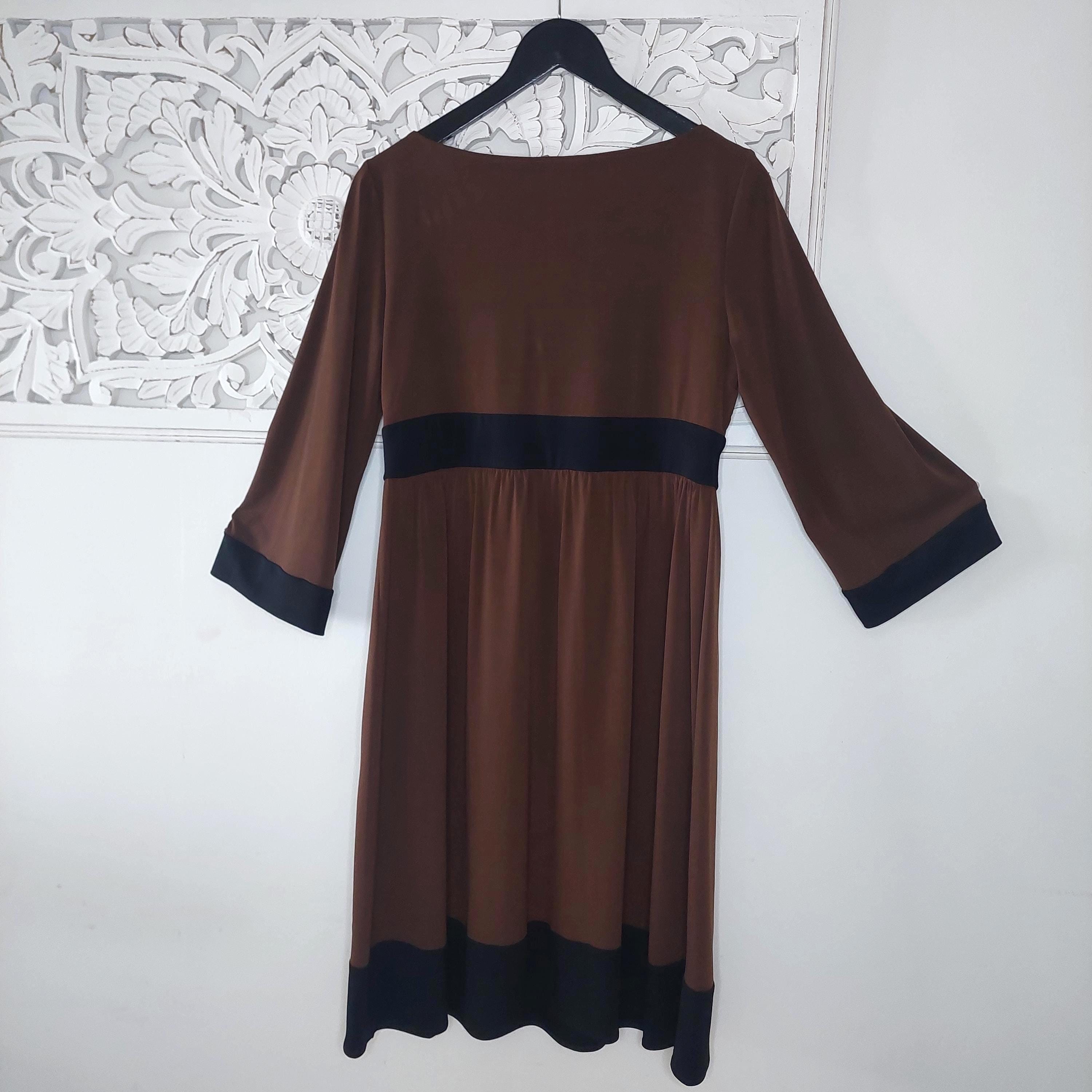 Vintage long sleeve Maggy London in a chocolate brown & black. Pullover with front, single hook closure.