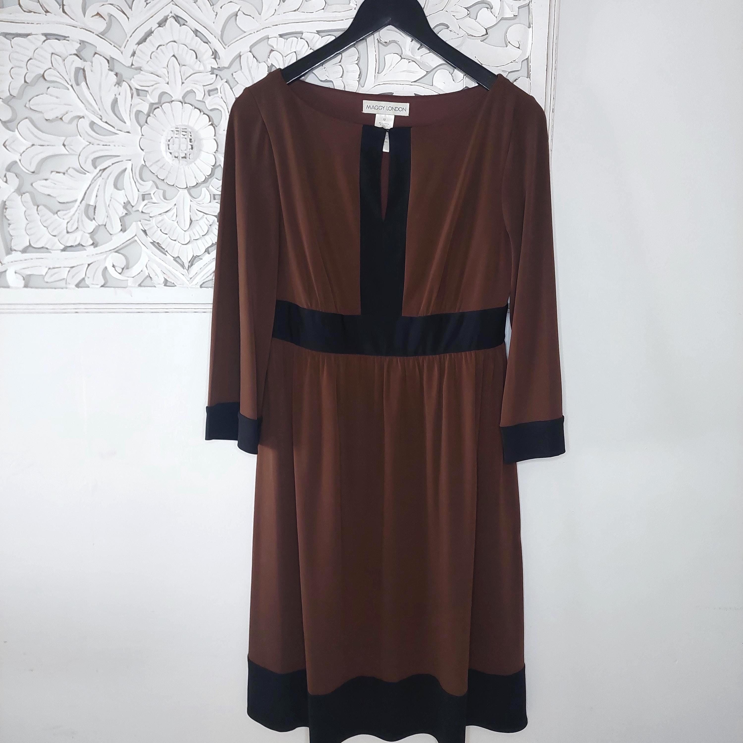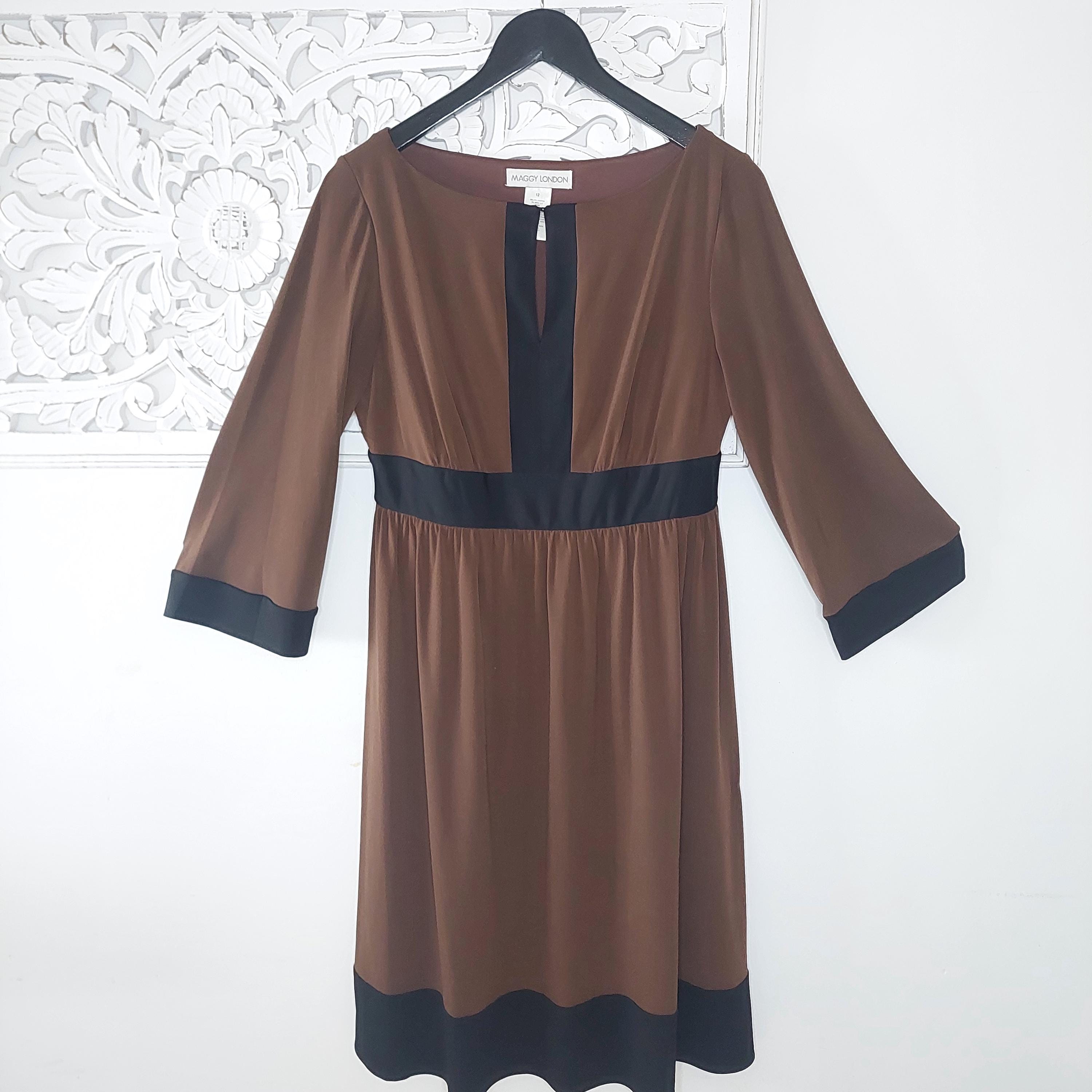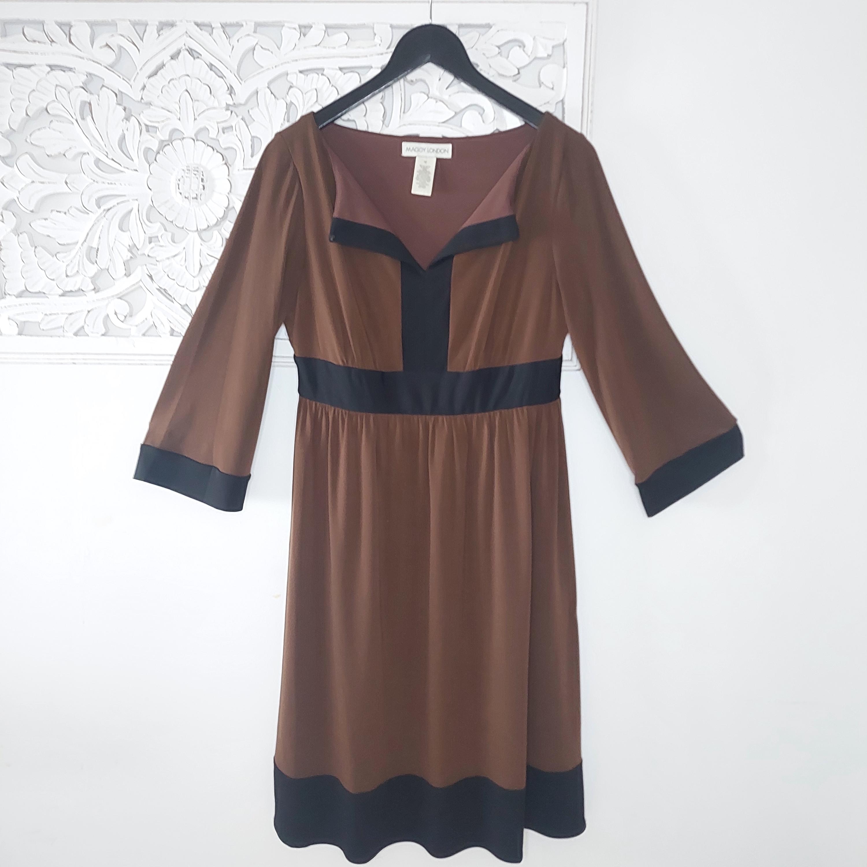 Vintage long sleeve Maggy London in a chocolate brown & black. Pullover with front, single hook closure.