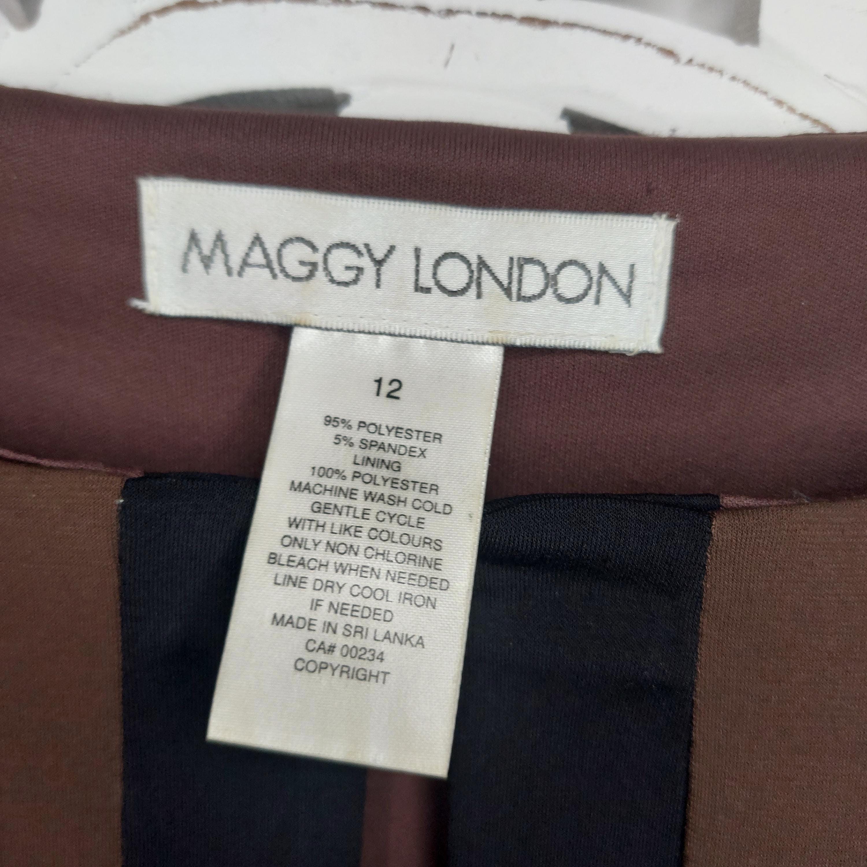 Tag: "Maggy London - 12 - 95% Polyester, 5% Spandex, Lining 100% Polyester - Machine Wash Gentle Cycle - Line Dry - Made in Sri Lanka"