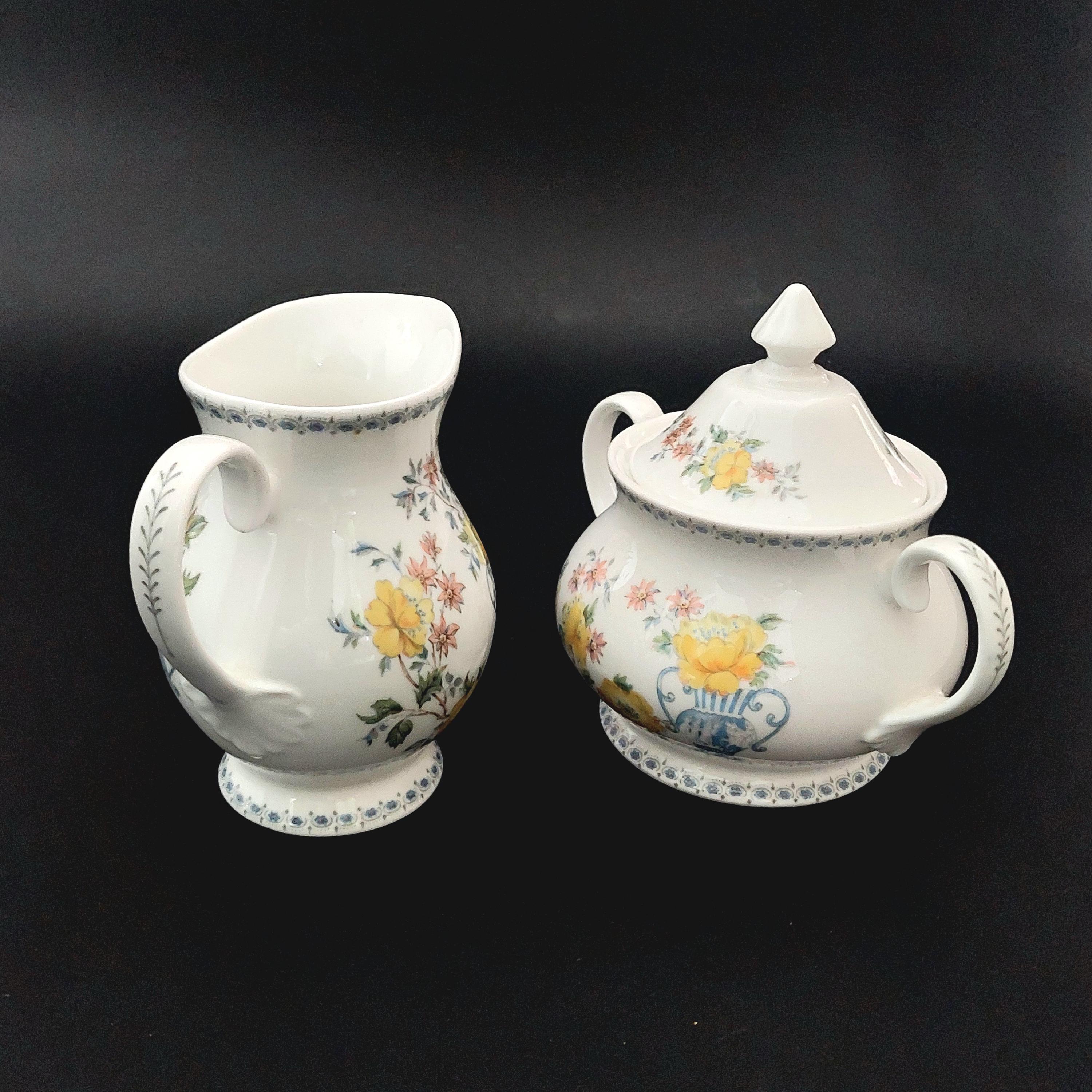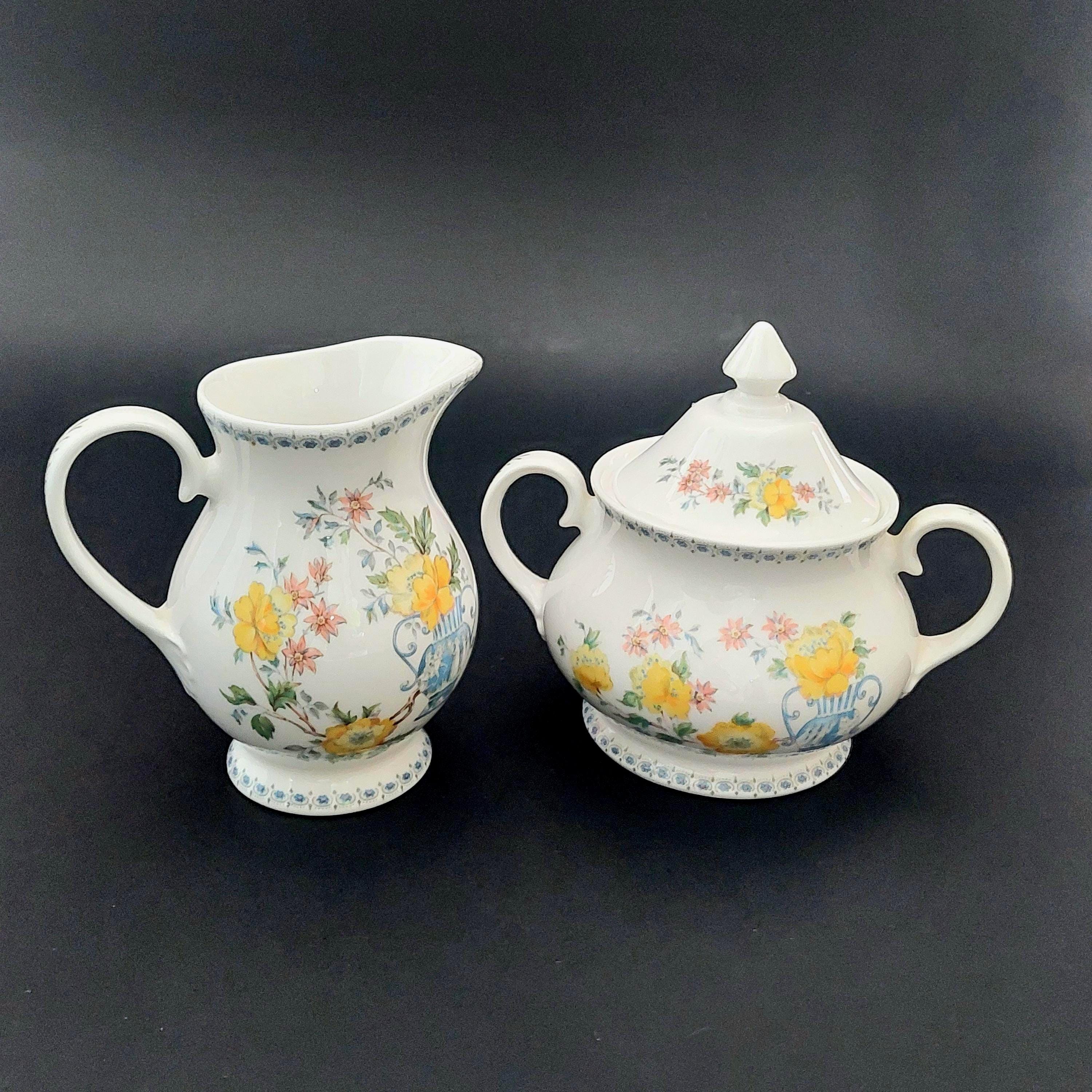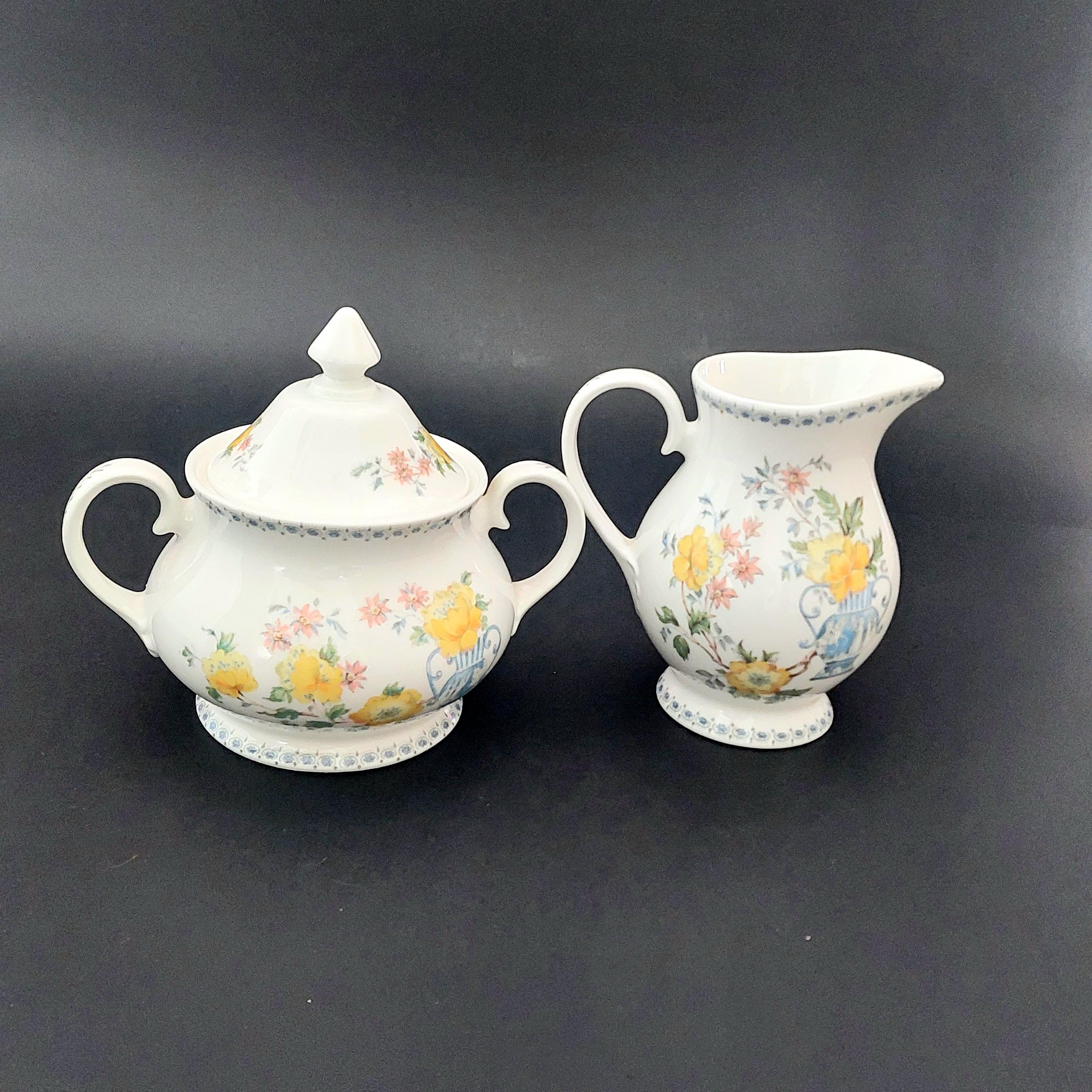 1990s Royal Grafton bone china sugar bowl & creamer set in the floral Heritage pattern. Made in England