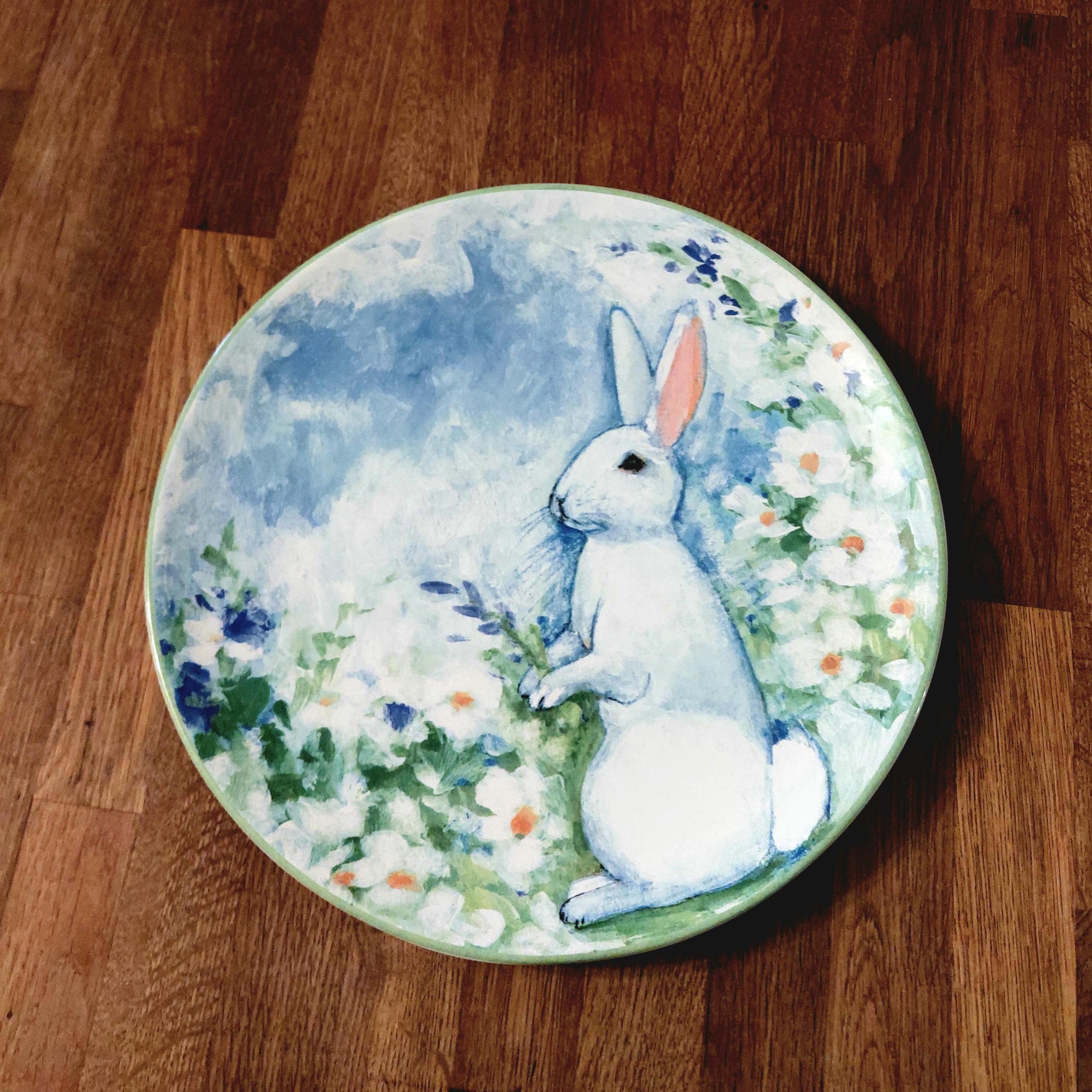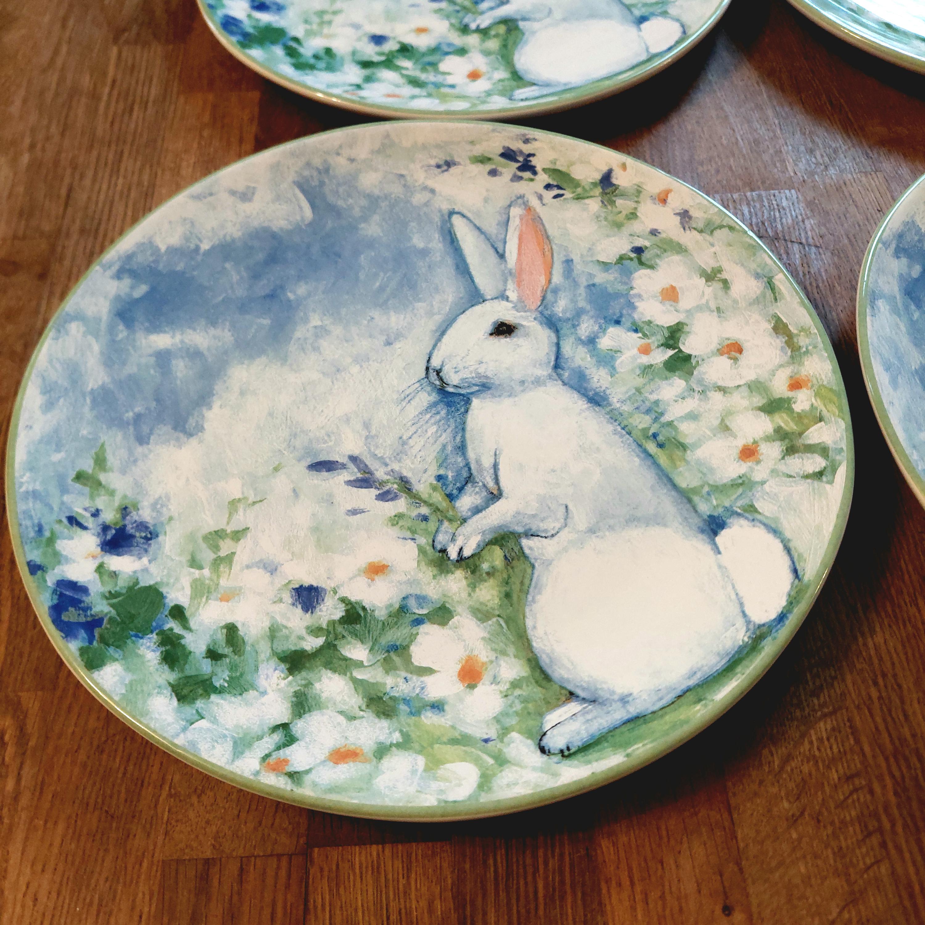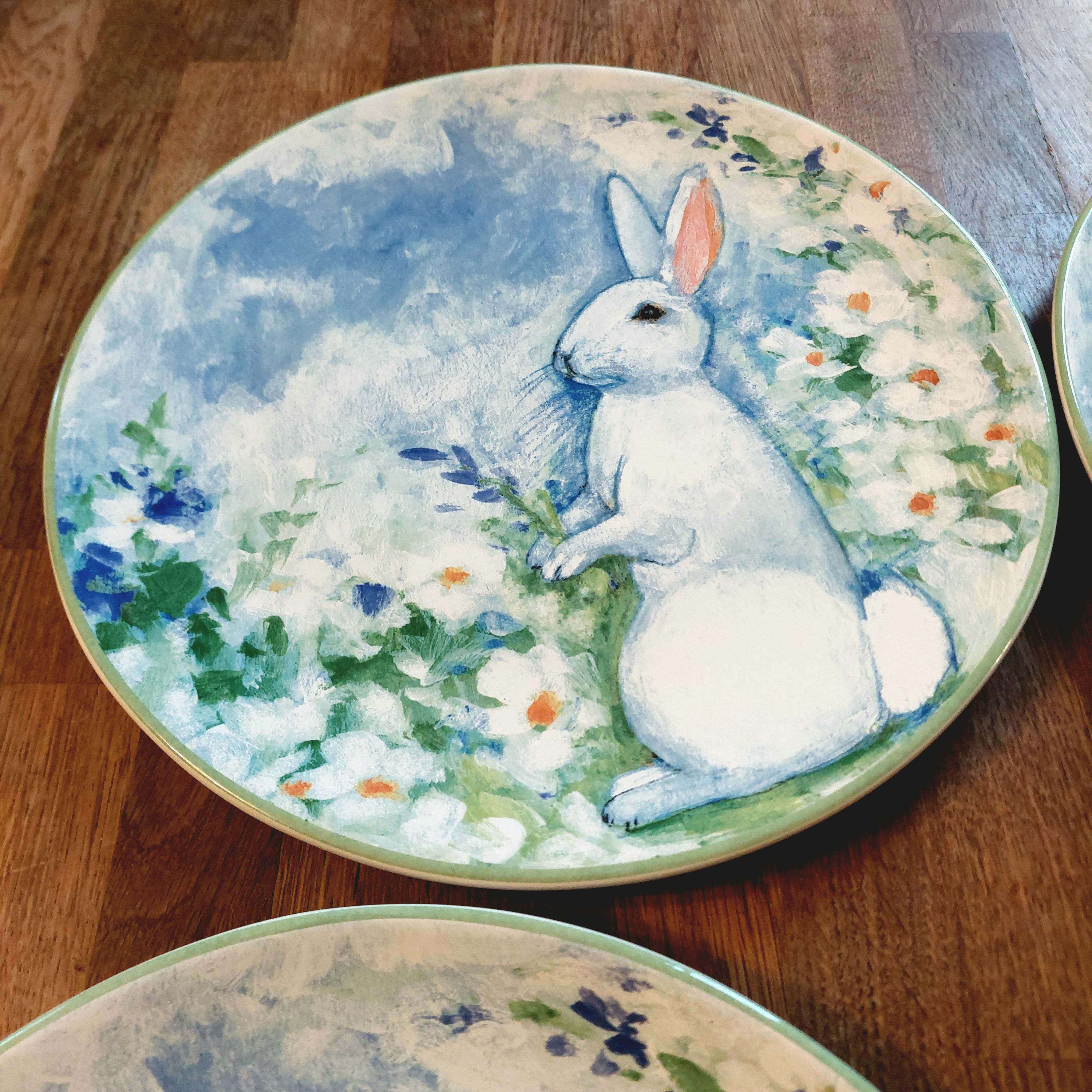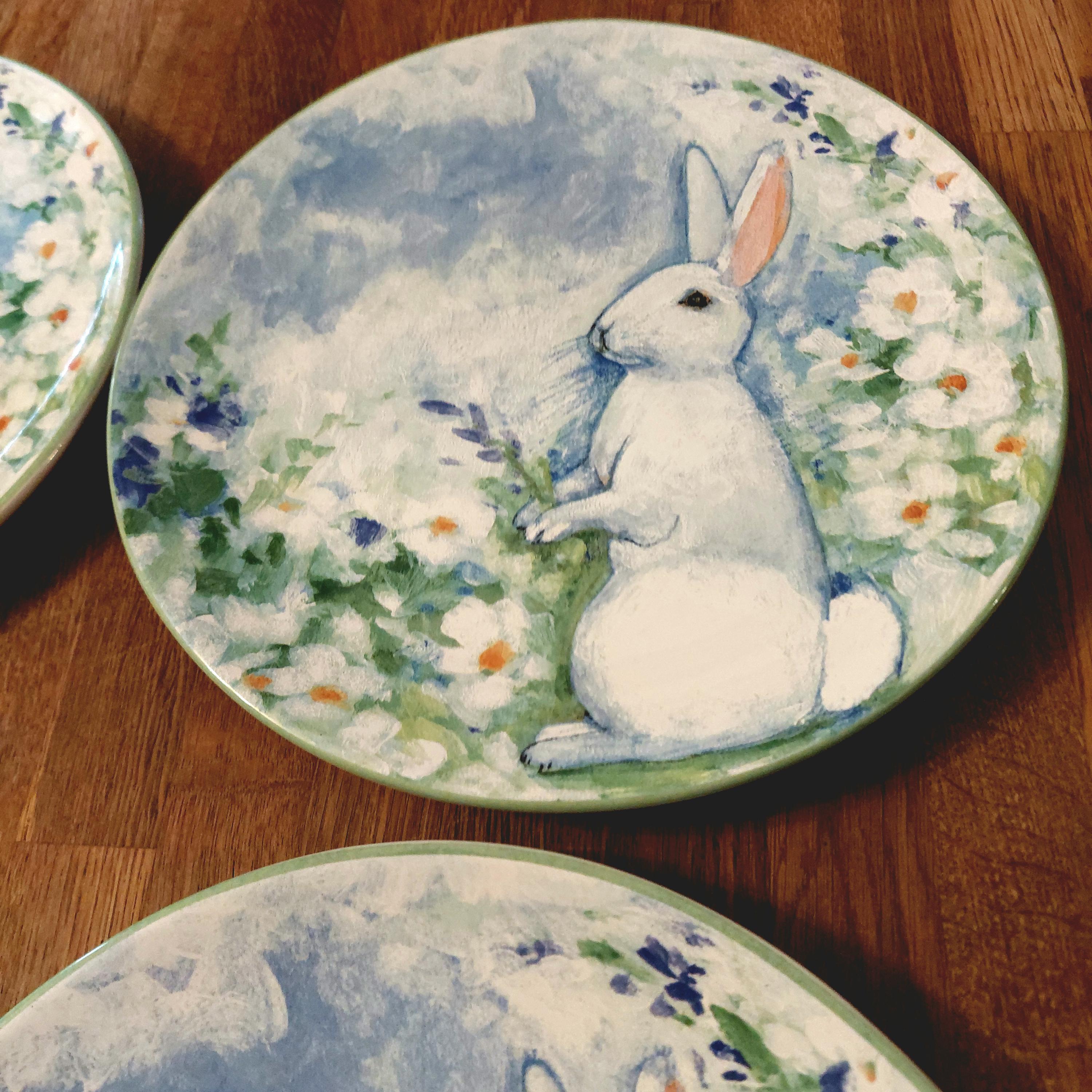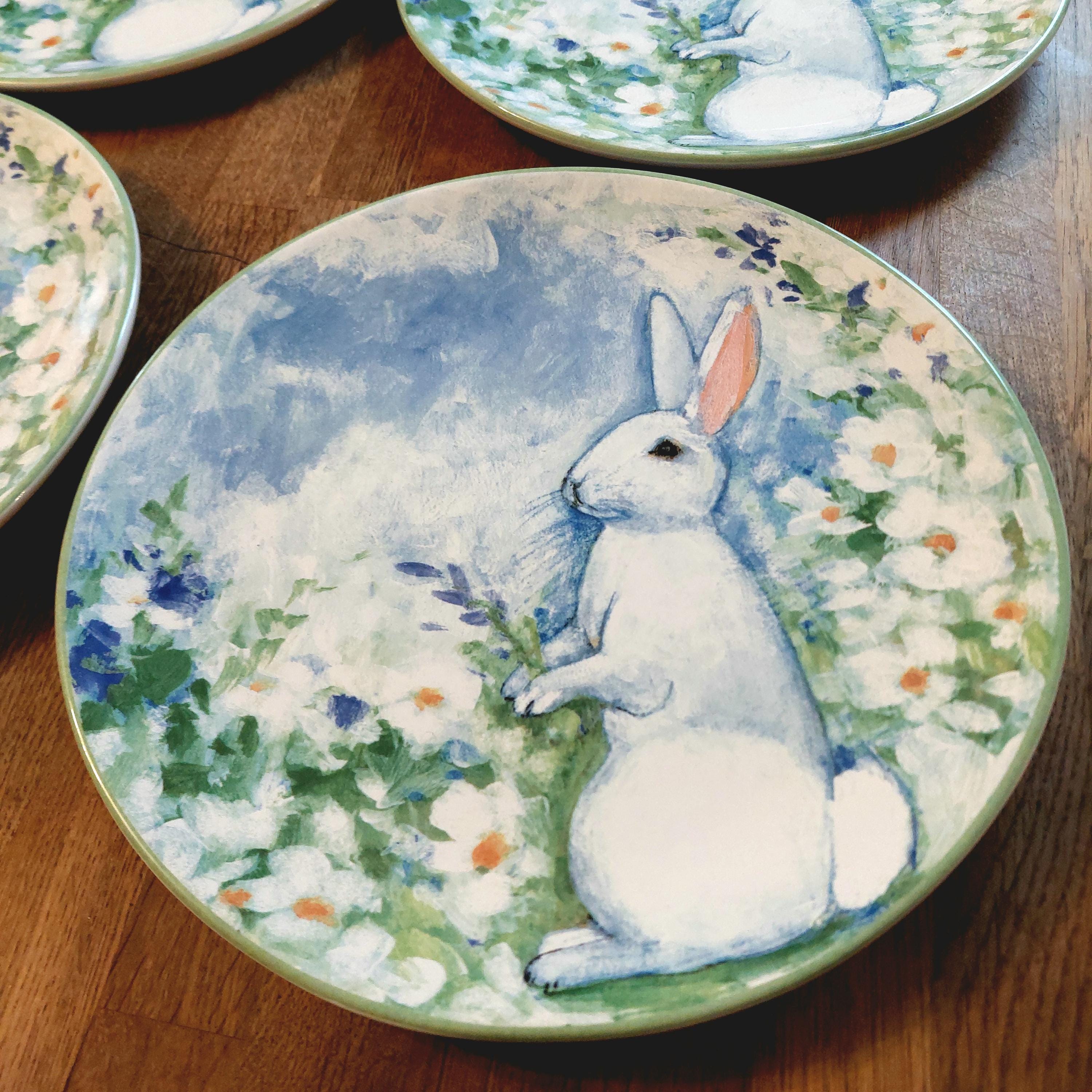 Thick earthenware 11-inch vintage dinner plates featuring a white bunny.