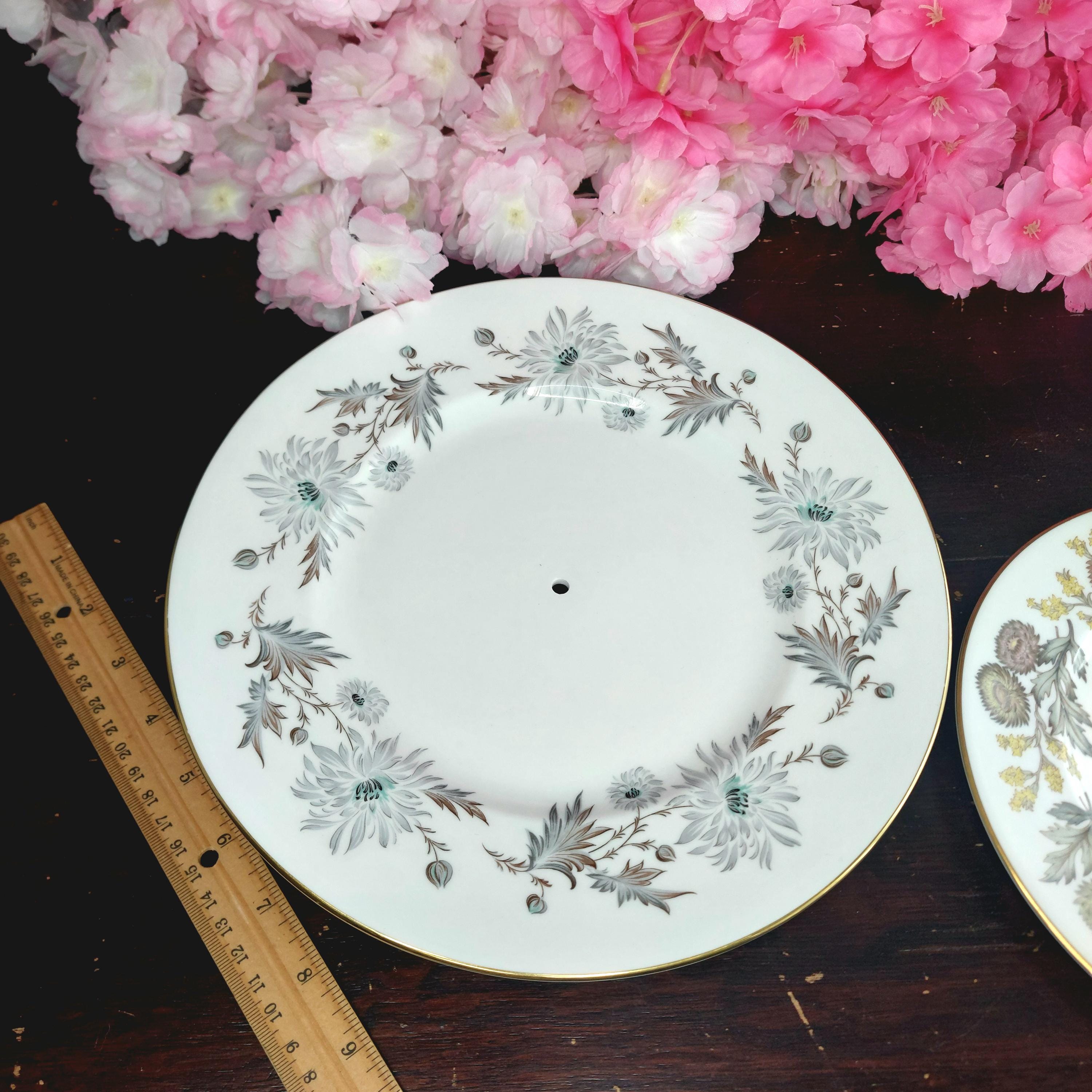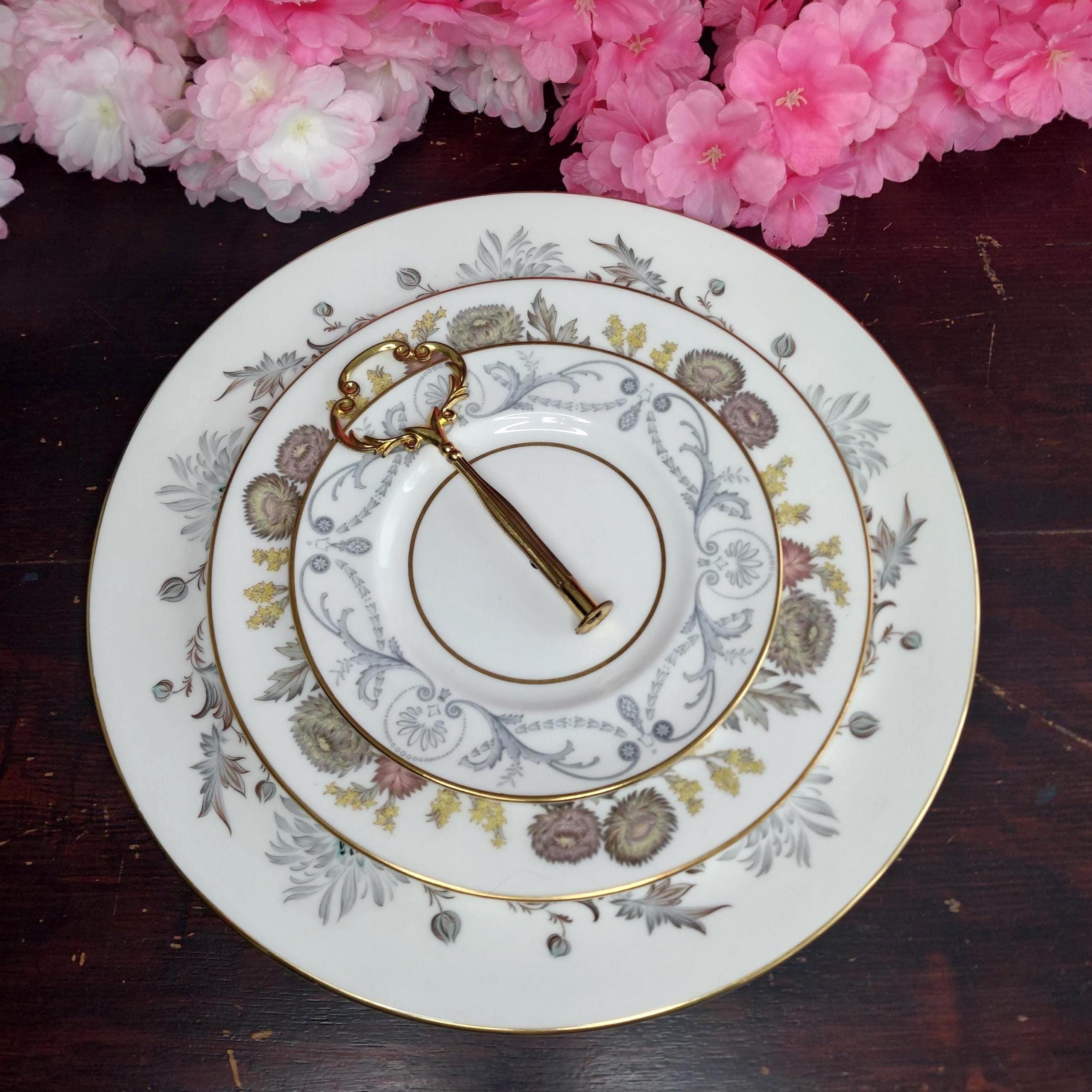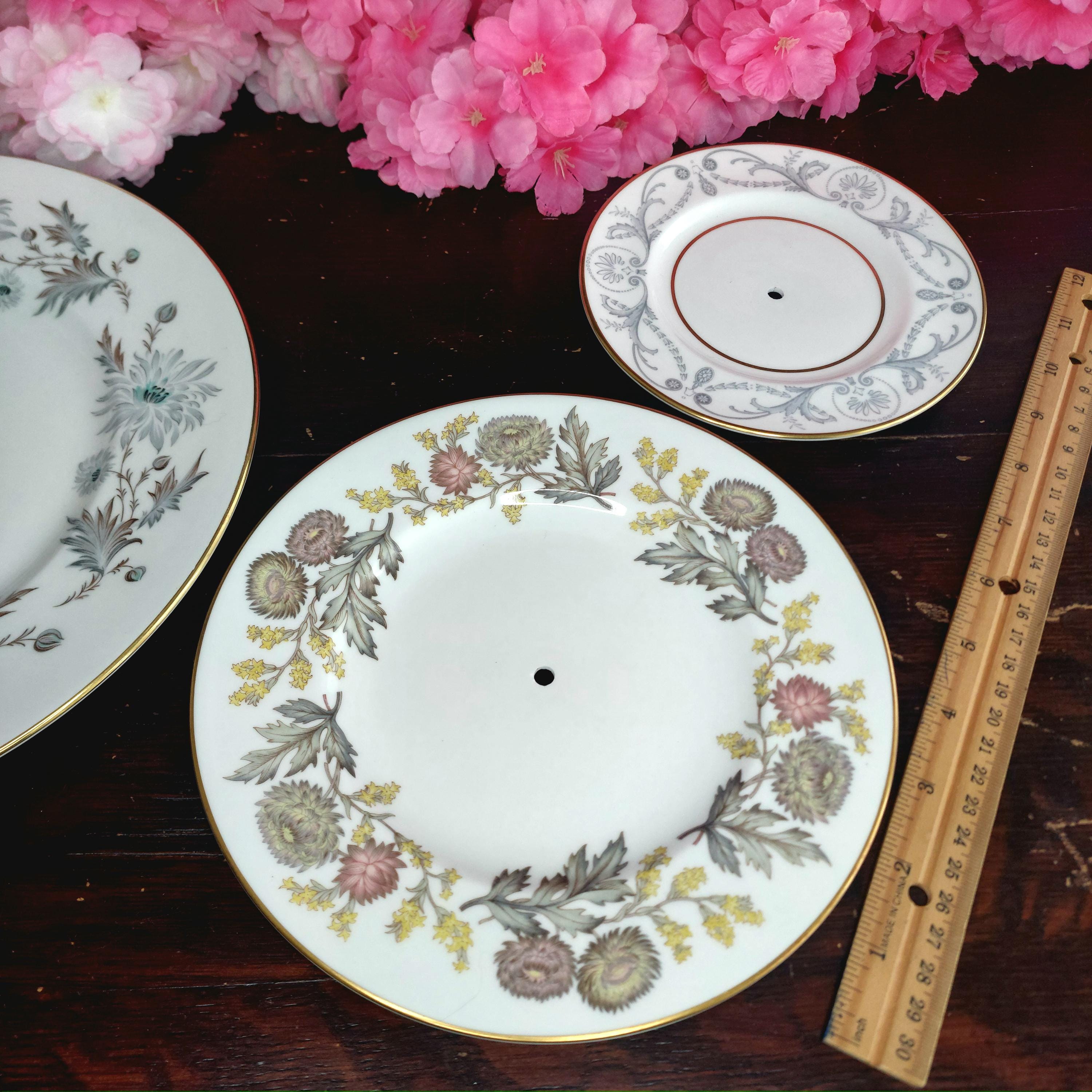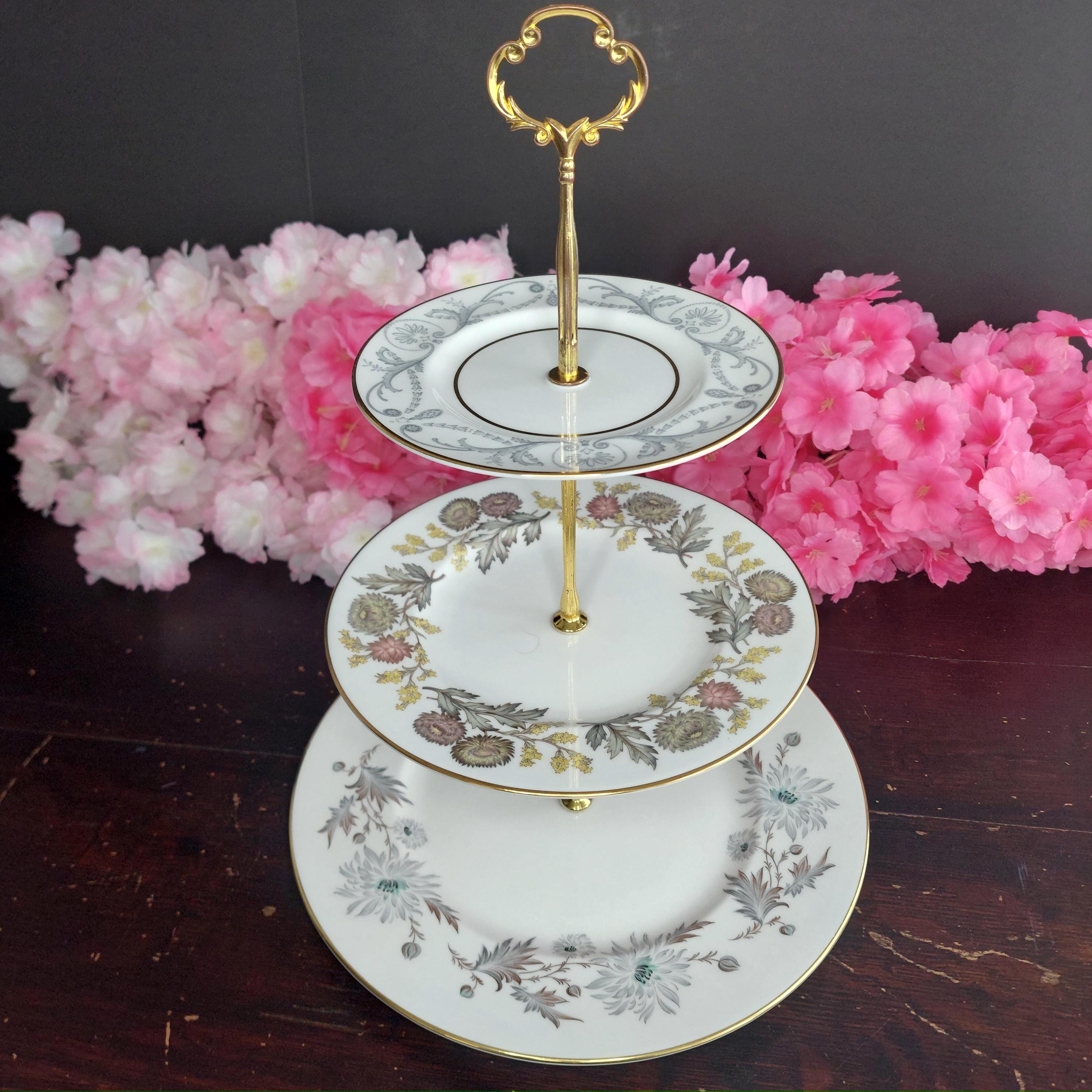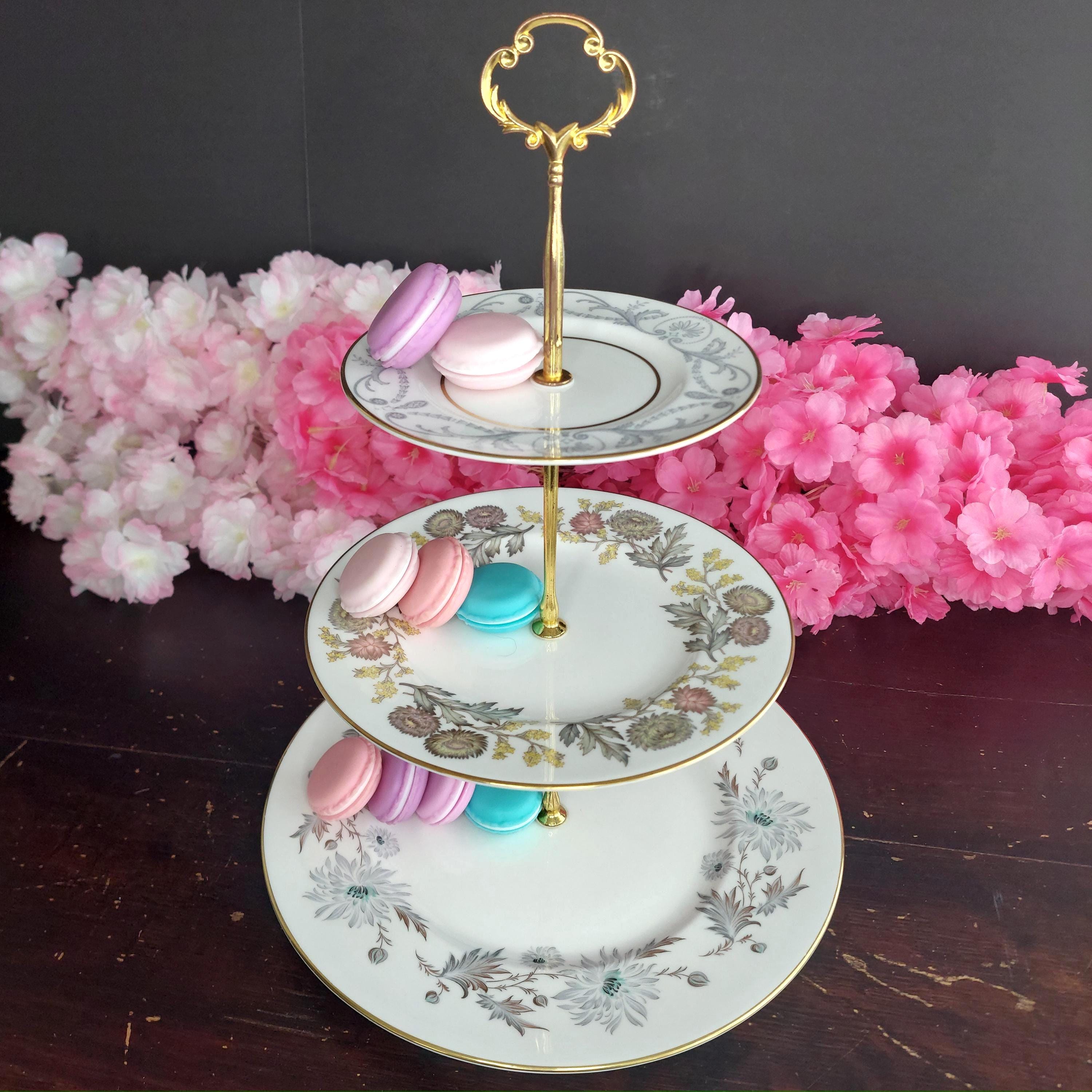 Each stand features genuine bone china plates made in England by renowned brands—Paragon (6" top), Wedgwood (8" middle), and Coalport (10.75" bottom)—selected for their charm and history. Sturdy new hardware in your choice of black, white, silver, or gold tone makes this serving piece both functional and customizable to your style.