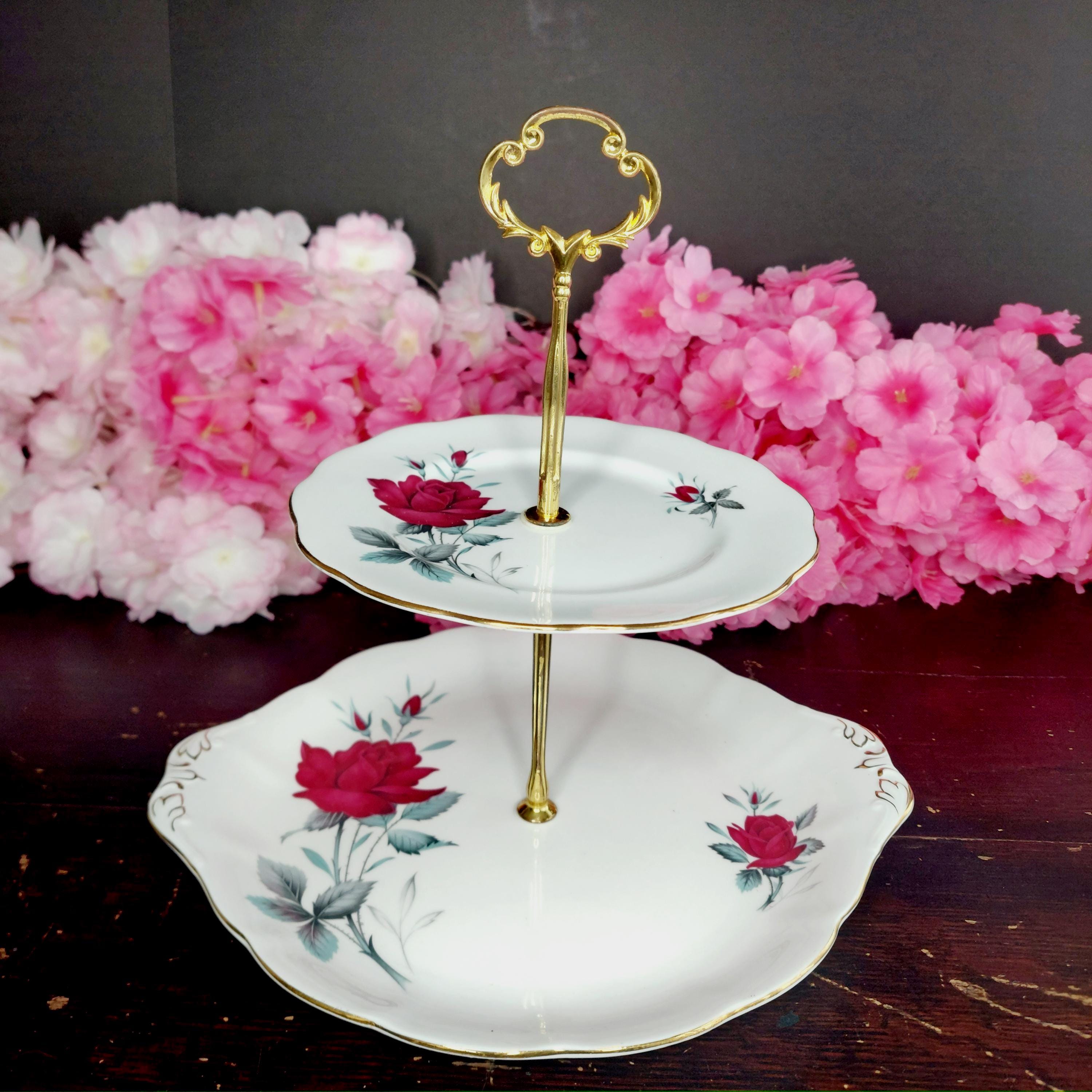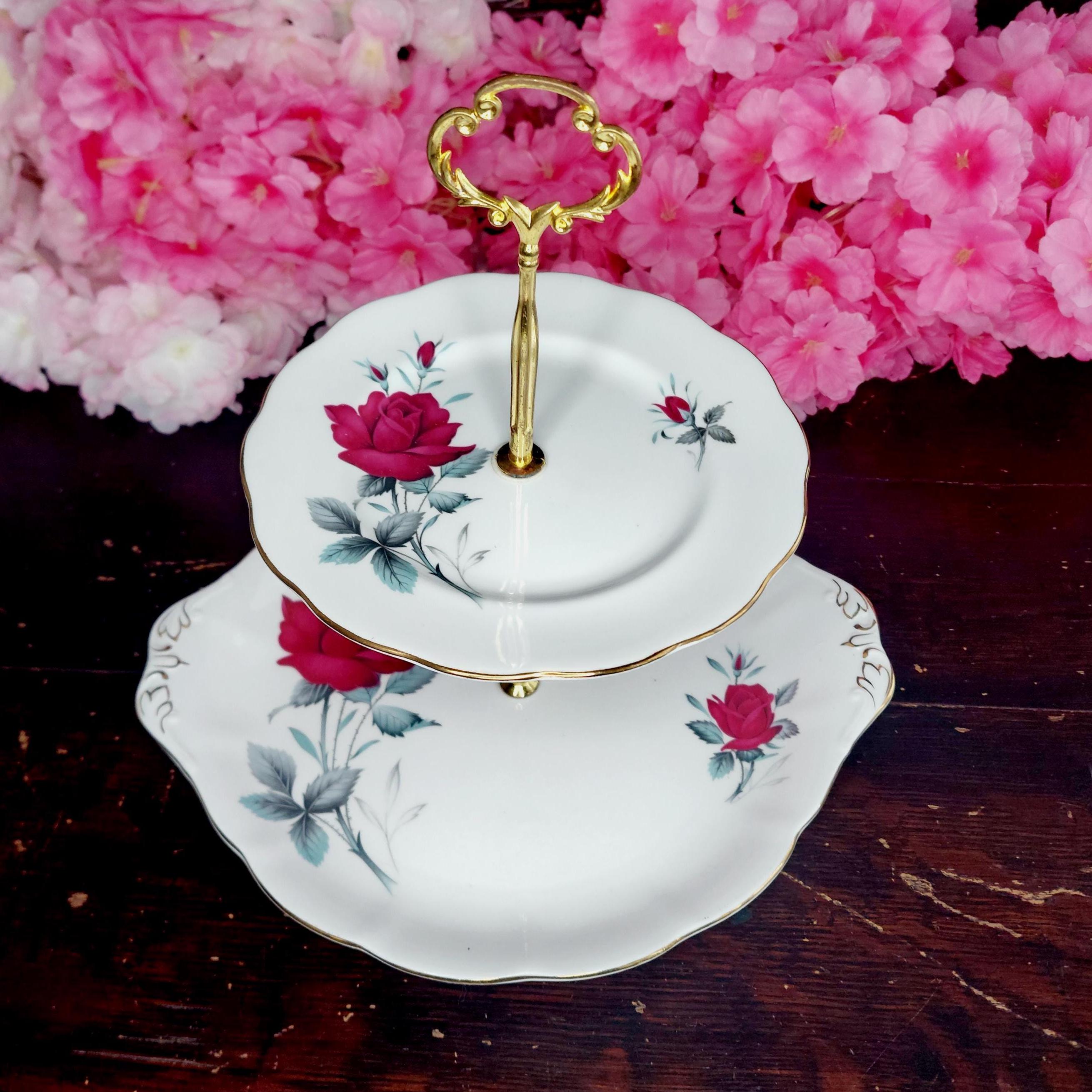 Looking for a unique centerpiece for your next gathering or a thoughtful gift? This two tier cake stand is crafted by me using genuine Royal Albert “Sweet Romance” bone china plates, made in England. Each stand features your choice of new hardware in black, white, silver, or gold tones to match your style.