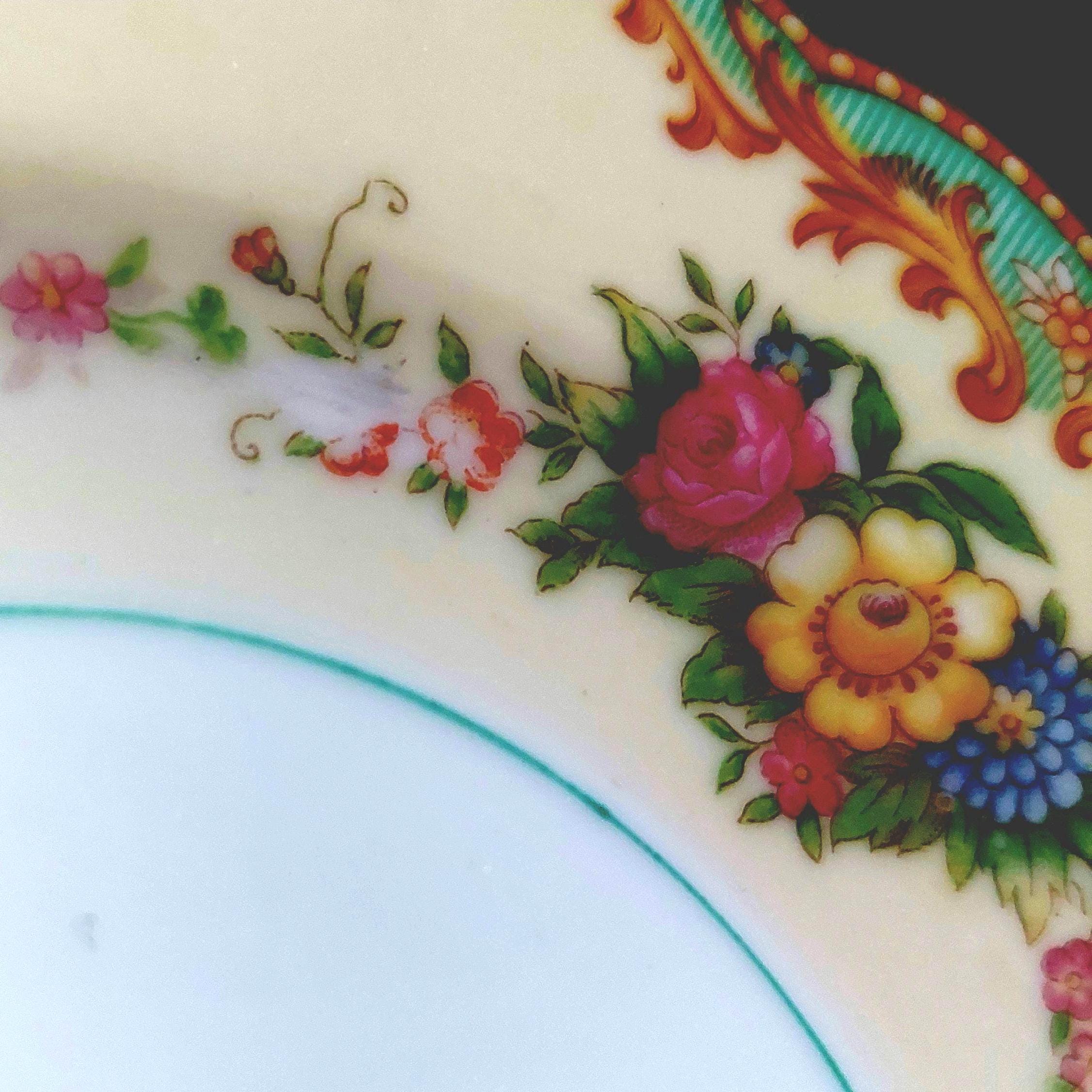 Milroy is a lovely pattern featuring multi-colored floral sprays and tan scrolls on a cream background. White center. Green border and gold edge.