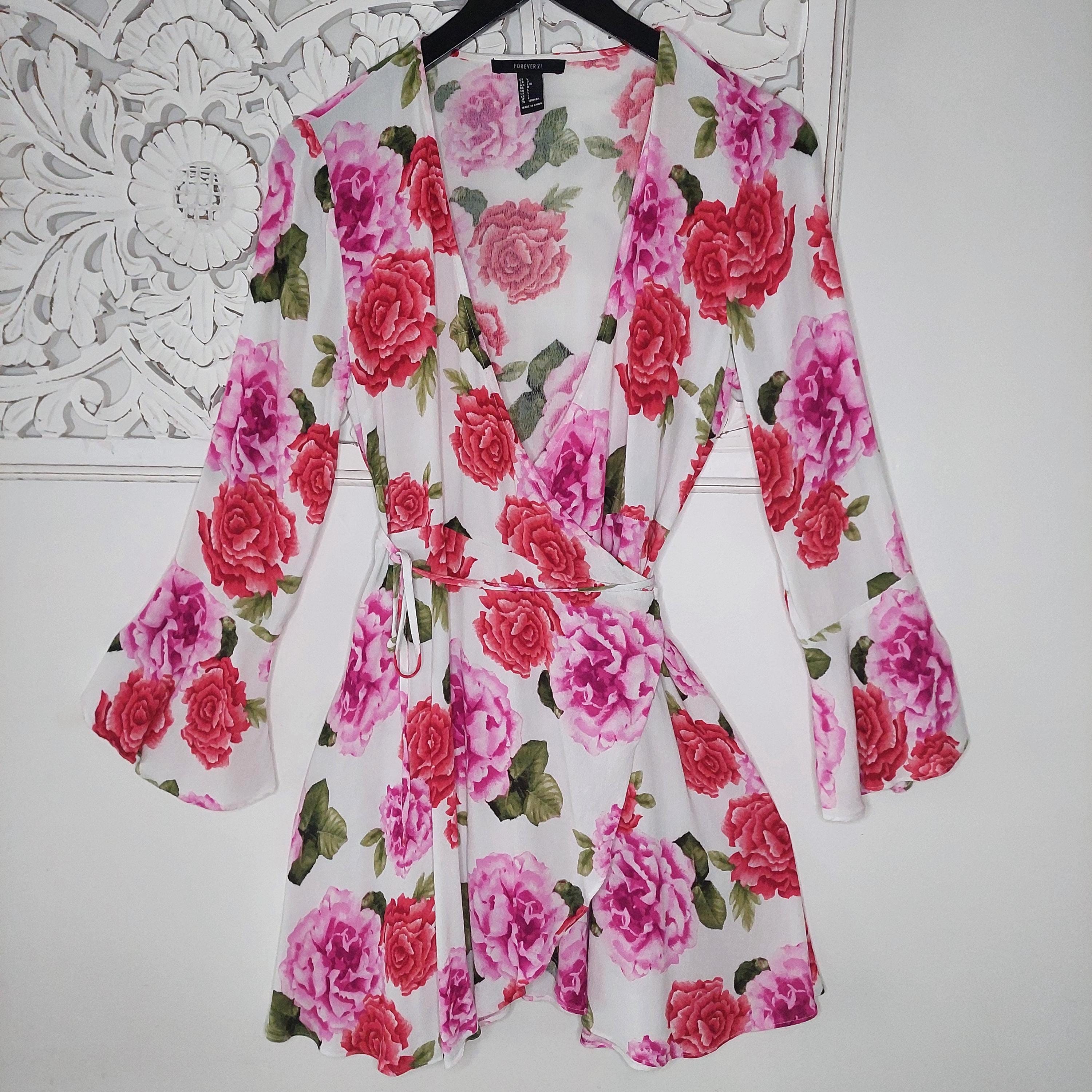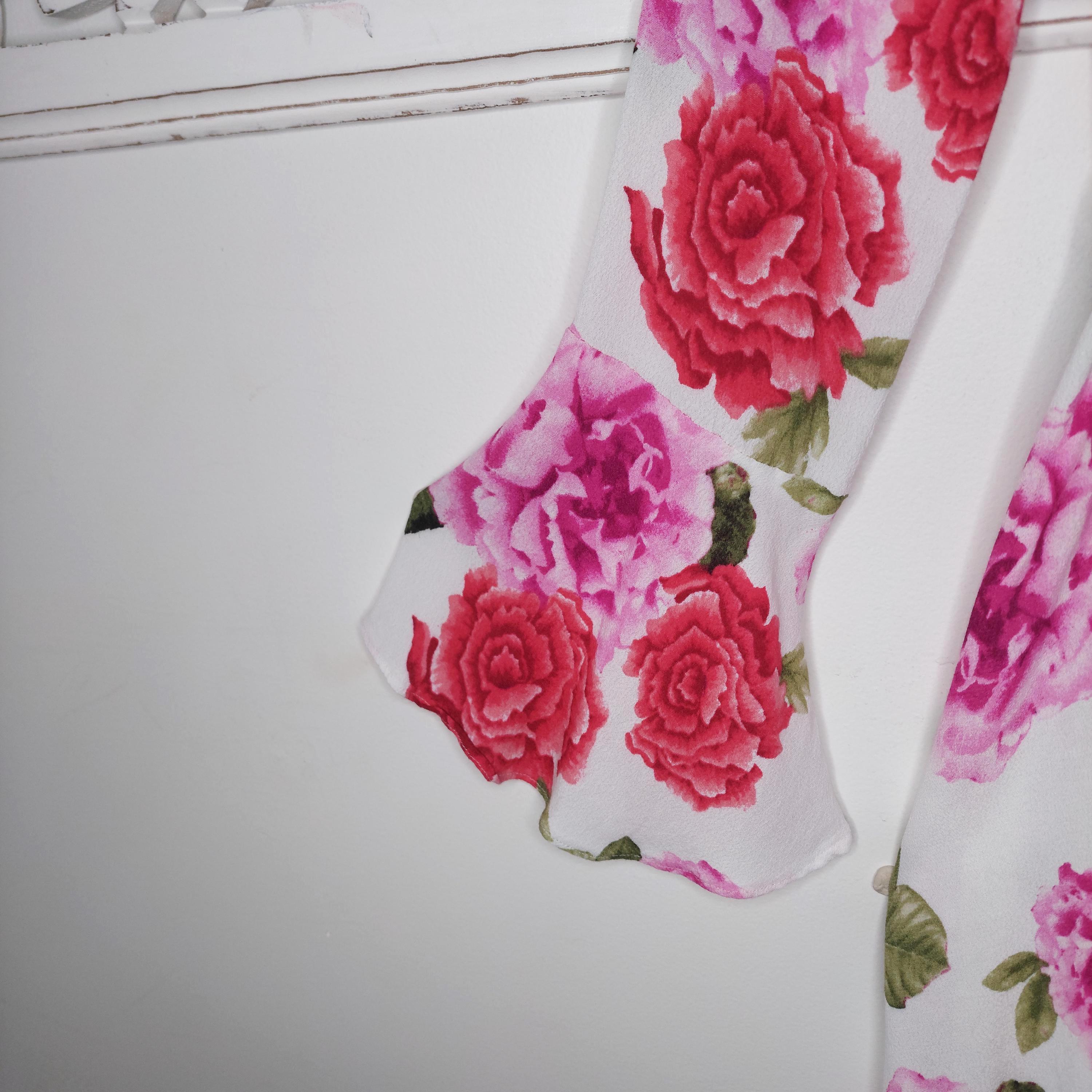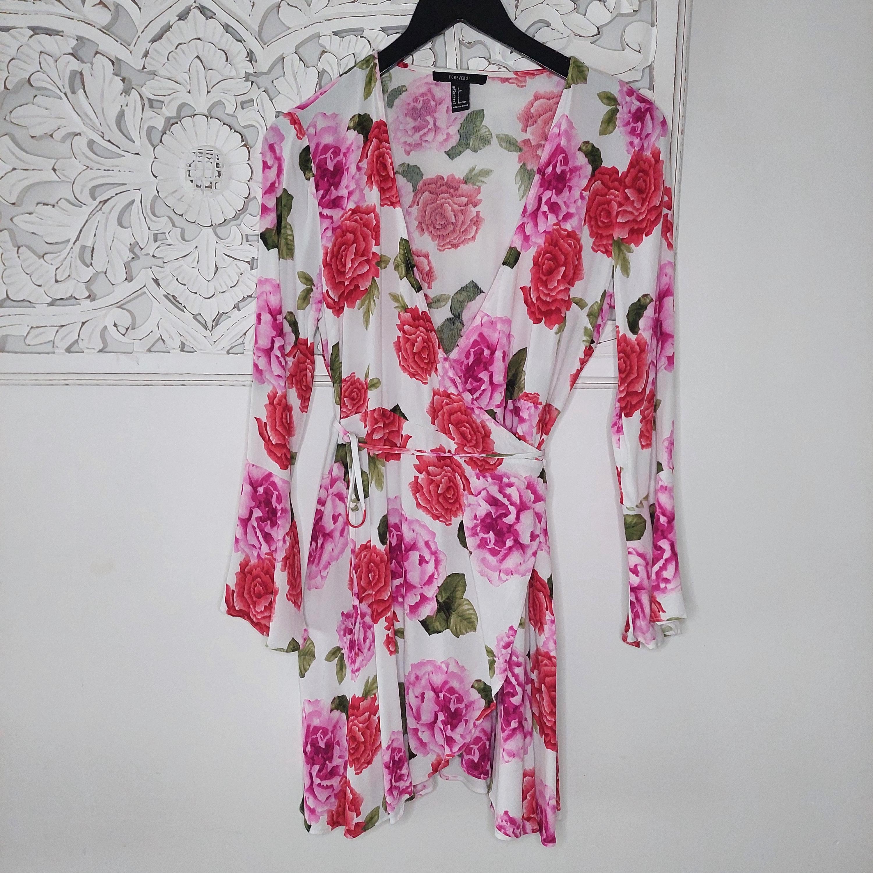 Pretty pink floral wrap mini dress. Featuring a crossover, v-neckline and long sleeves with bell-shaped cuffs.