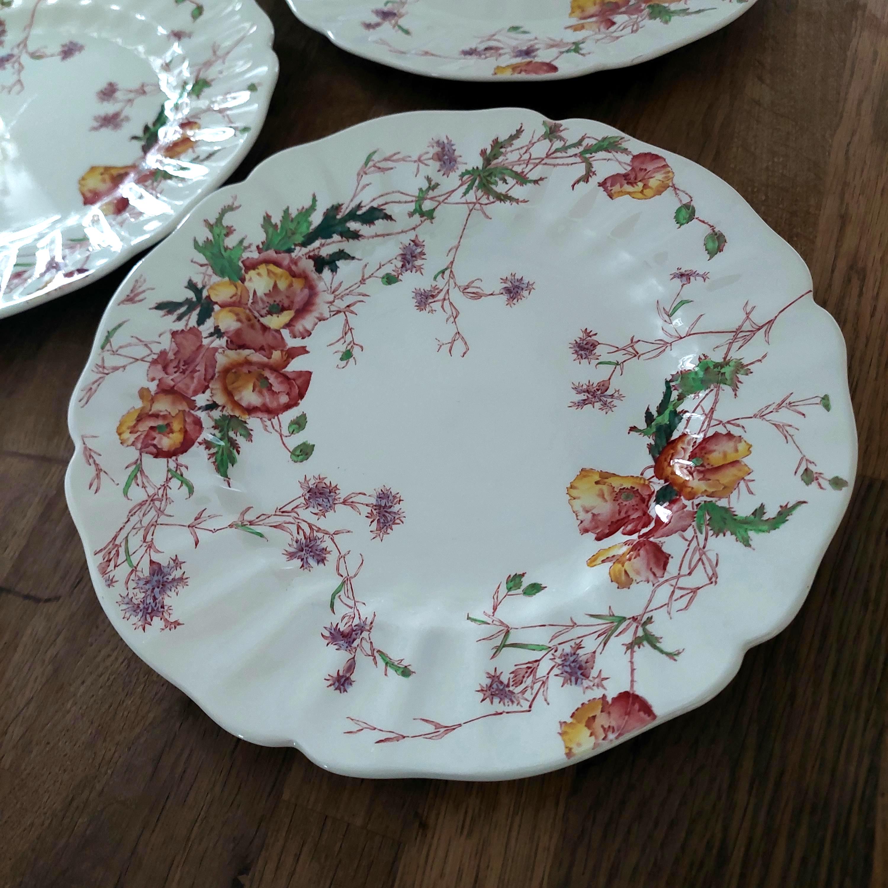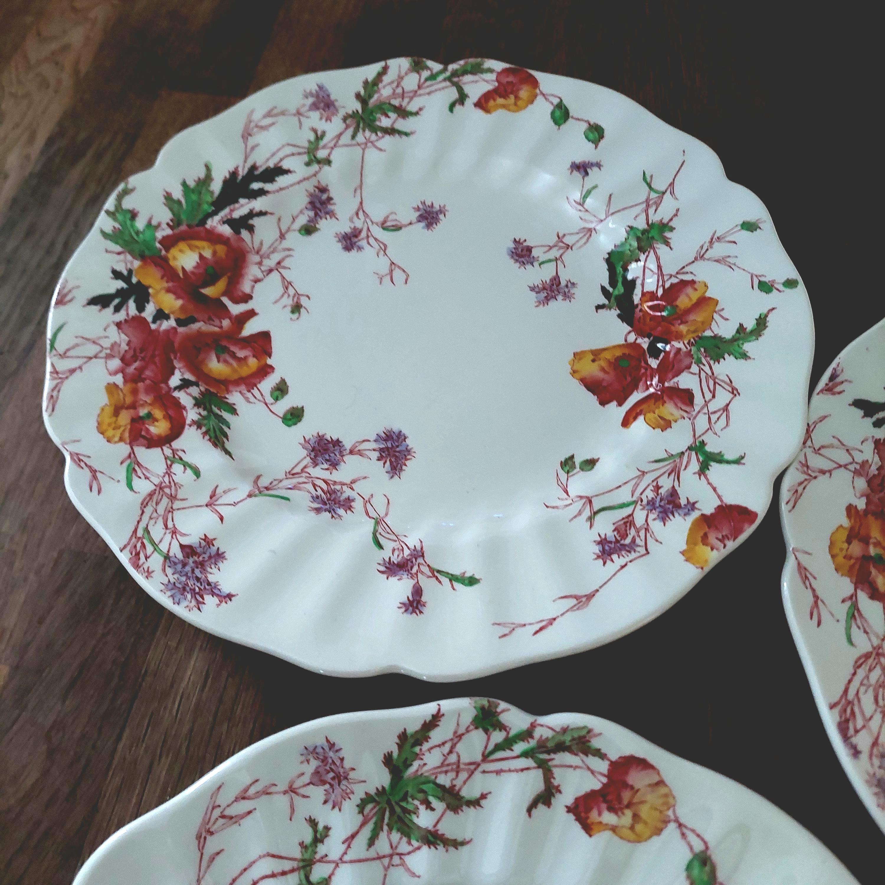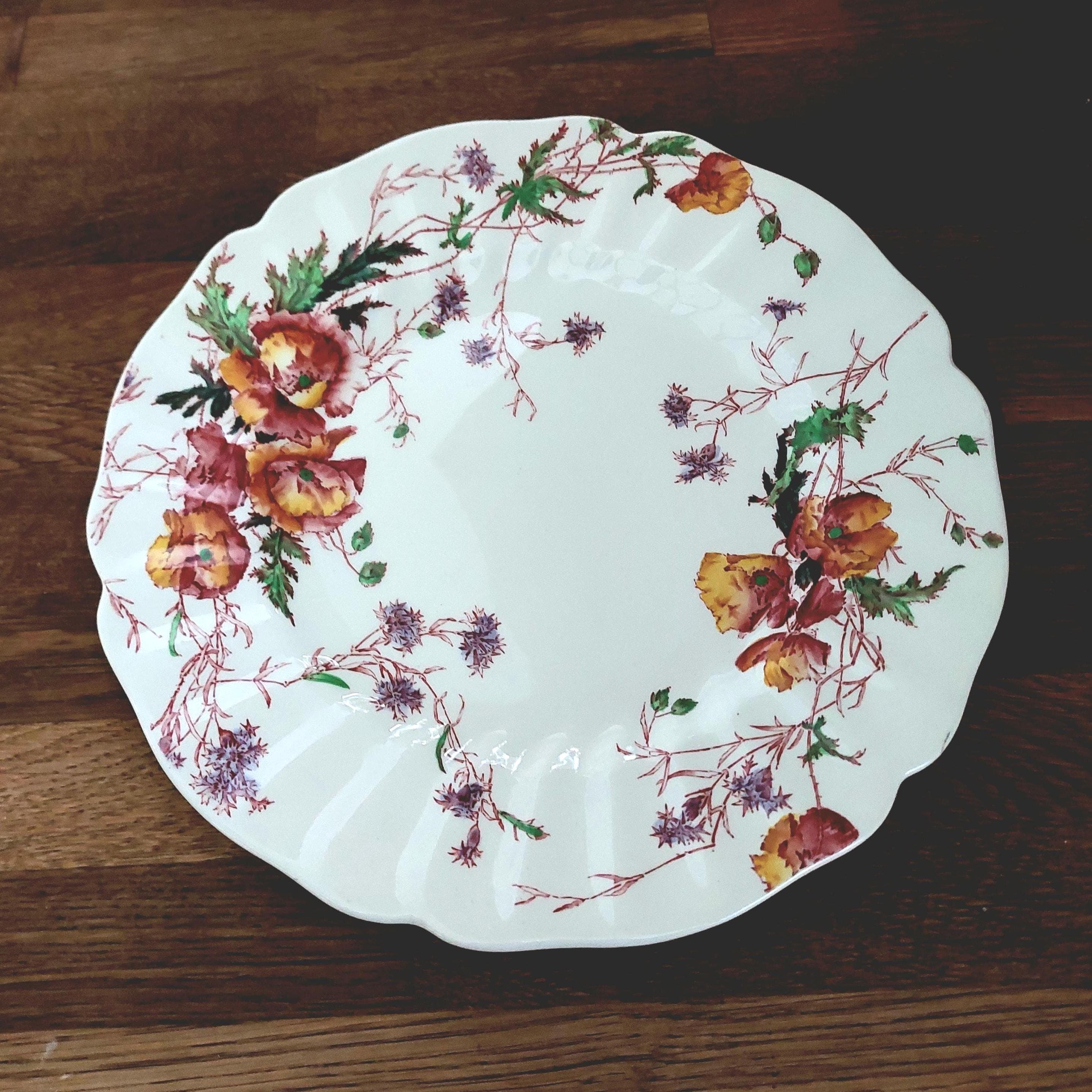 Perfect for vintage collectors and fans of classic English china, this set of four Royal Doulton dinner plates features the hard-to-find Sherborne pattern—cheerful yellow and red poppies with delicate purple sprigs. Made in England between 1938 and 1961, each 10.5" plate shows off a pretty scalloped edge and timeless design that’s sure to make any meal feel special.