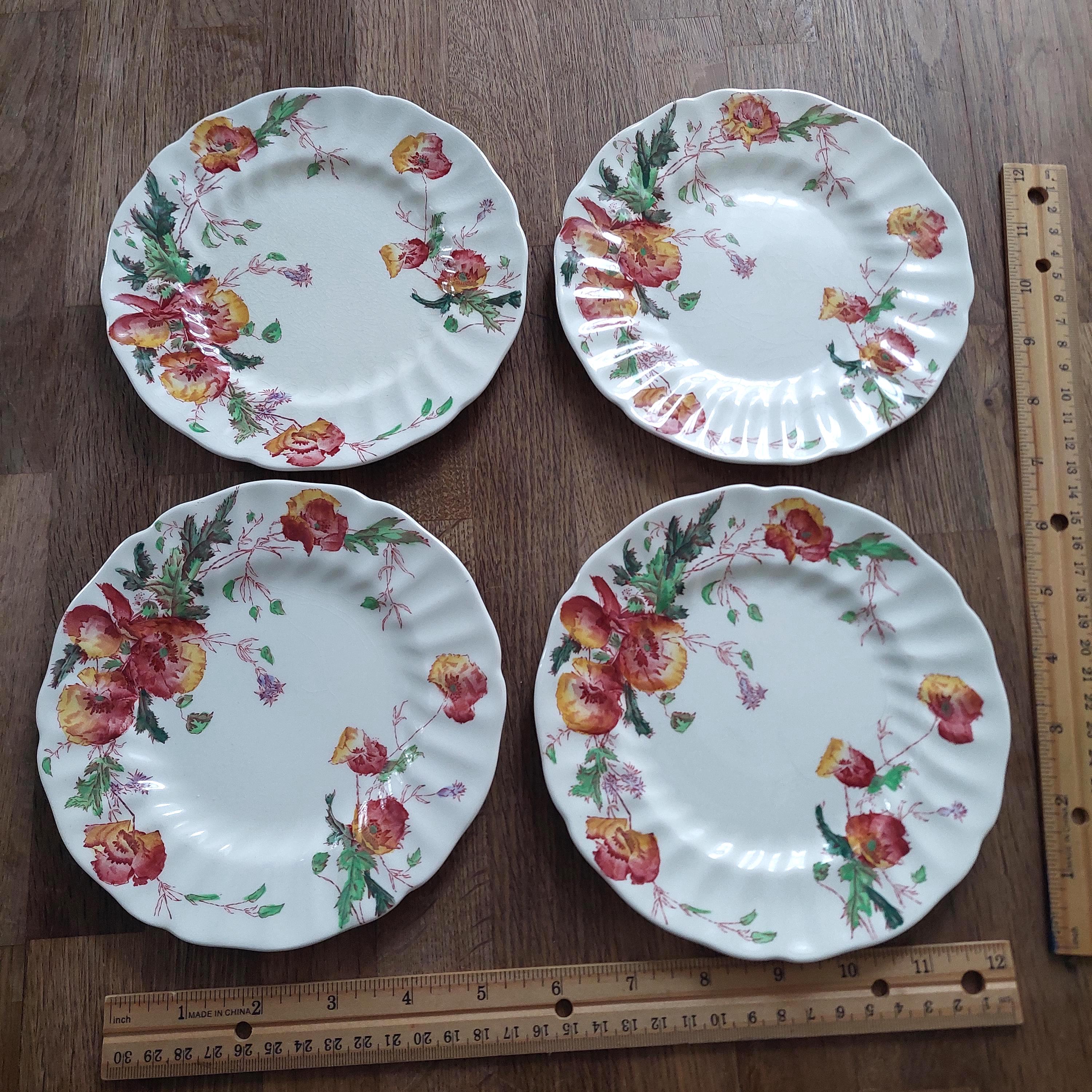 Ideal for vintage enthusiasts and lovers of classic English china, this set of four Royal Doulton side plates showcases the lovely, discontinued Sherborne pattern—vivid yellow and red poppies accented by delicate purple sprigs. Produced in England between 1938 and 1961, each 6.5" plate features a charming scalloped edge that highlights its timeless design.