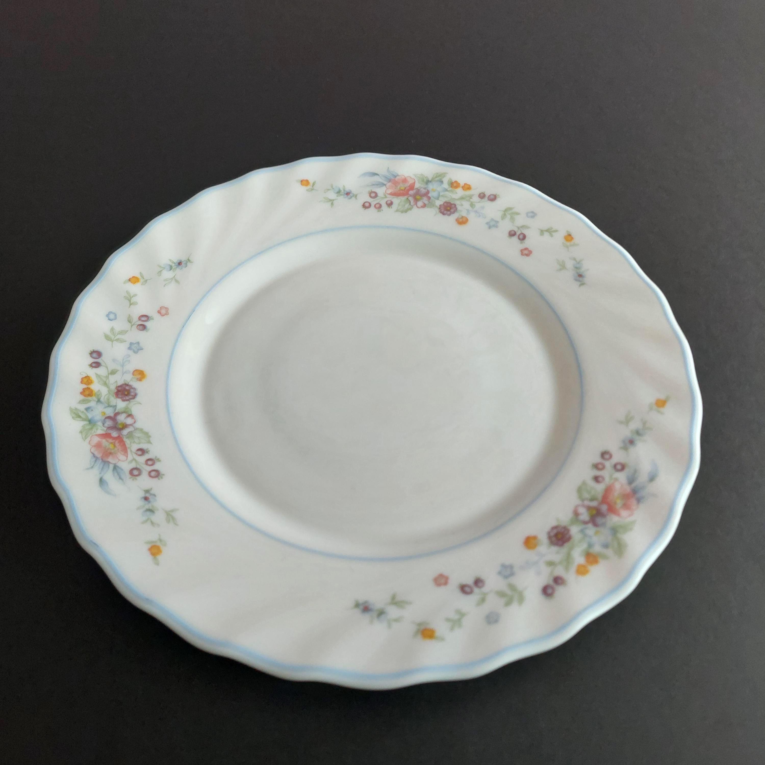 4-piece vintage Arcopal salad plate set in the discontinued Victoria pattern. Multi-color floral pattern on white tempered glass. Swirled rim with light blue trim. Made in France, circa 1990s