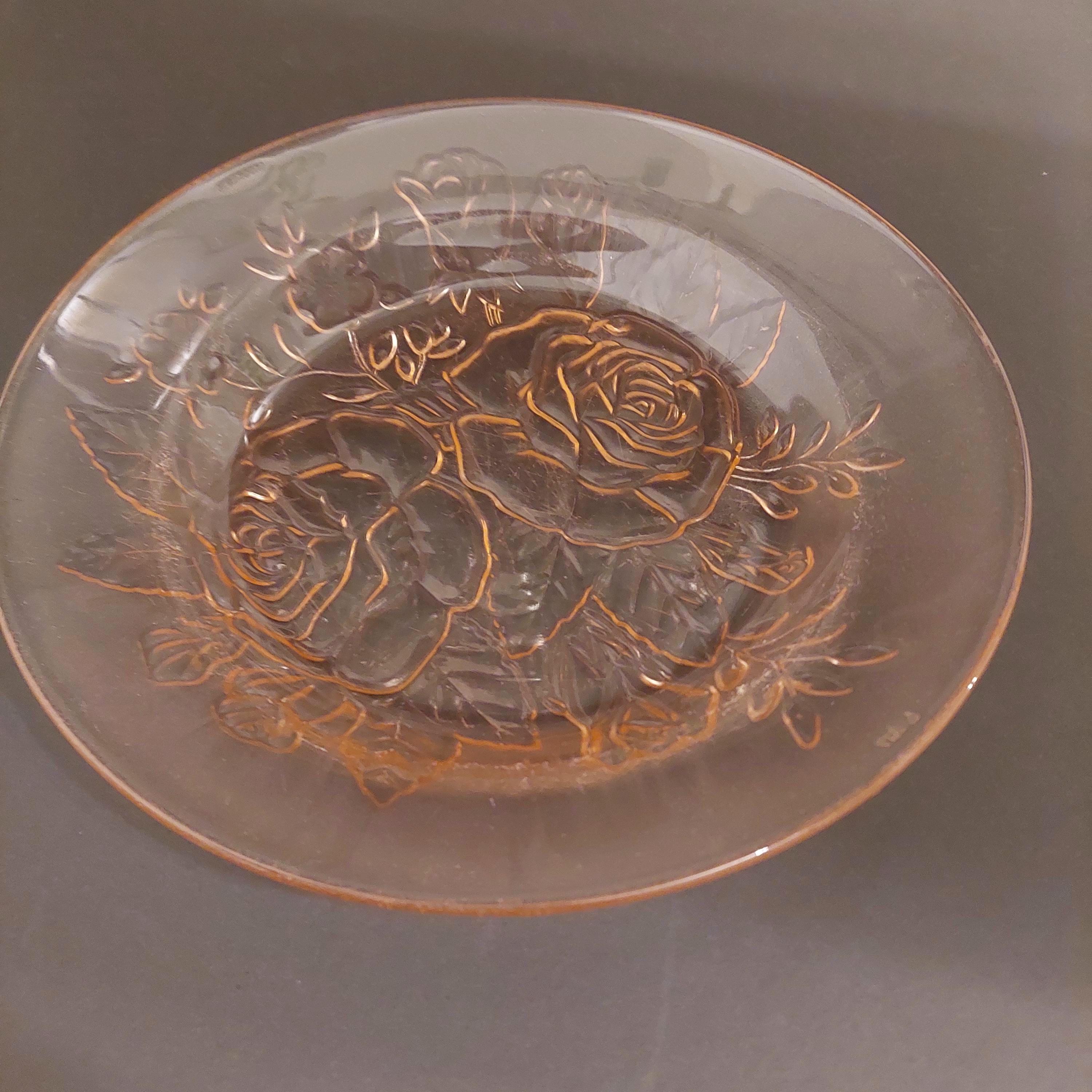 Retro thick pink glass shallow salad or pasta bowls. Textured glass between the smooth raised rose floral bouquet design on back of bows. Bowl faces are smooth.